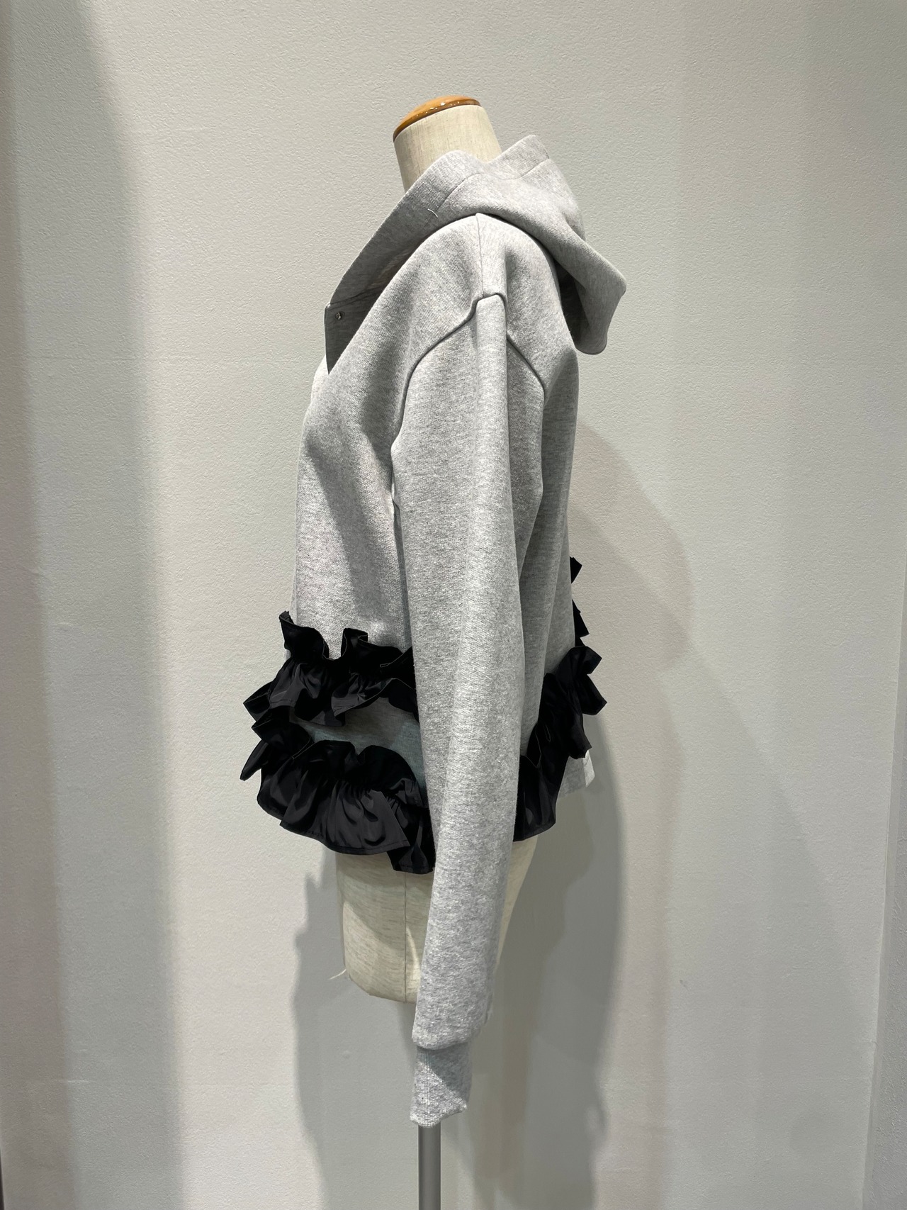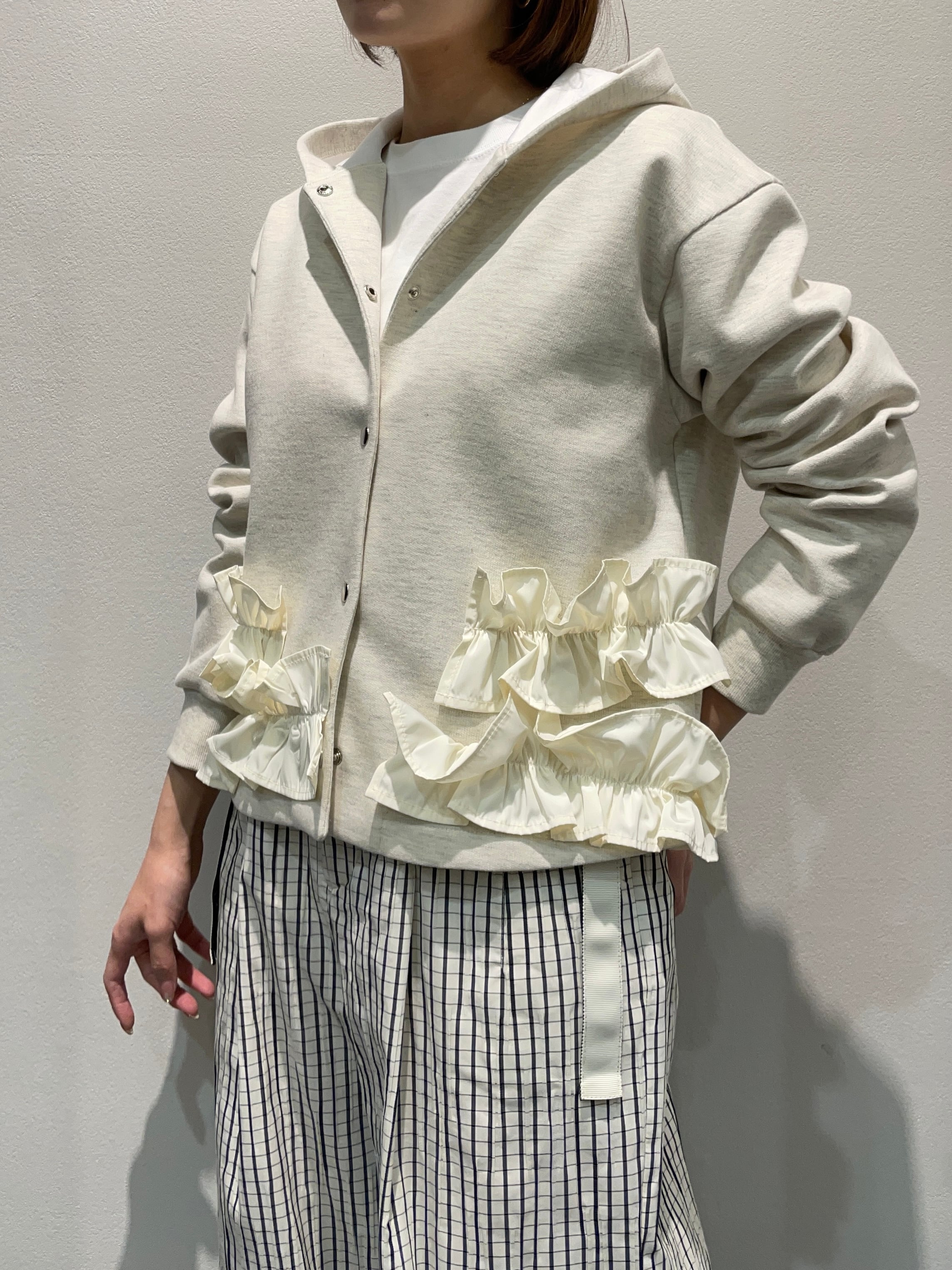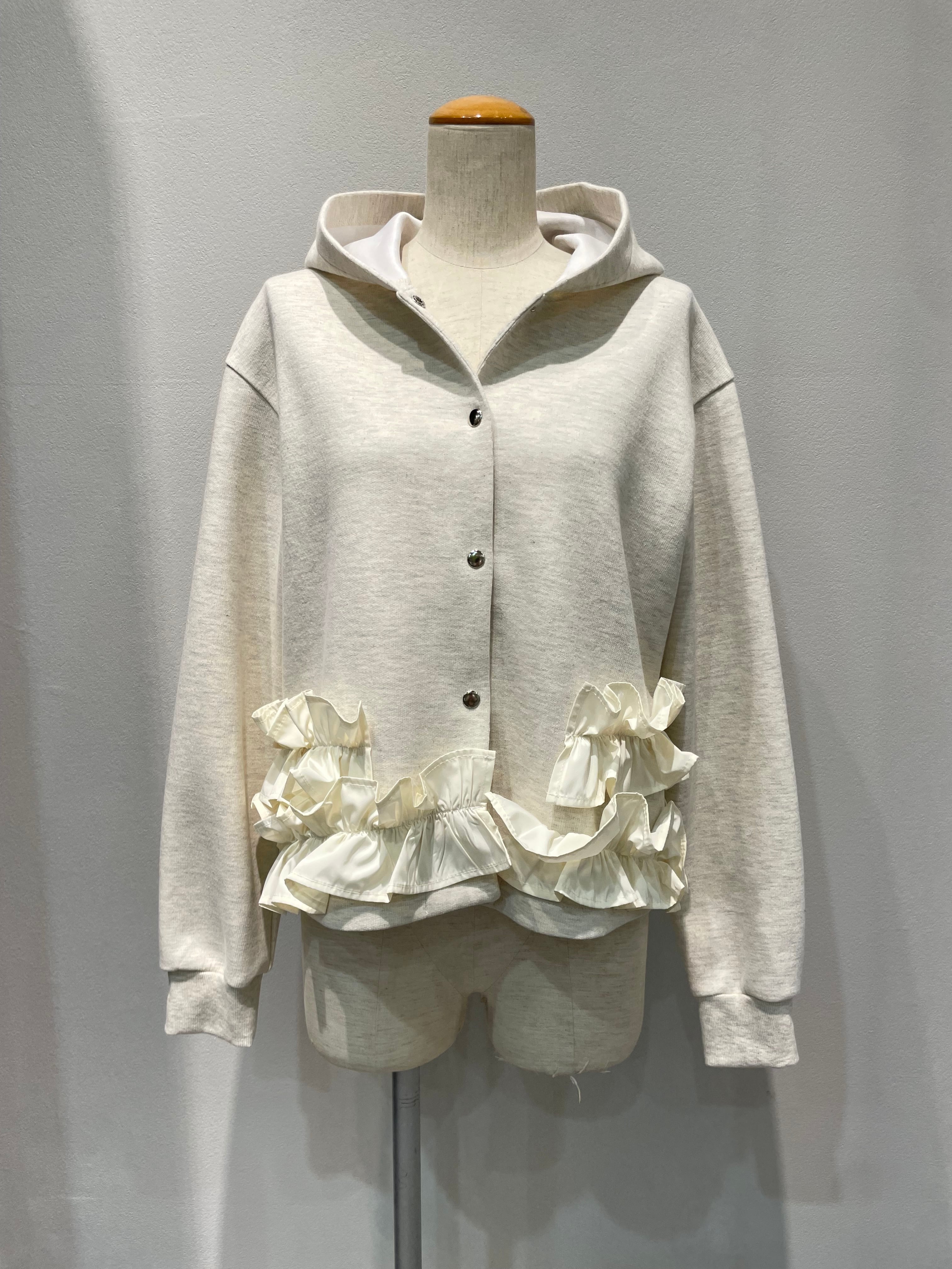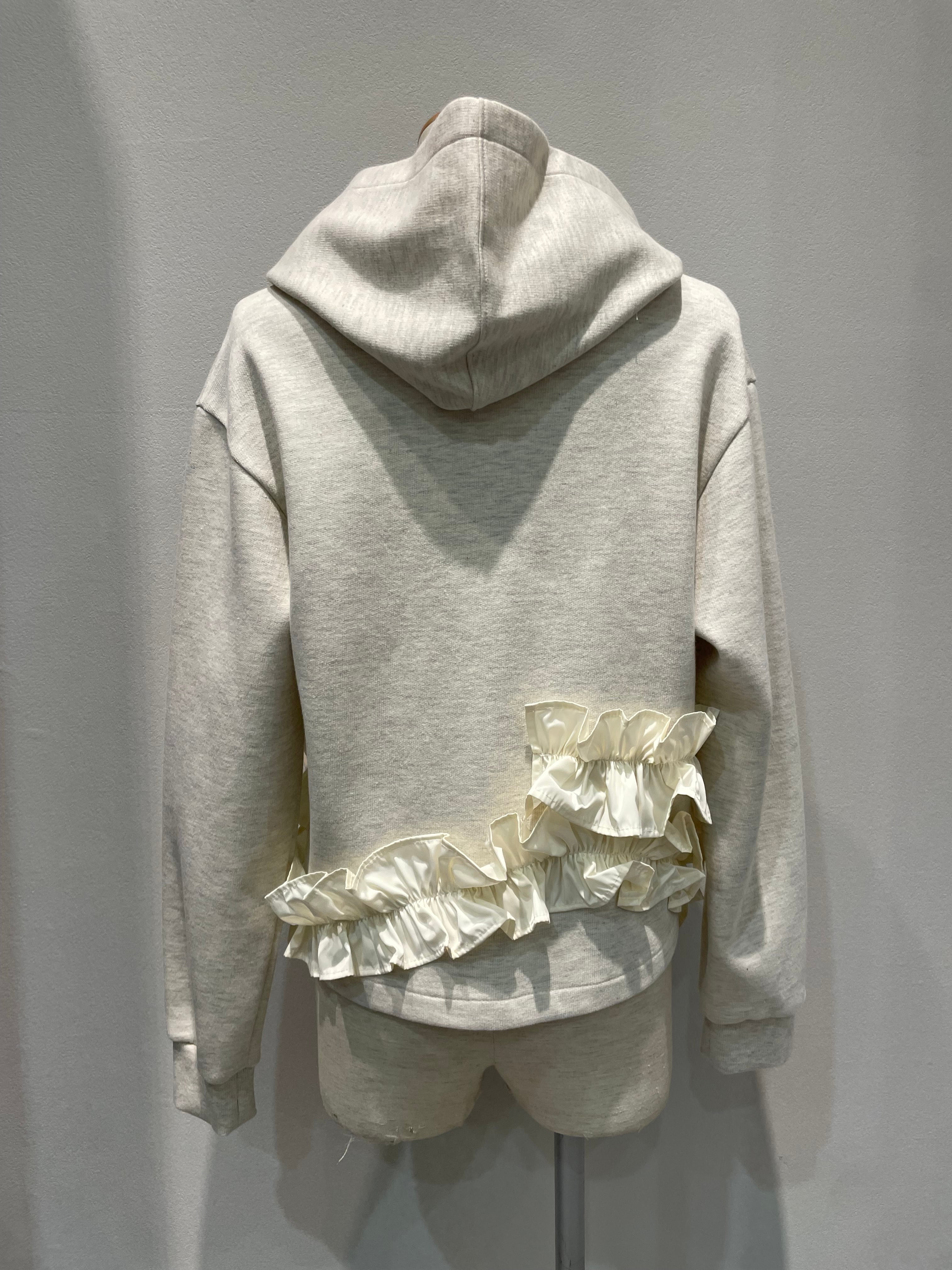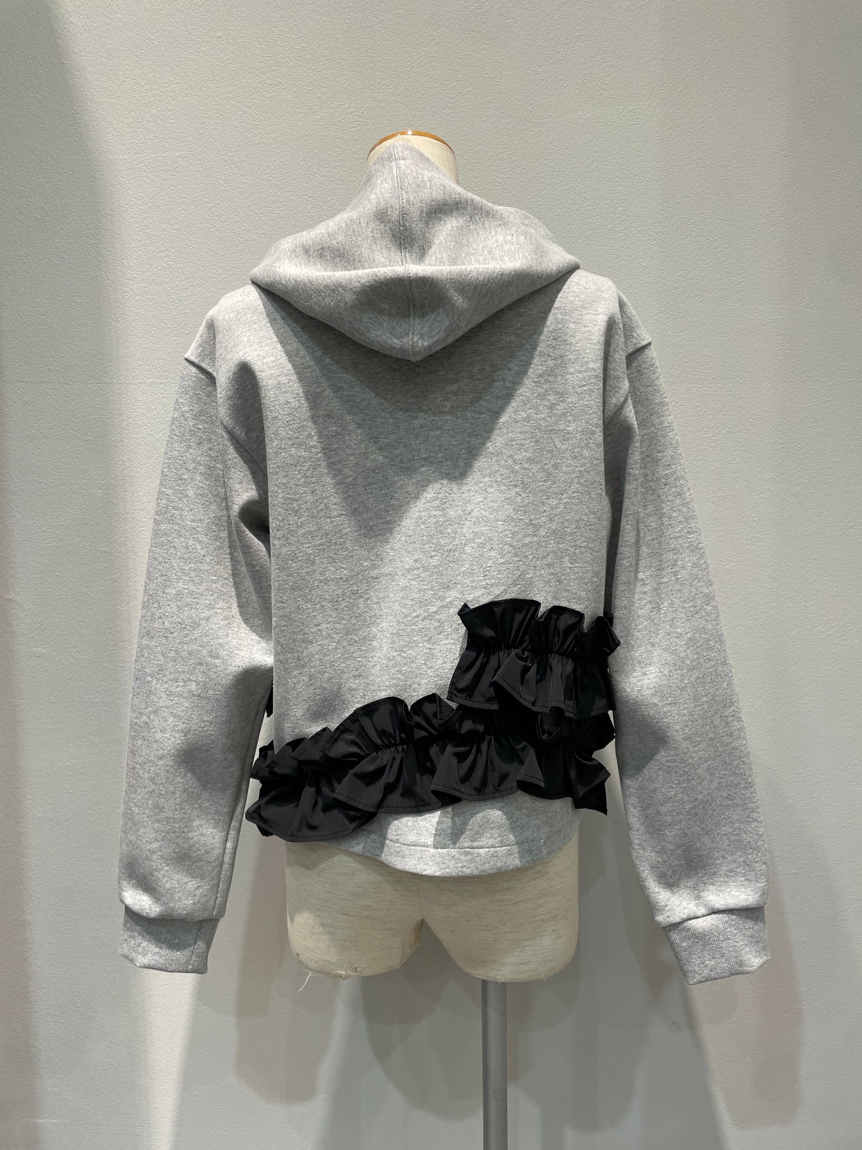 ランダムなフリルが印象的なフーディパーカー。
