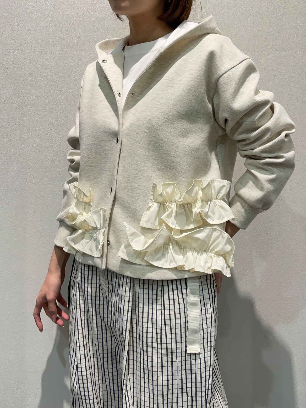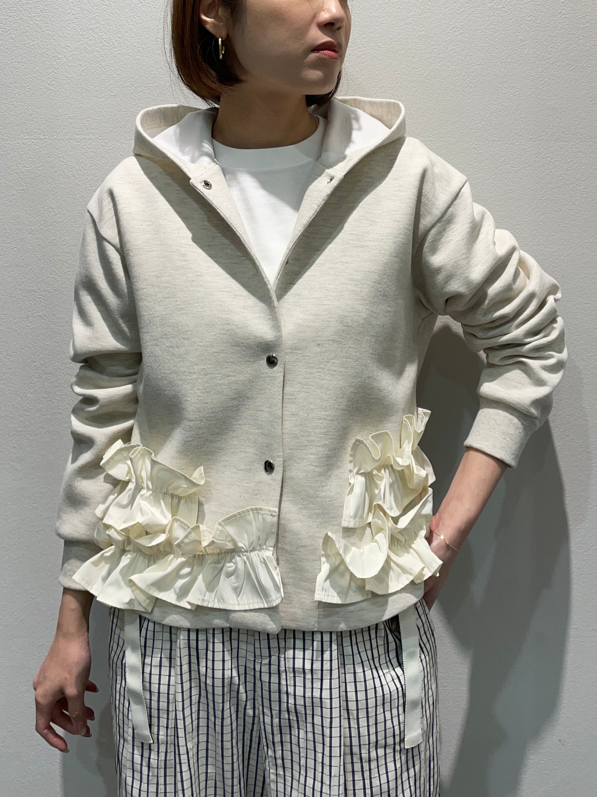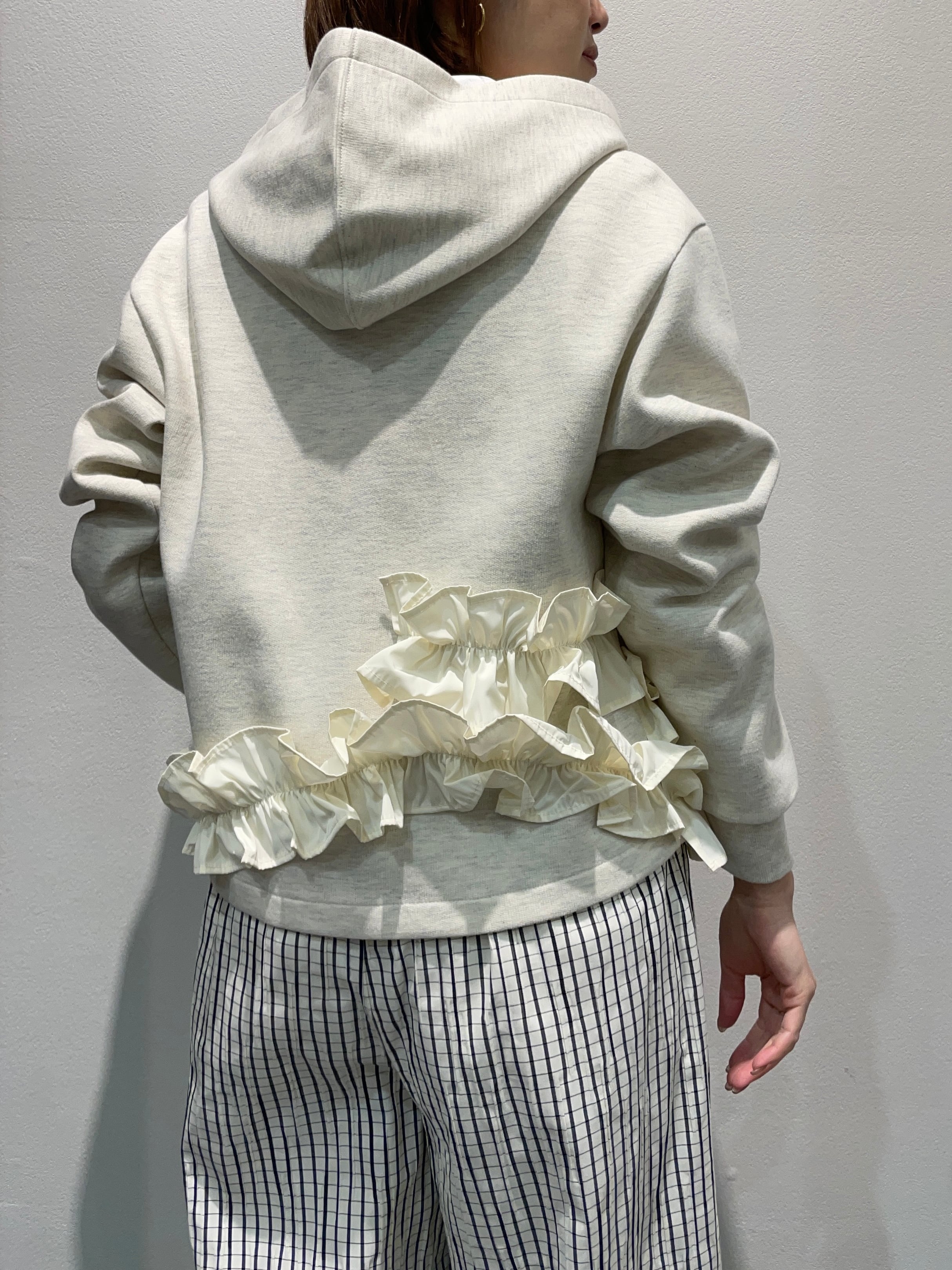 女性らしいフリルとカジュアルフーディのバランスが可愛く色々なボトムスとも合わせやすい少し短めな丈感アイテムです。
