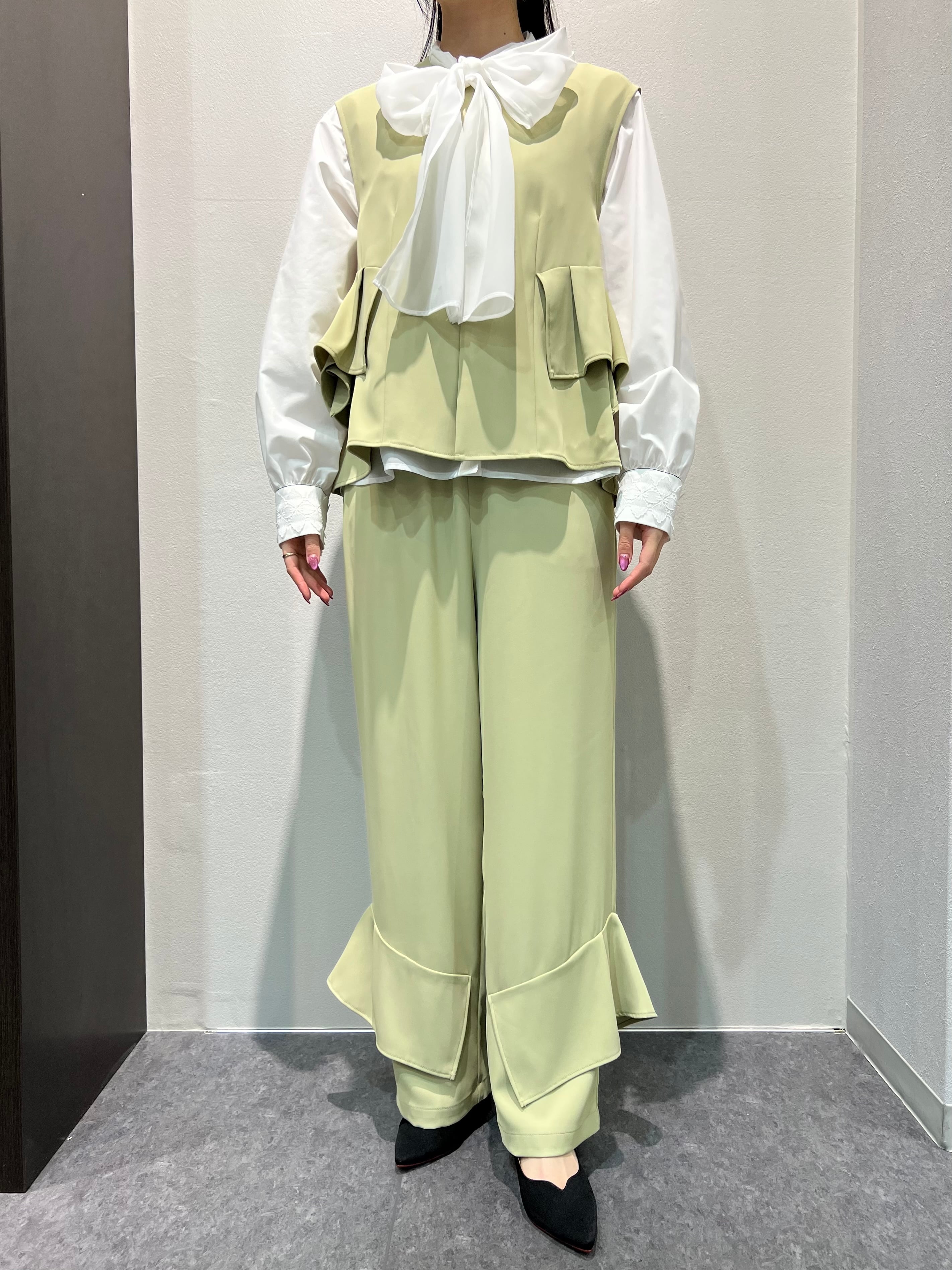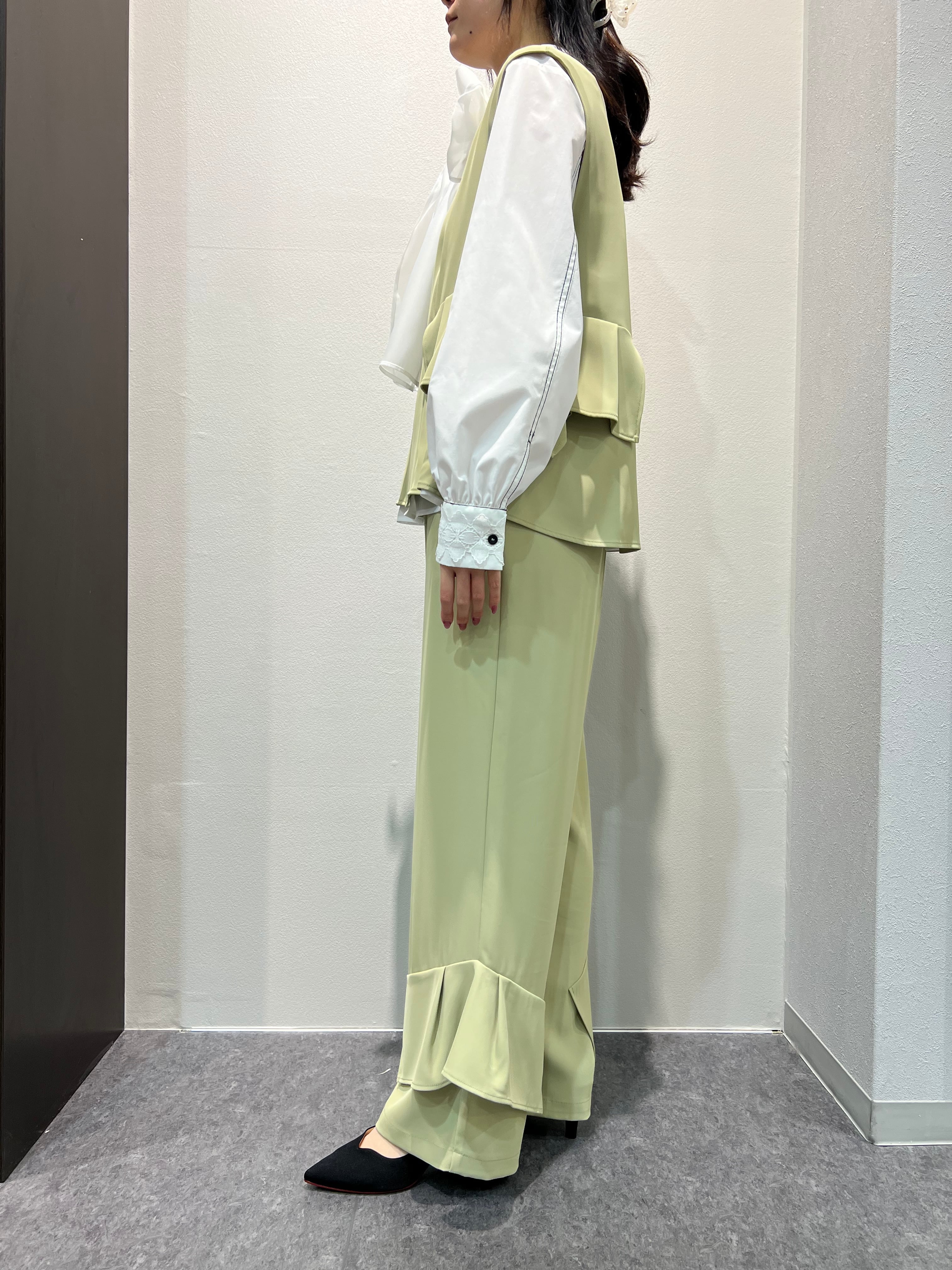 ヘムフリルのデザインパンツとSETUPになっているので簡単にコーディネイトして頂けます。