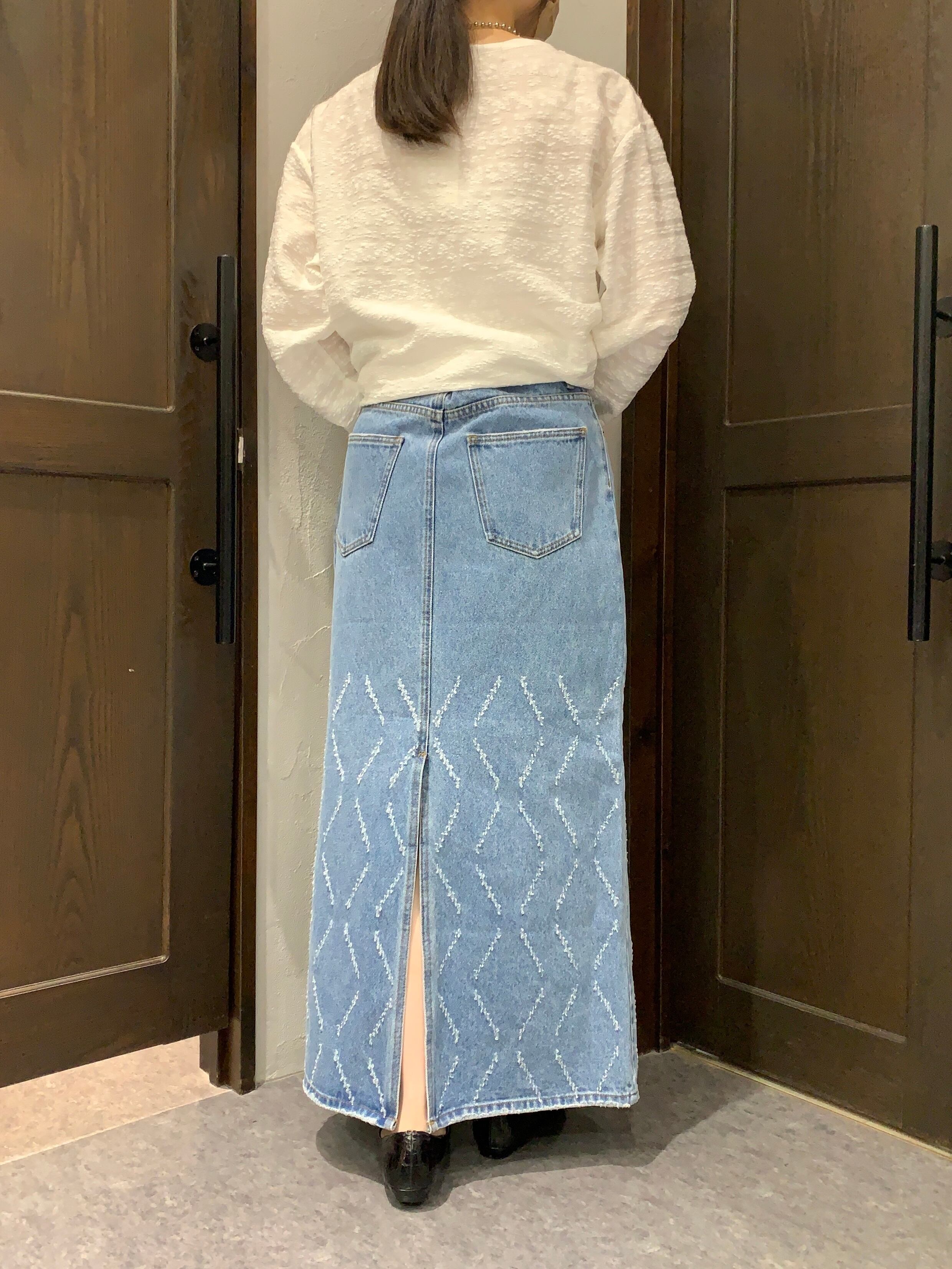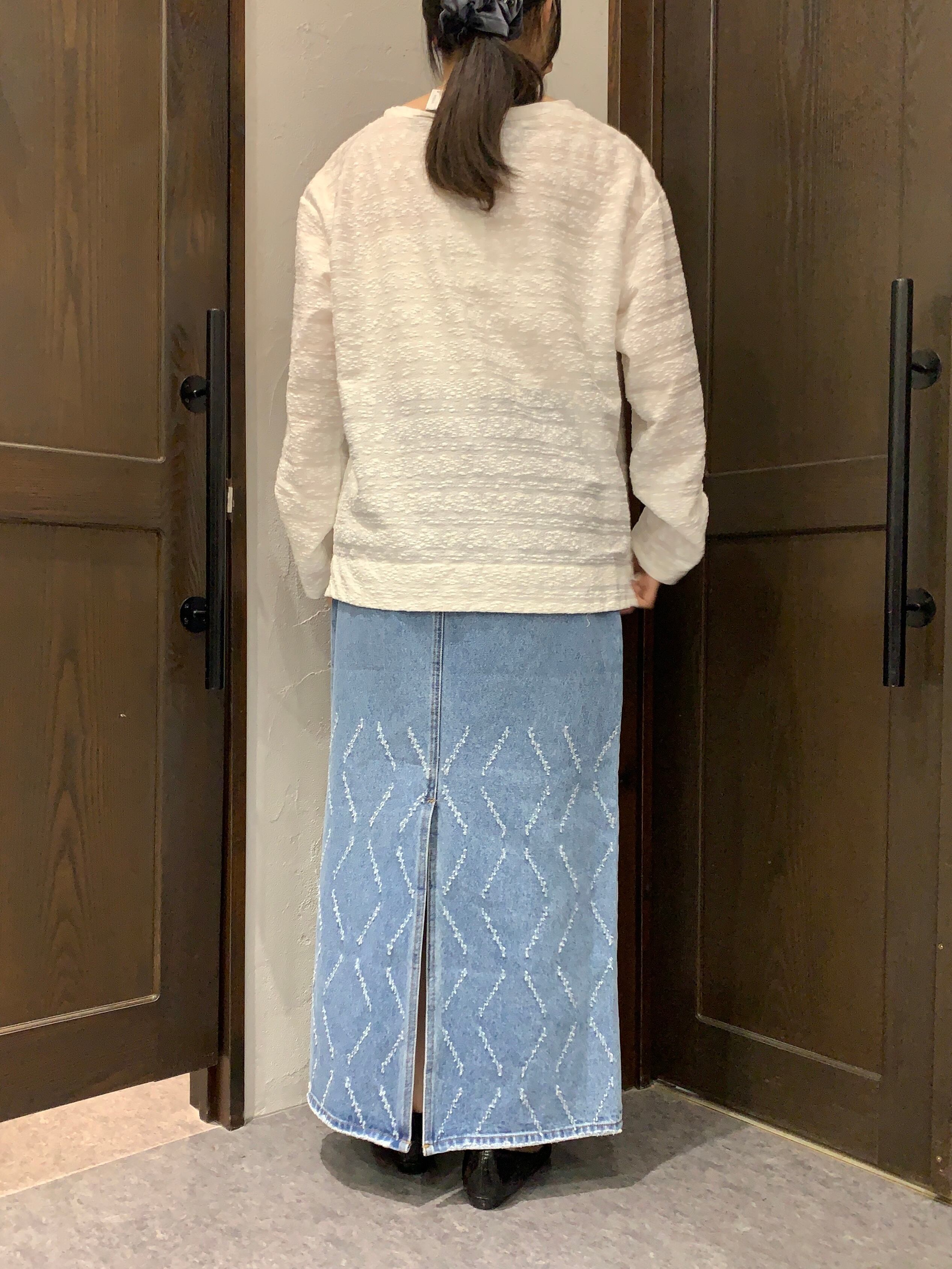 ヒップ周りに程よくゆとりがあり、後ろ裾にはスリットがあるので、動きやすいサイズ感になっています。