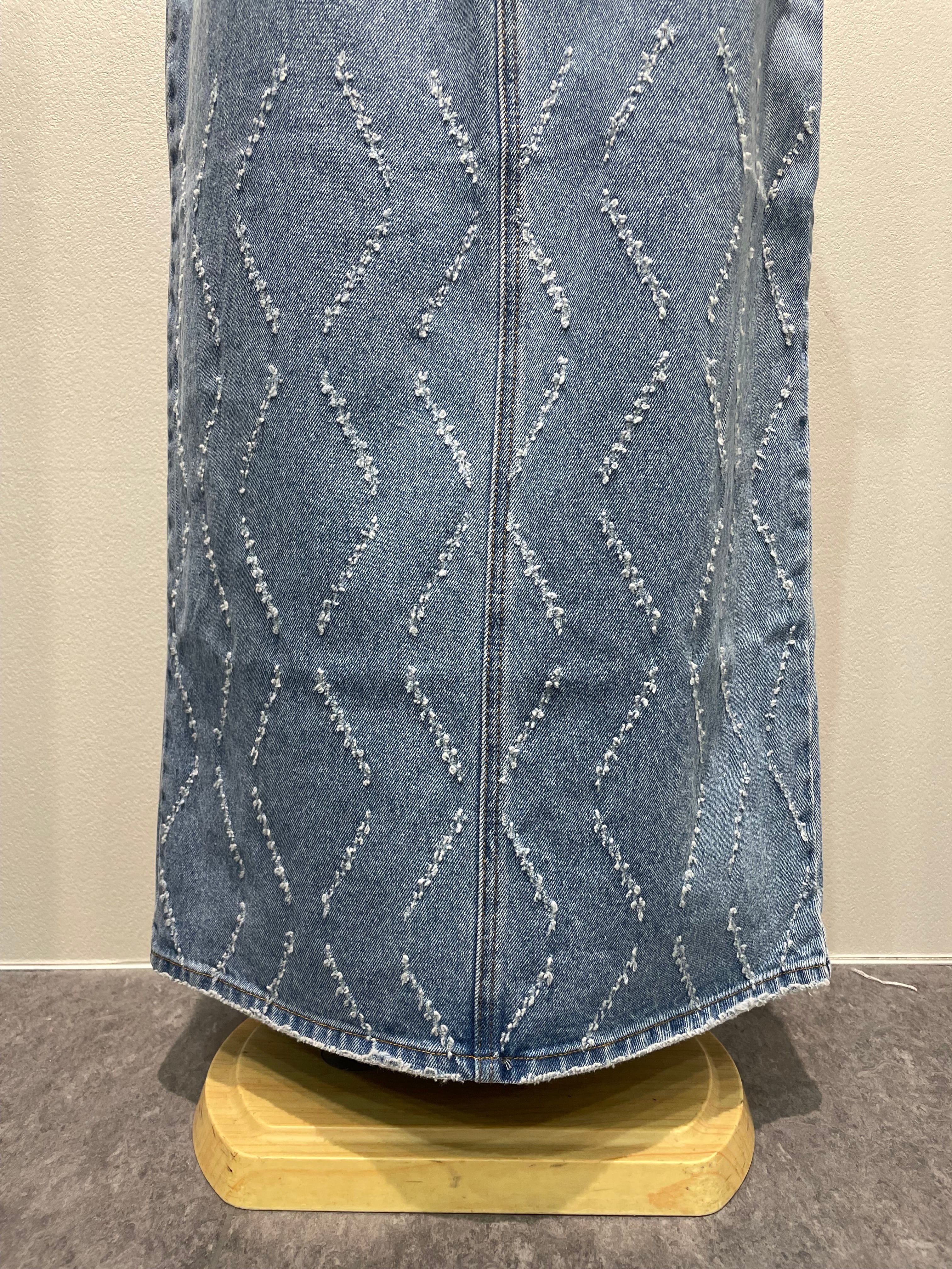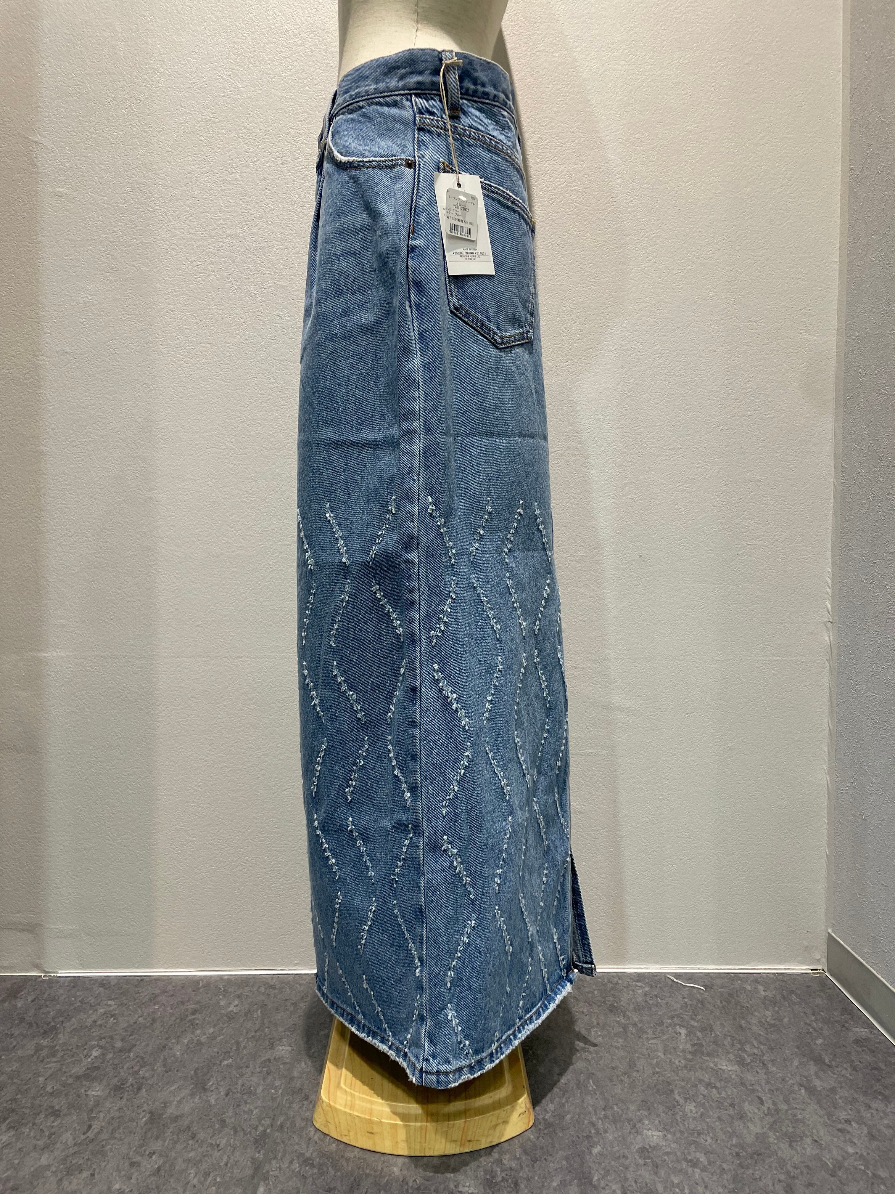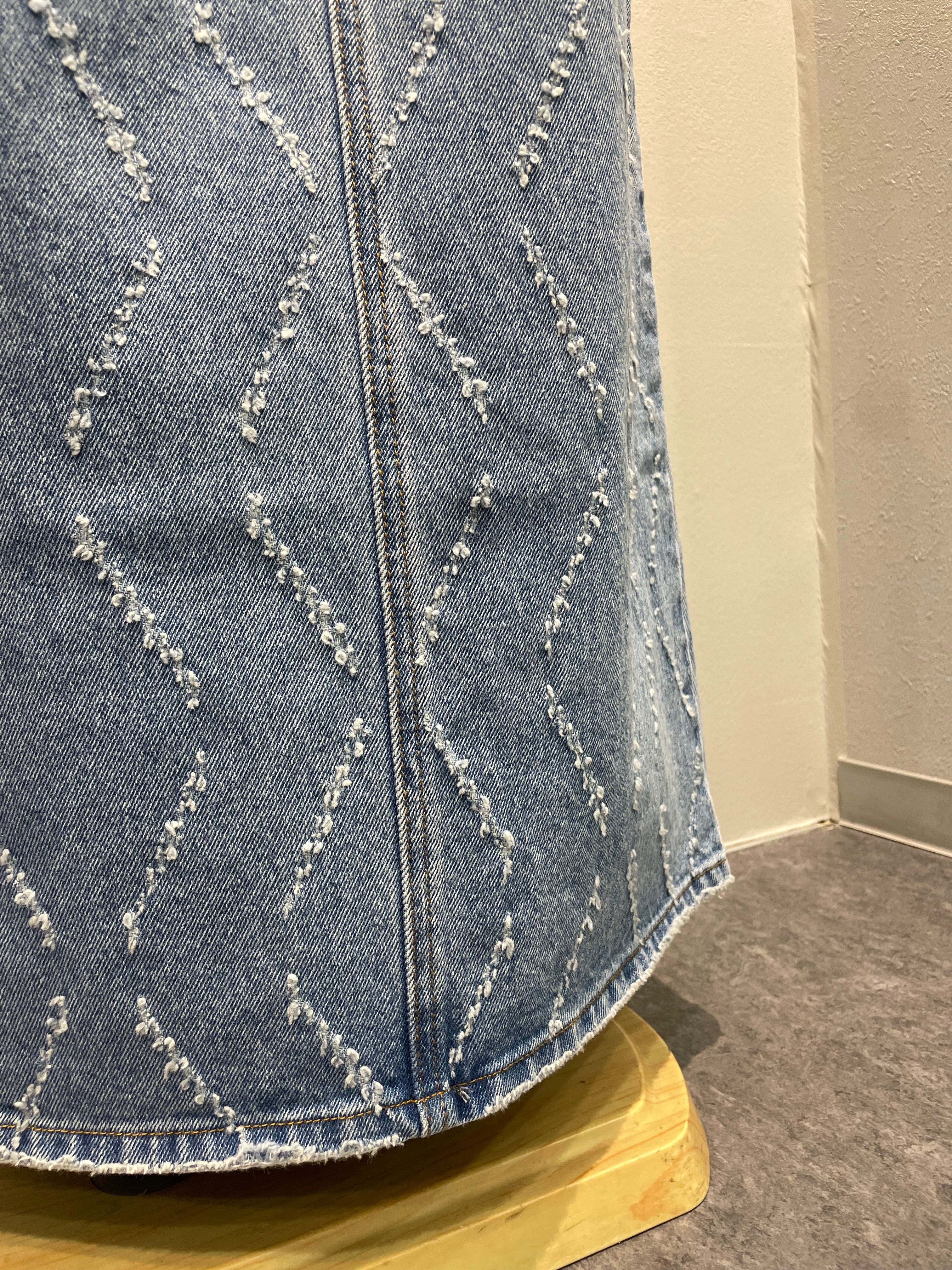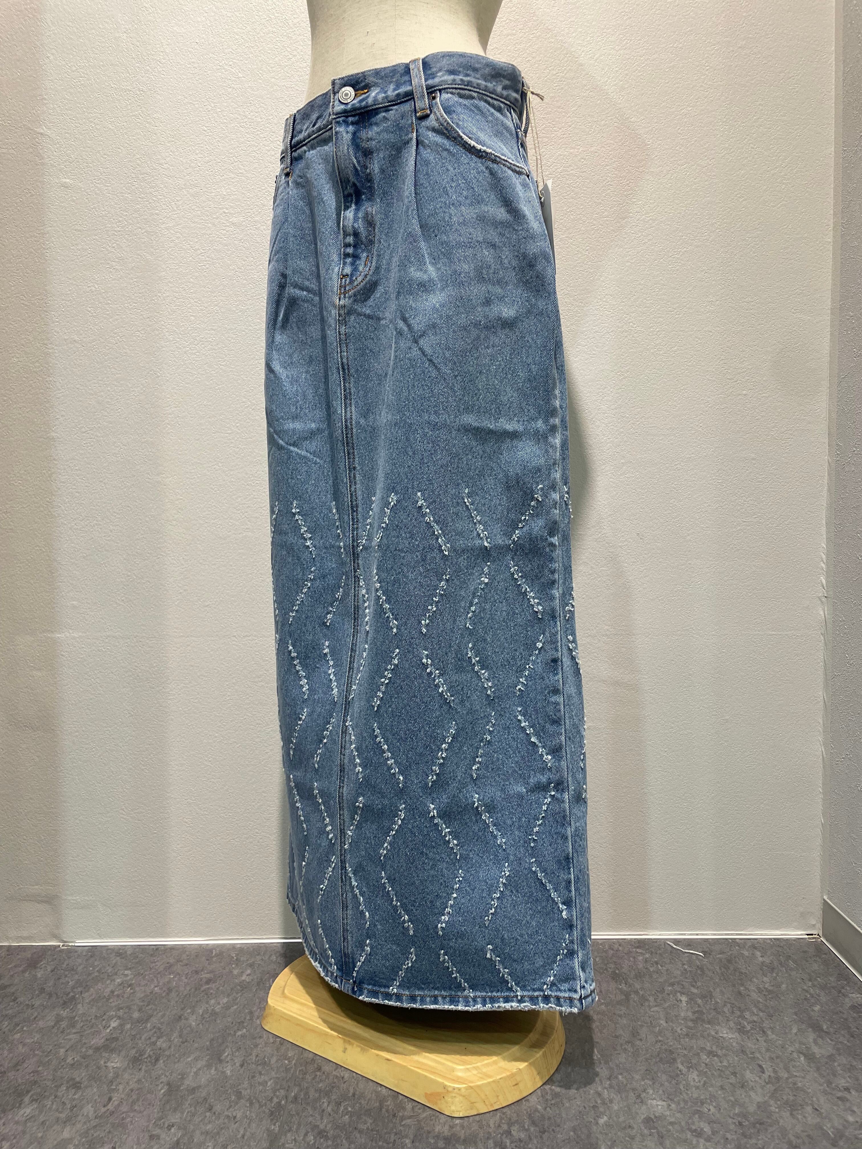 レーザー加工で表現するオリジナルパターンが特徴のデニムナロースカートです。