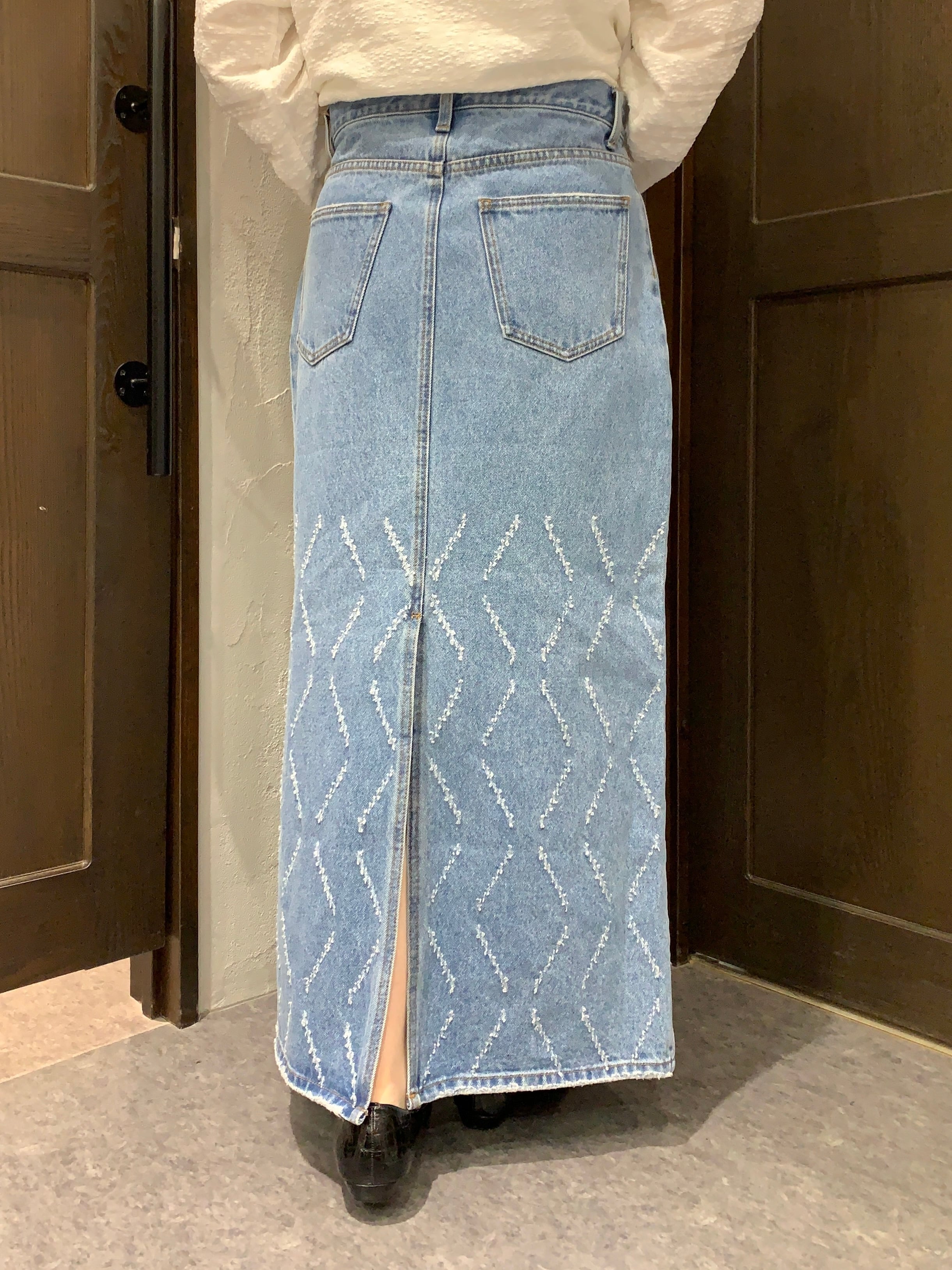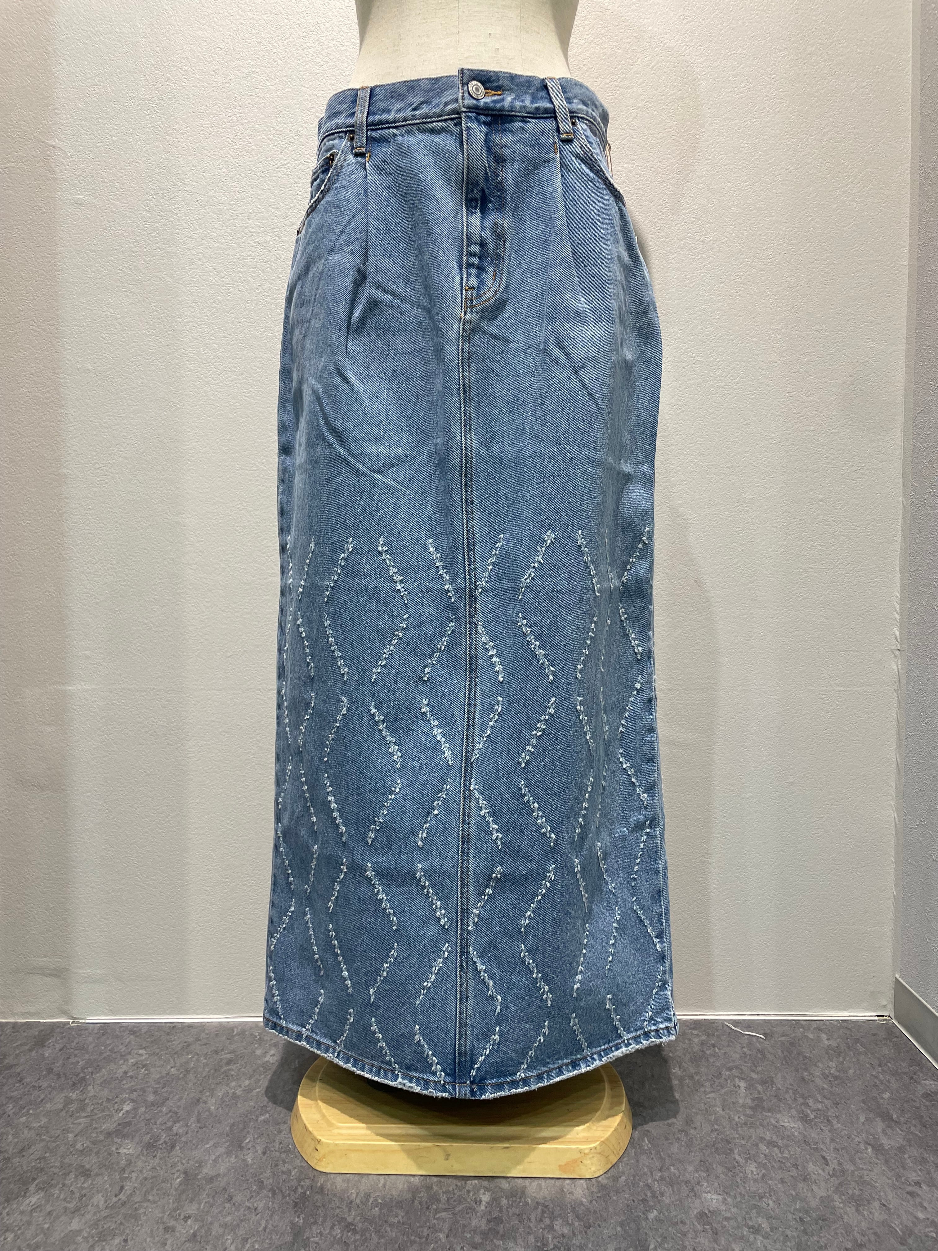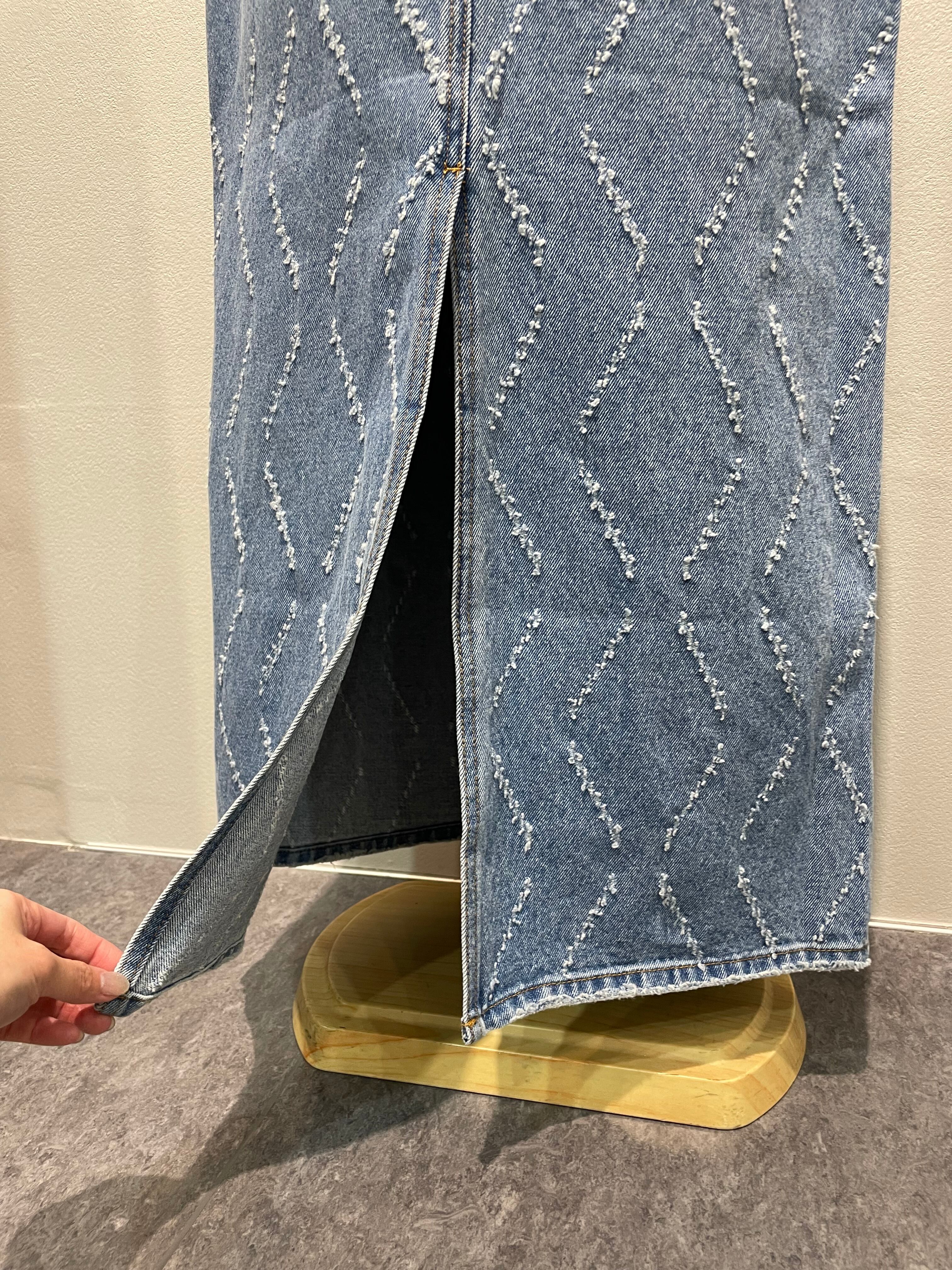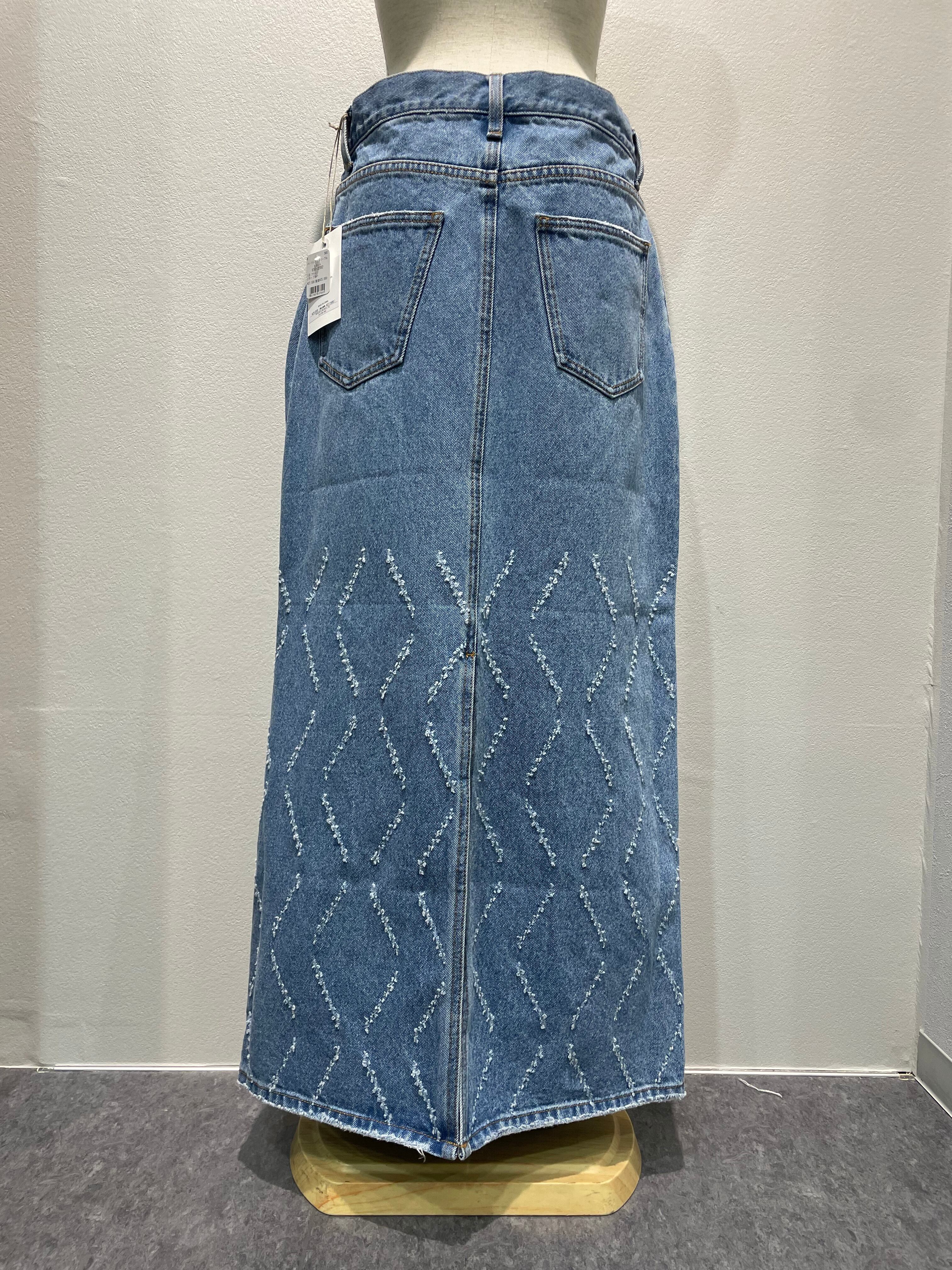 レーザー加工で表現するオリジナルパターンが特徴のデニムナロースカートです。