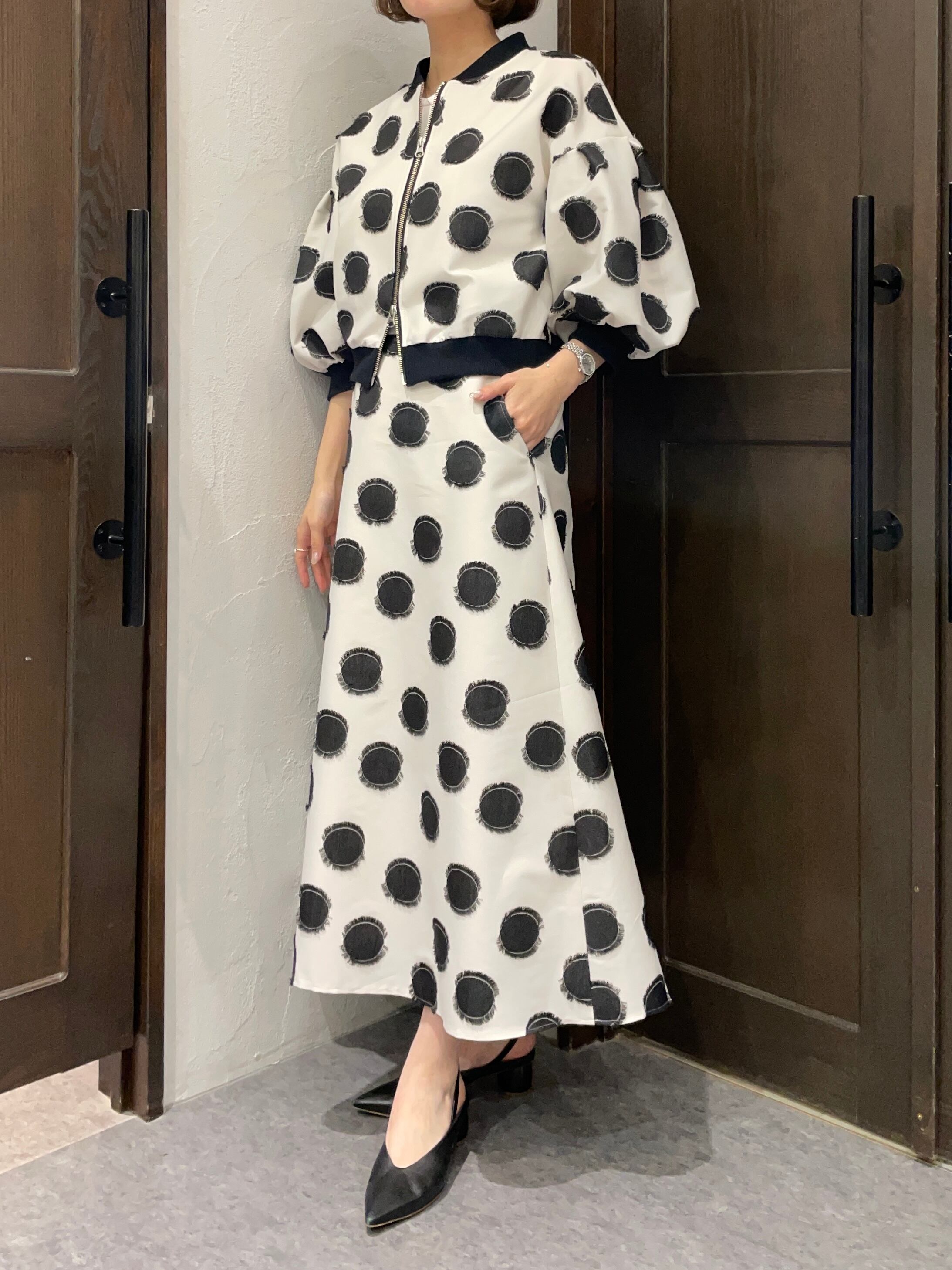 コンパクトな丈感なので、ワンピースやスカート、ワイドパンツとも好相性です。
