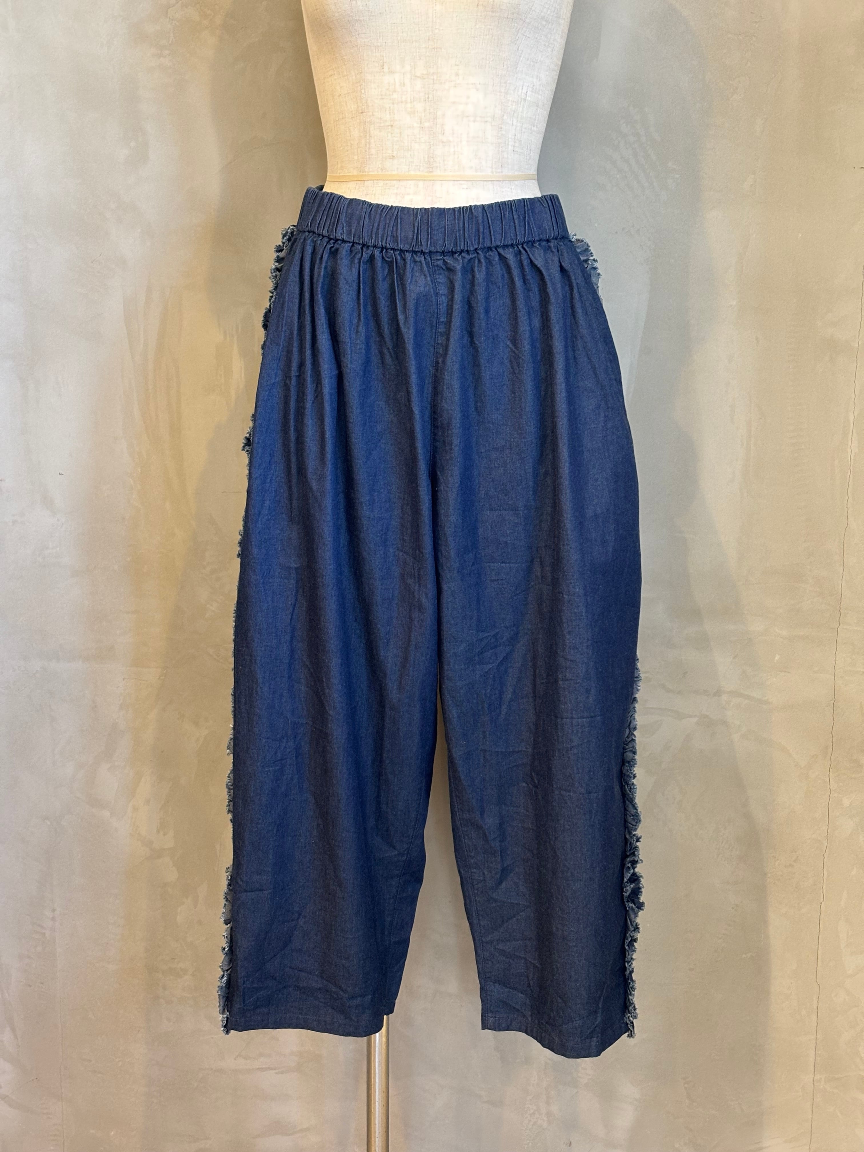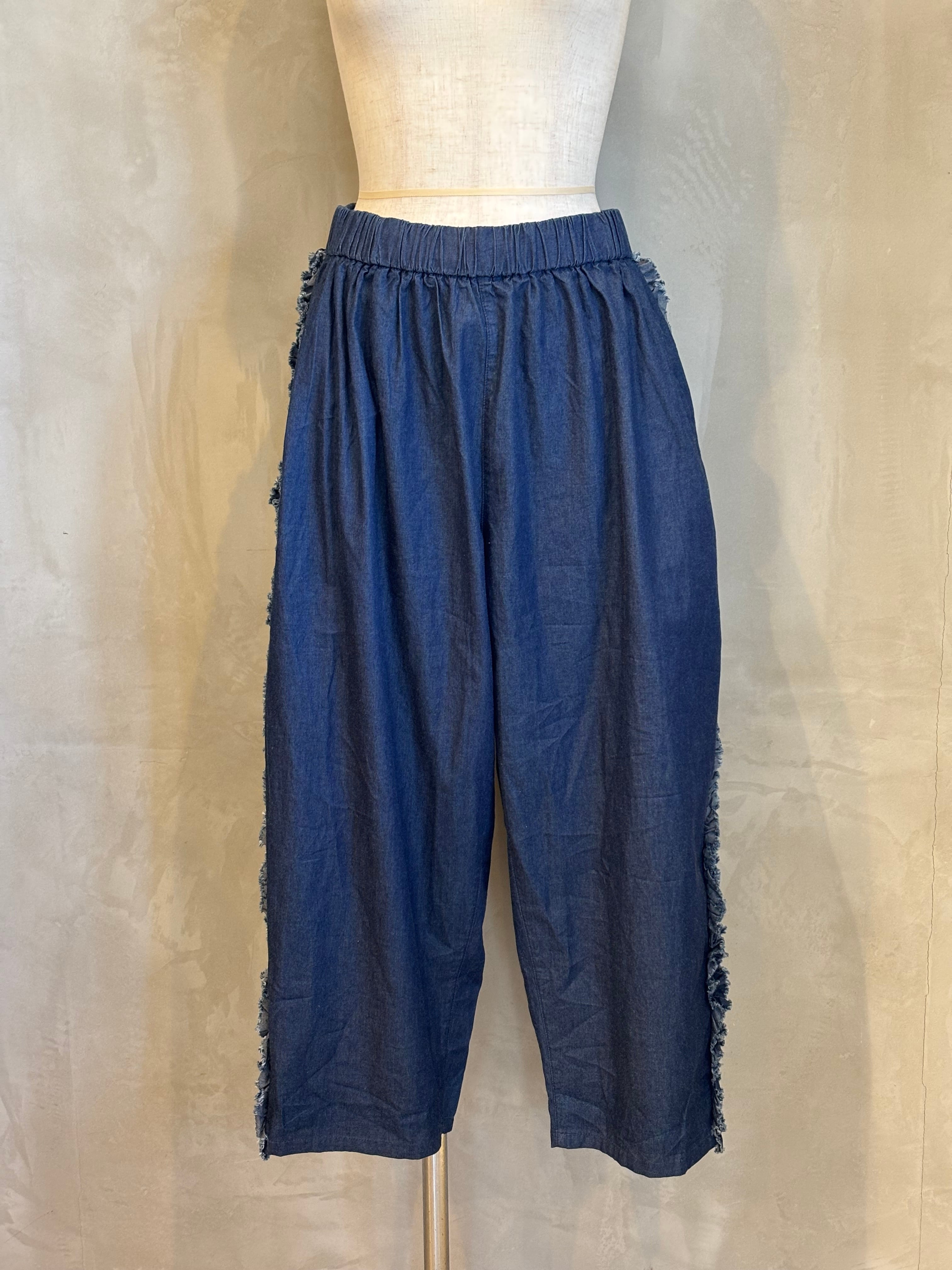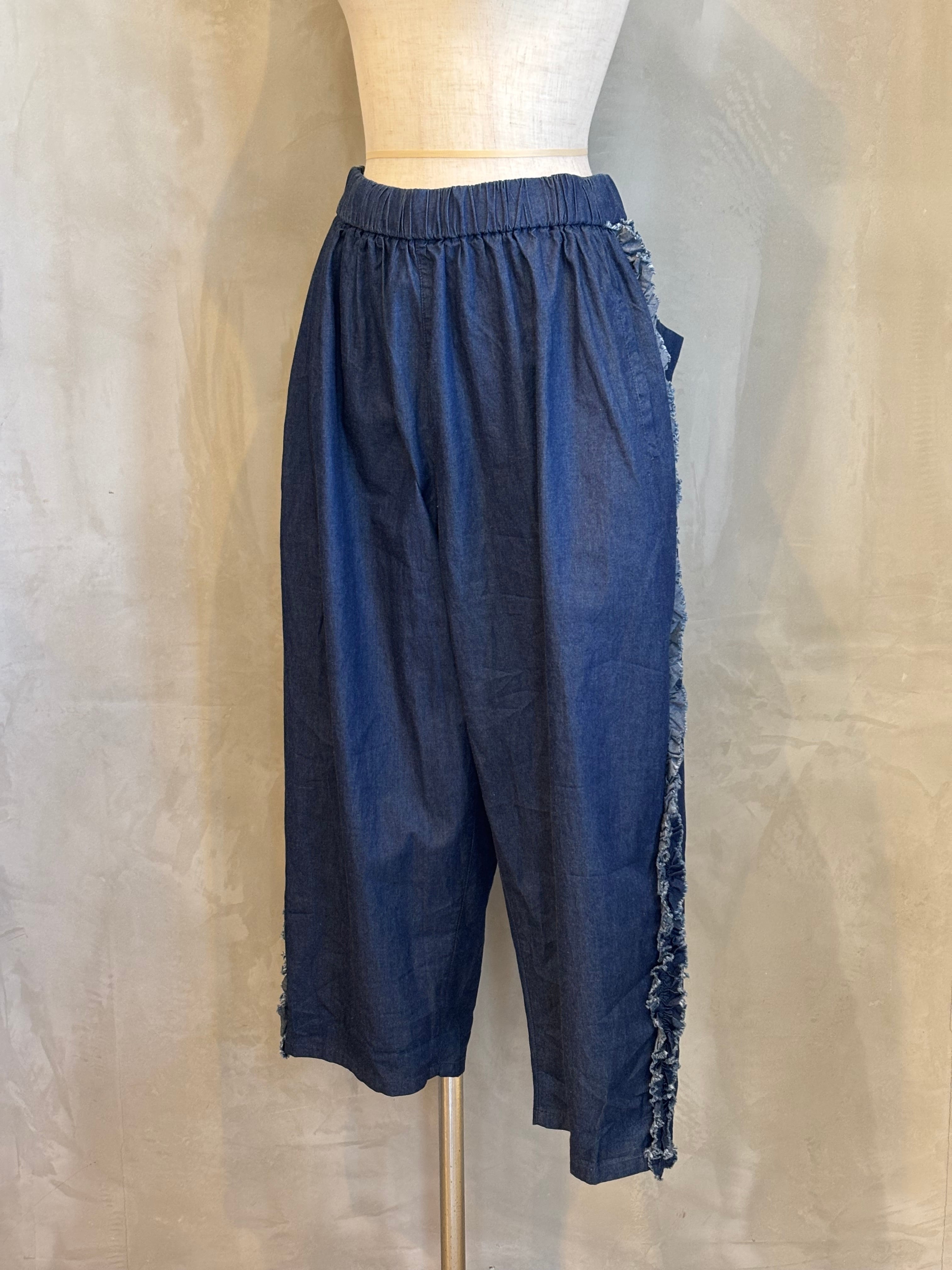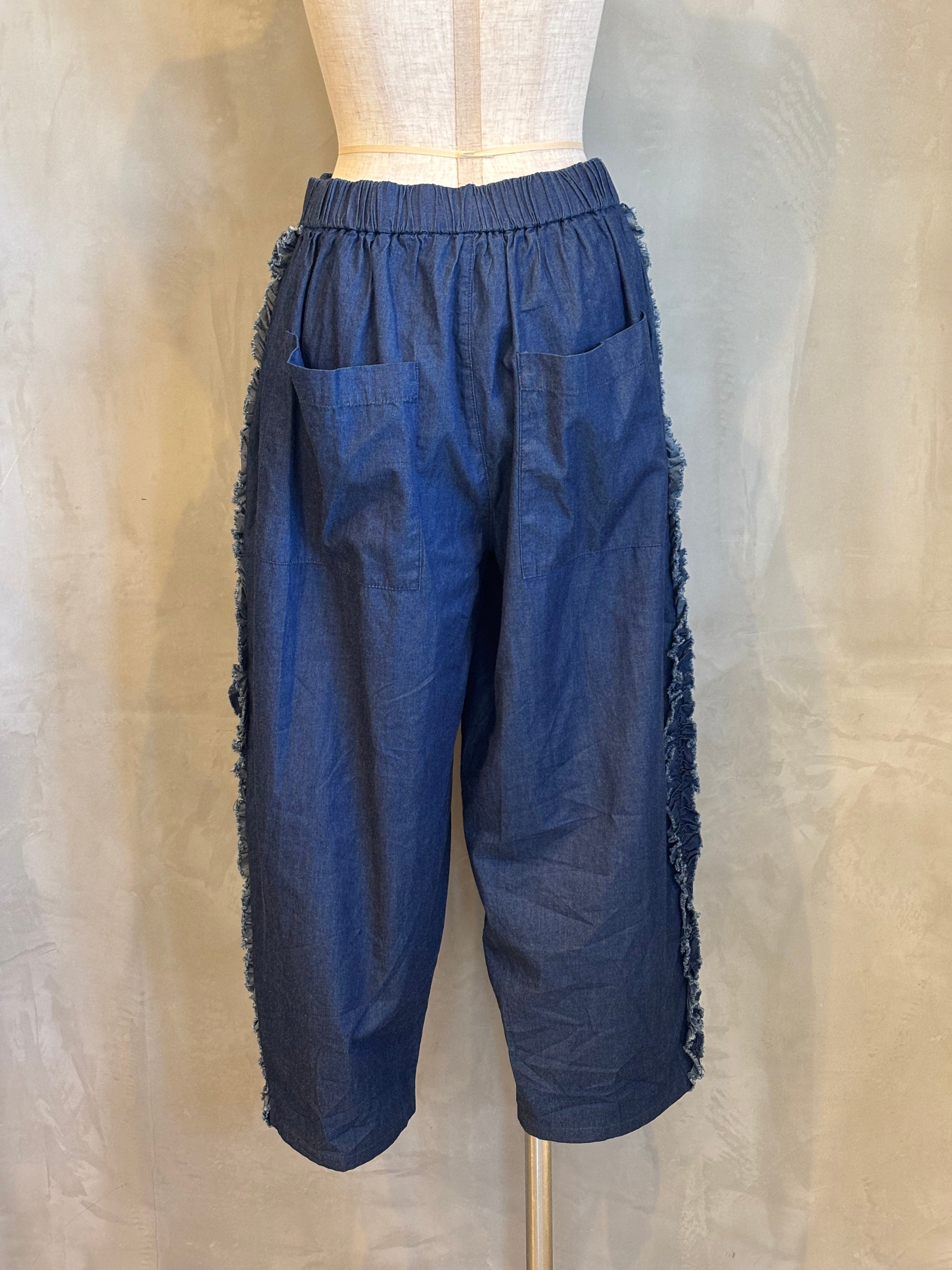 サイドラインにフリルが施された、ゆったりサイズのテーパードパンツです。