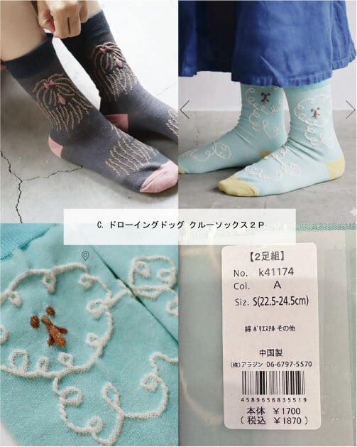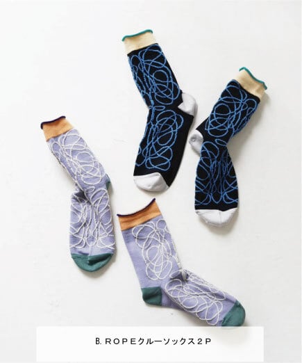 A.ホーミータイト!綿麻ショートソックス2P B.ROPEクルーソックス2P D.ドローイングクルーソックス2P