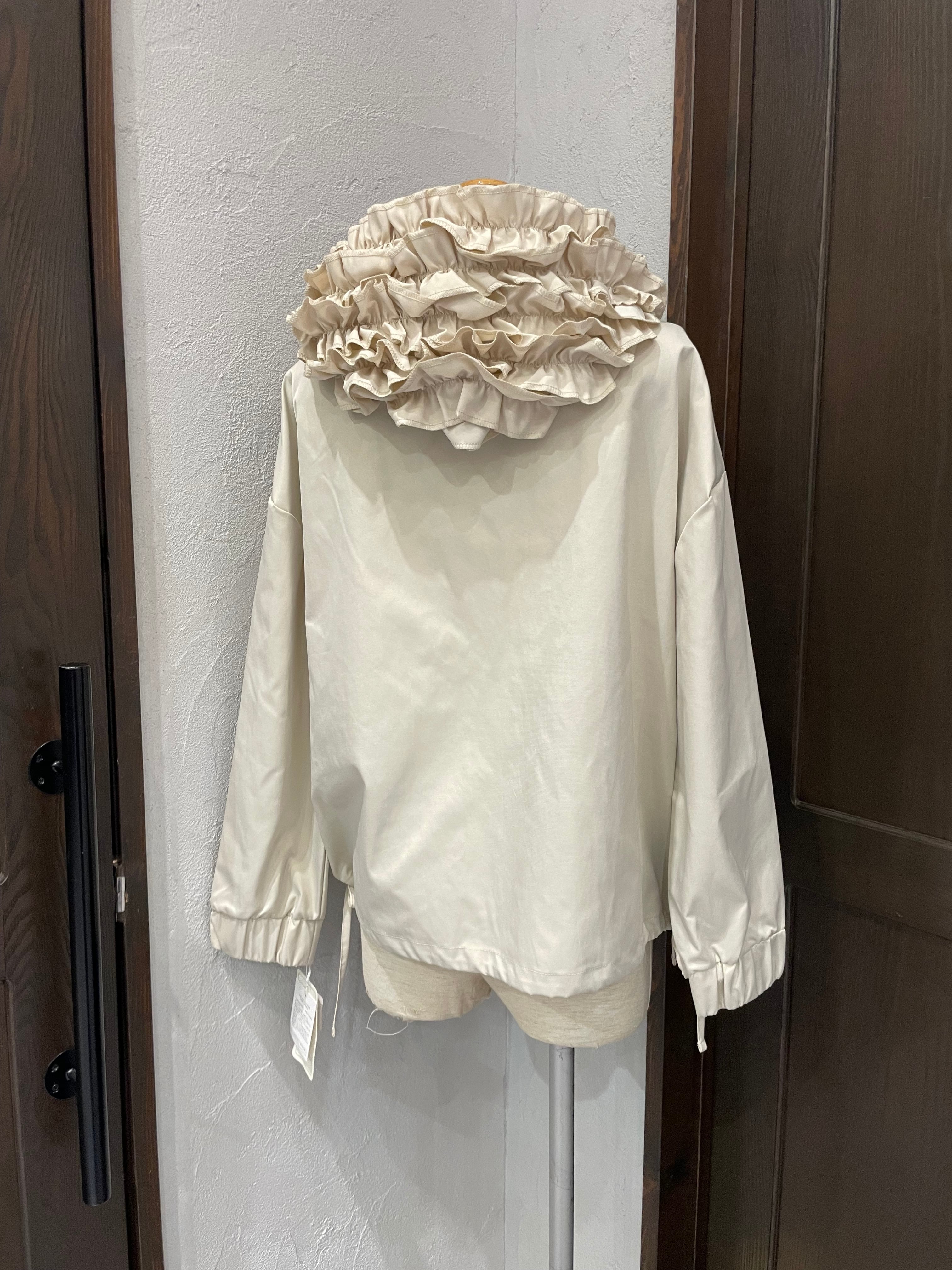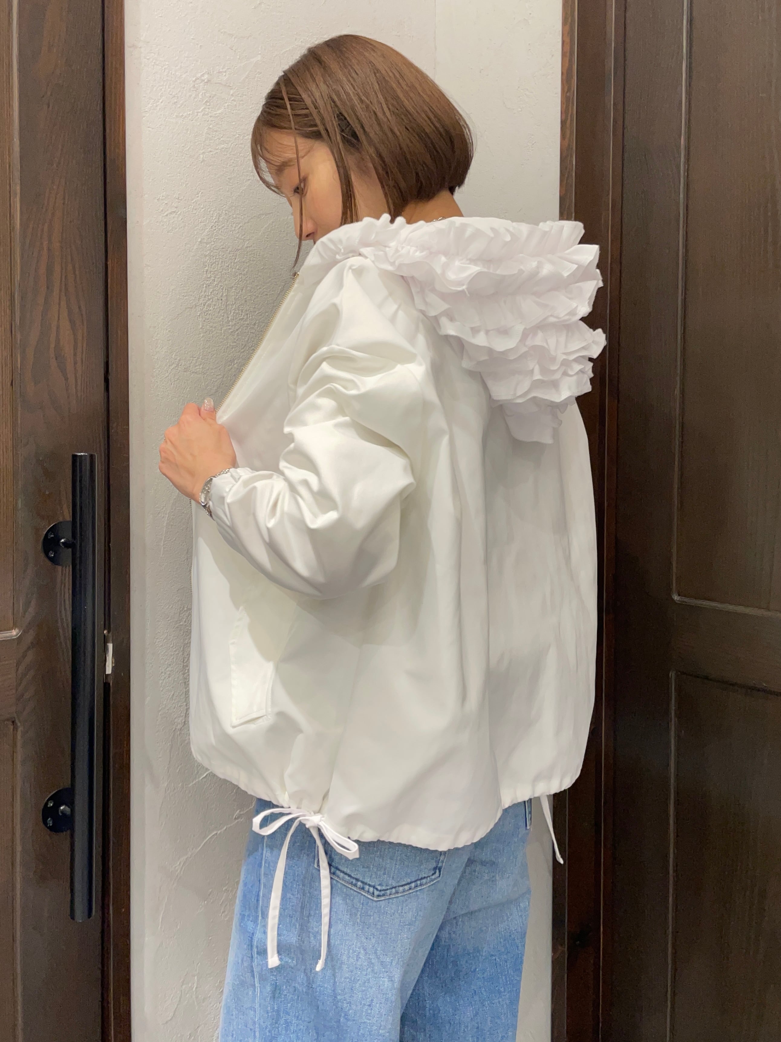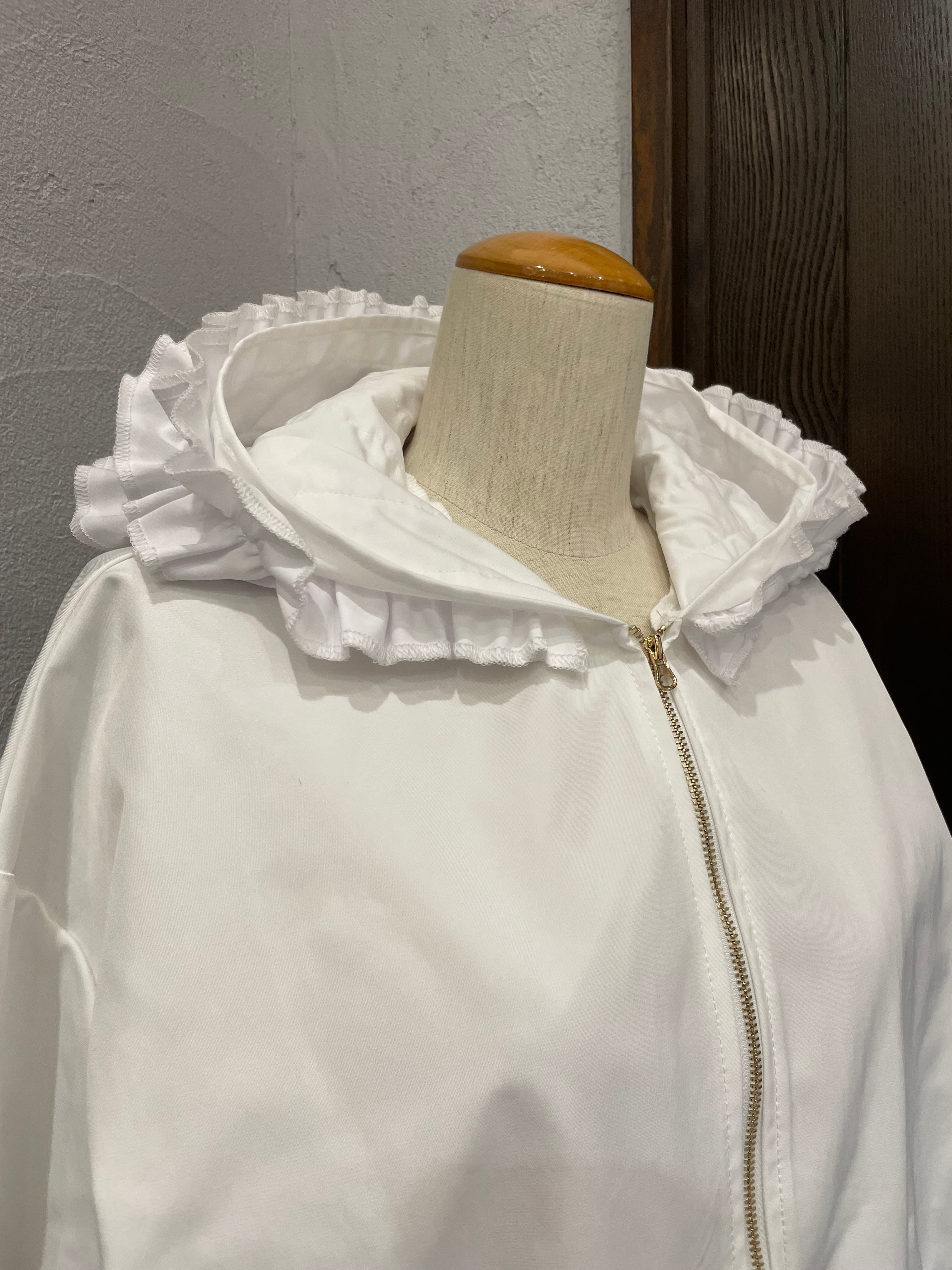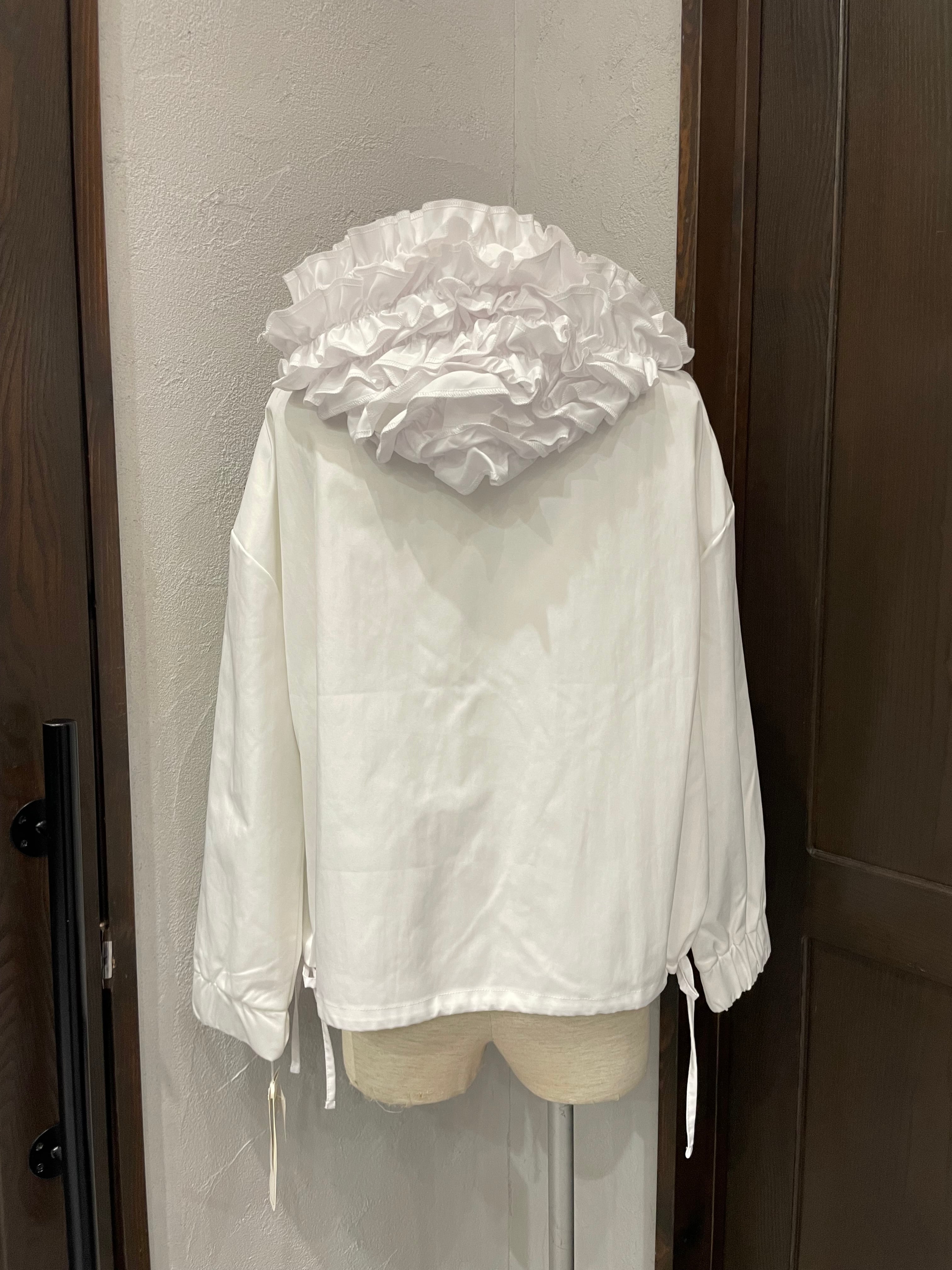 フード部分にフリルが施された、可愛らしさ満点のジップパーカー。