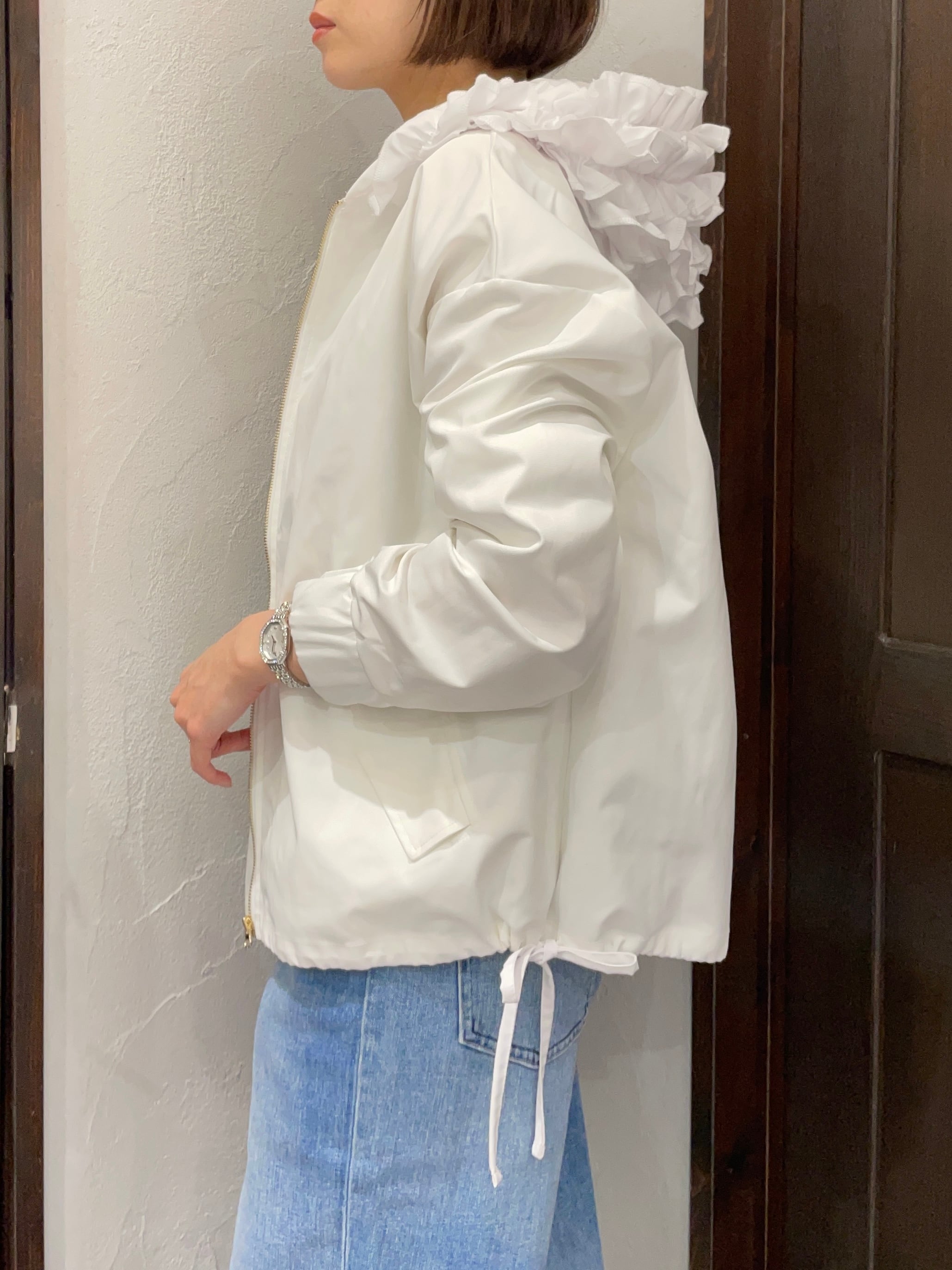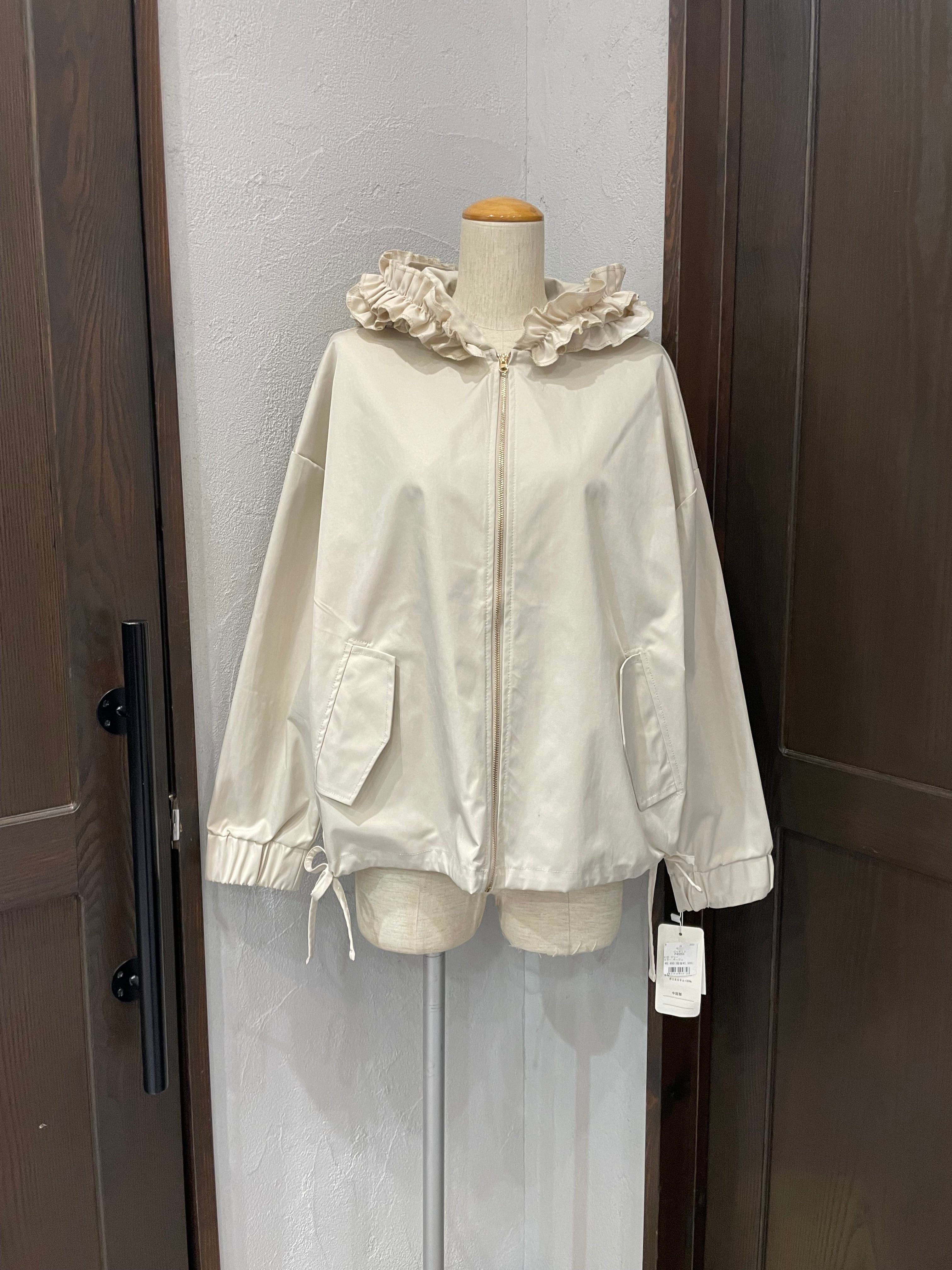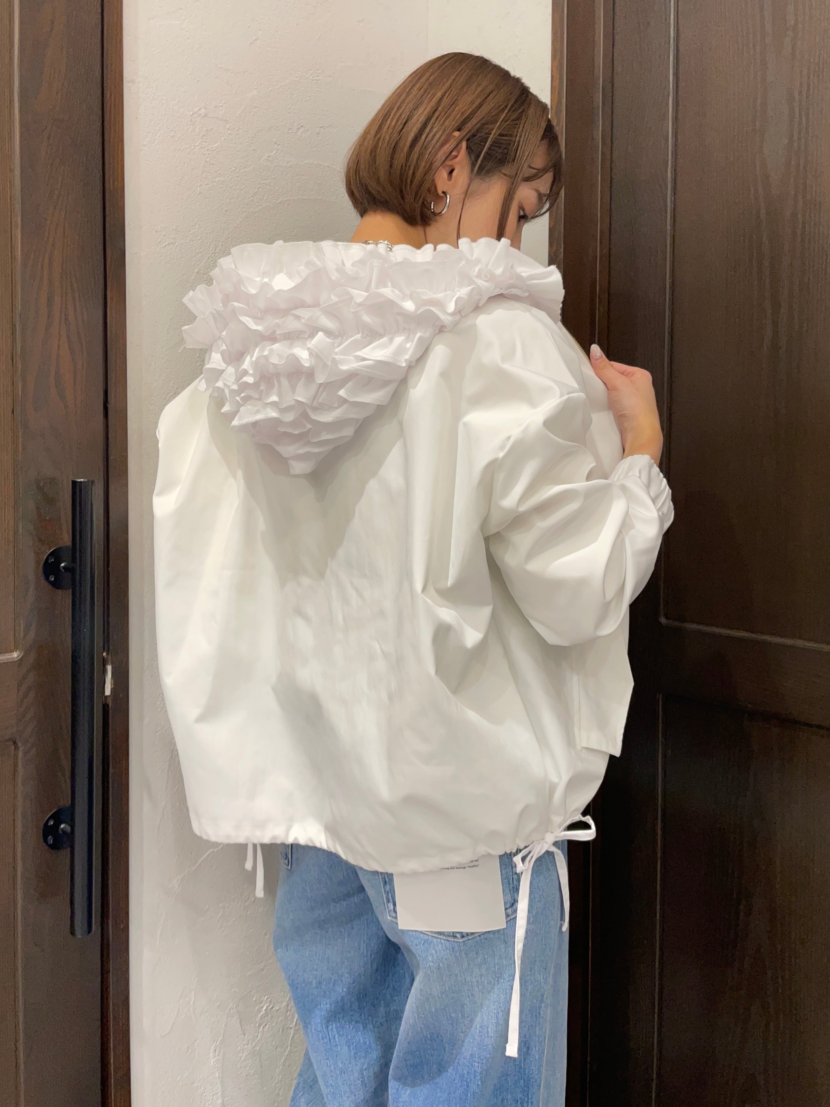 フード部分にフリルが施された、可愛らしさ満点のジップパーカー。