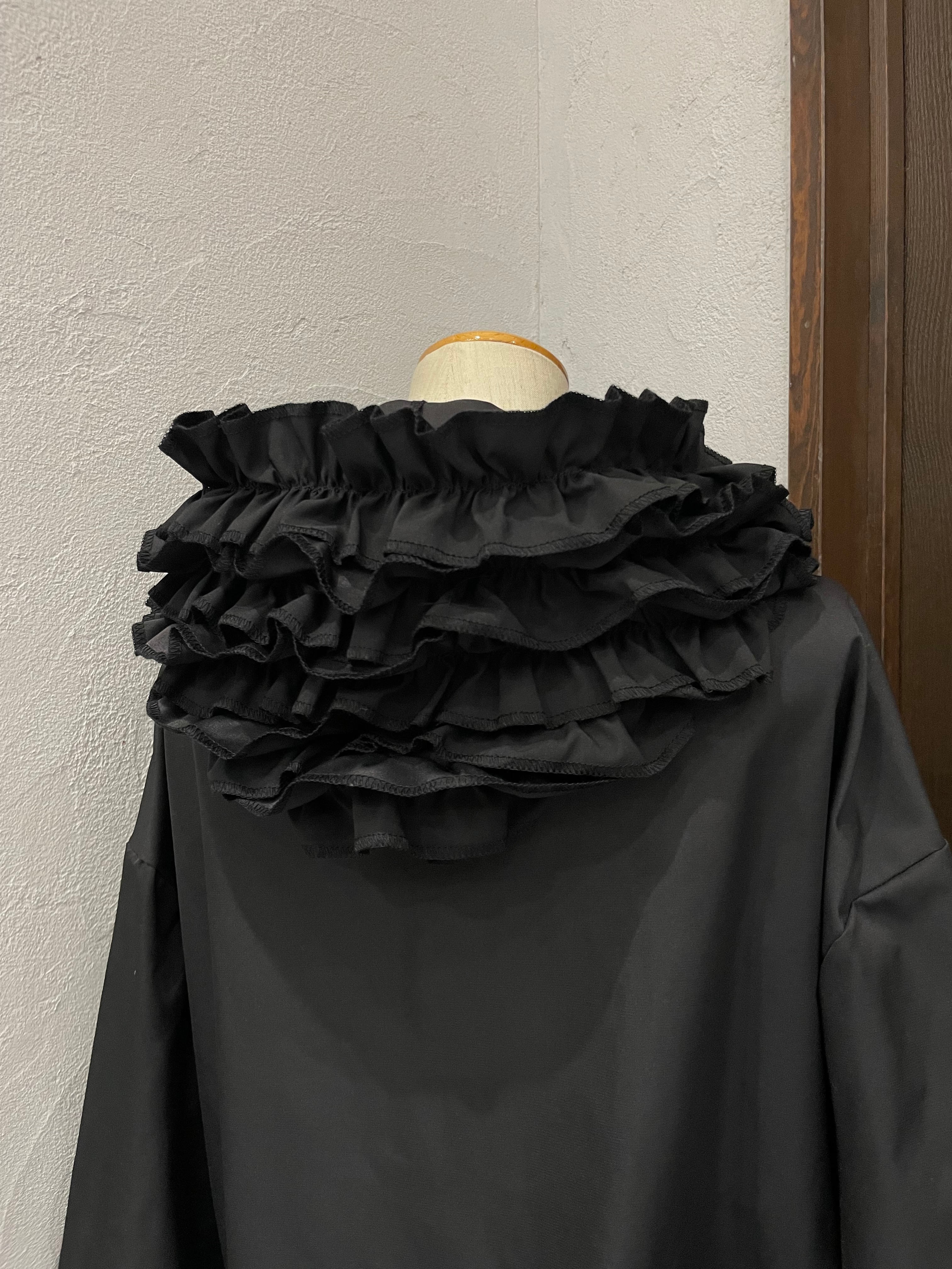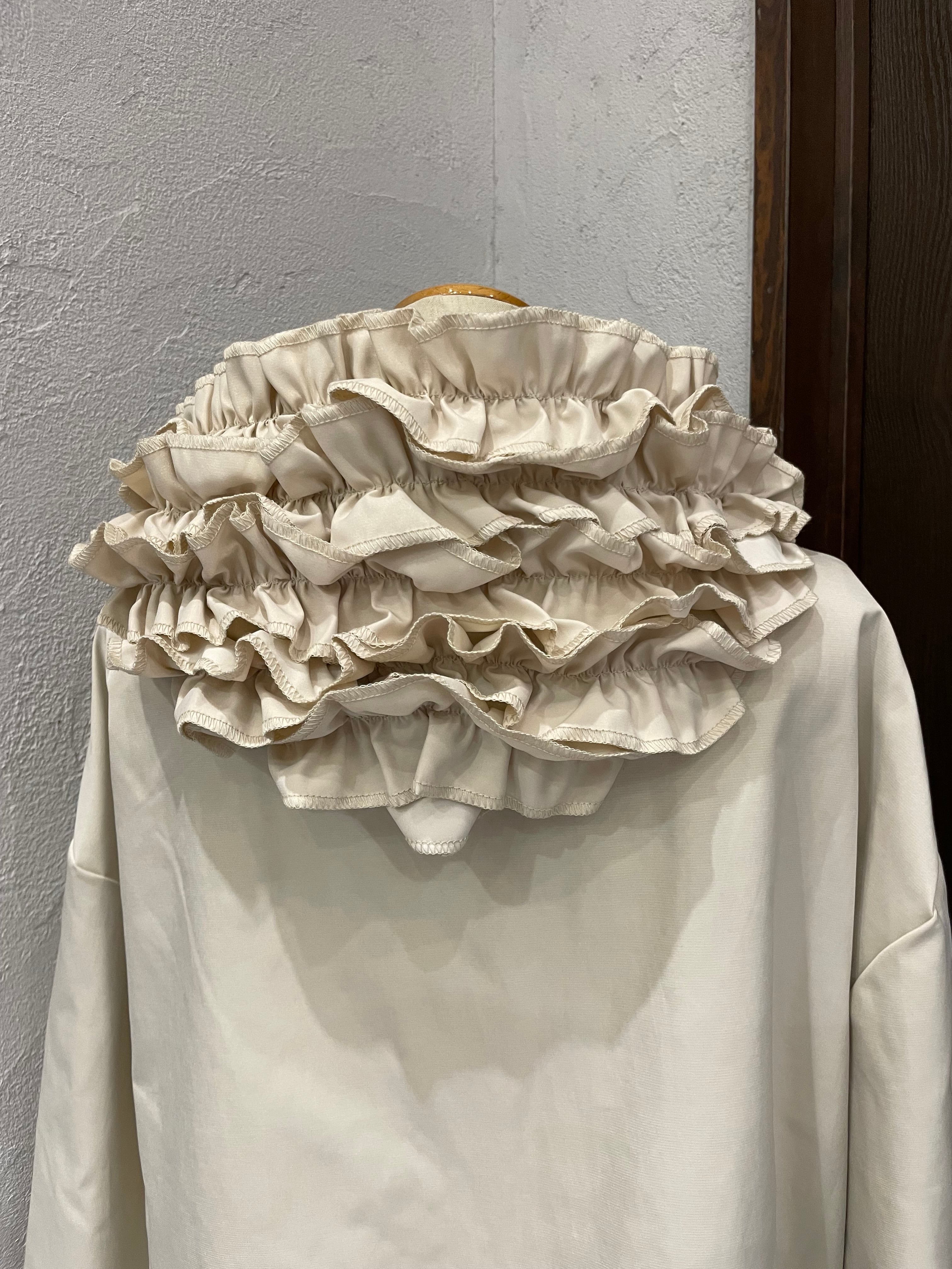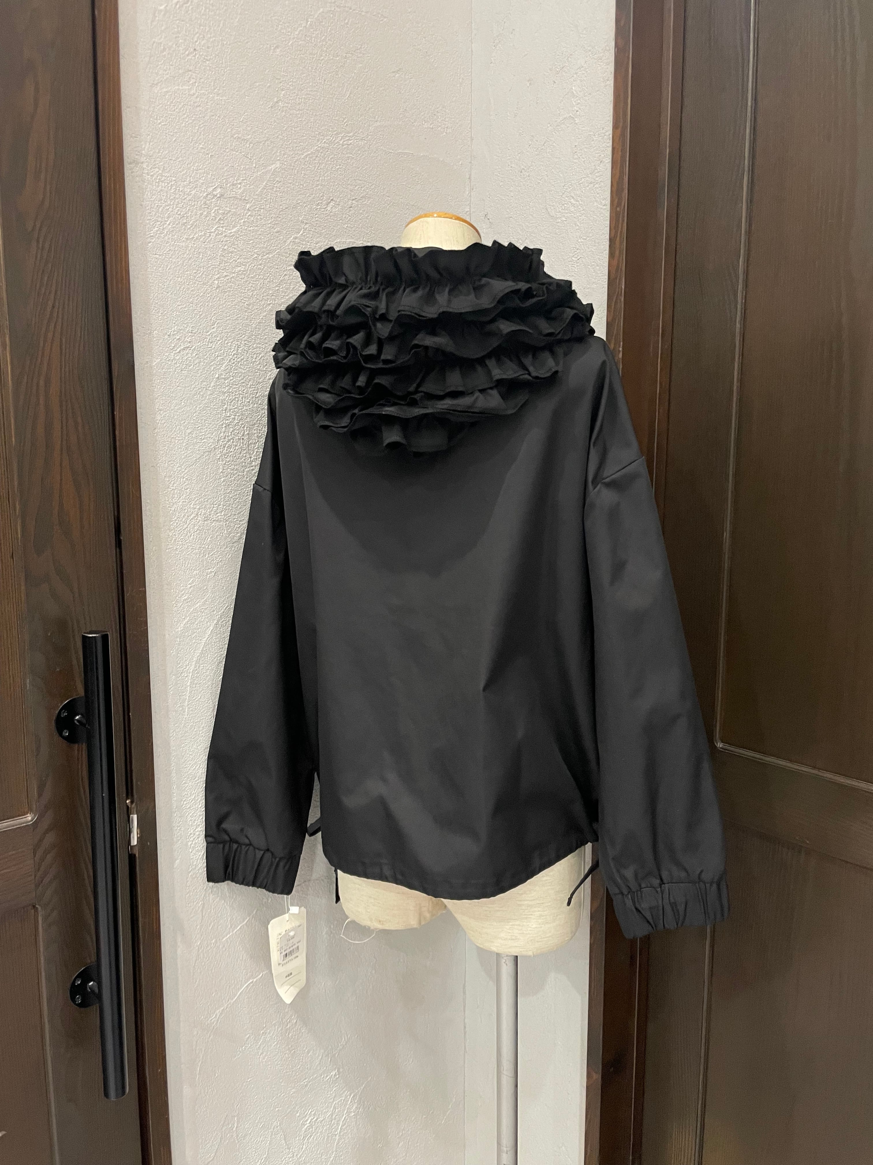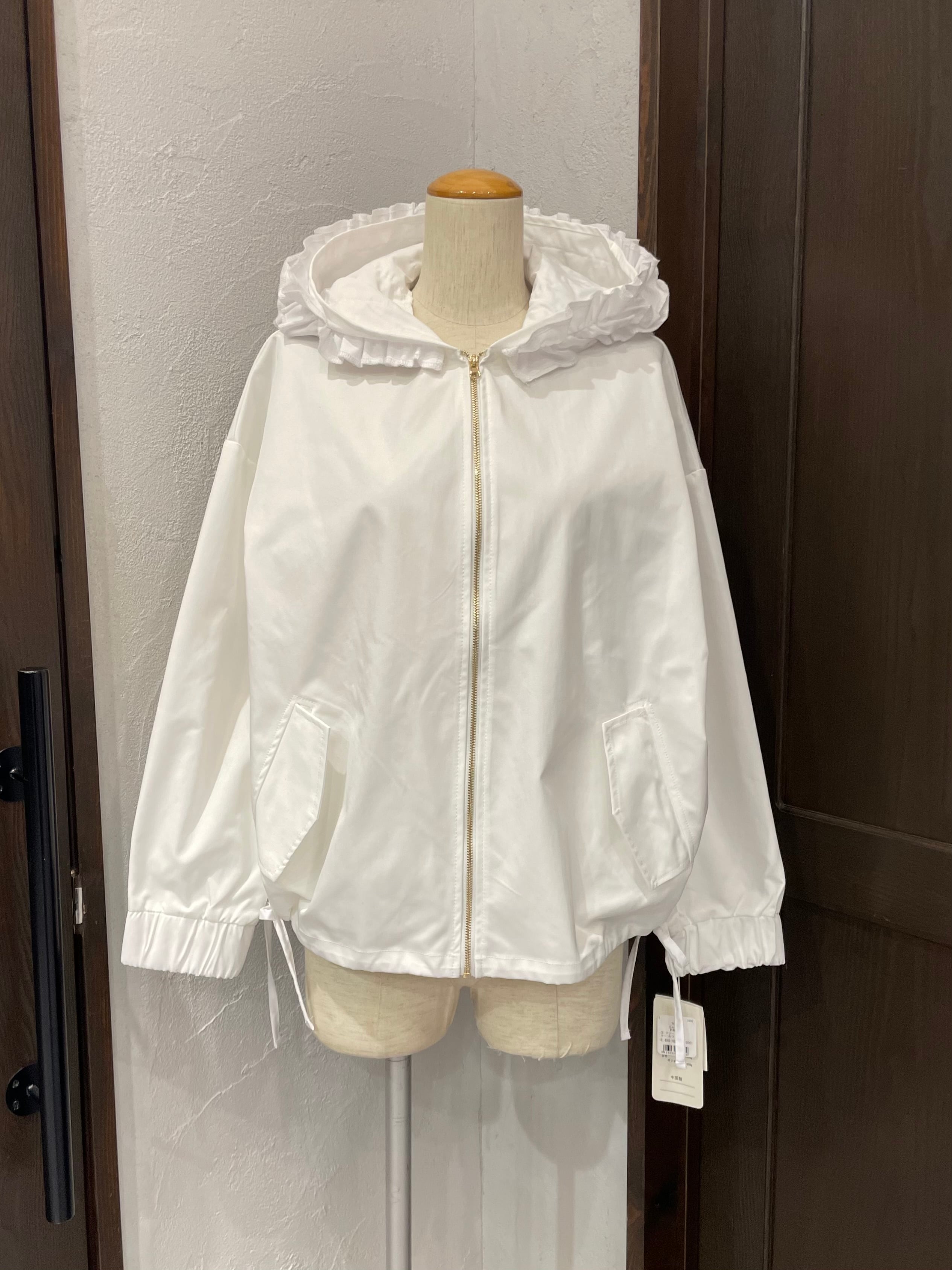フード部分にフリルが施された、可愛らしさ満点のジップパーカー。