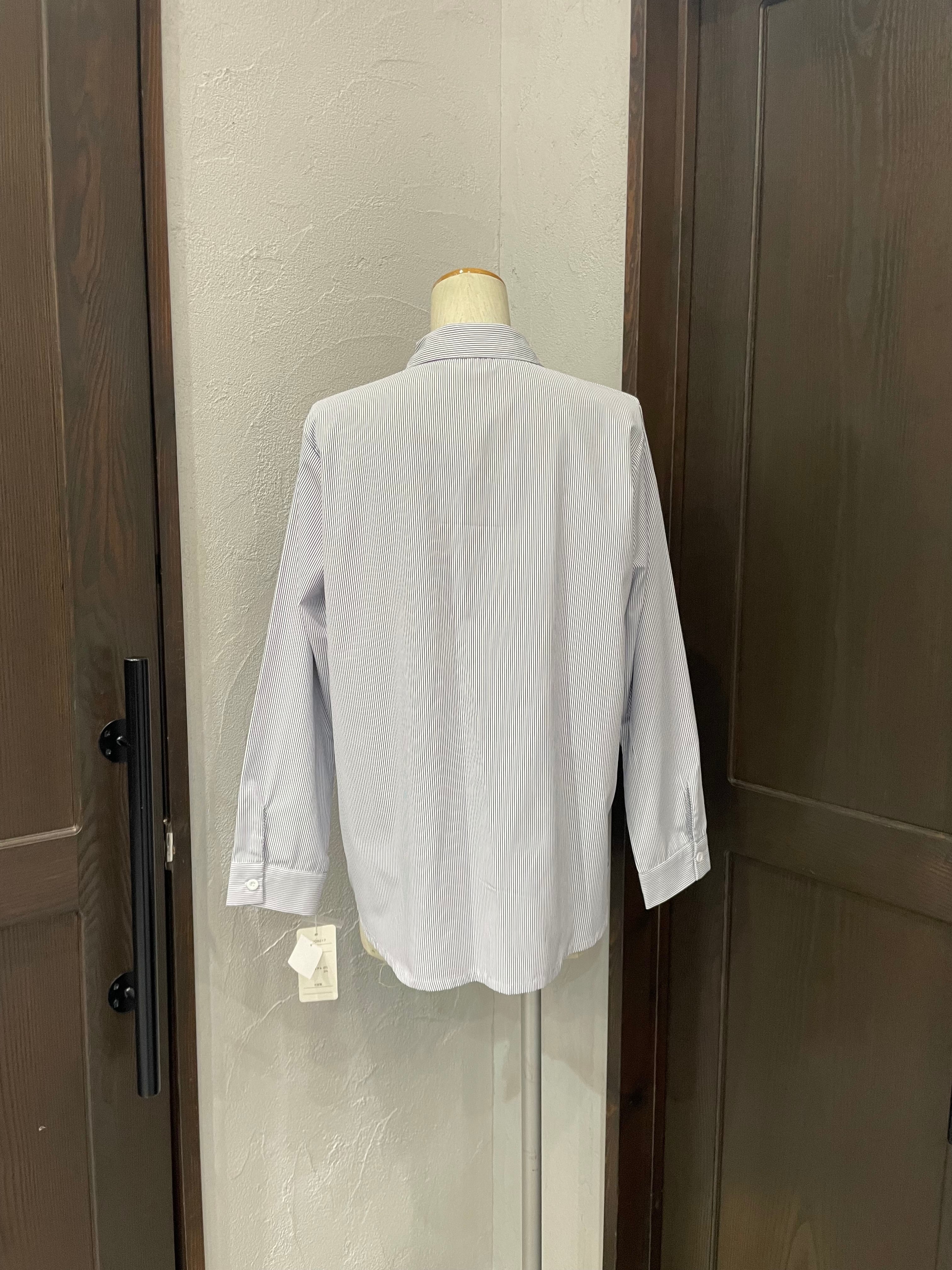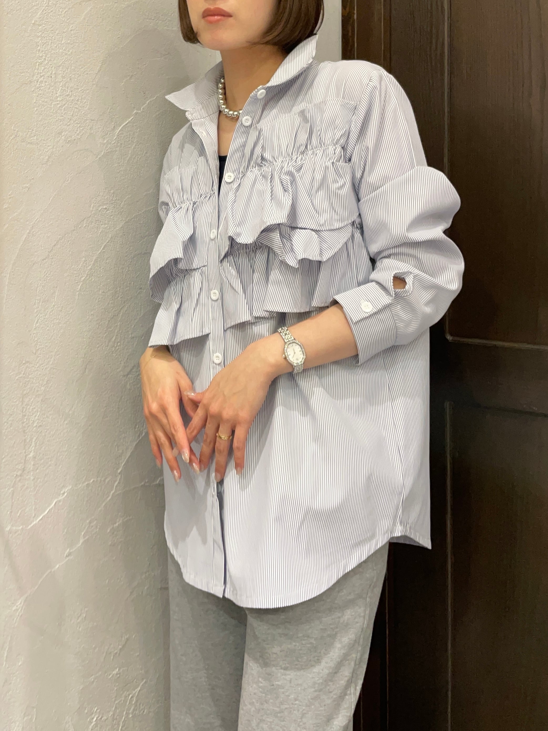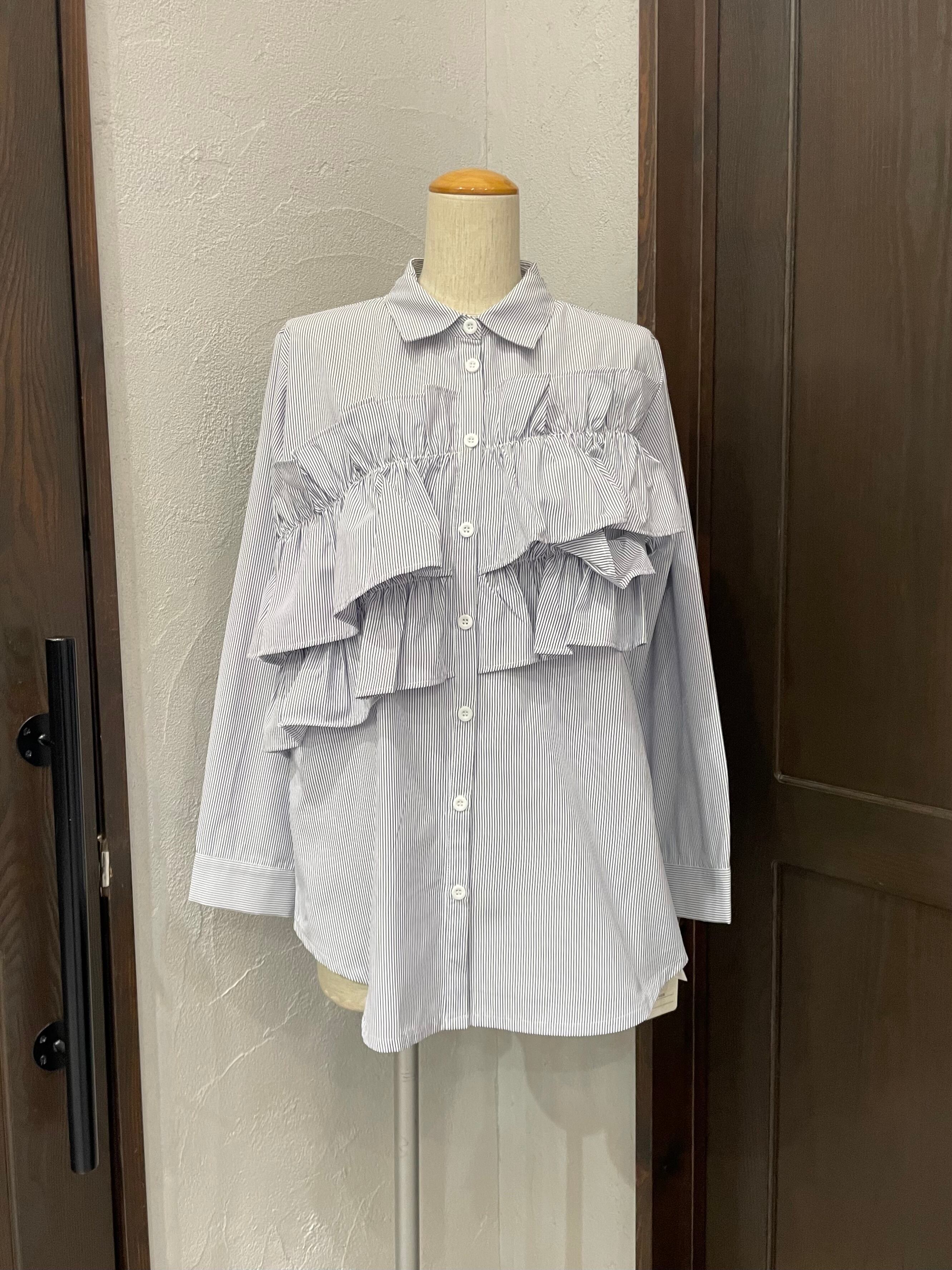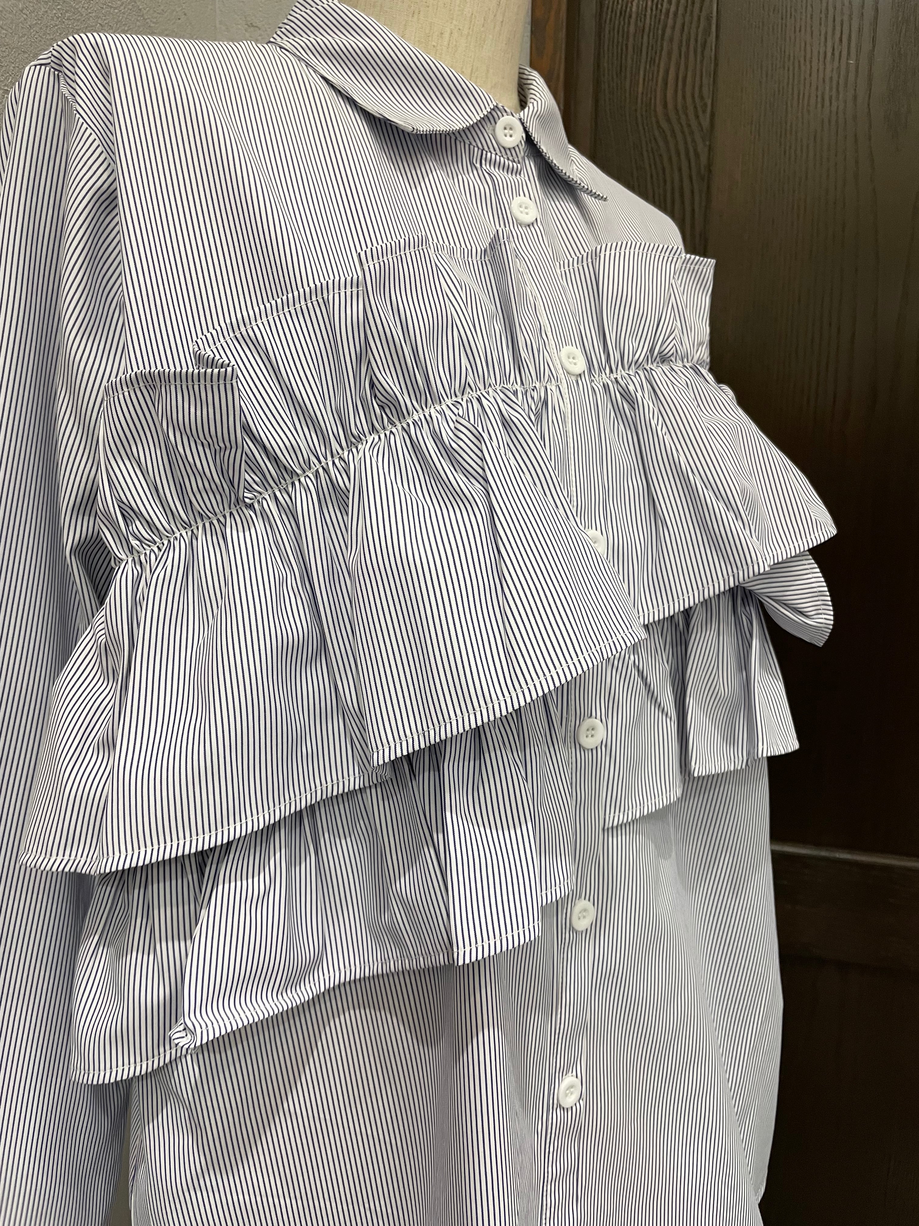 ストライプ地が持つきちんと感と、フリルの遊び心が絶妙に融合した一枚です。
