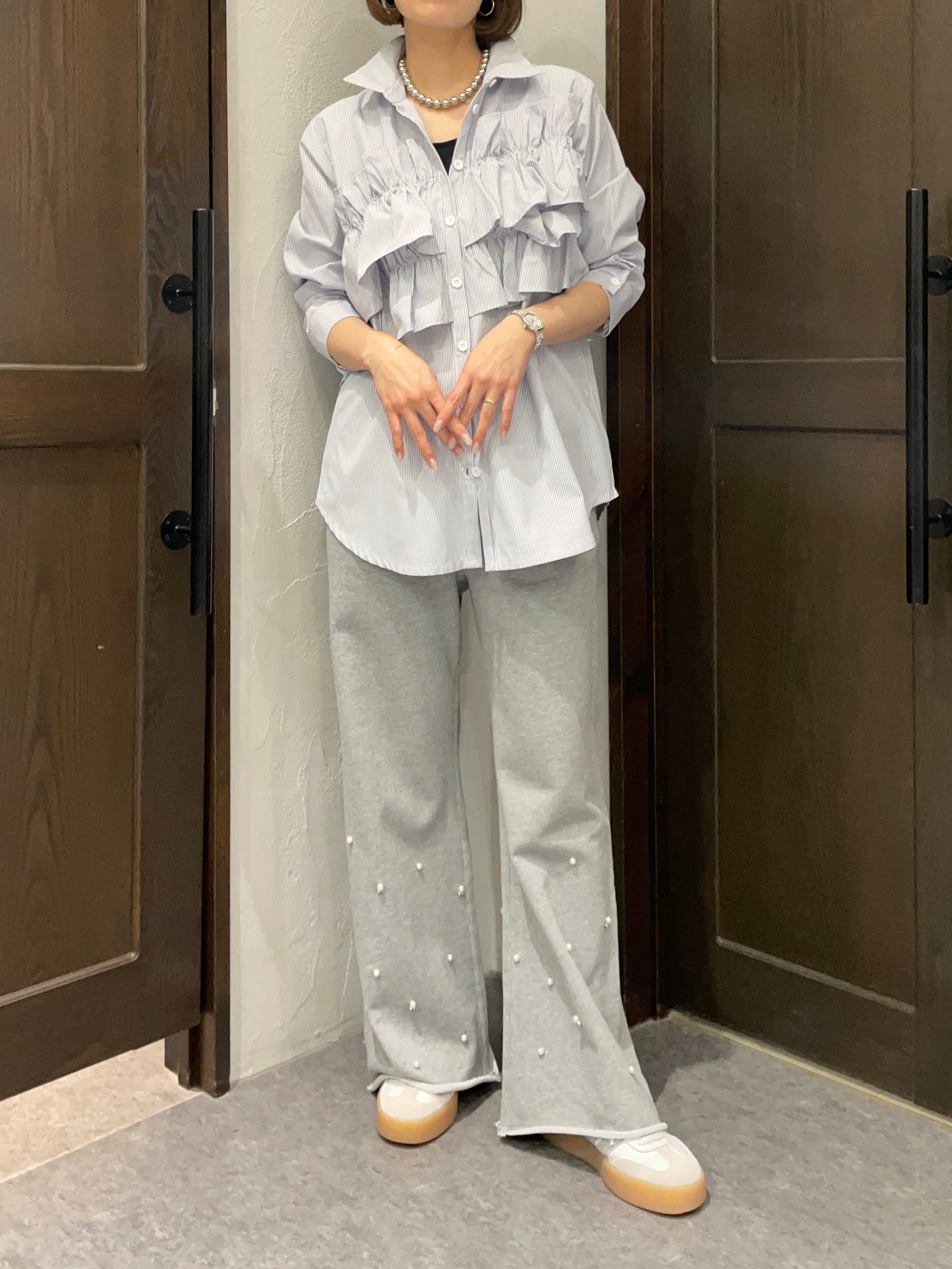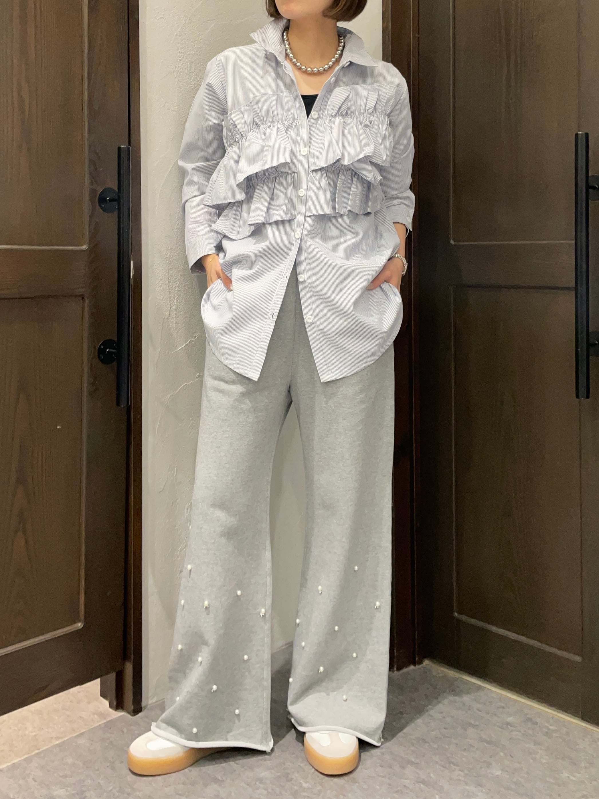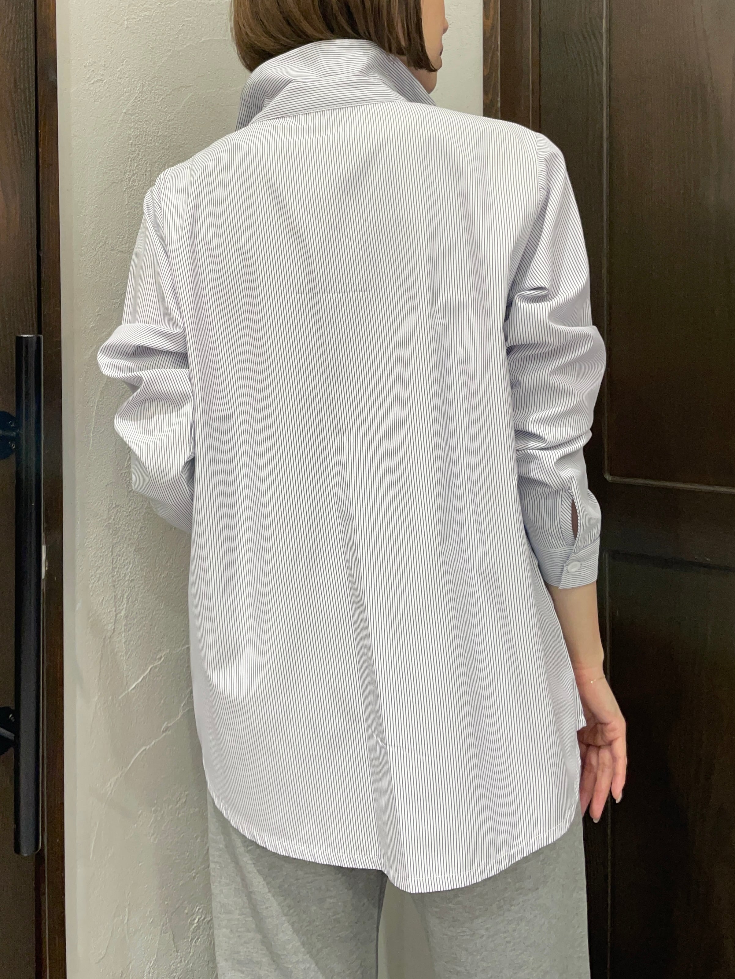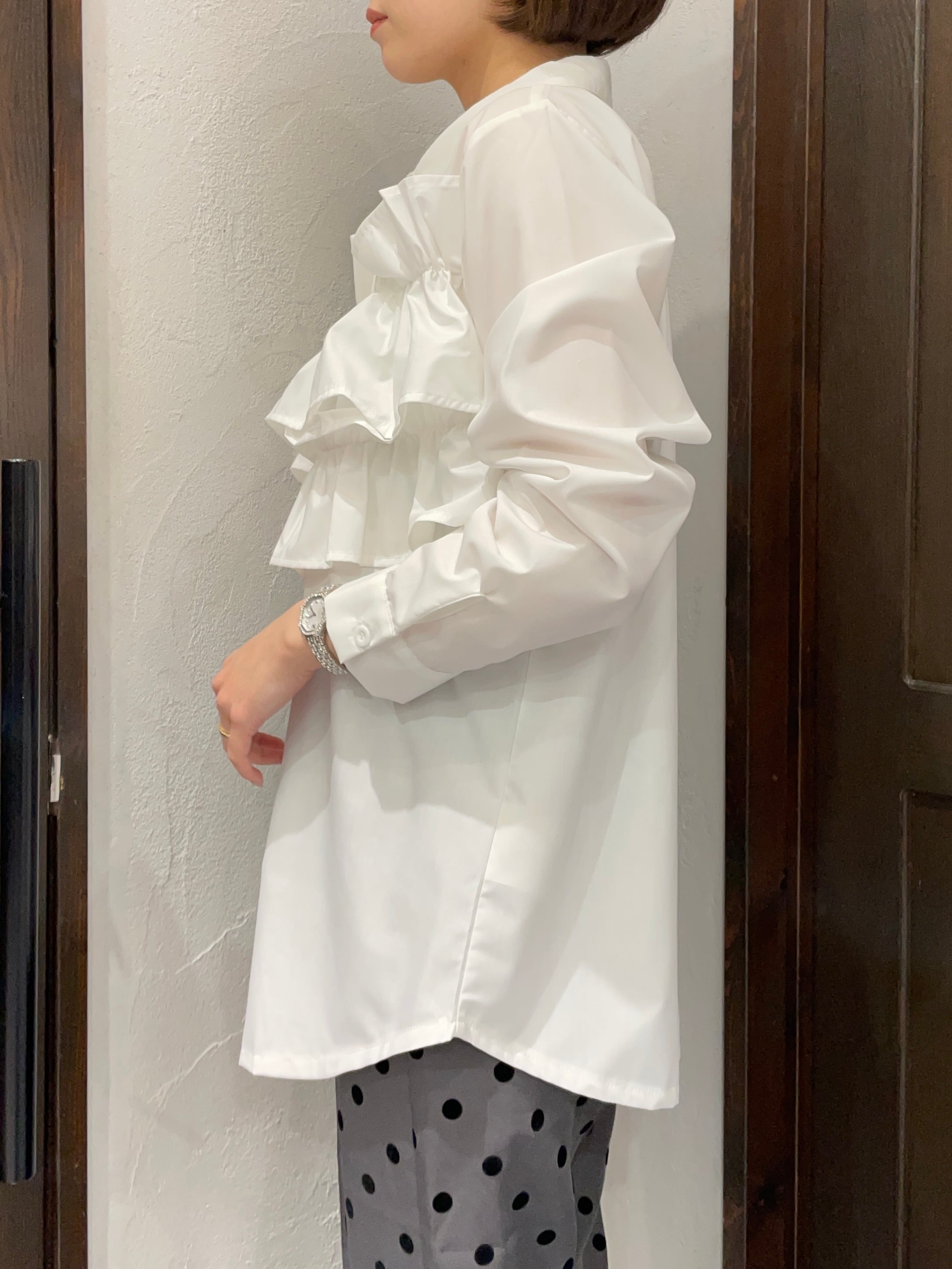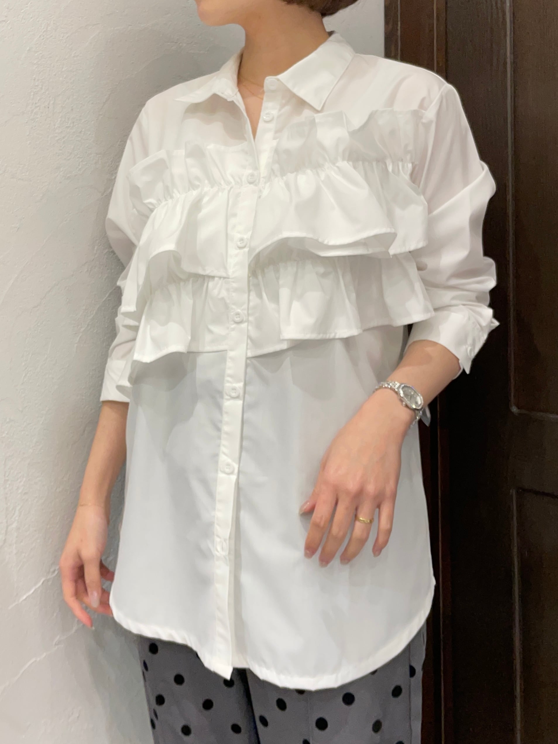 ストライプ地が持つきちんと感と、フリルの遊び心が絶妙に融合した一枚です。