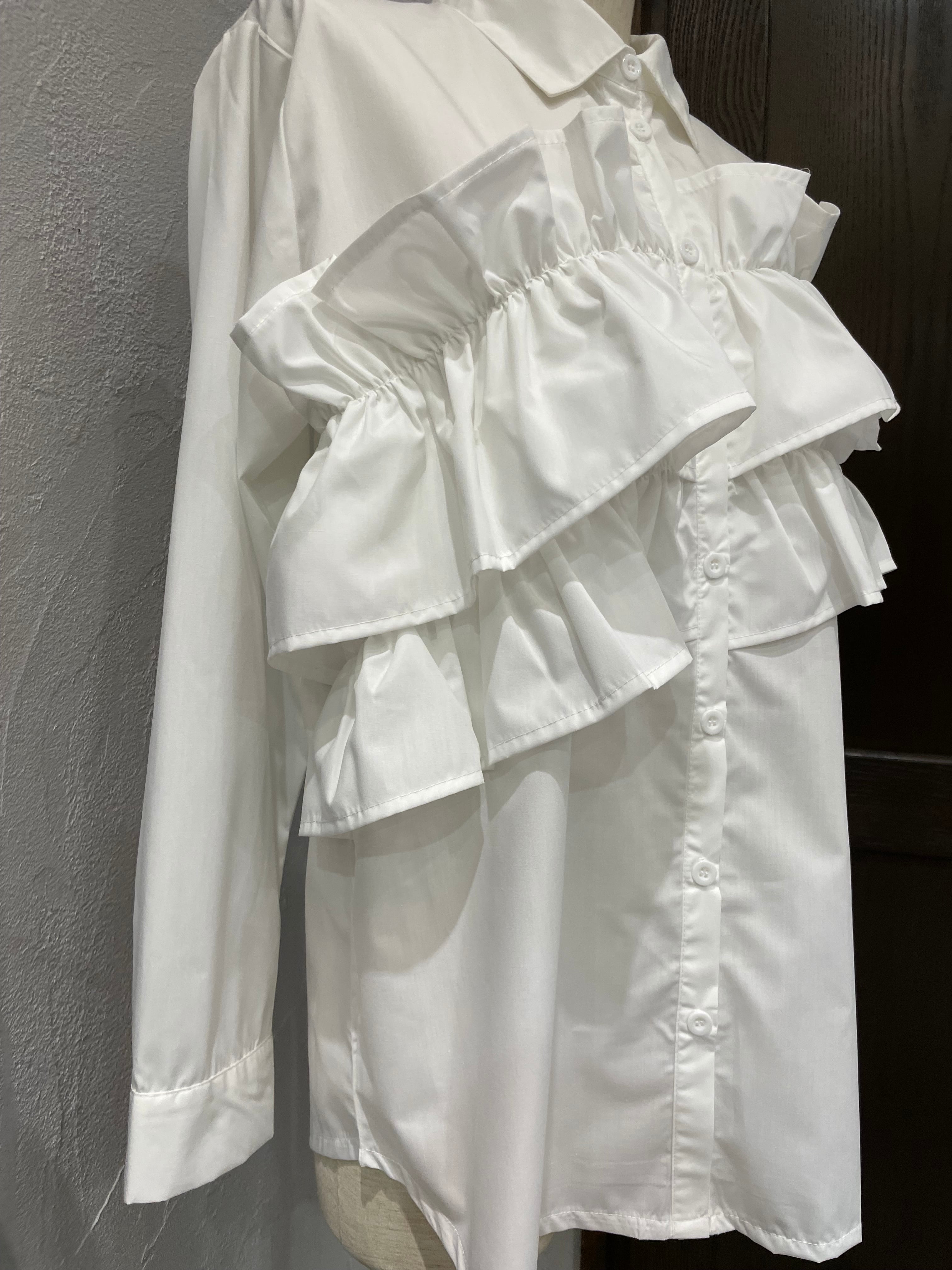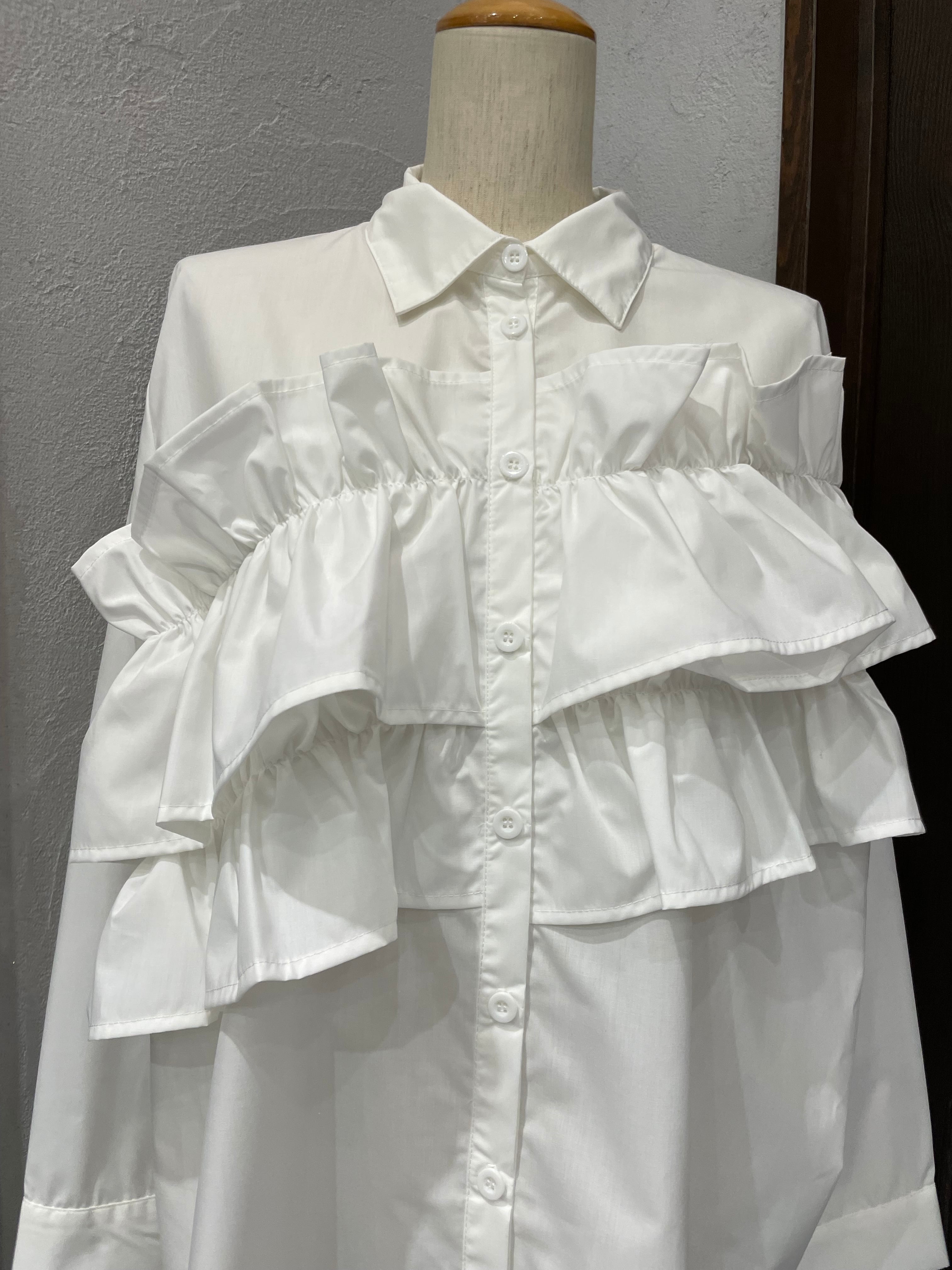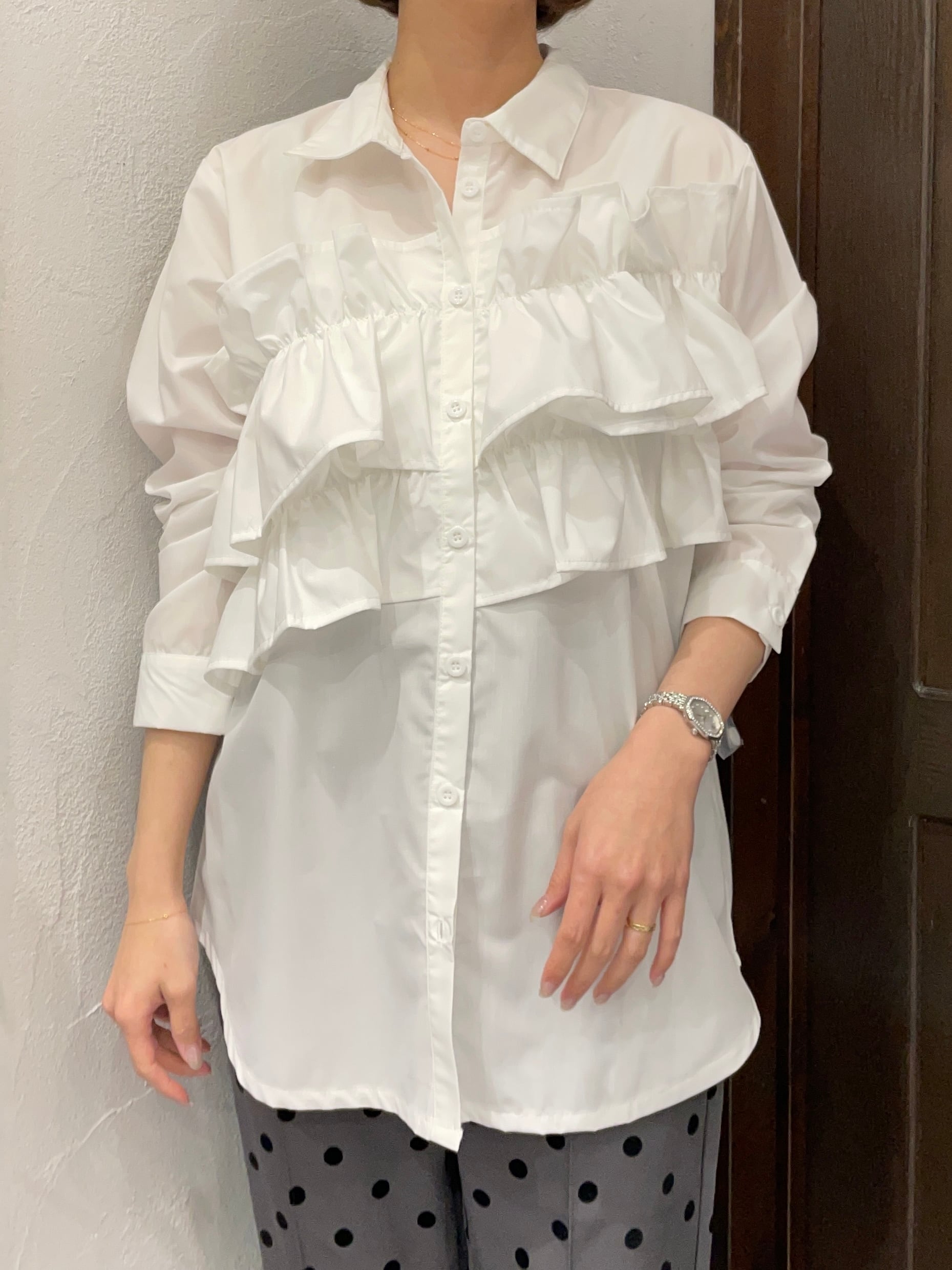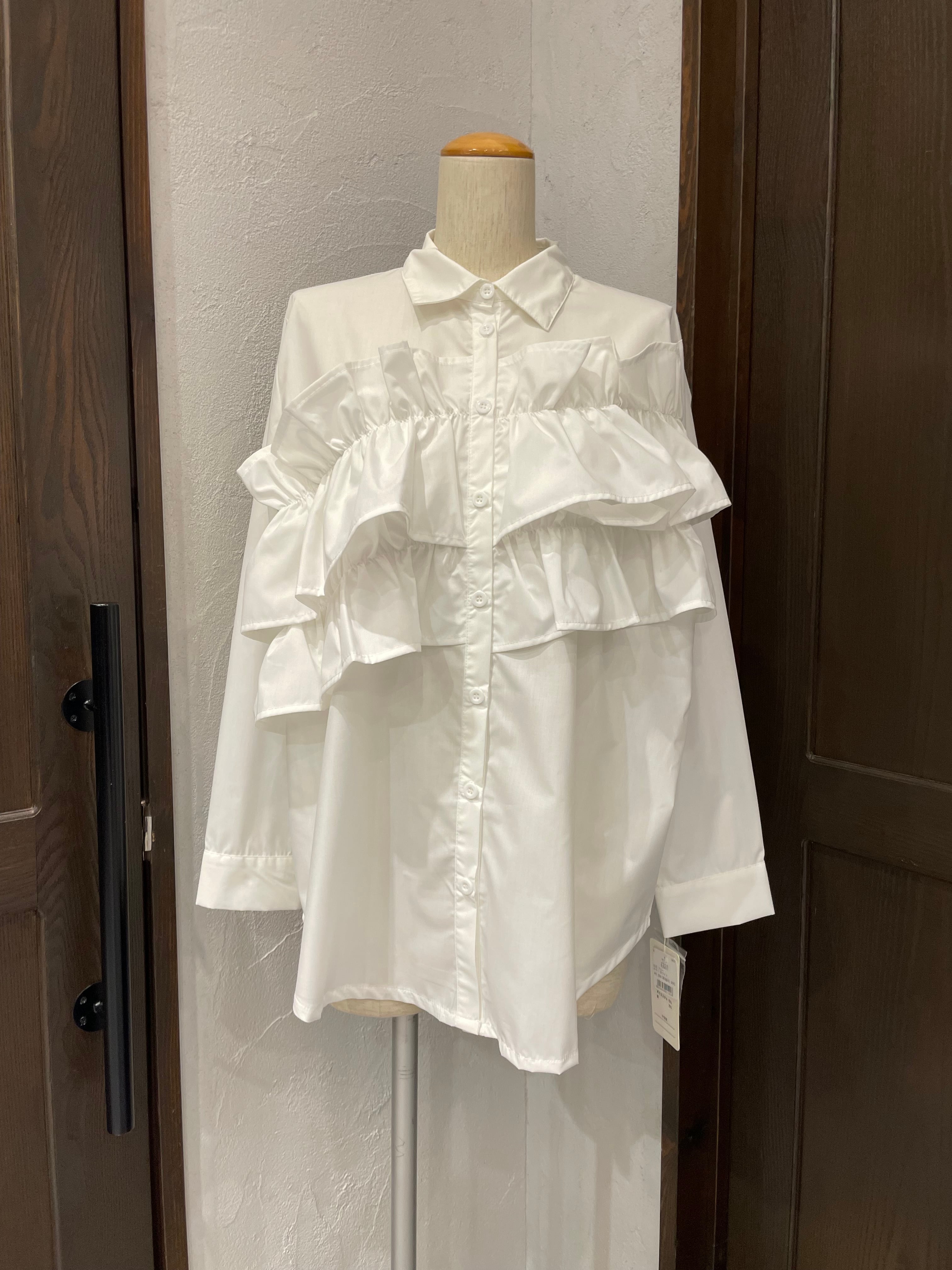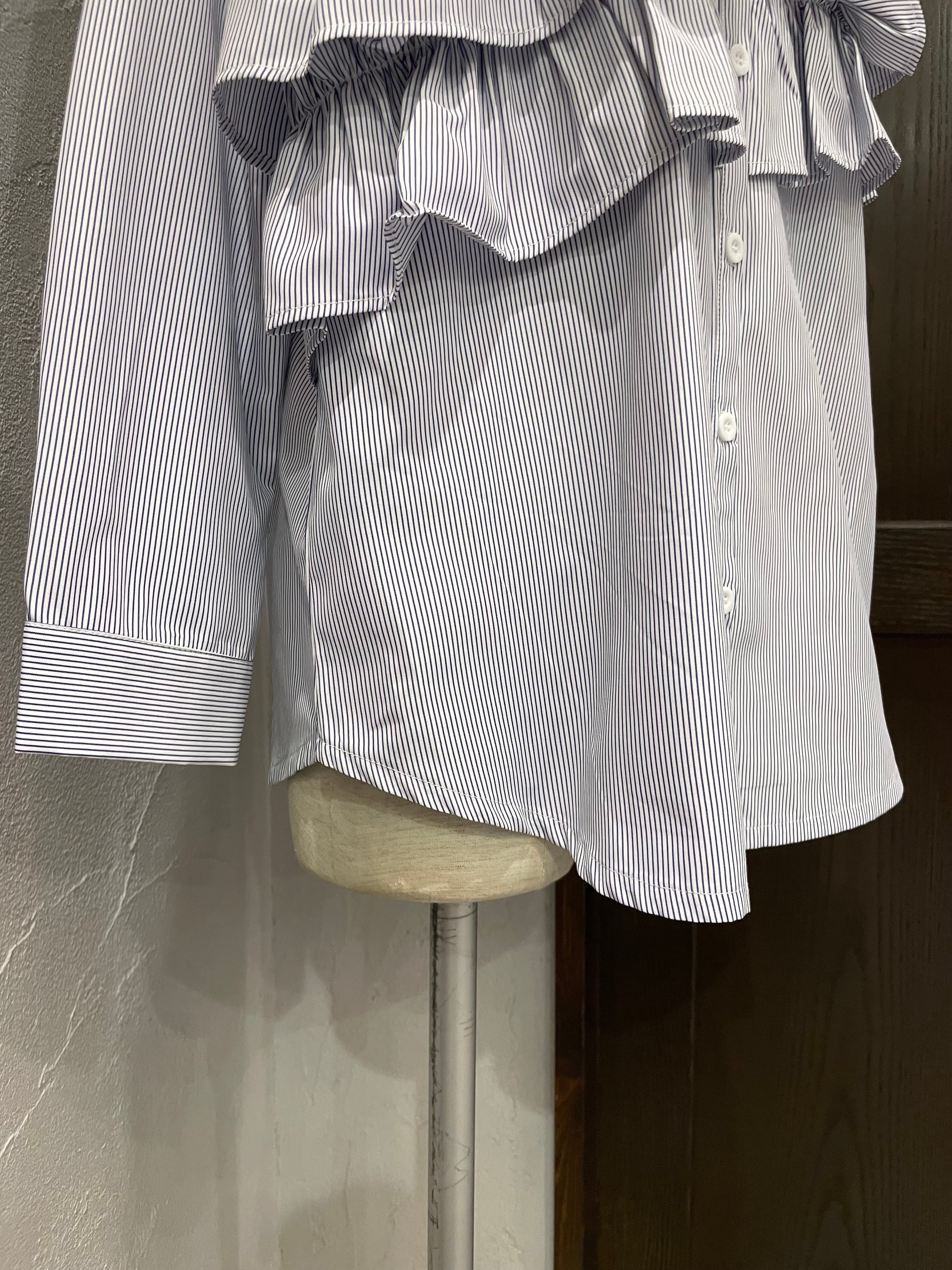 胸の位置に大胆にフリルを施した、華やかなフロントアシメフリルストライプブラウス。