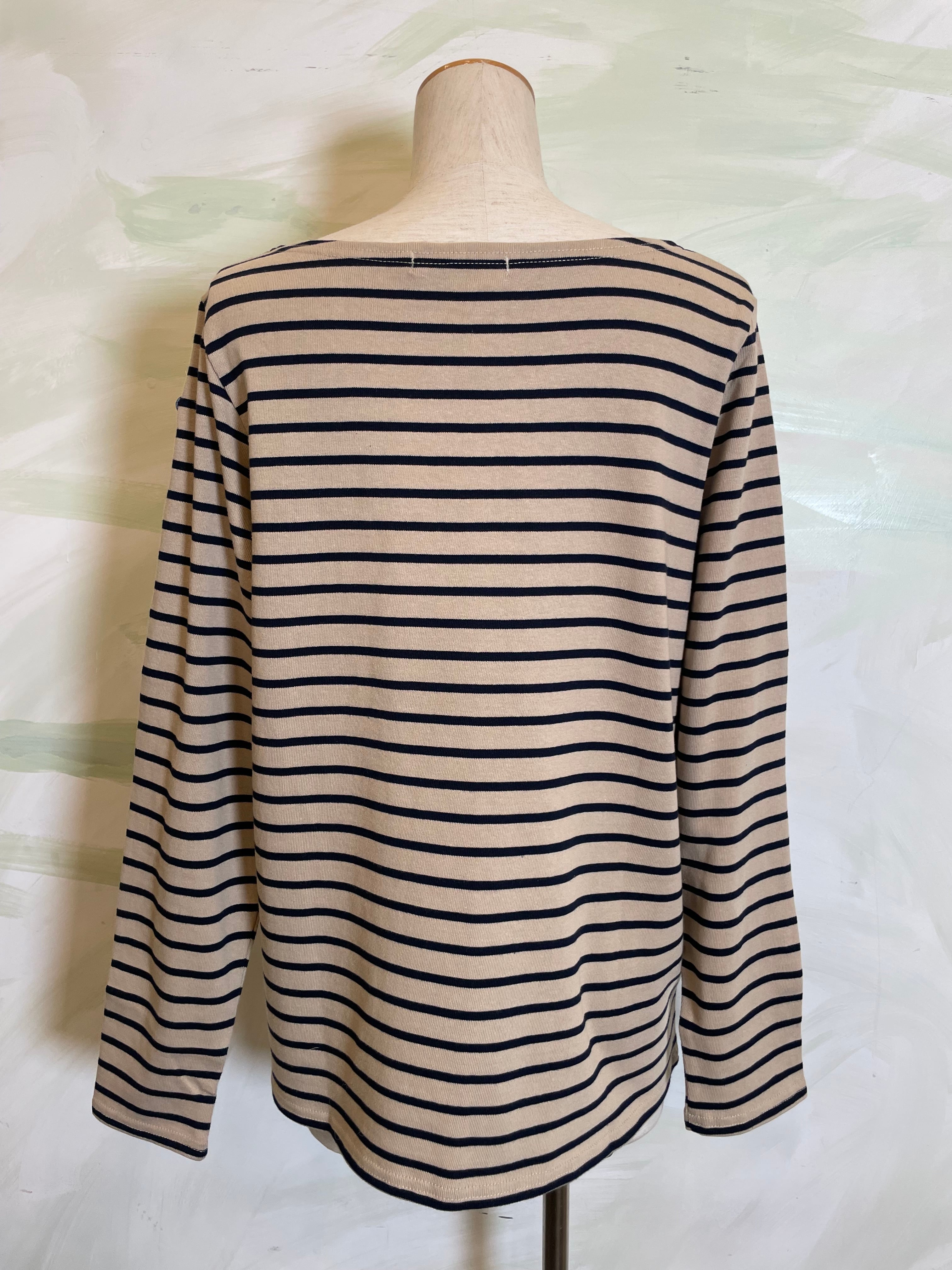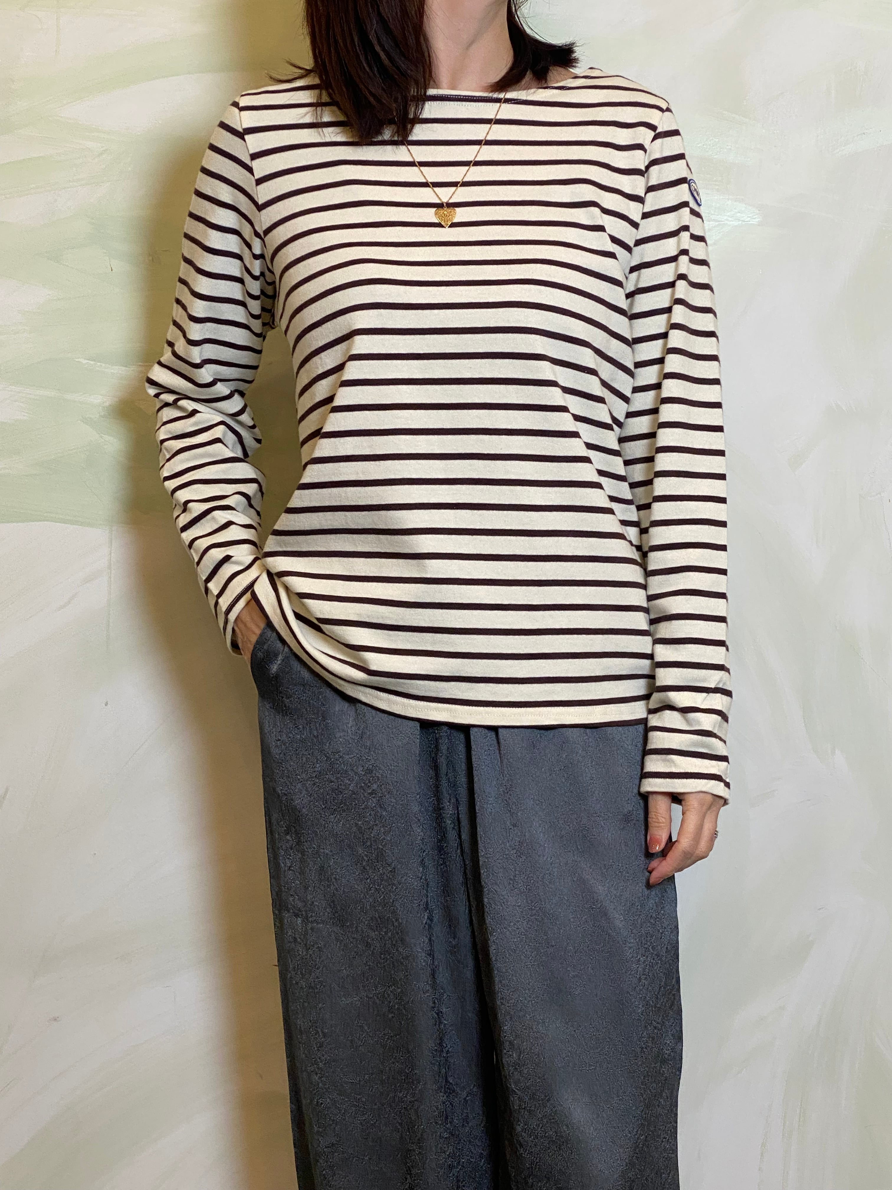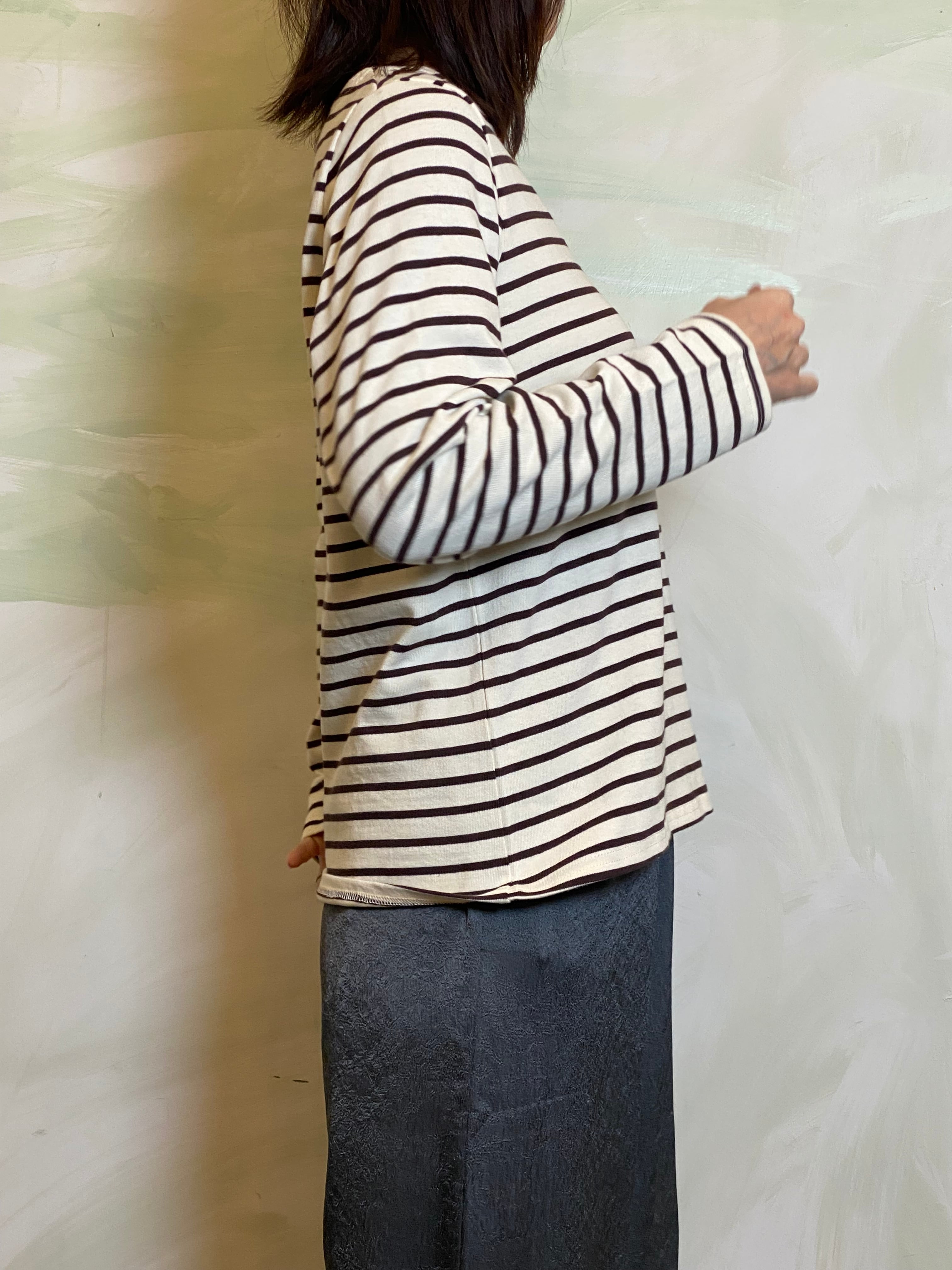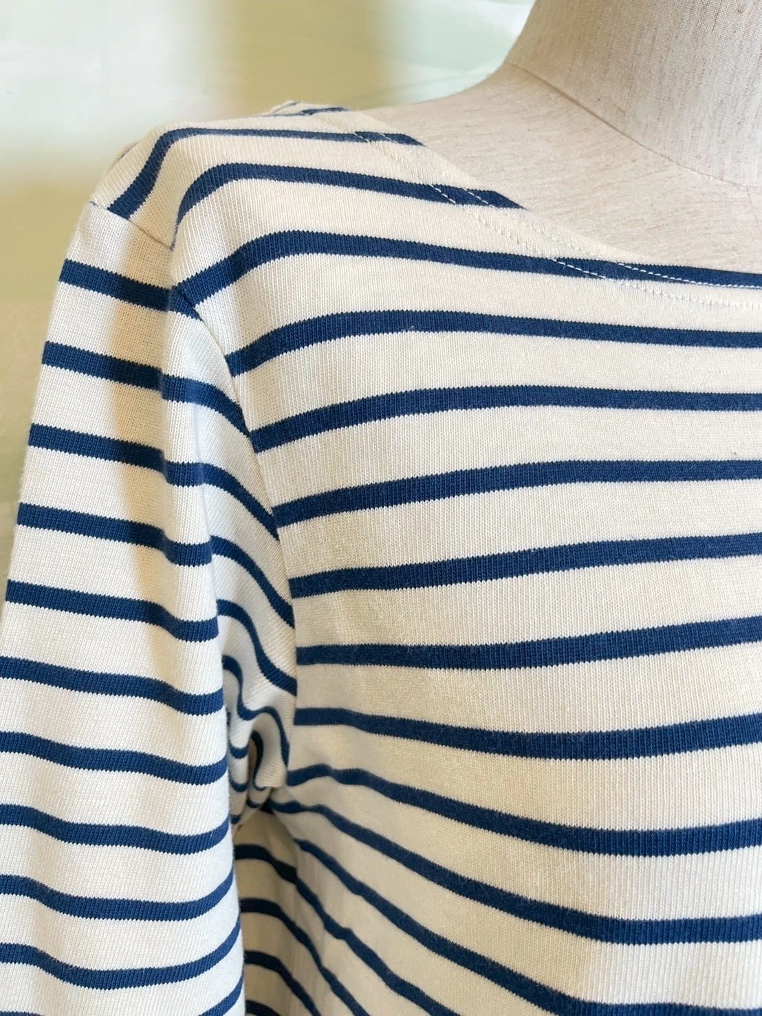 ボートネックが首元をすっきりと見せ、カジュアルながらも女性らしい印象に。