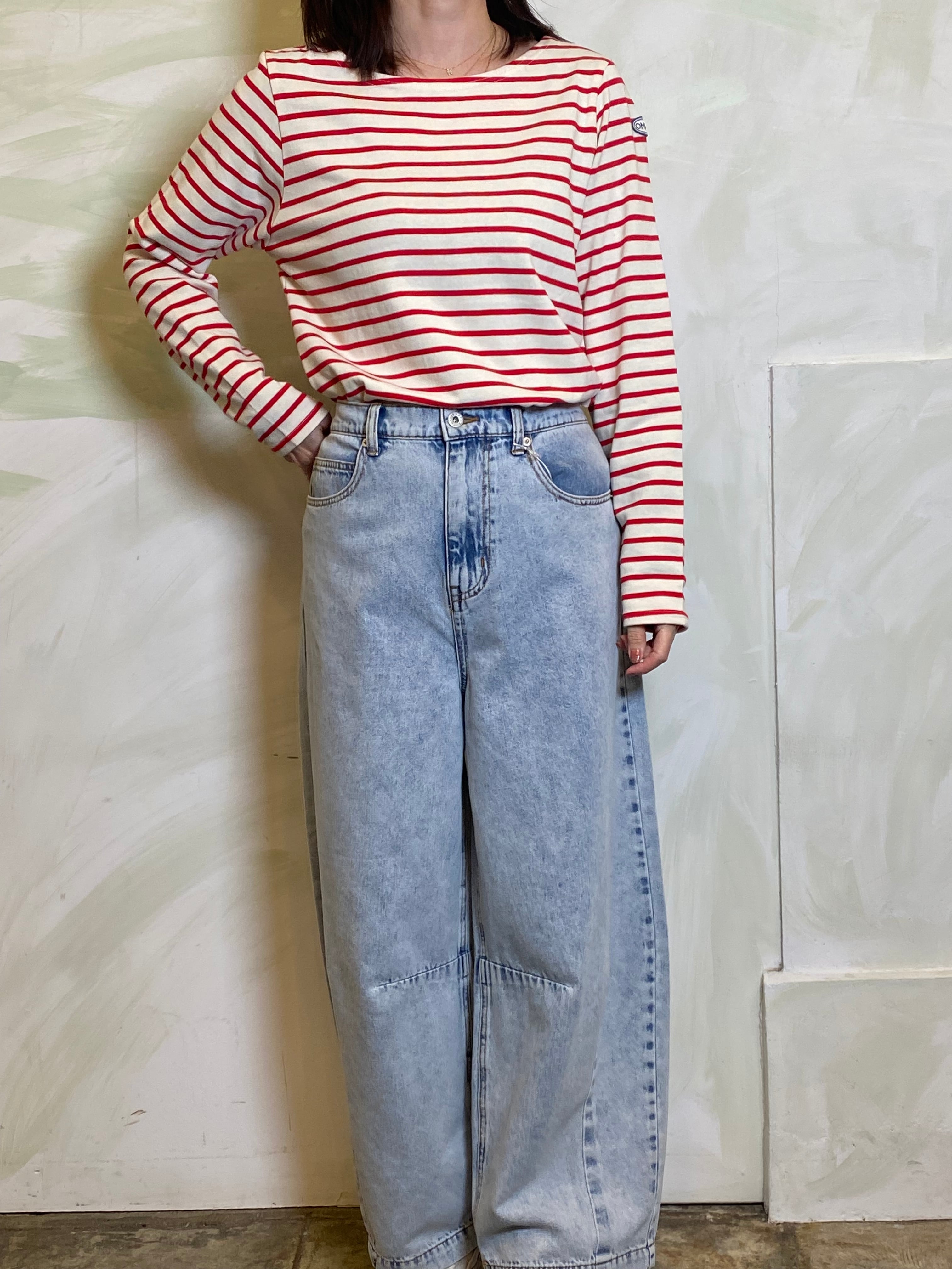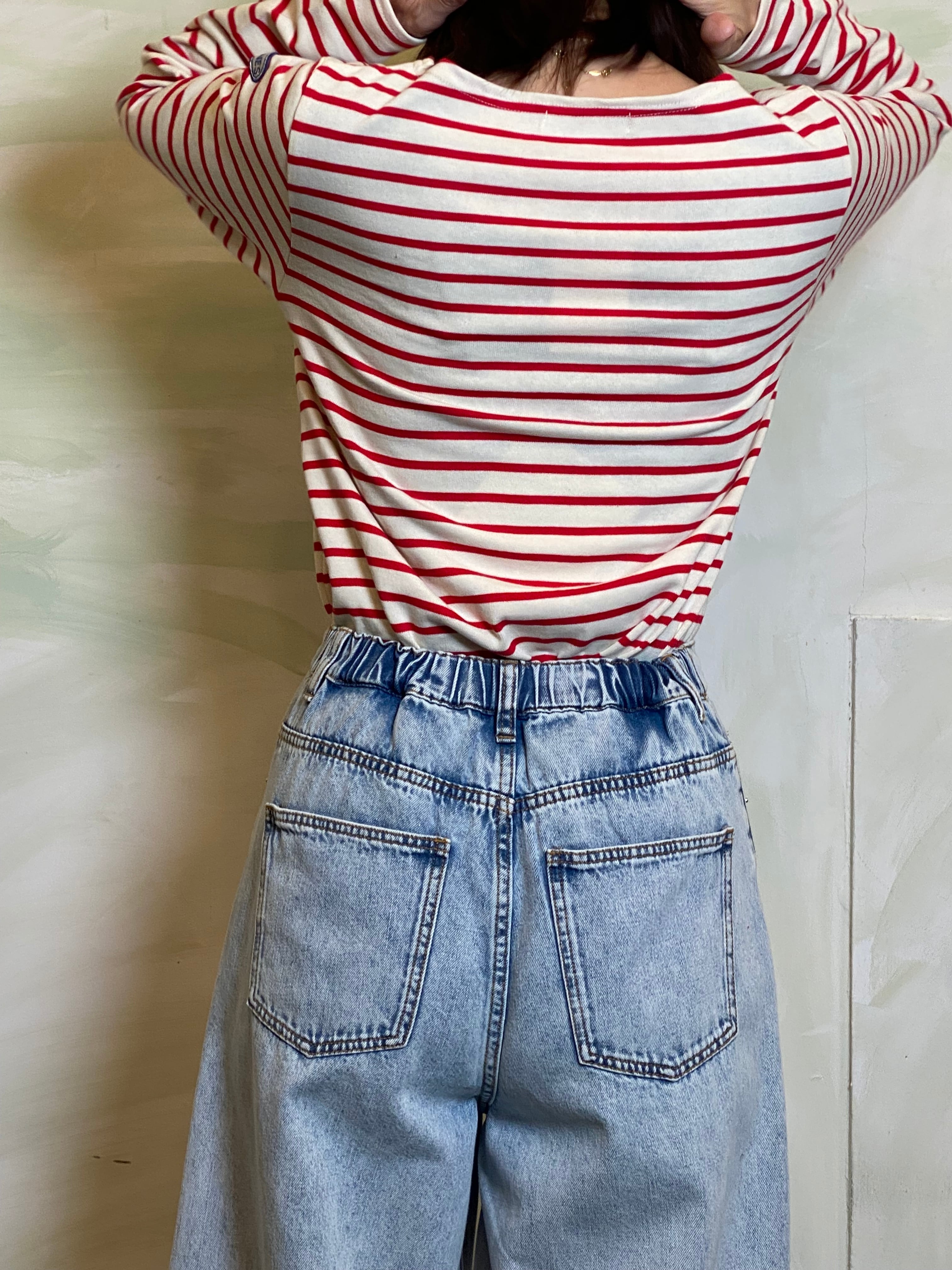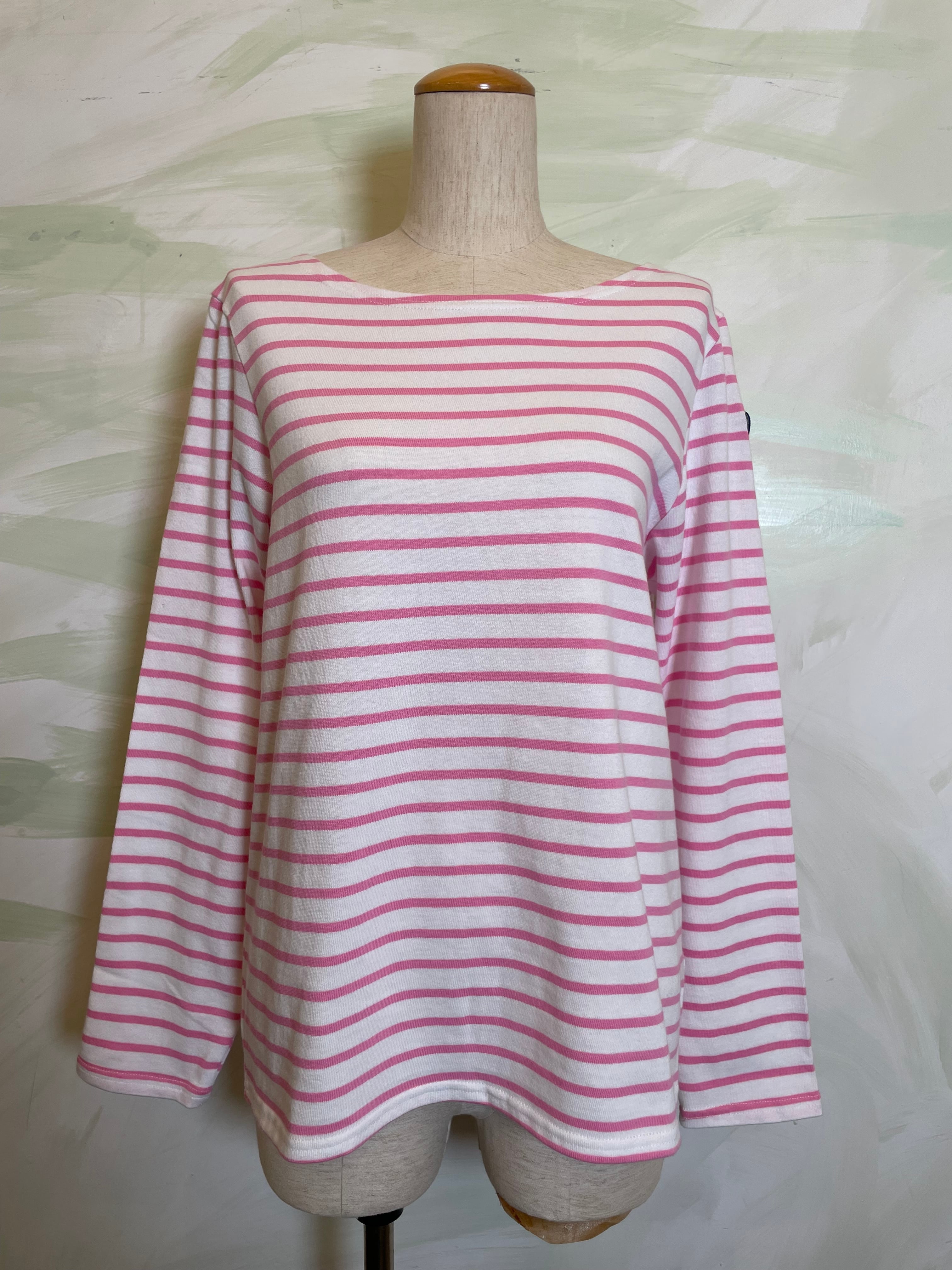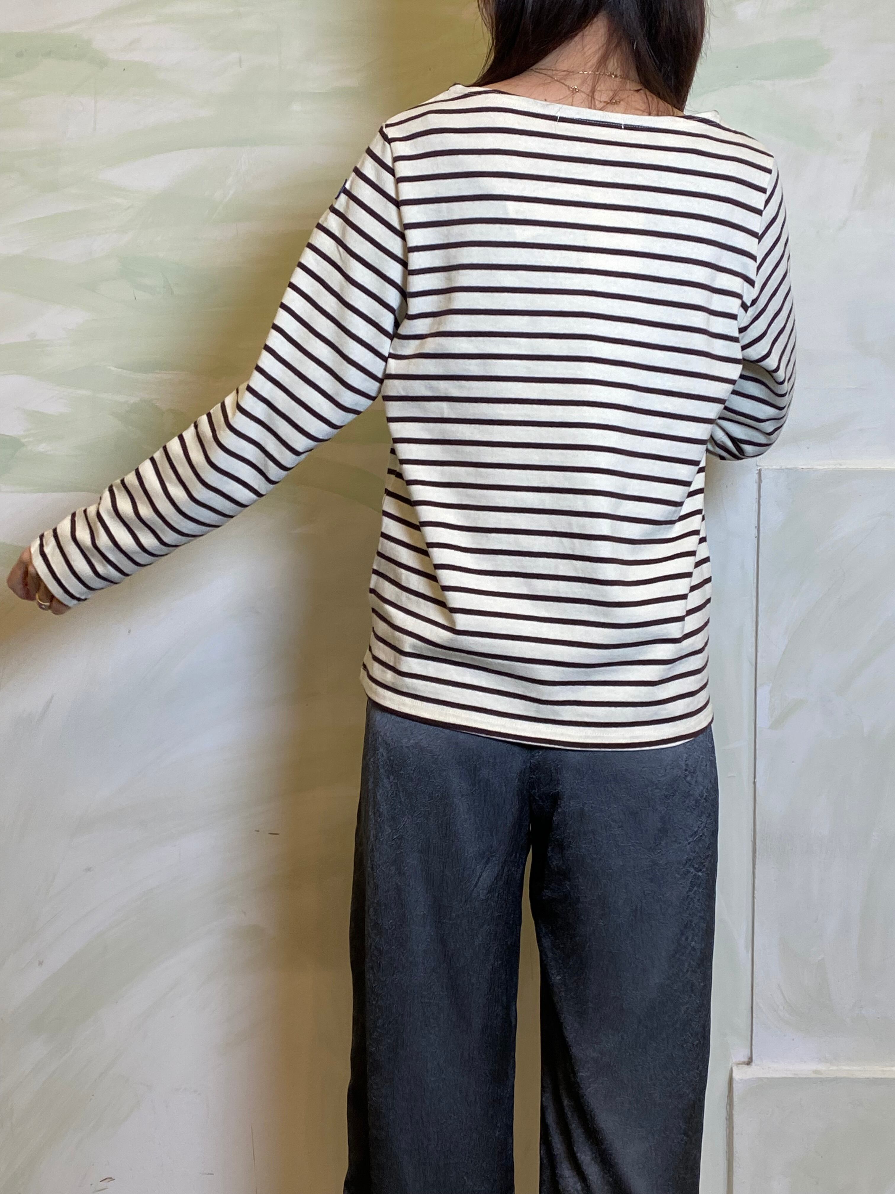 ボートネックが首元をすっきりと見せ、カジュアルながらも女性らしい印象に。
