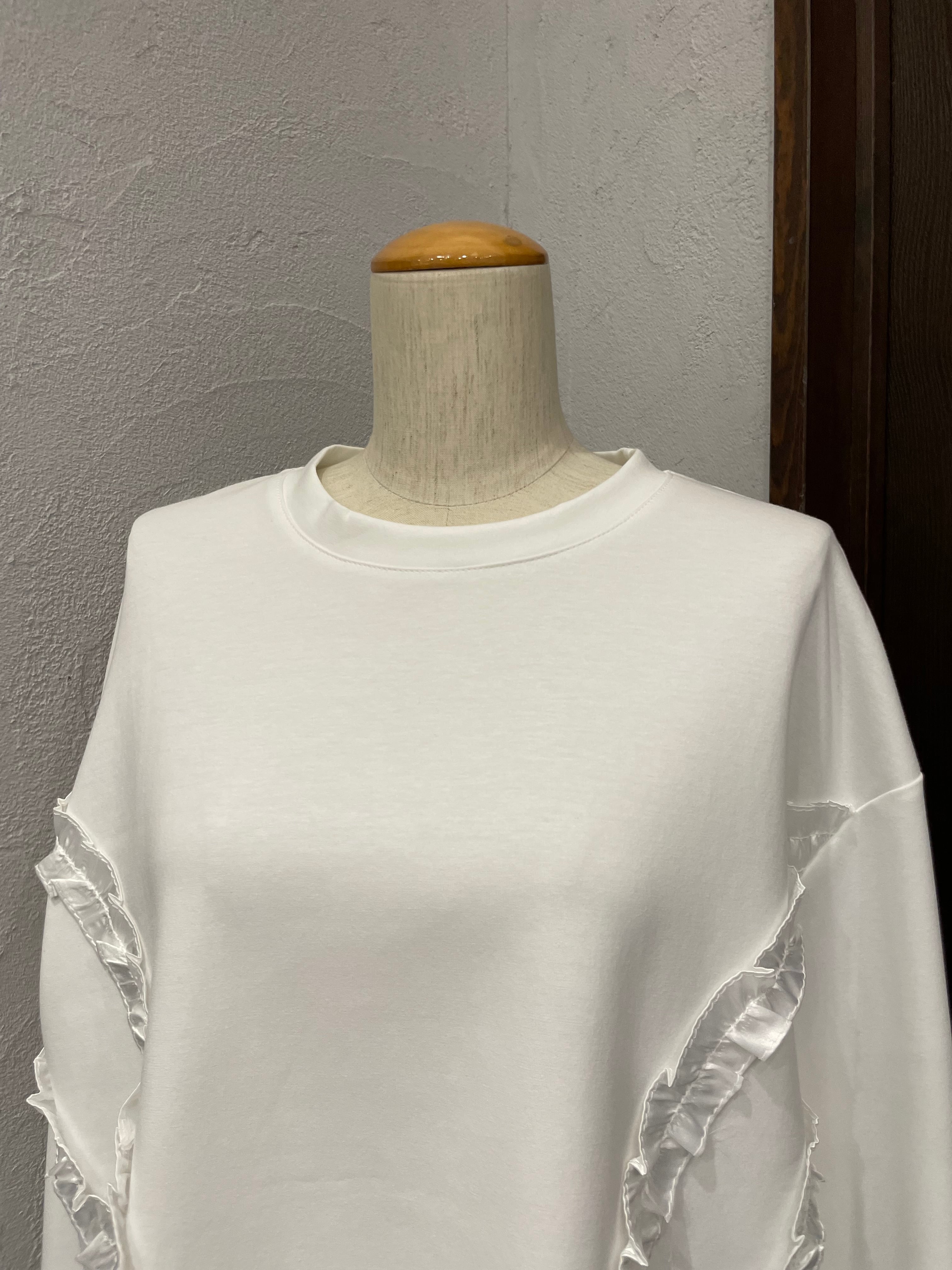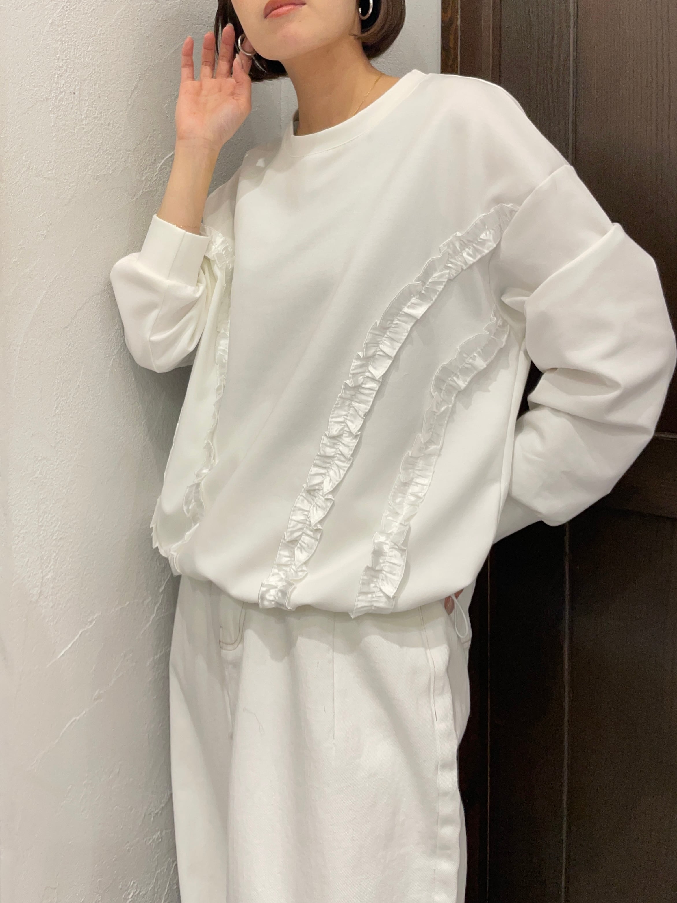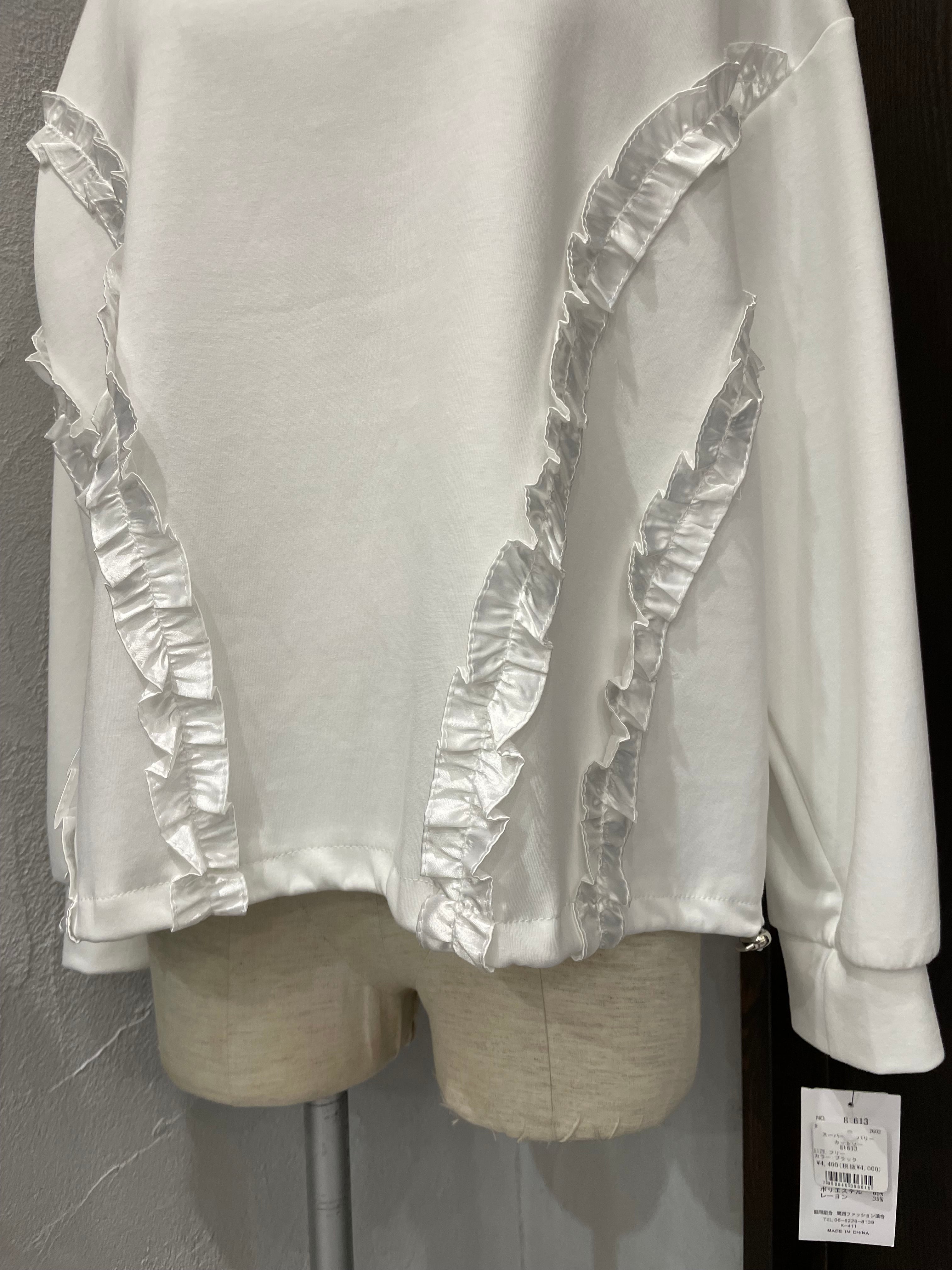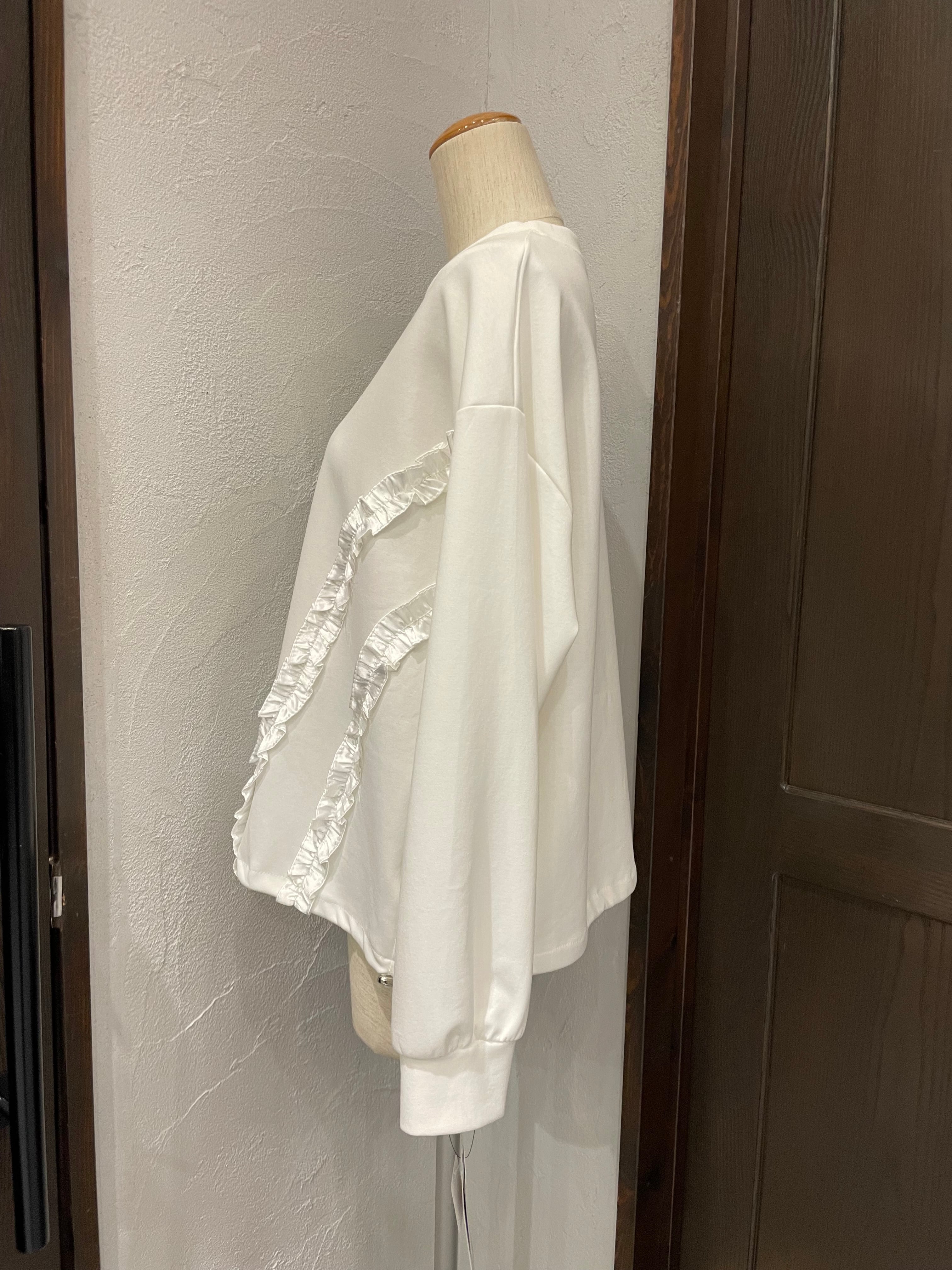 サイドからフリルテープを施したダンボールニットプルオーバー。
