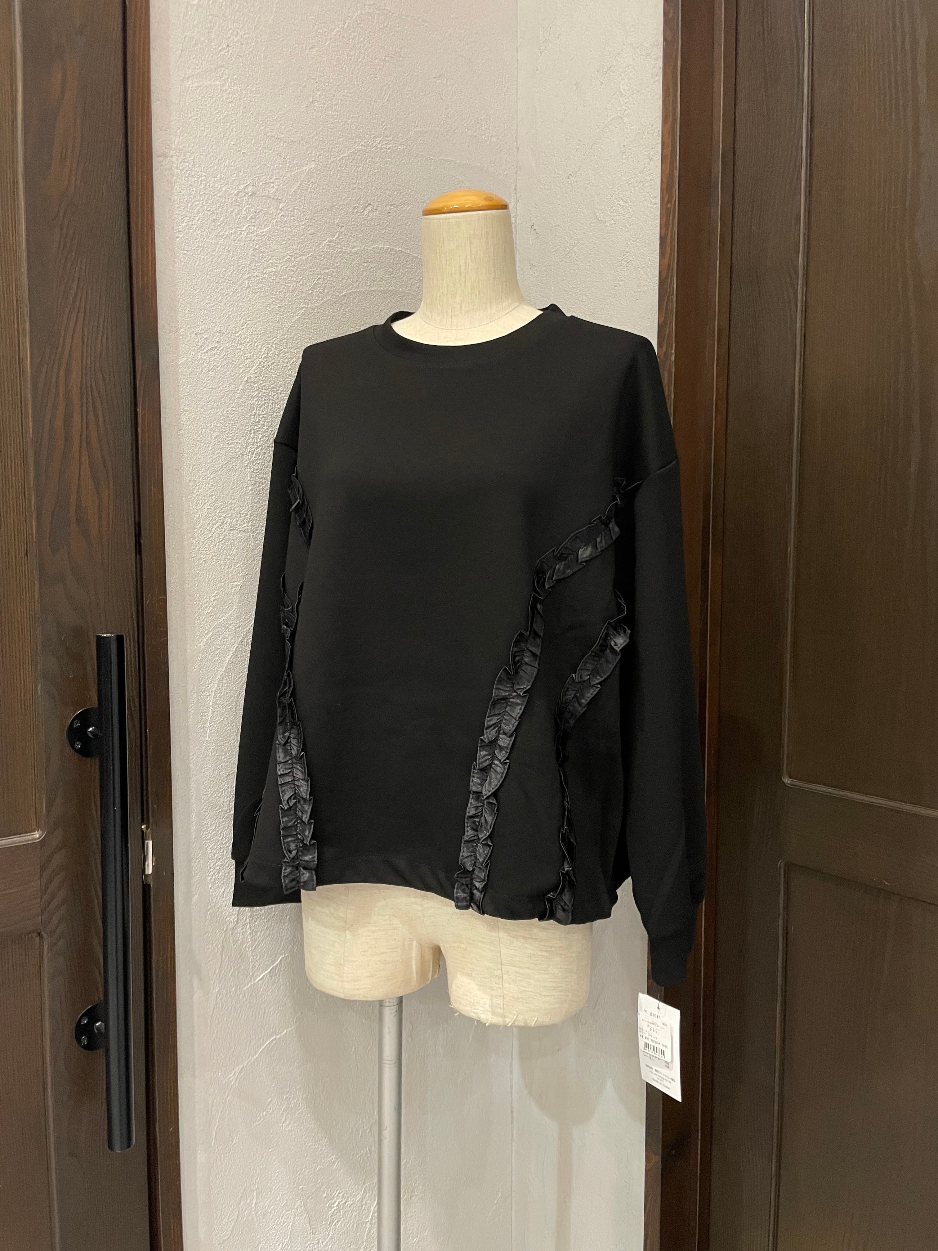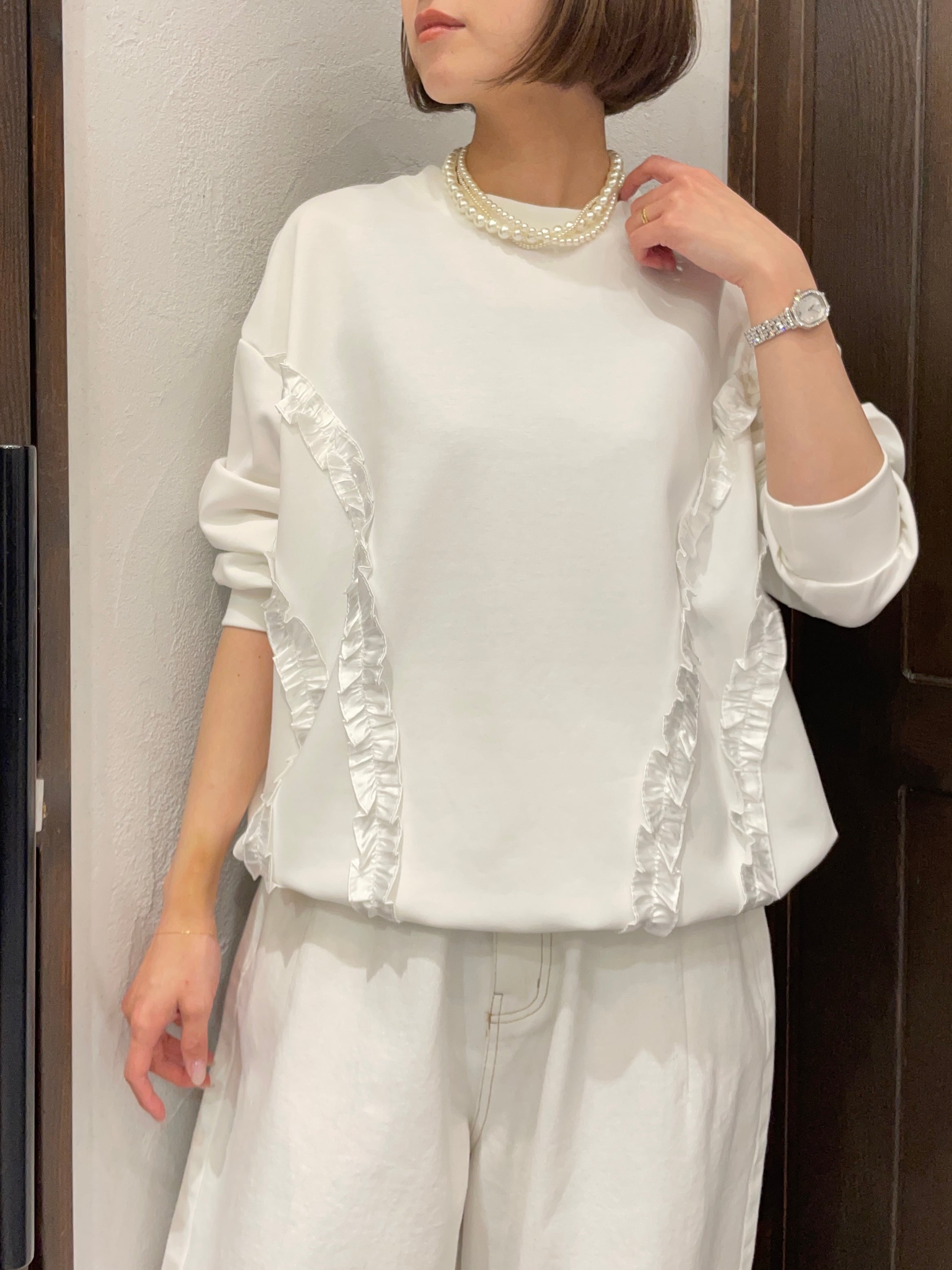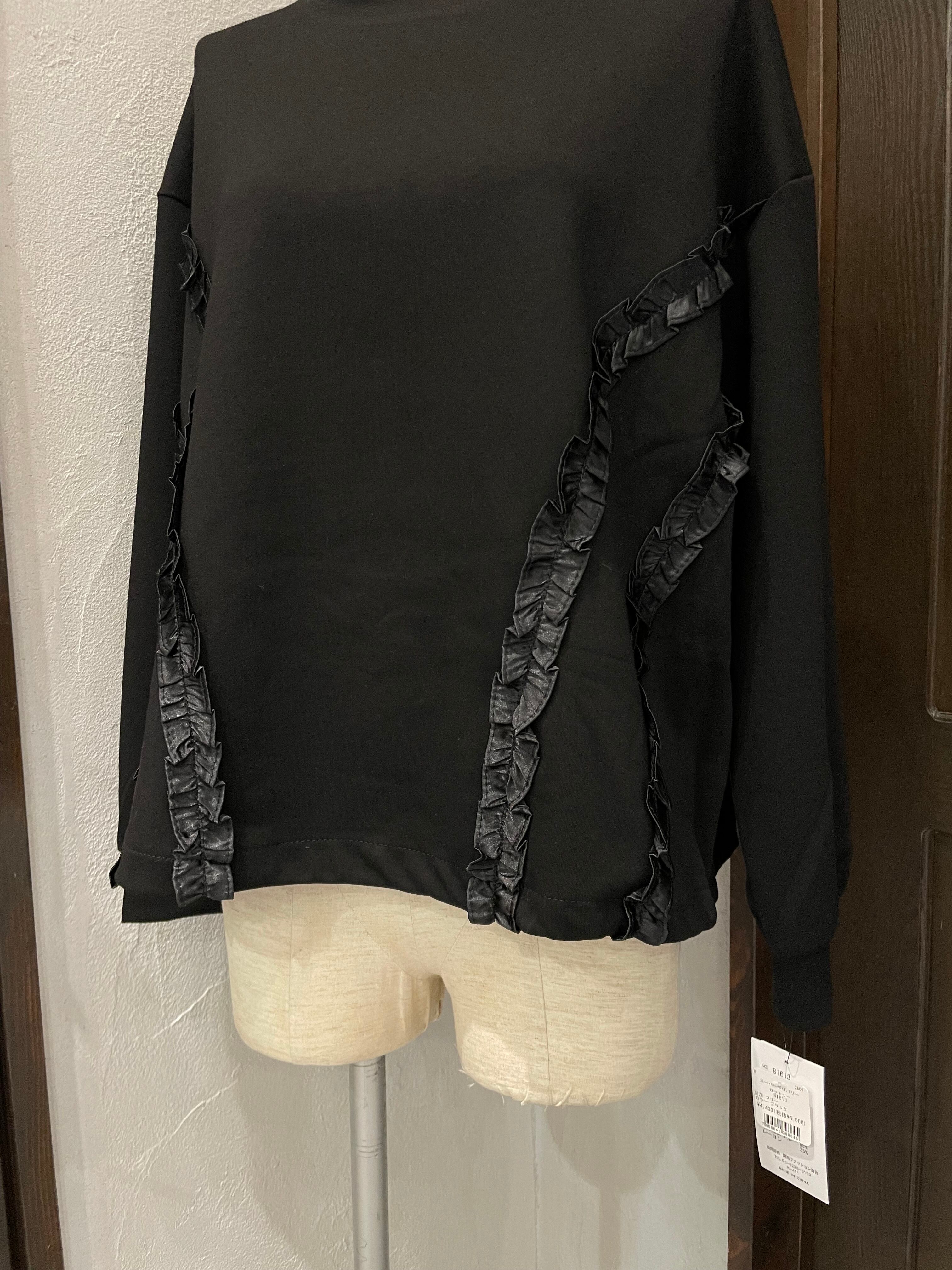 サイドからフリルテープを施したダンボールニットプルオーバー。