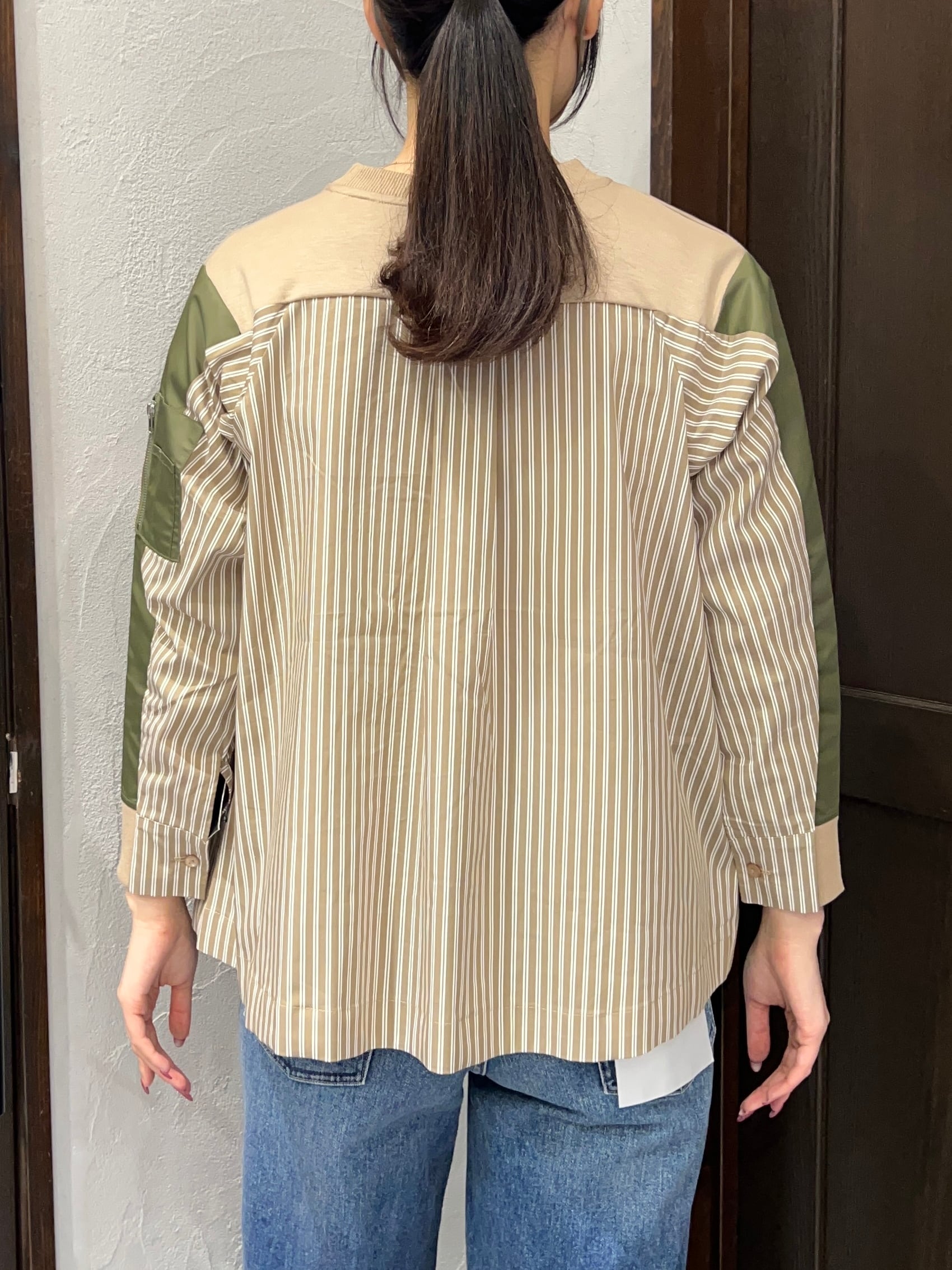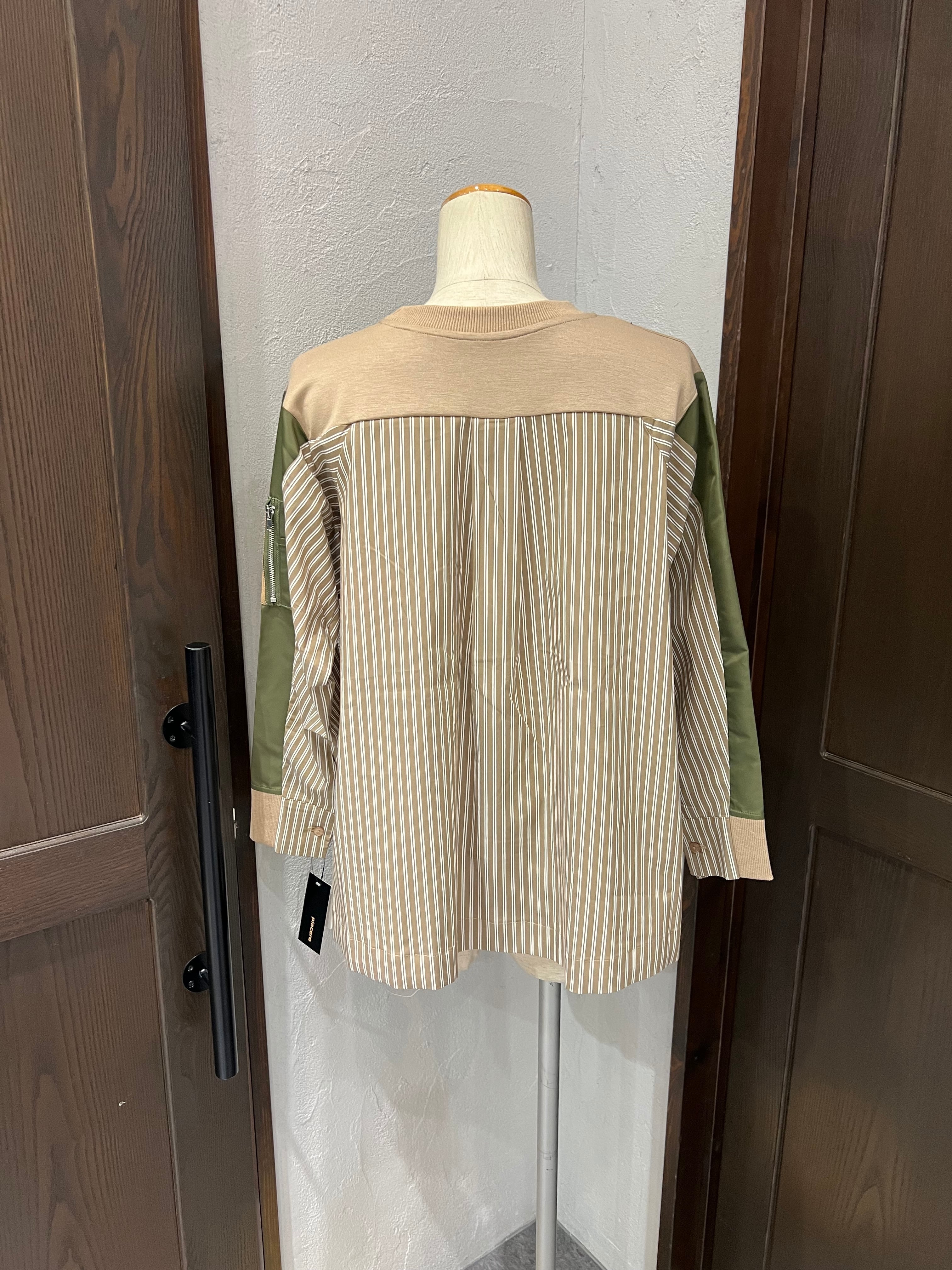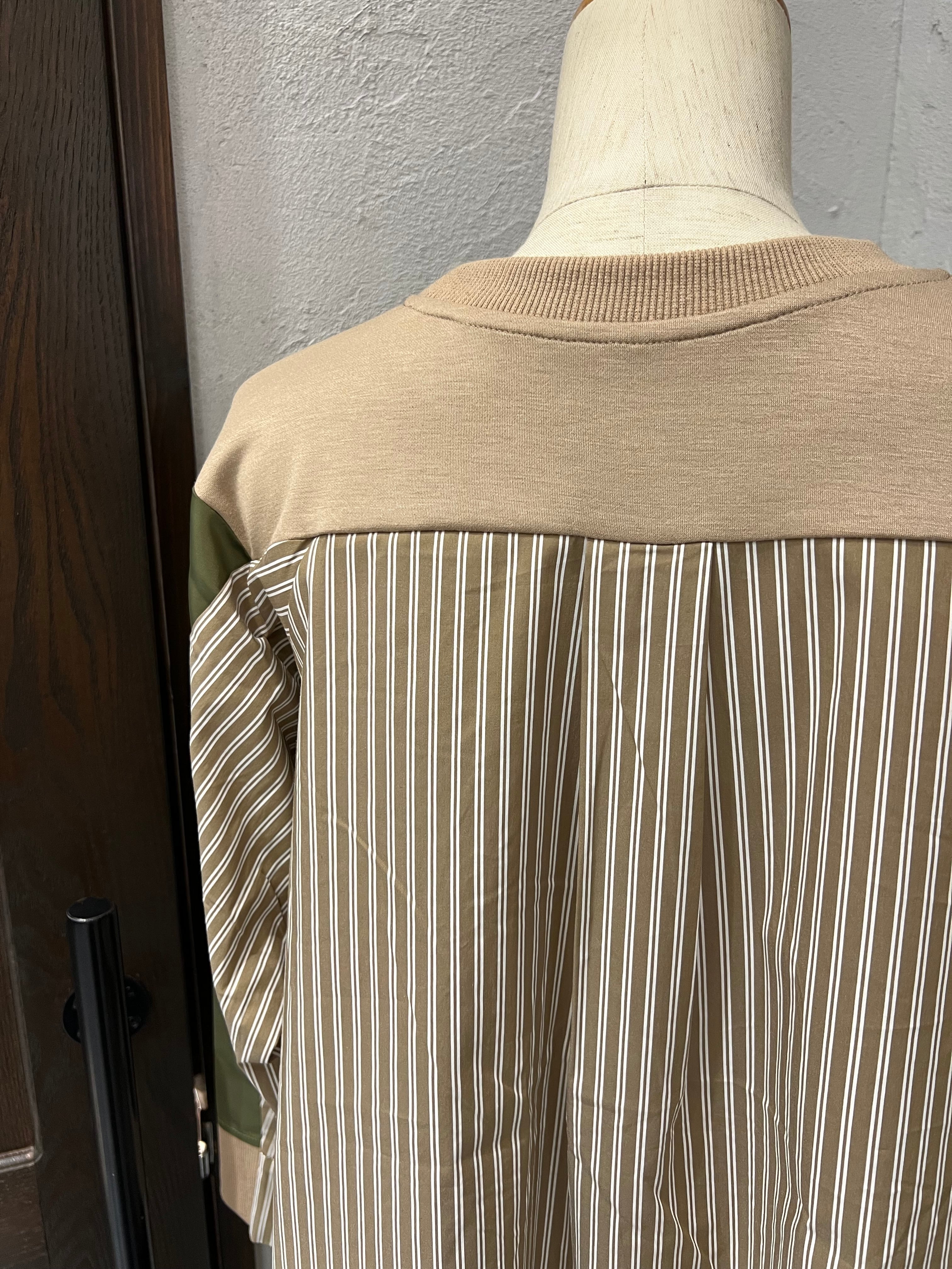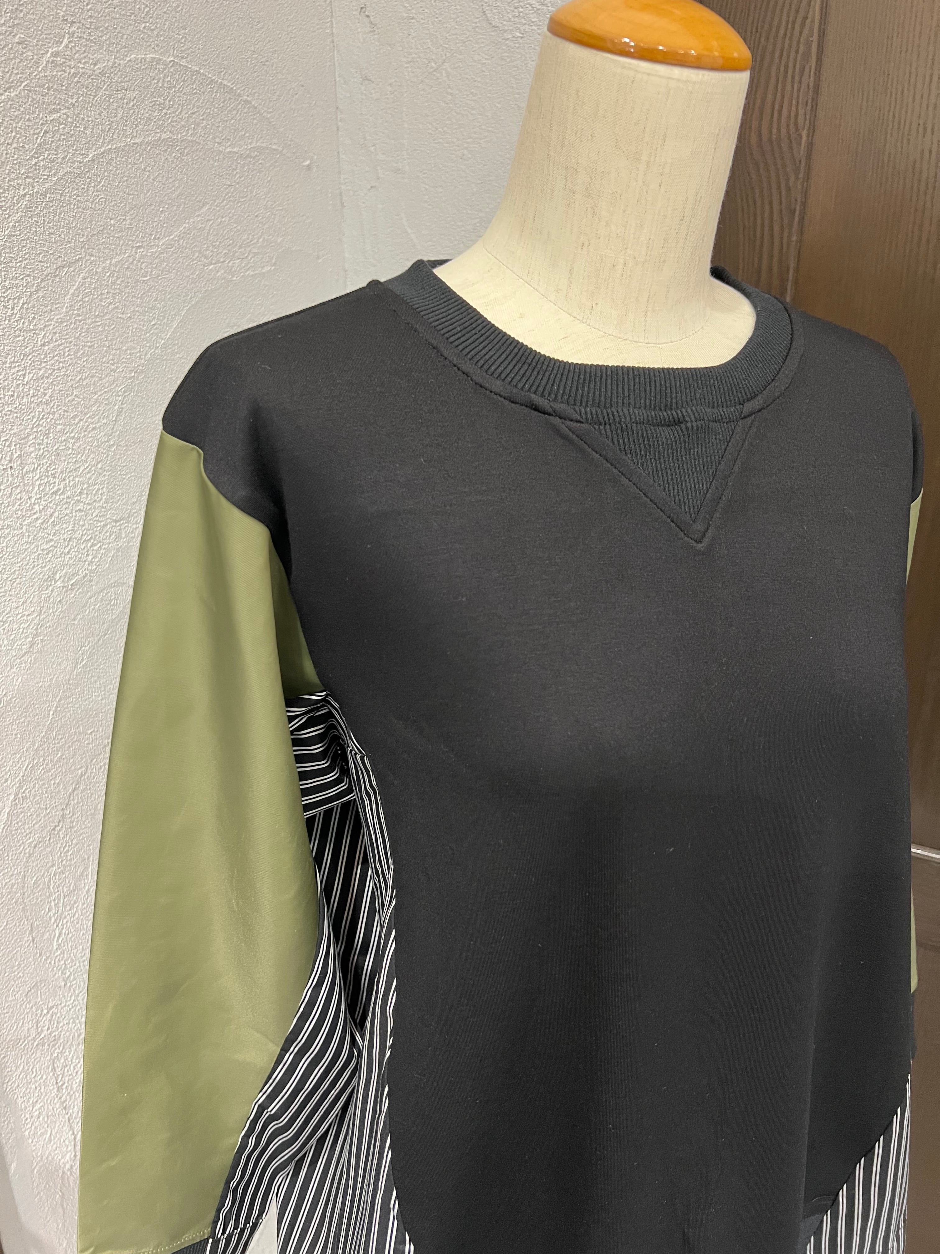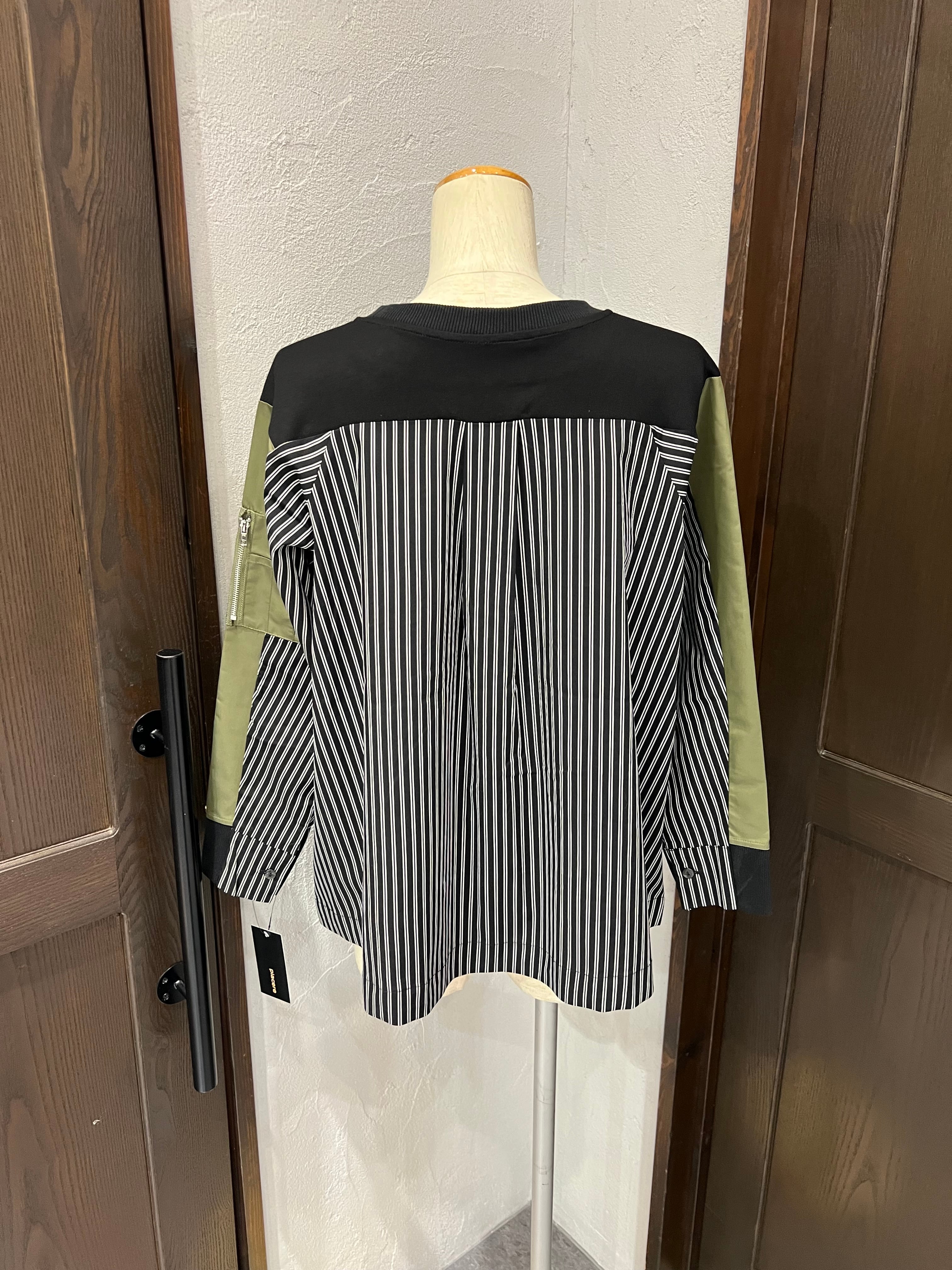 フロントはシンプル、サイドから後ろにかけてストライプ生地に切り替えた、1枚で着映えするデザイントップス。