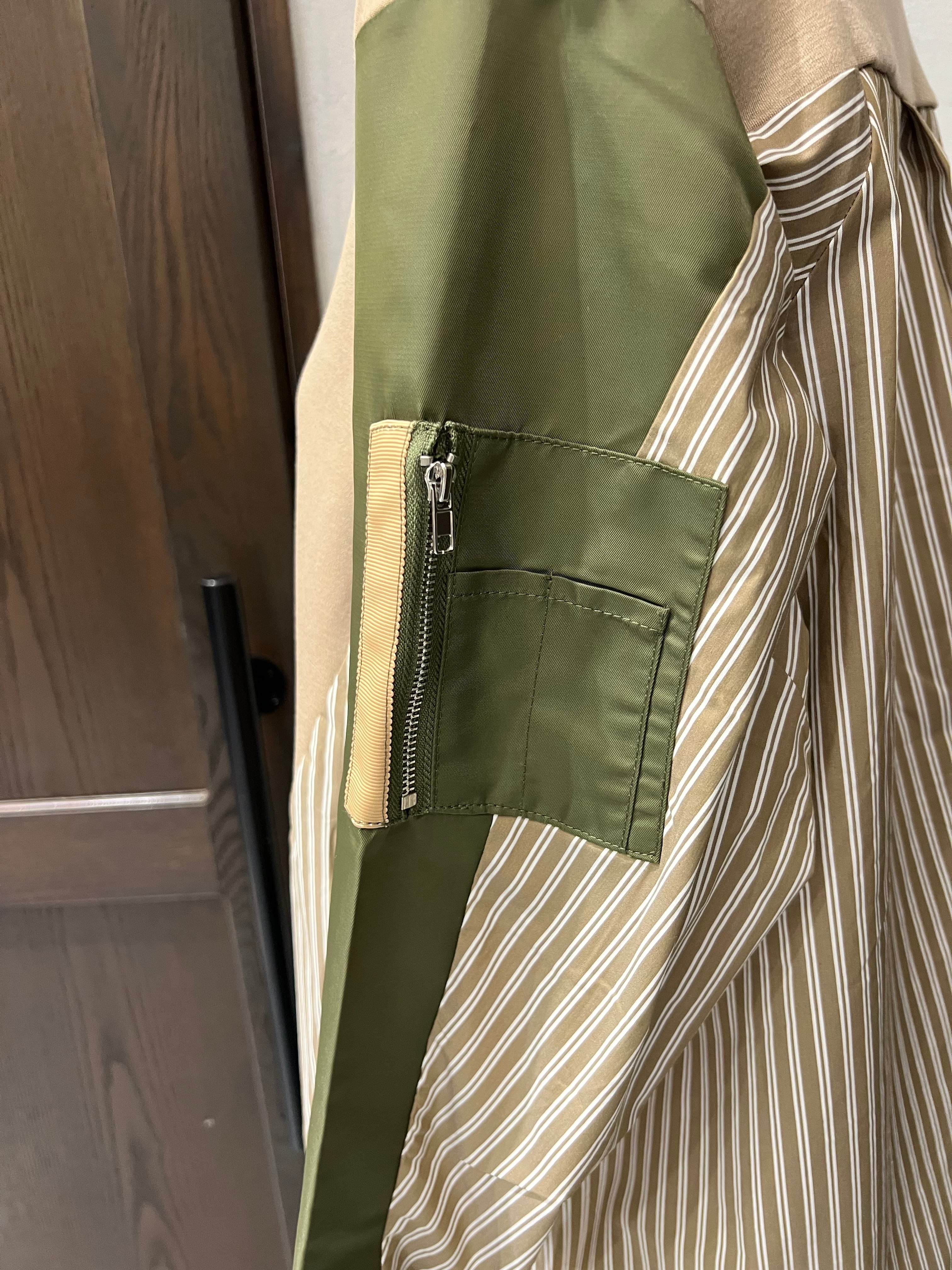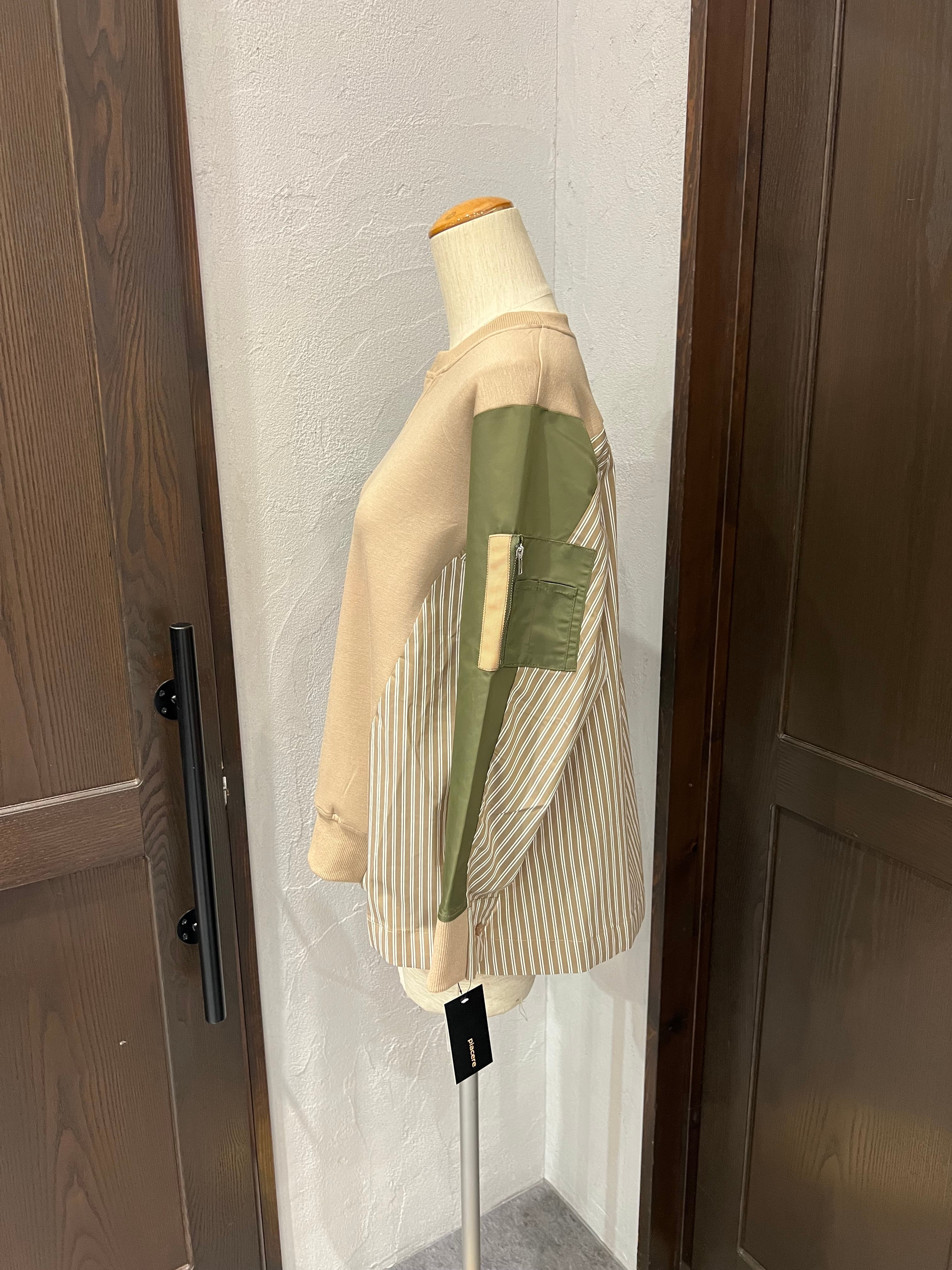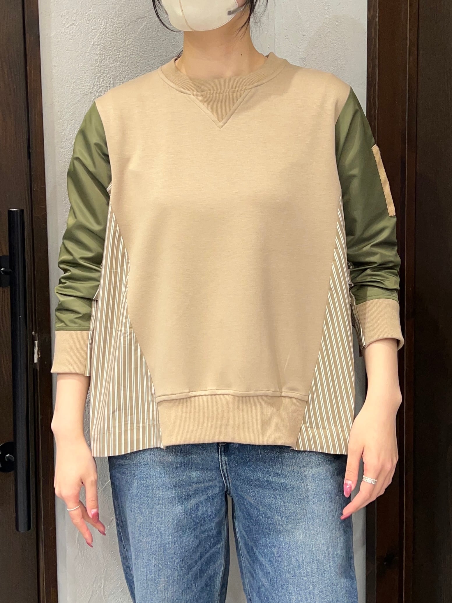 袖にはミリタリーテイストの配色生地とポケットディテールを取り入れ、カジュアルながらもモード感のある仕上がりに。