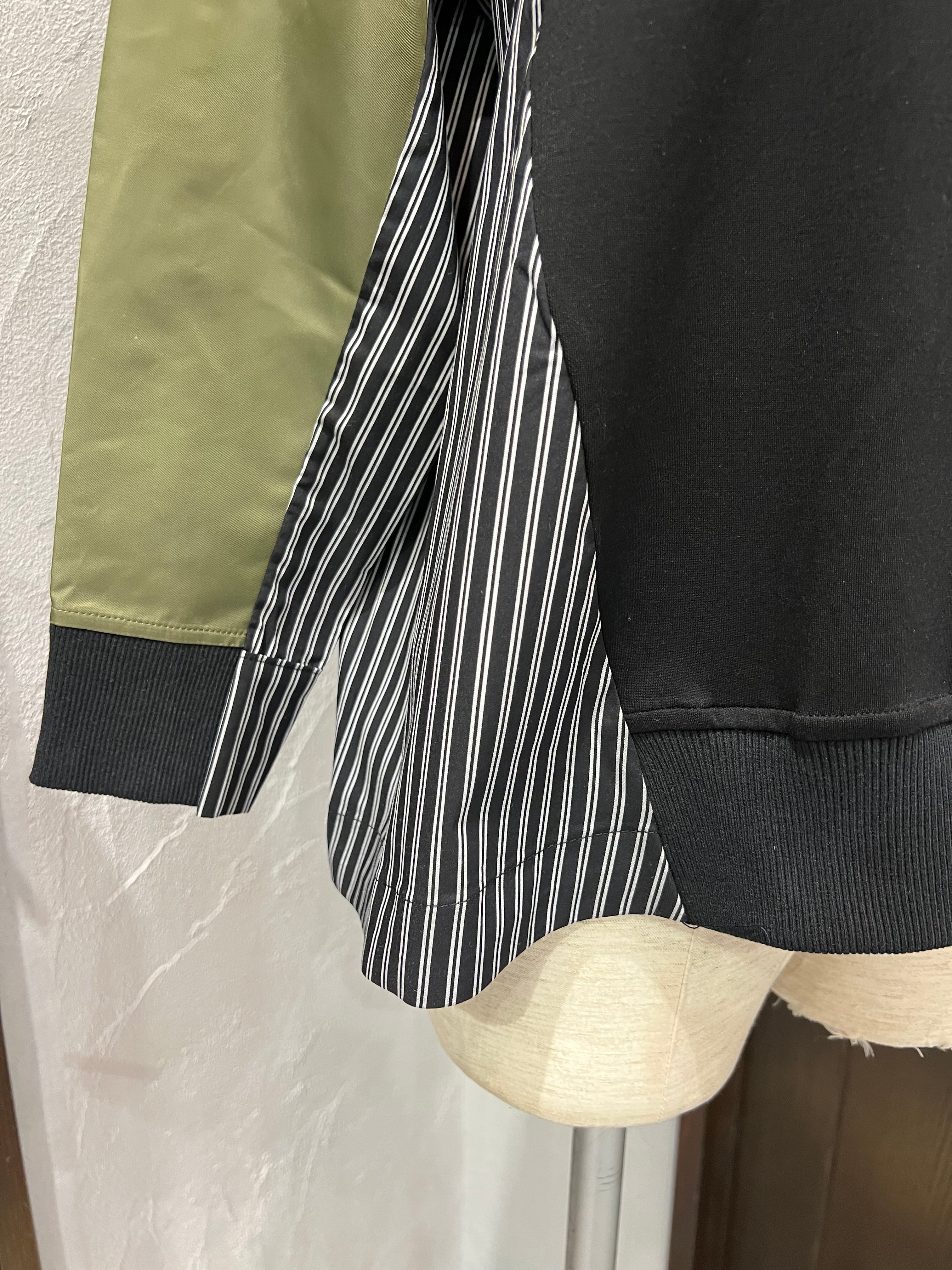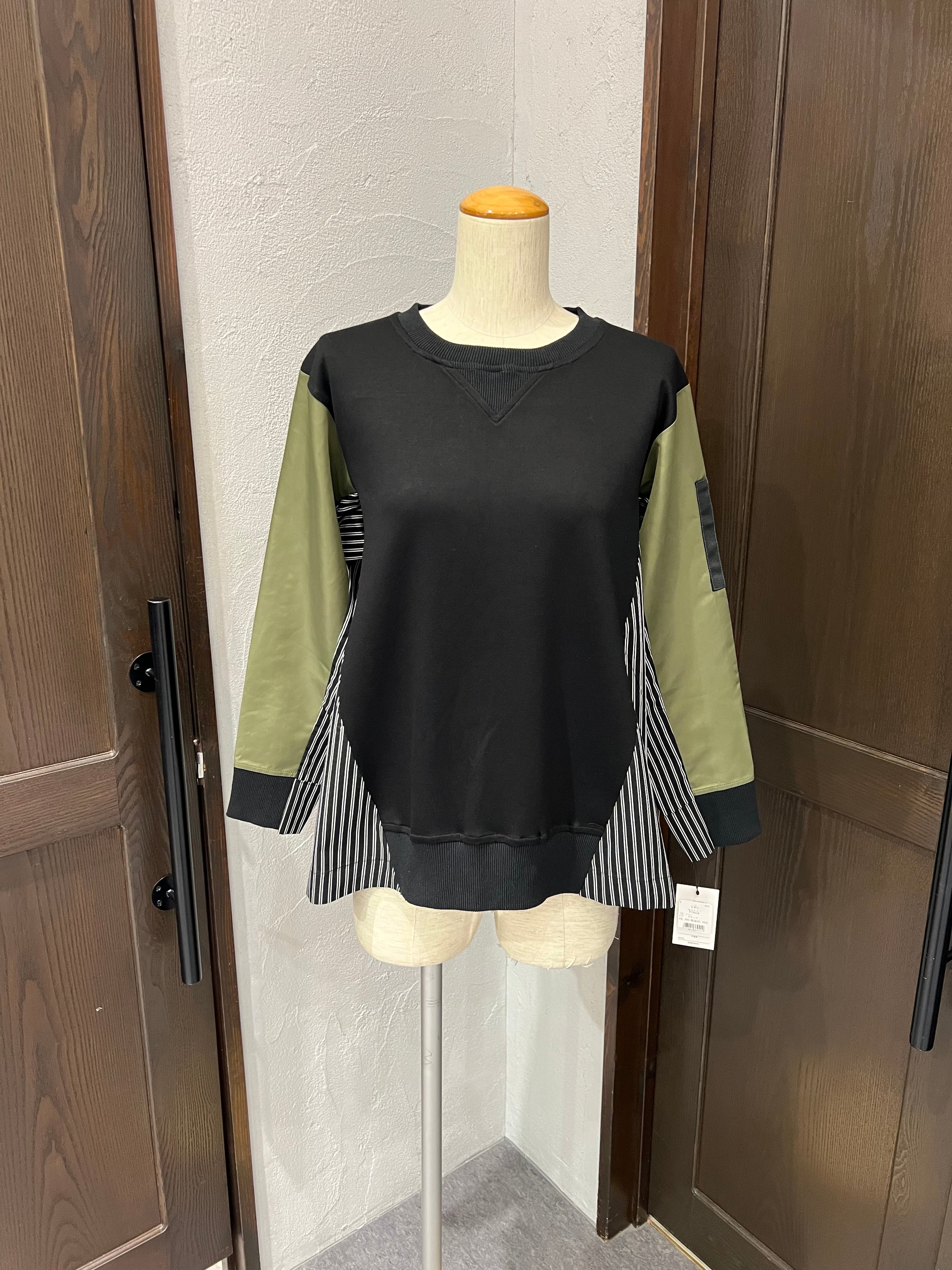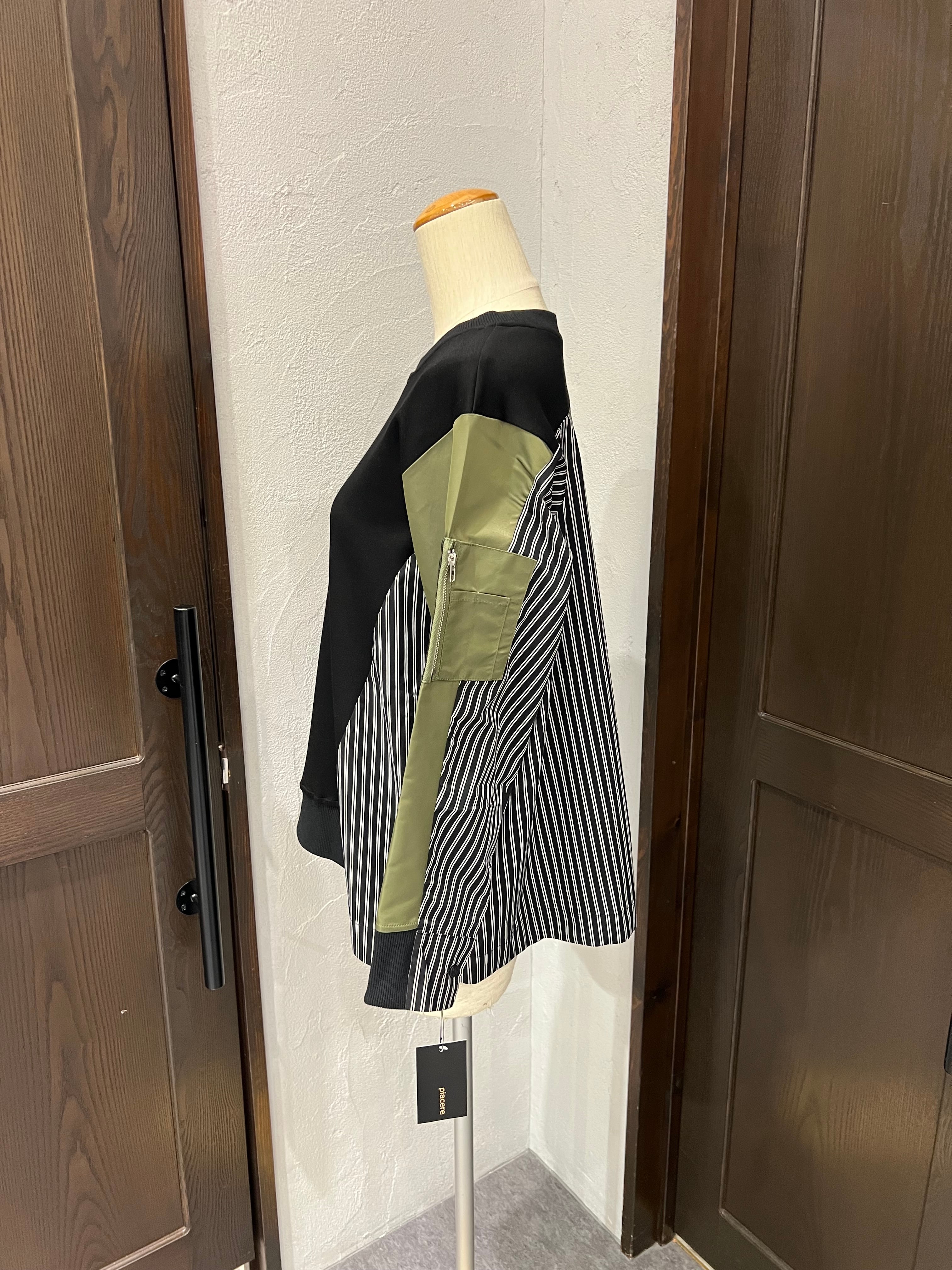 袖にはミリタリーテイストの配色生地とポケットディテールを取り入れ、カジュアルながらもモード感のある仕上がりに。