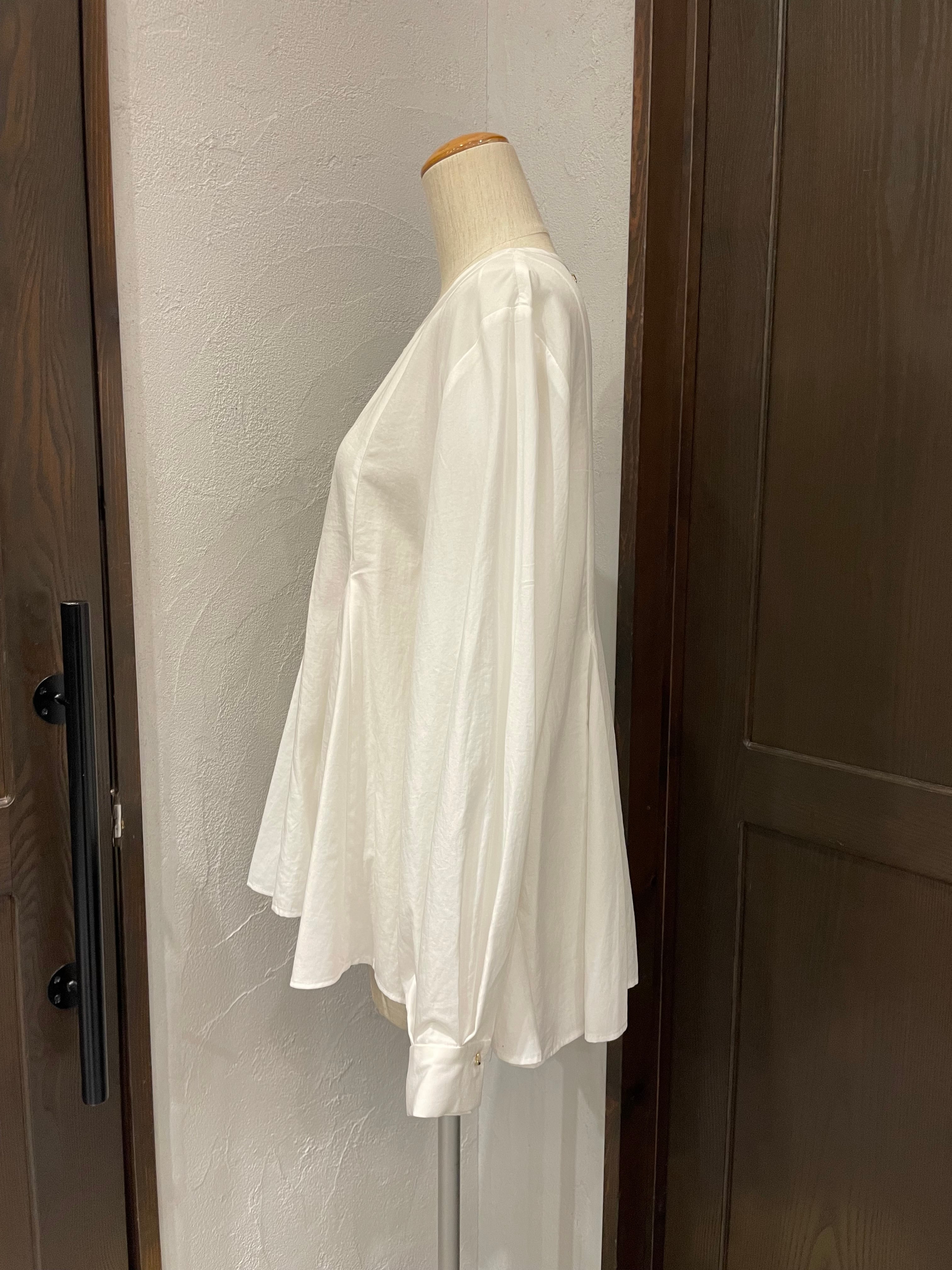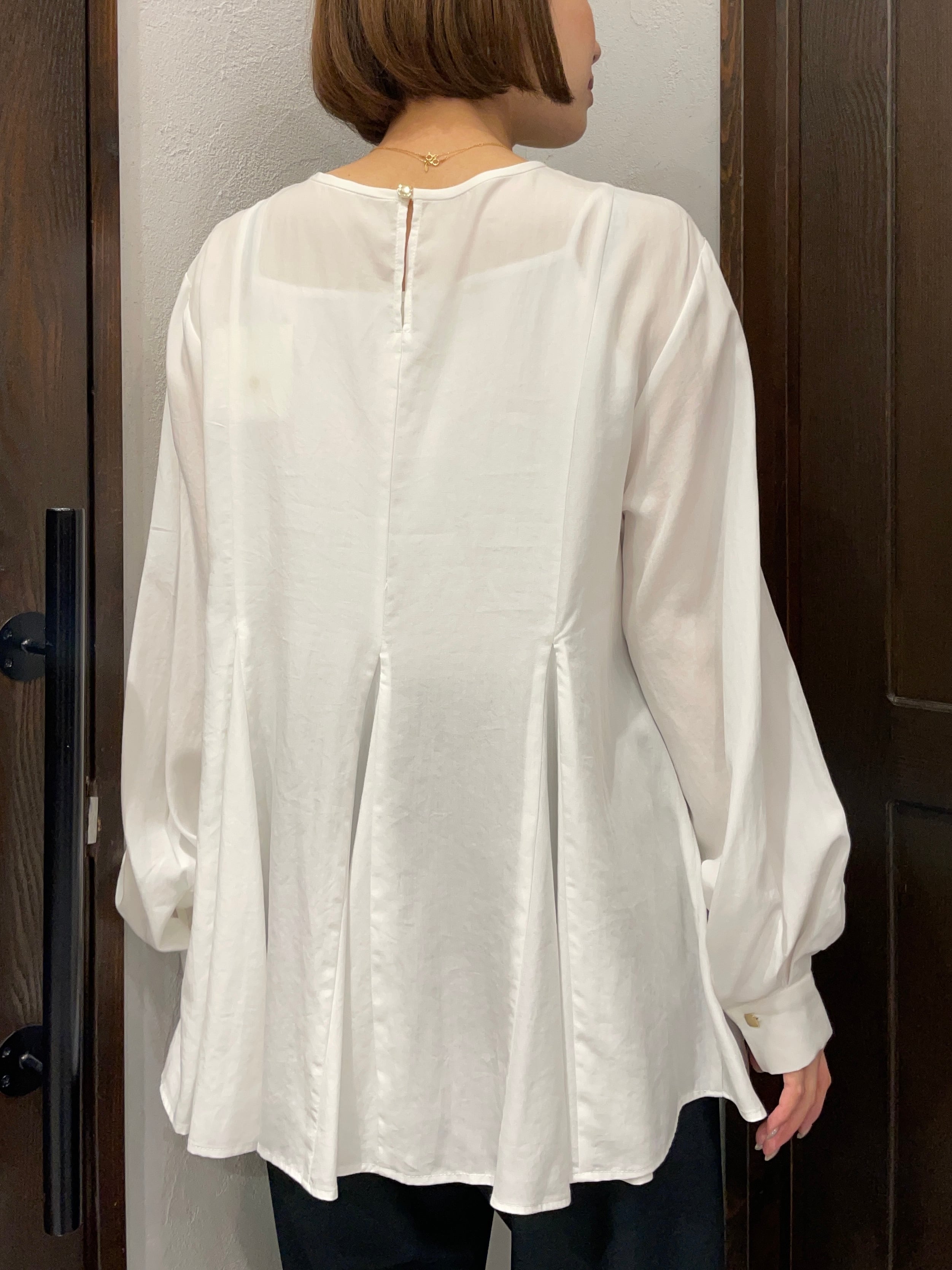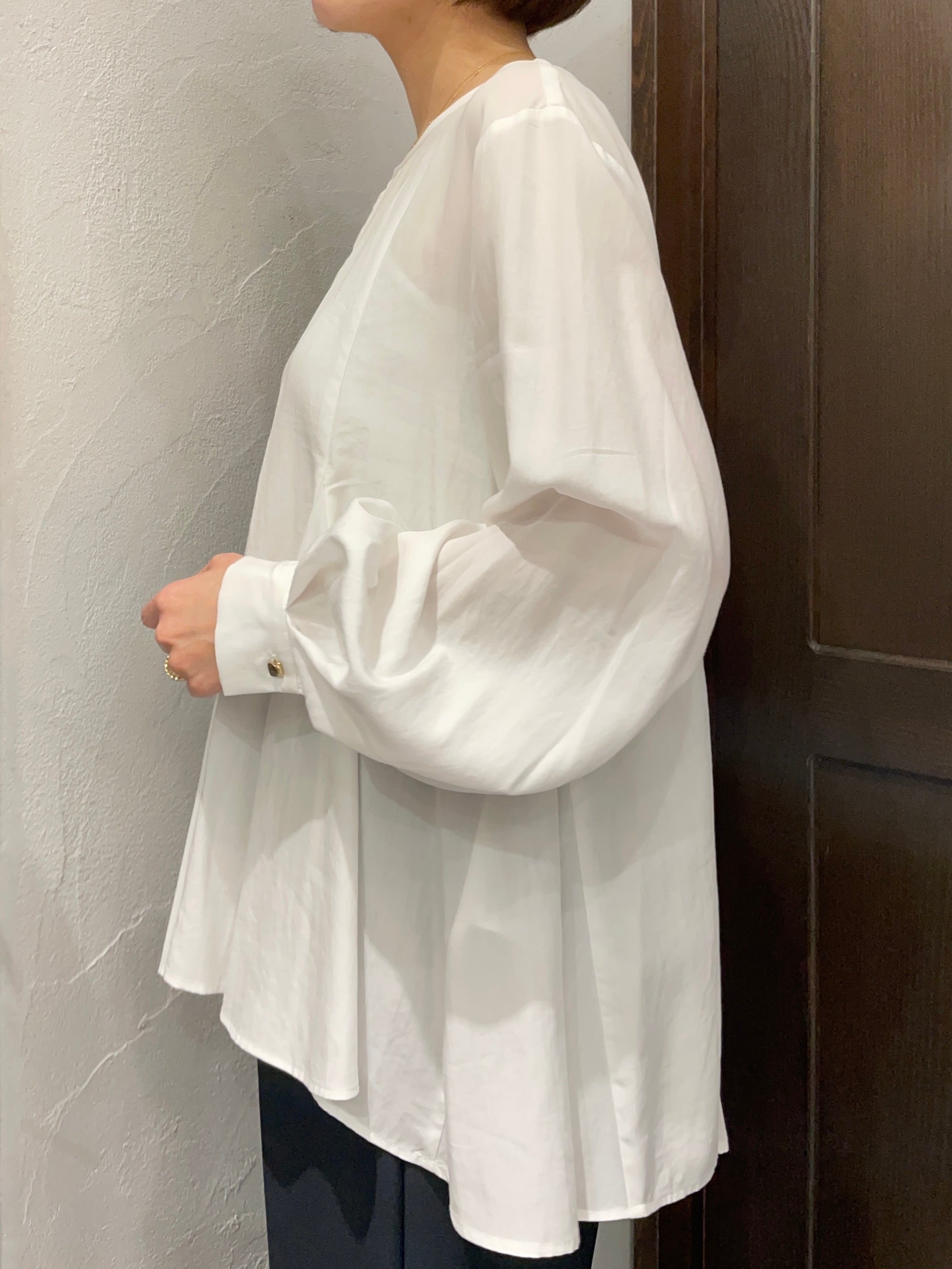 ネック周りはやや浅めのノーカラー仕立てにすることで、