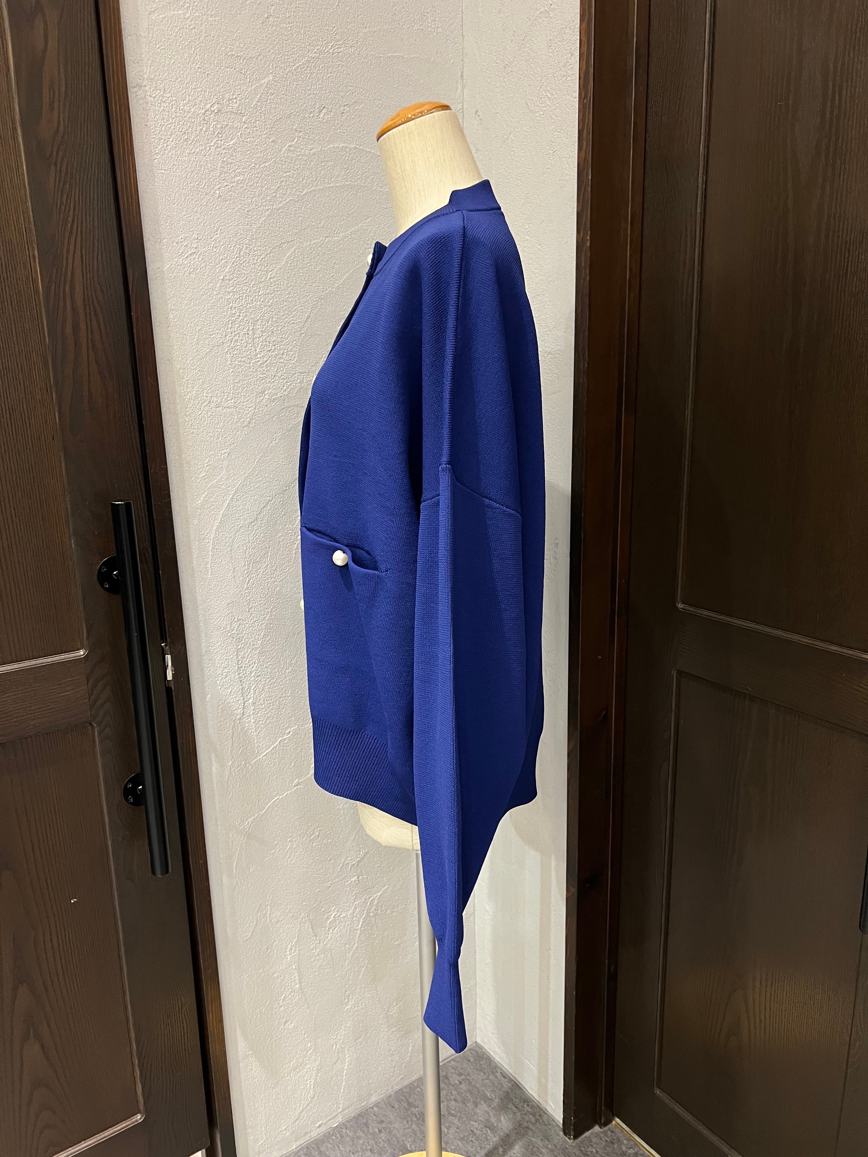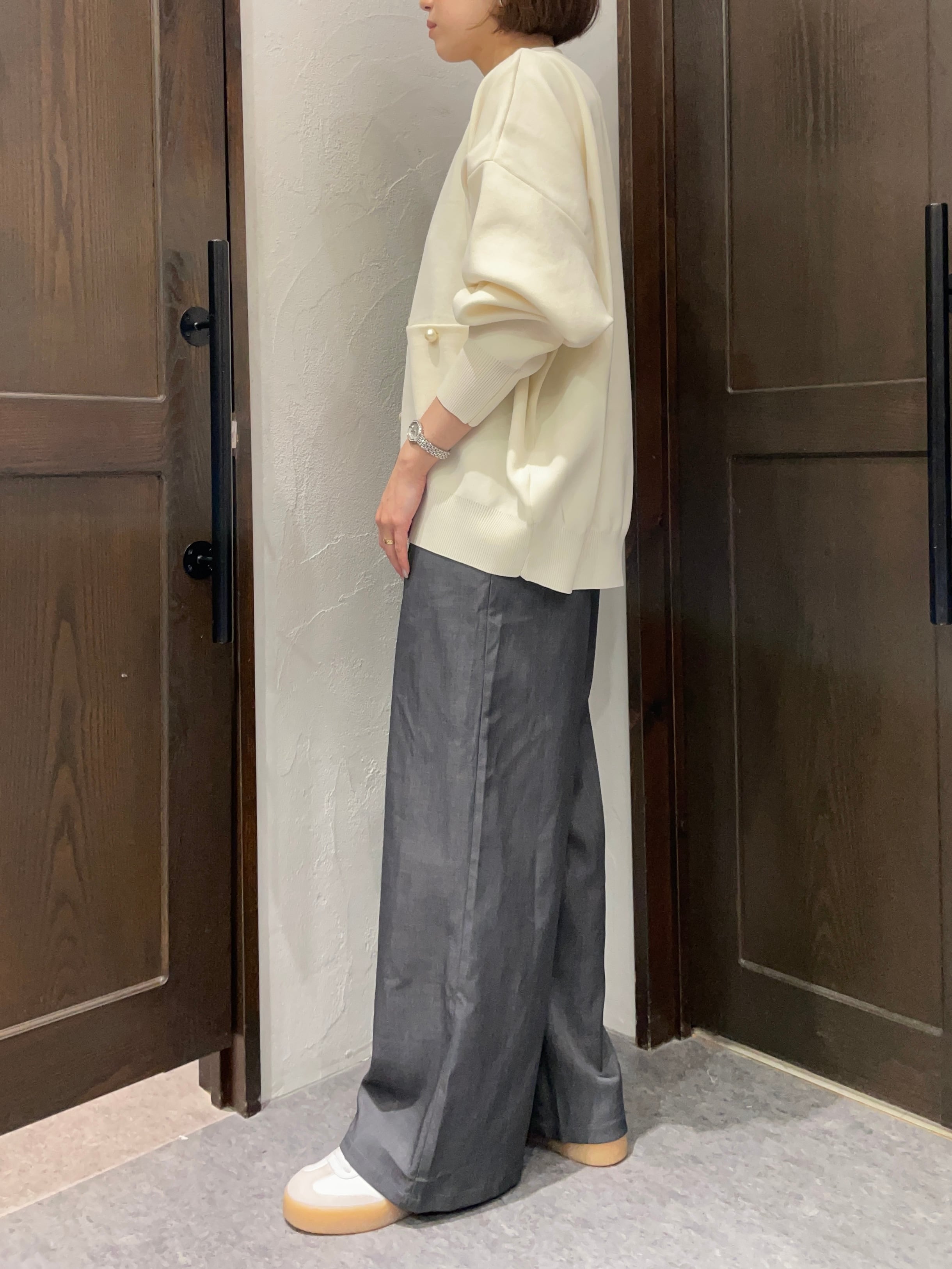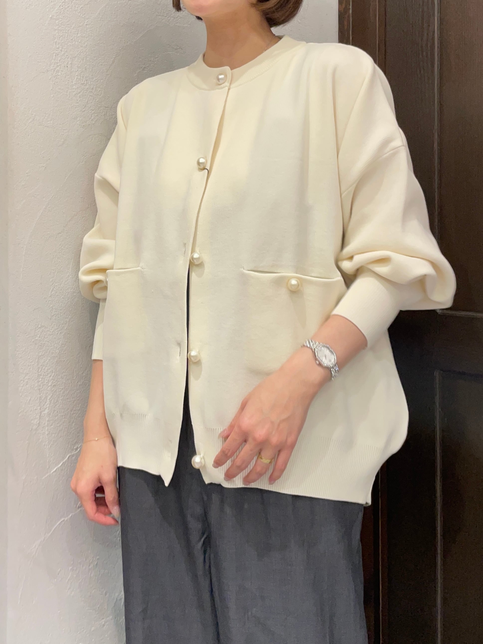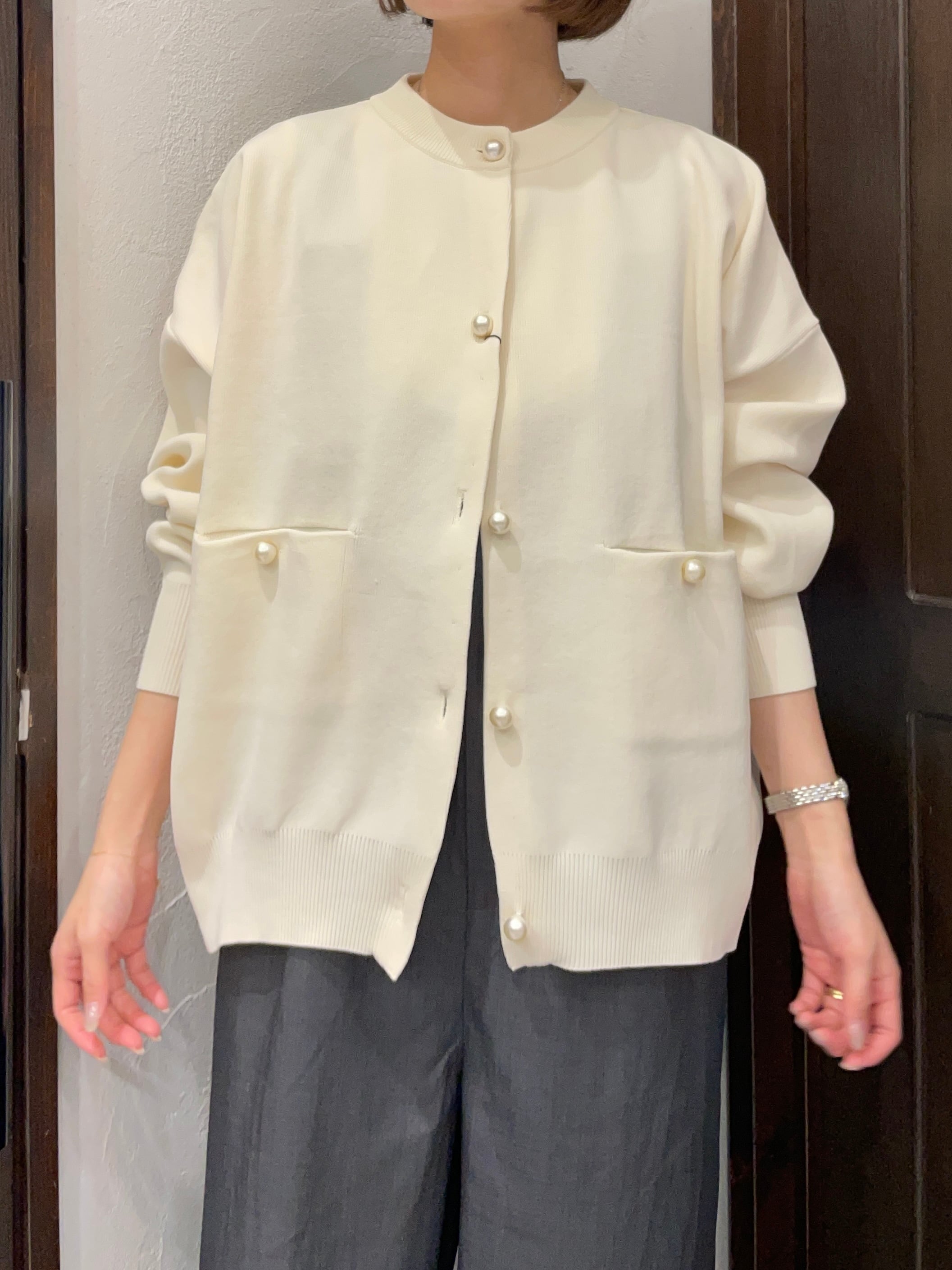 オーバーサイズのゆるっとしたシルエットに、パールボタンで上品見えする一枚です。