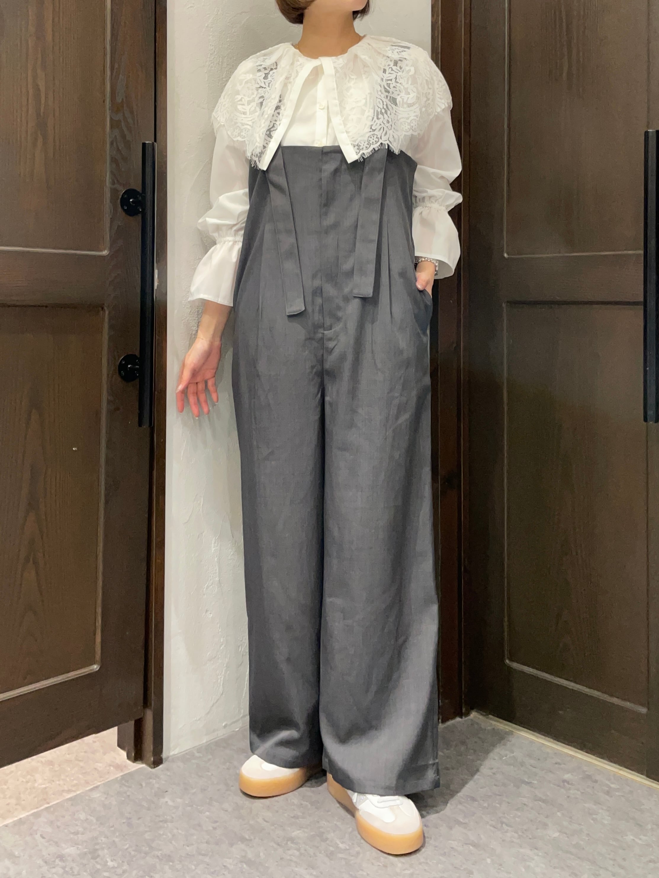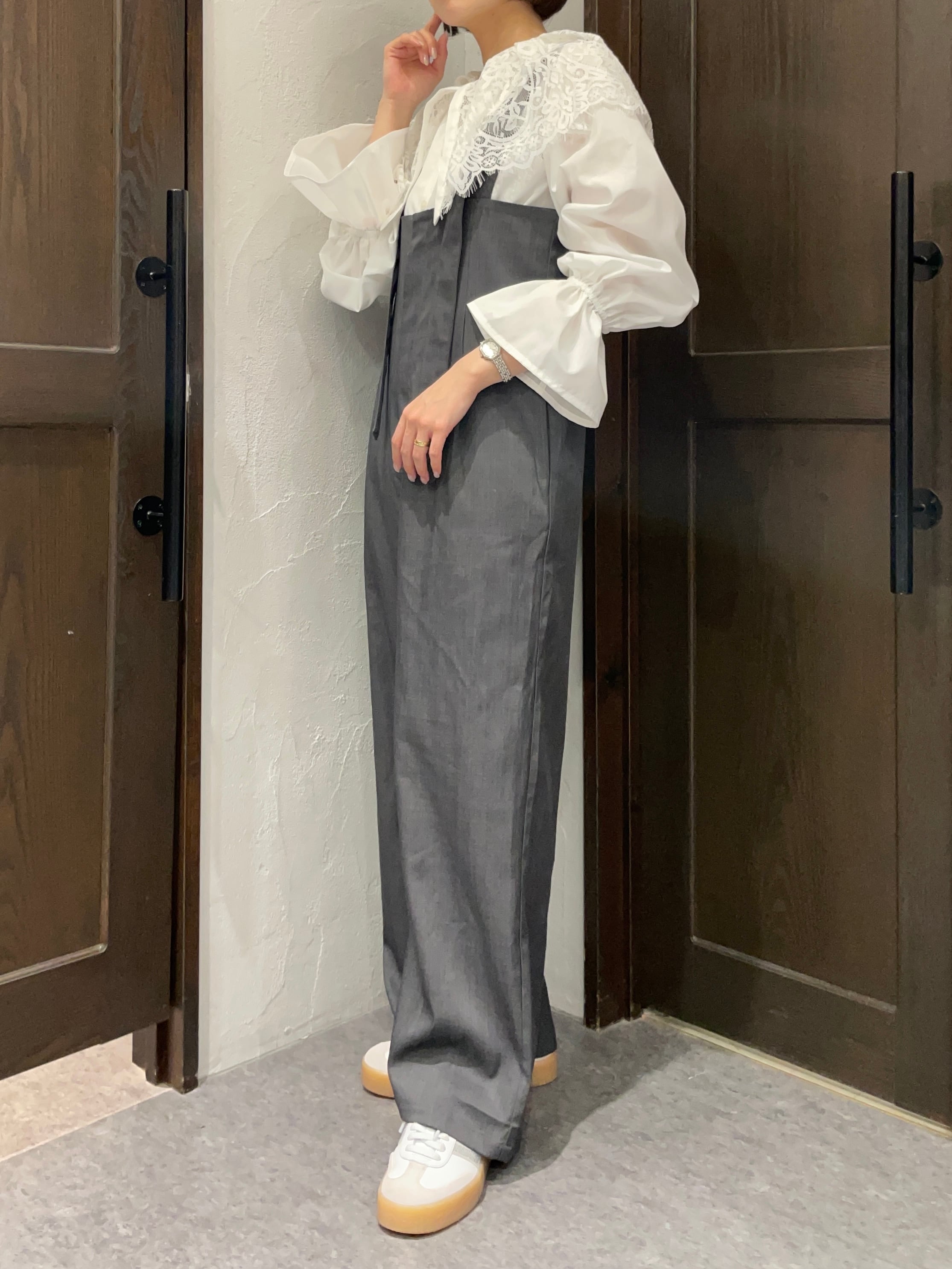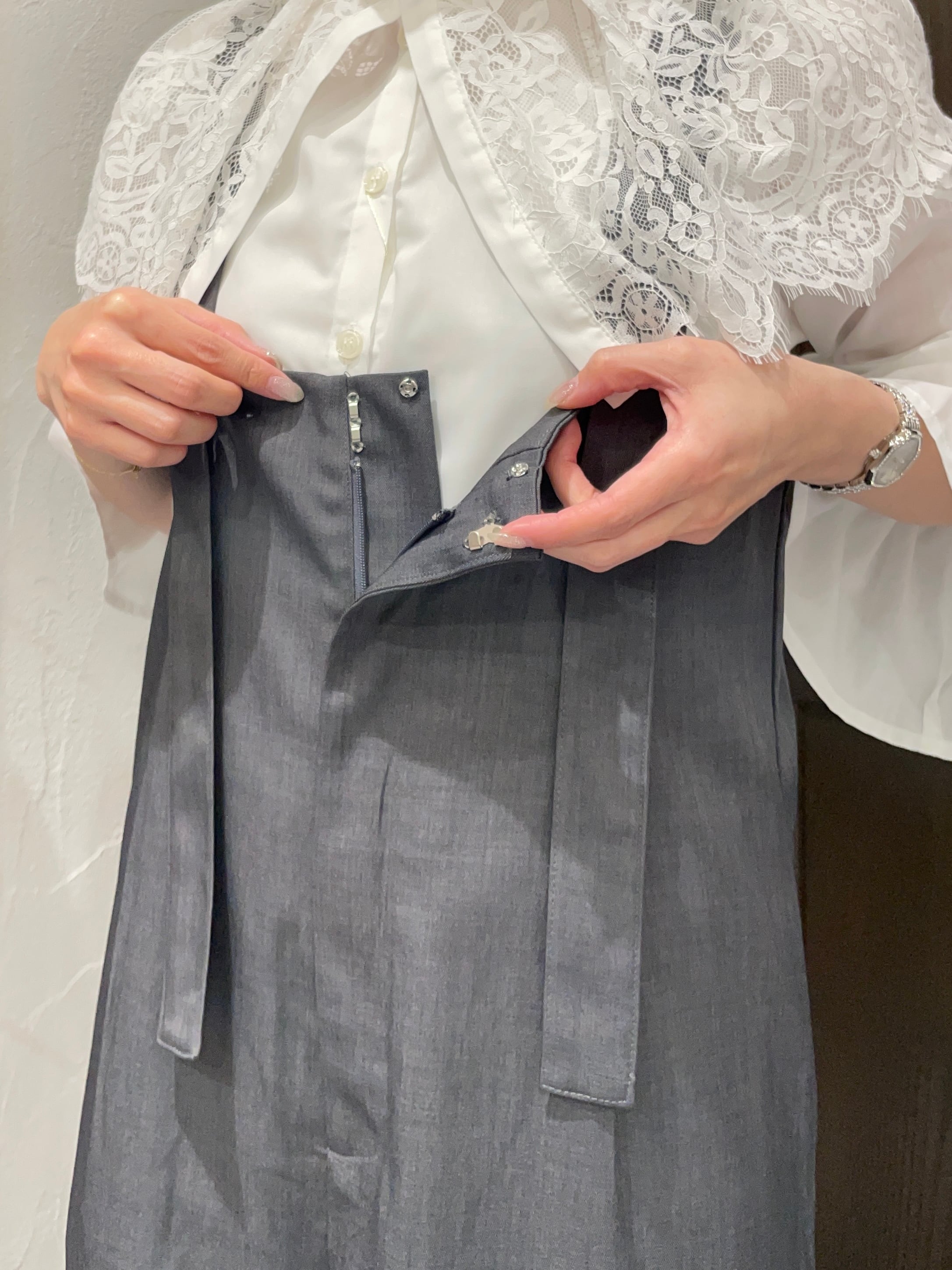 細部にわたる繊細な仕立てが印象的で、どんなトップスとも合わせやすい一枚です。