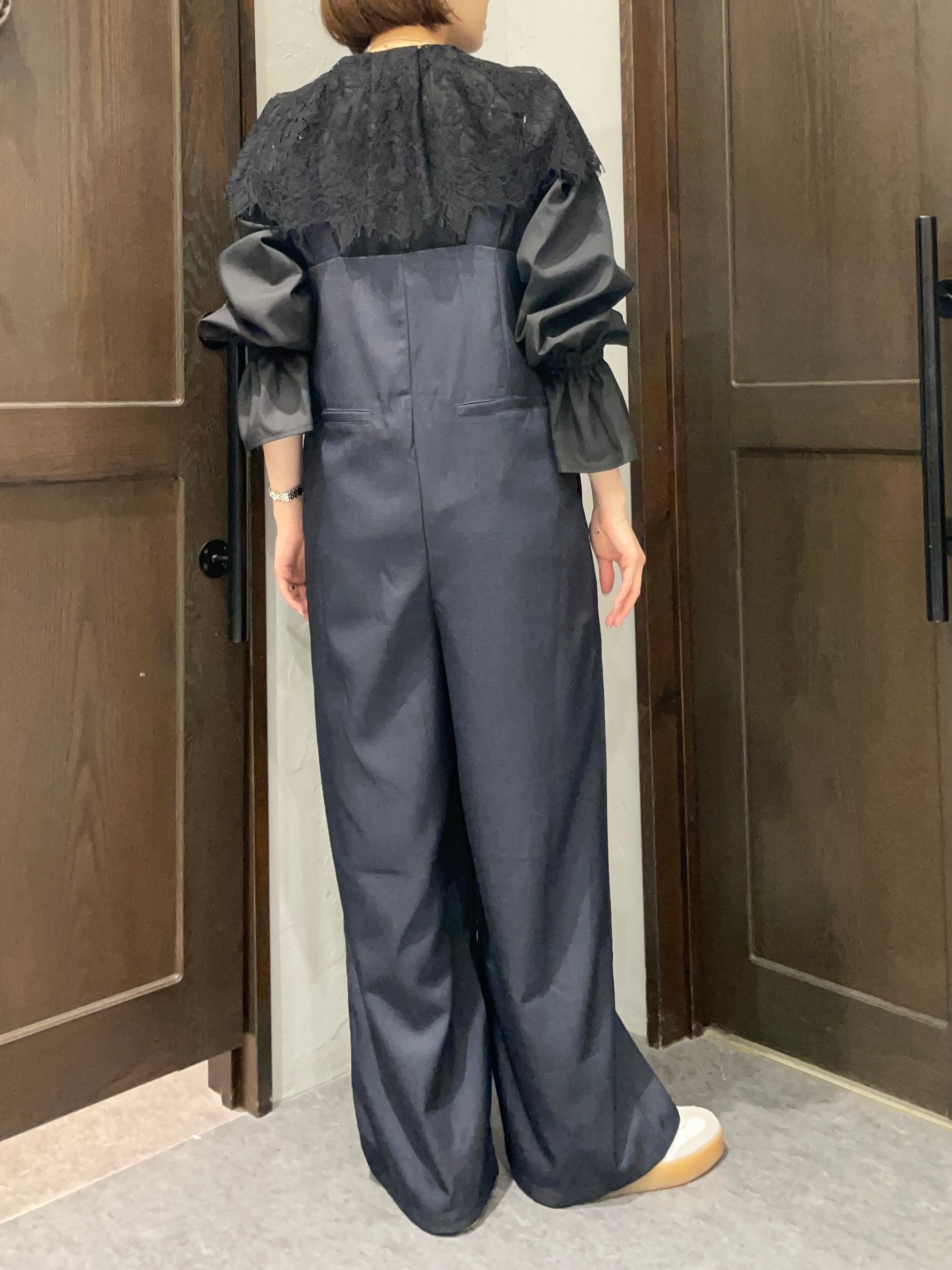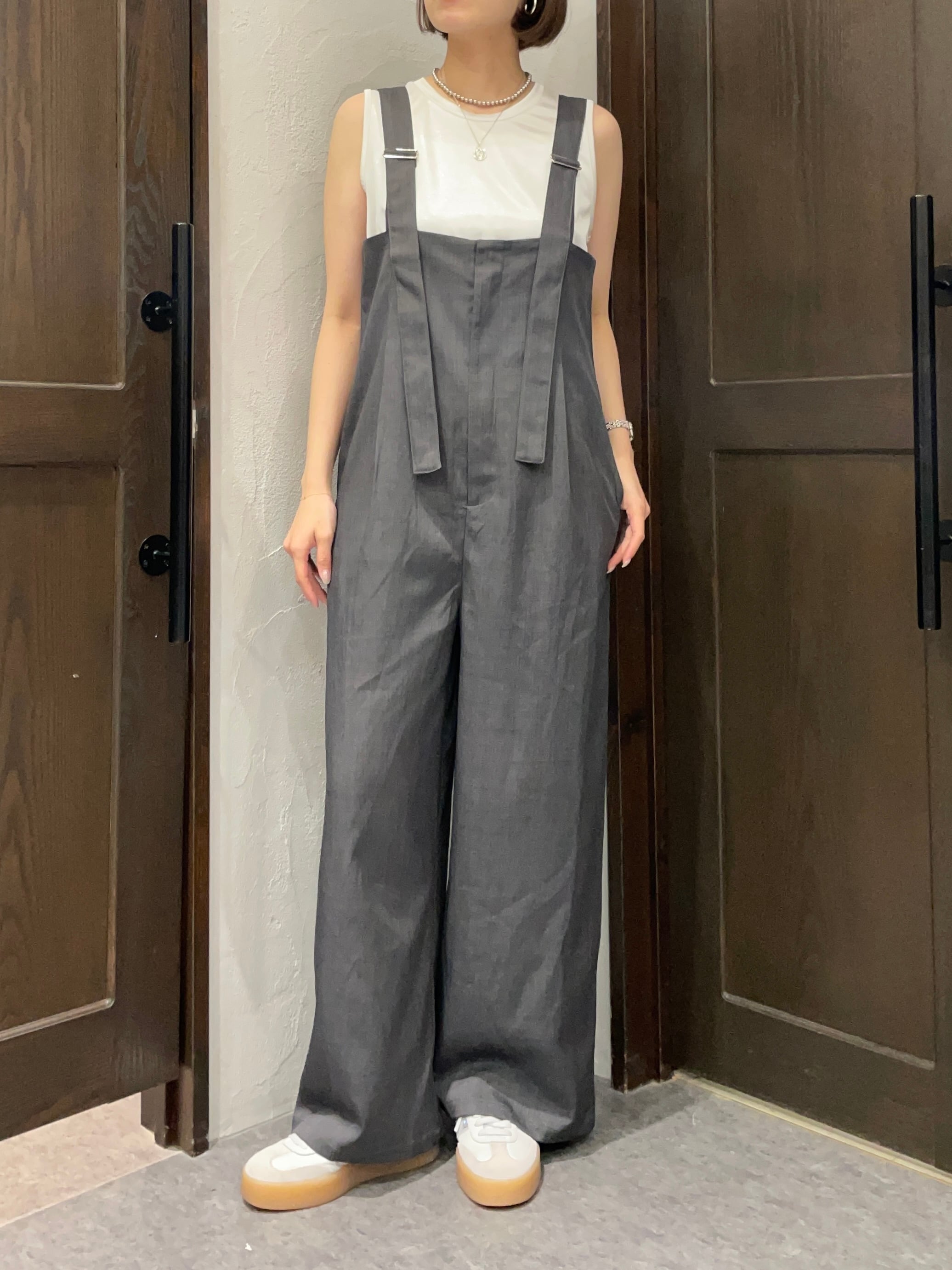 流れるようなラインが特徴的で、シルエットを美しく見せるハイウエストデザインのサロペット。