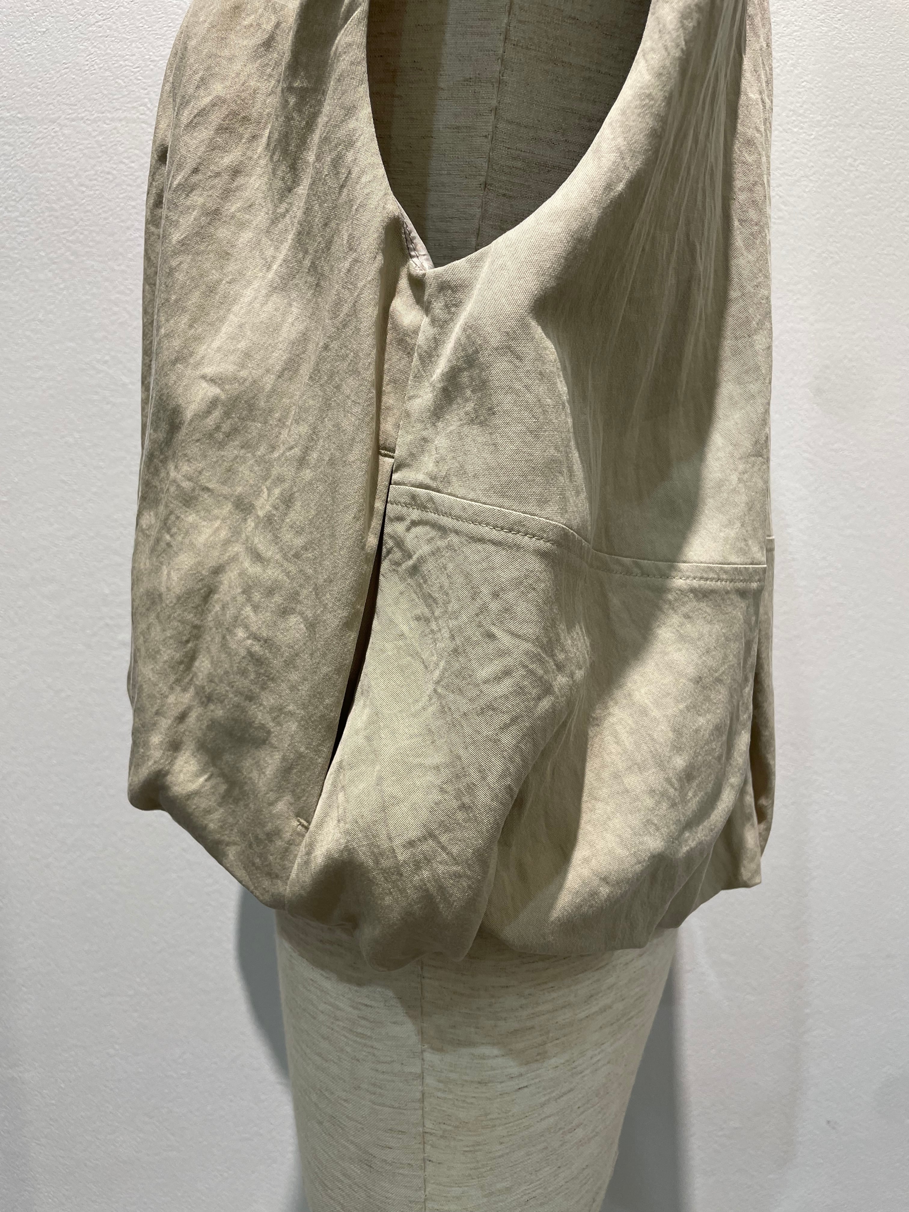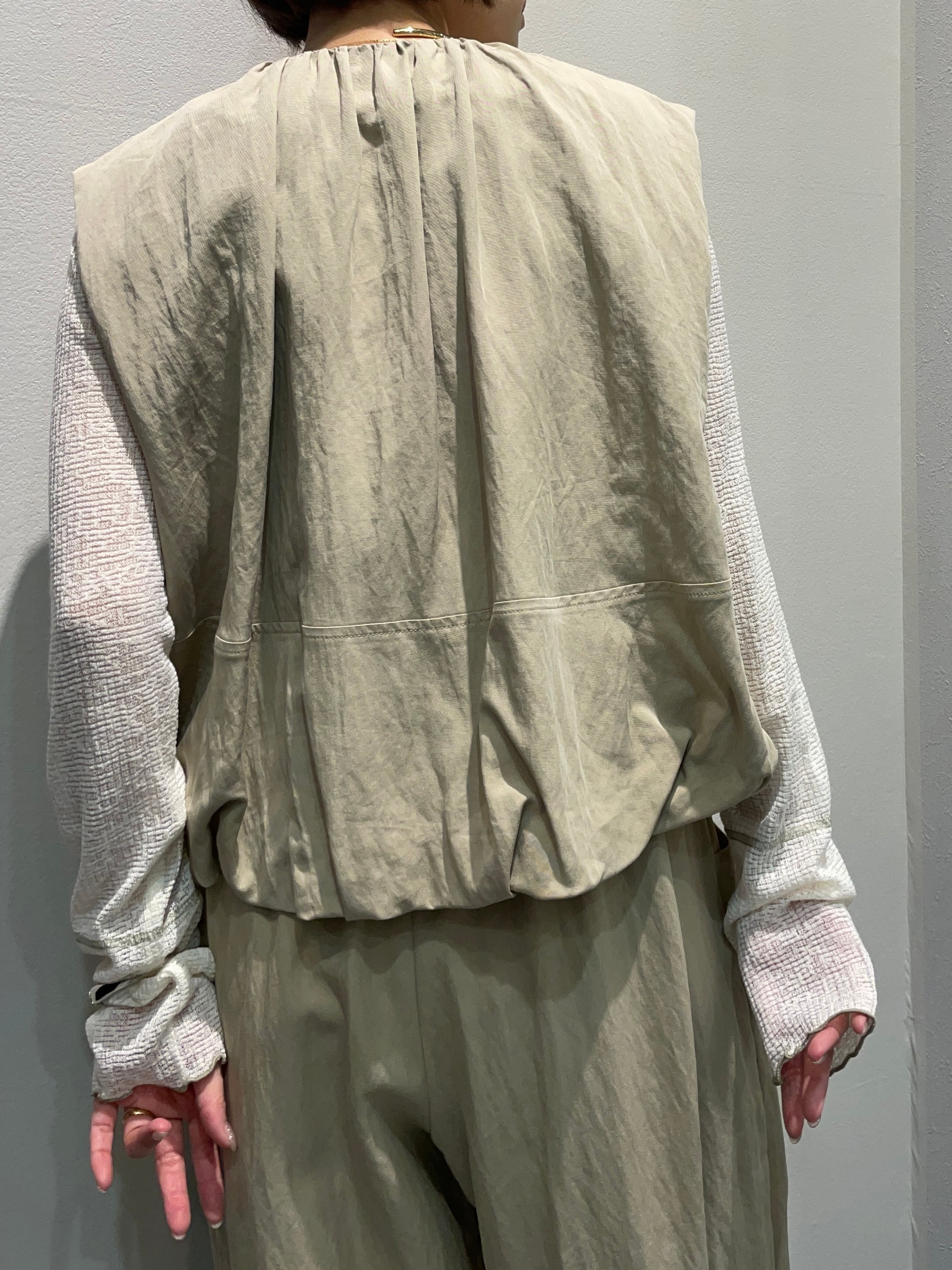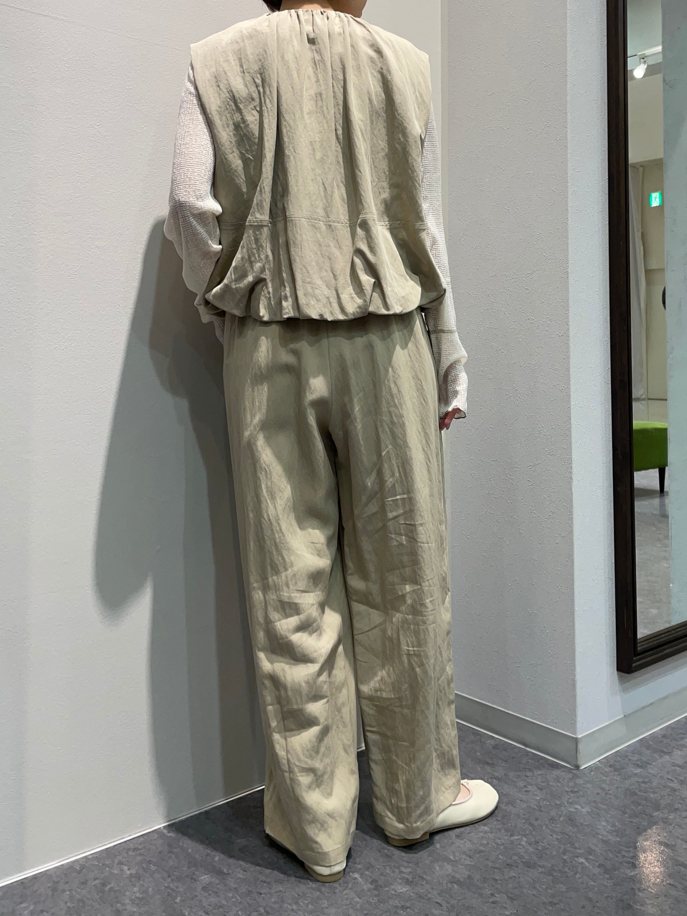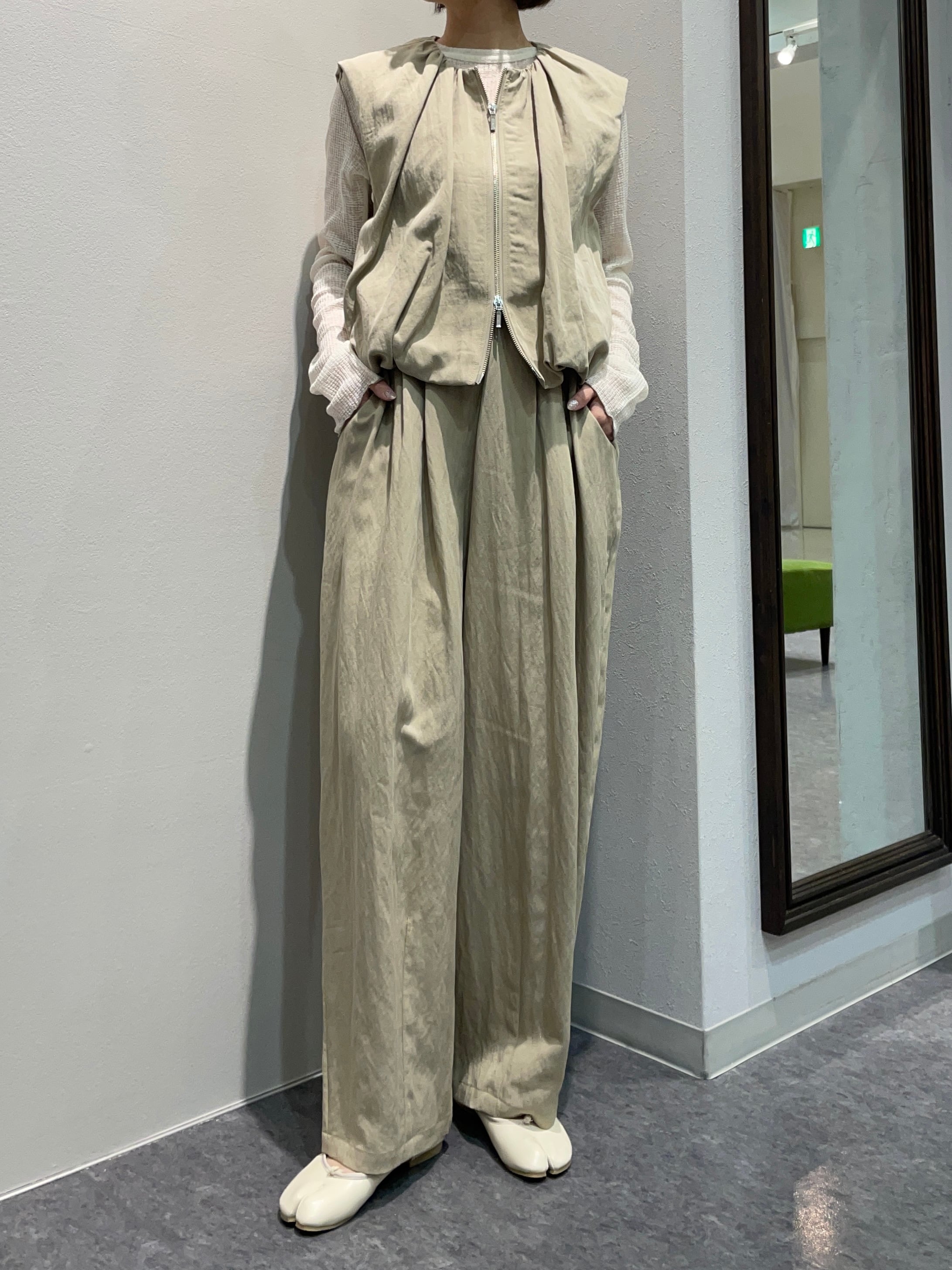 計算されたタック&ギャザーが生み出す、立体感のあるバルーンシルエットが印象的なショートレングスベストと、やわらかな丸みのあるカーヴィーシルエットのパンツのセットアップです。