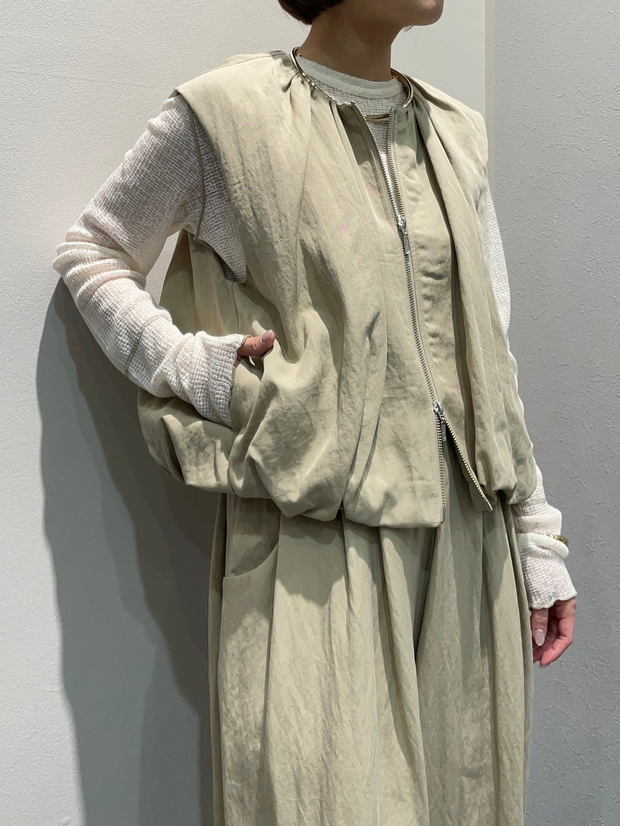 ベストはトップス感覚でもレイヤードでも着用でき、さらっと羽織るだけでモード感のある着こなしに。ダブルジップ仕様でニュアンスを付けやすく、スタイリングの幅が広がります。
