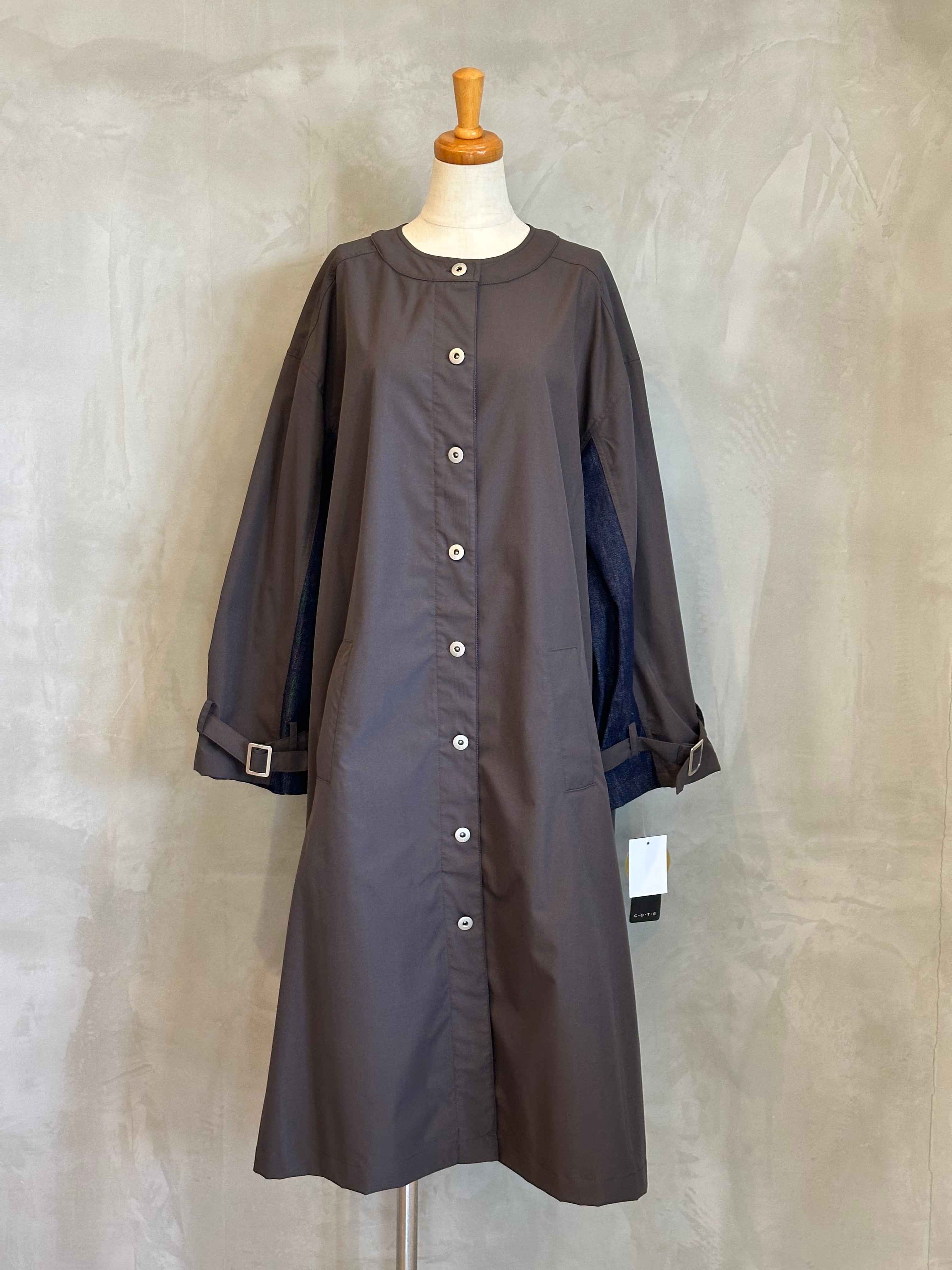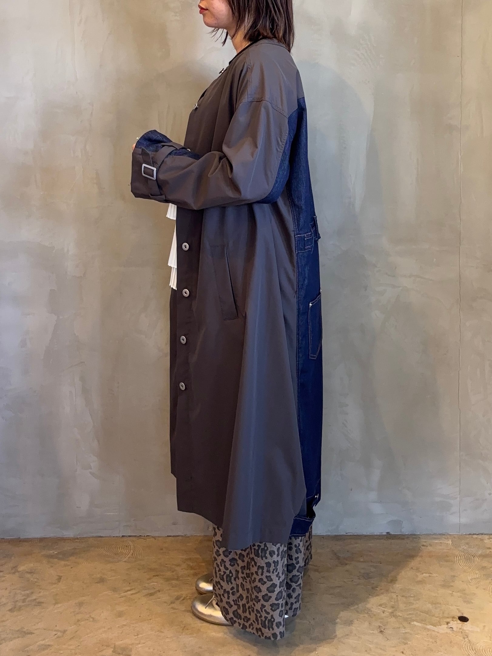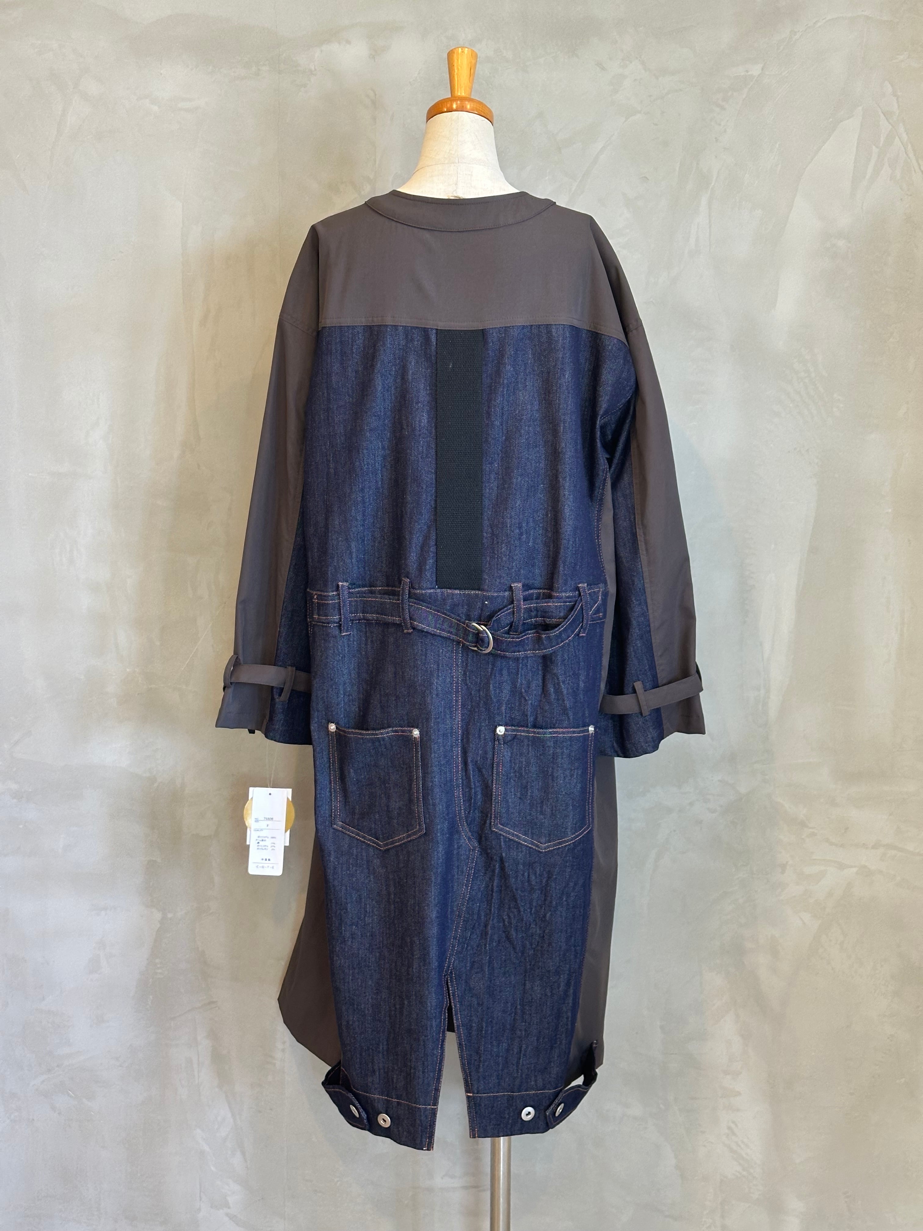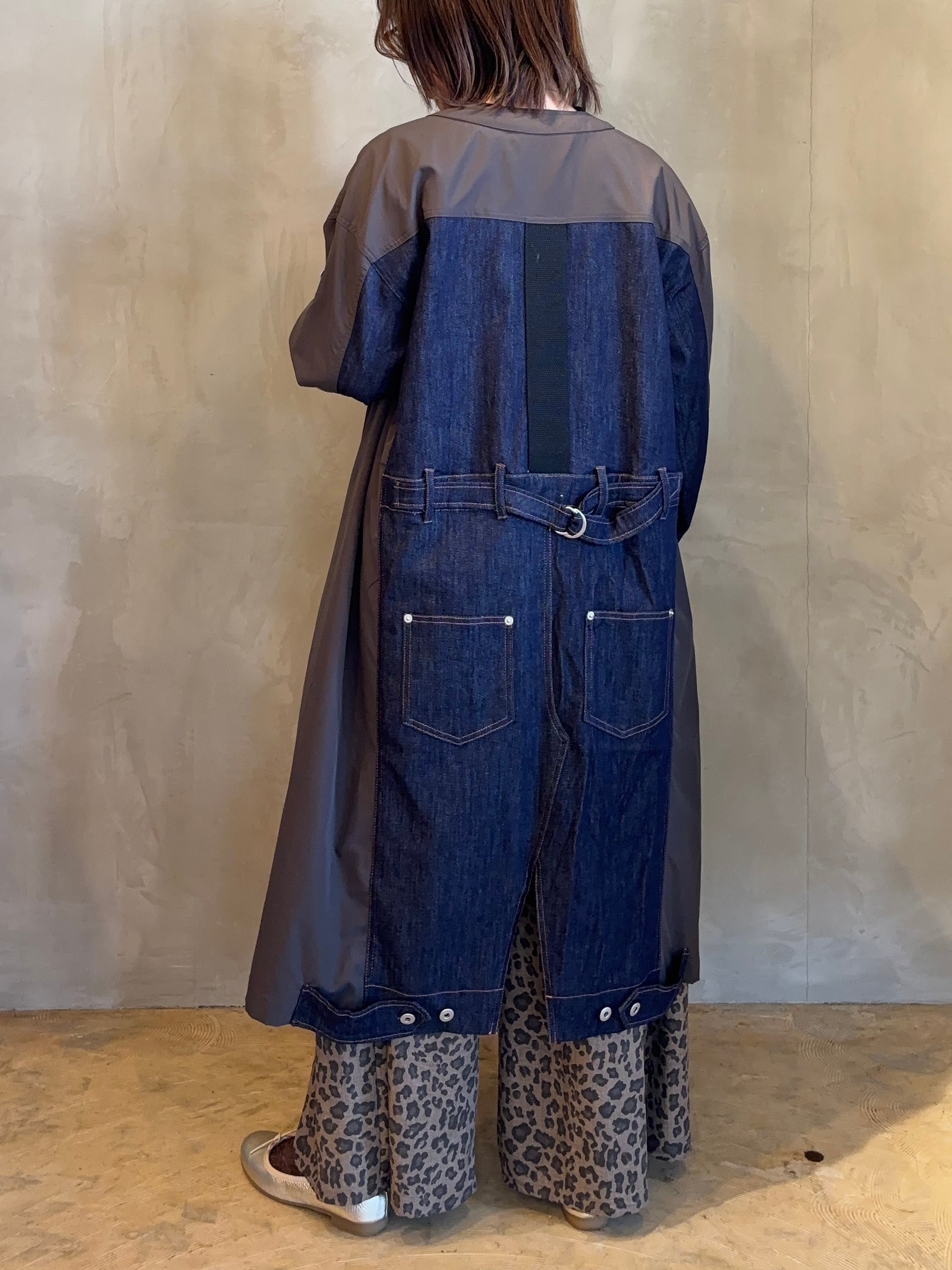 シンプルなフロントデザインに、後ろ姿のデニム切替が目を引くデザインコート。