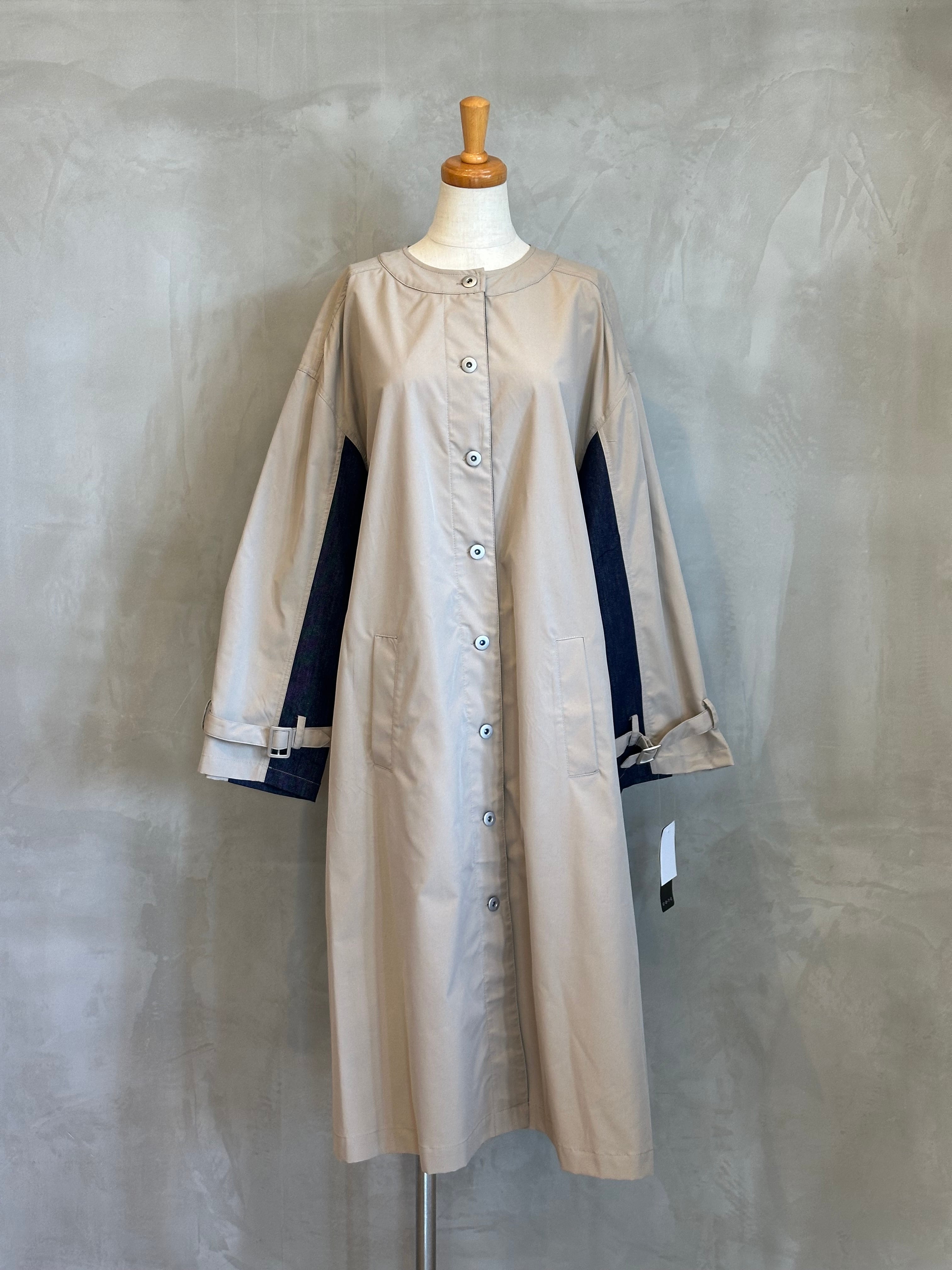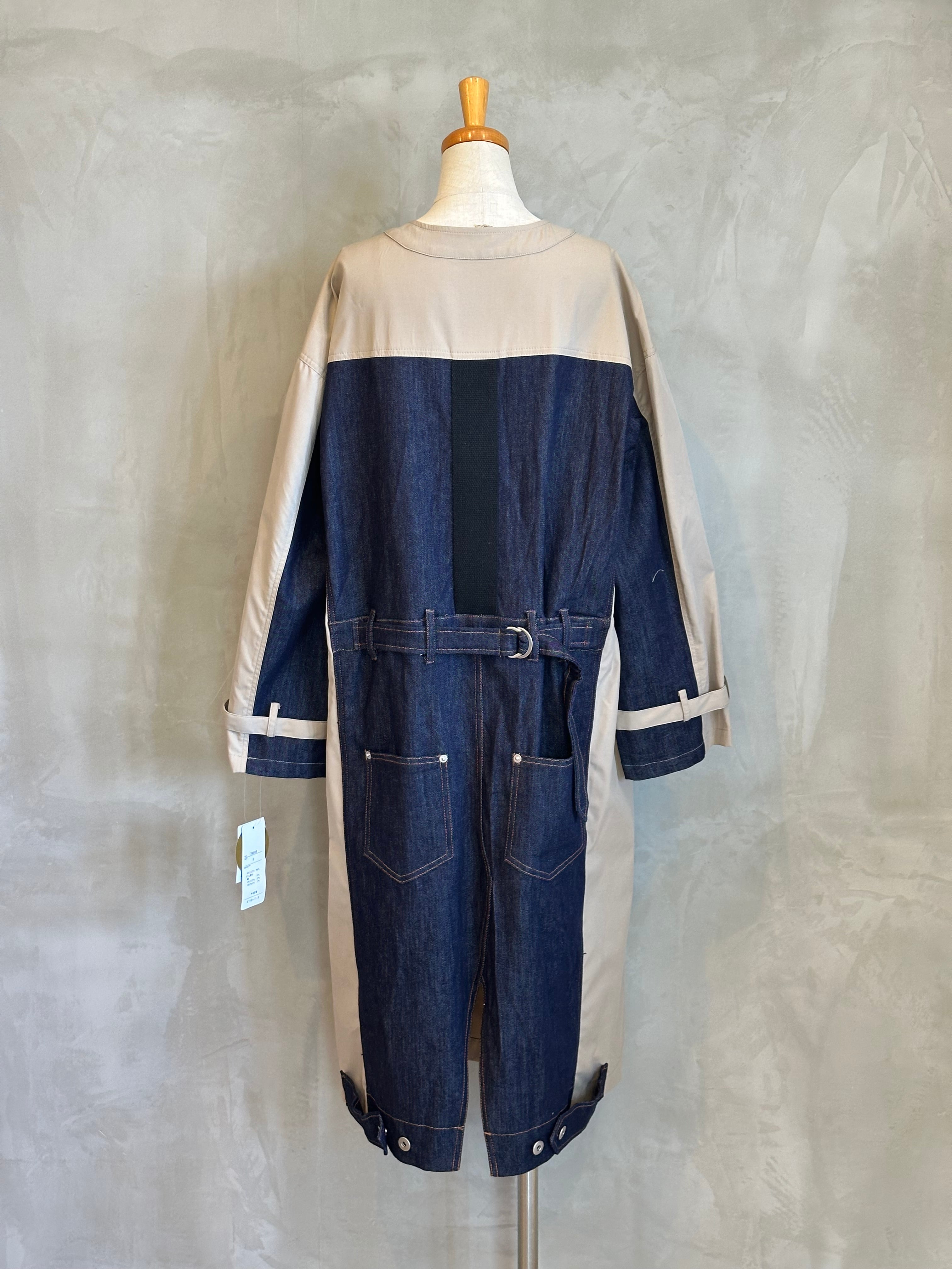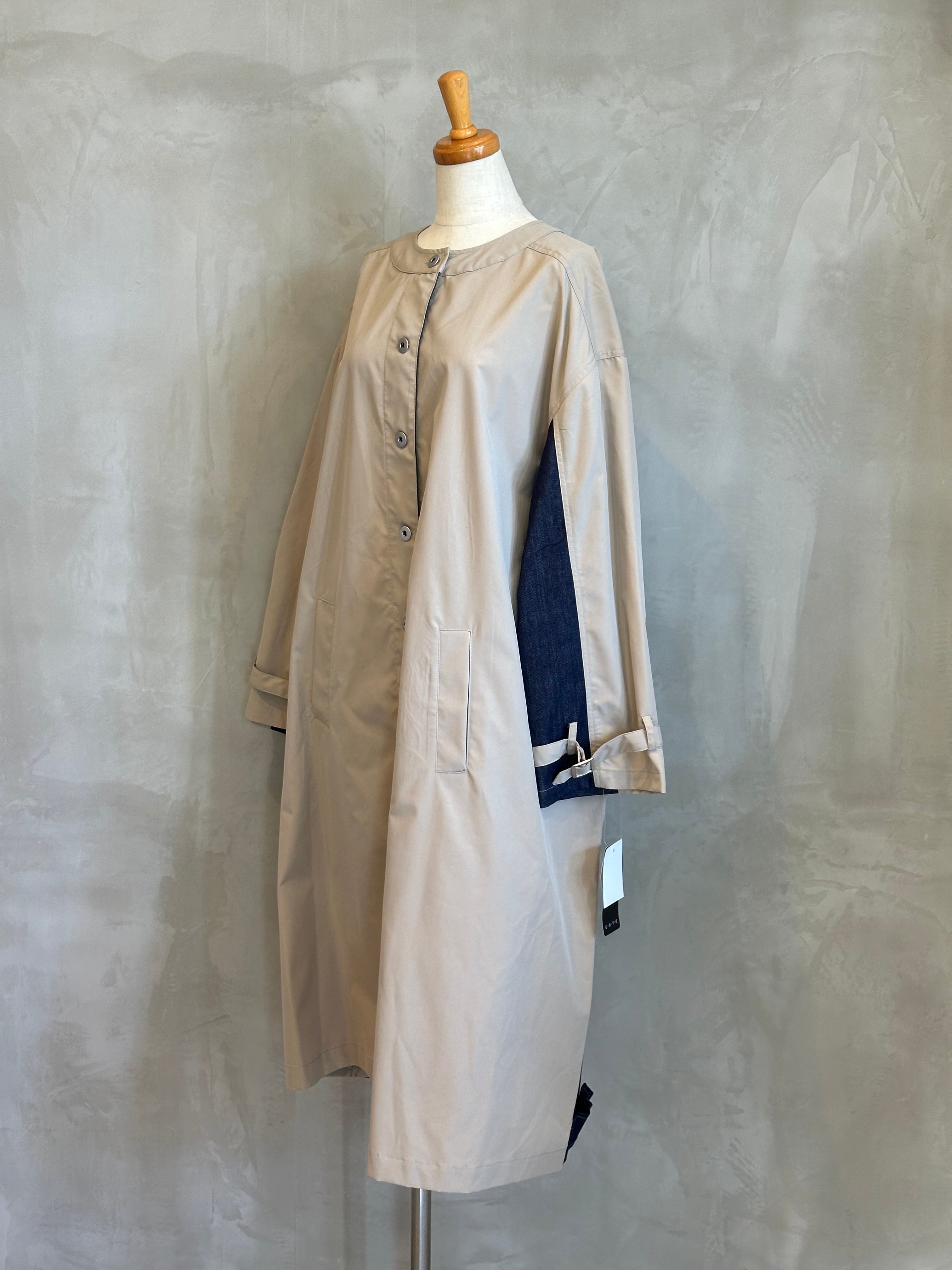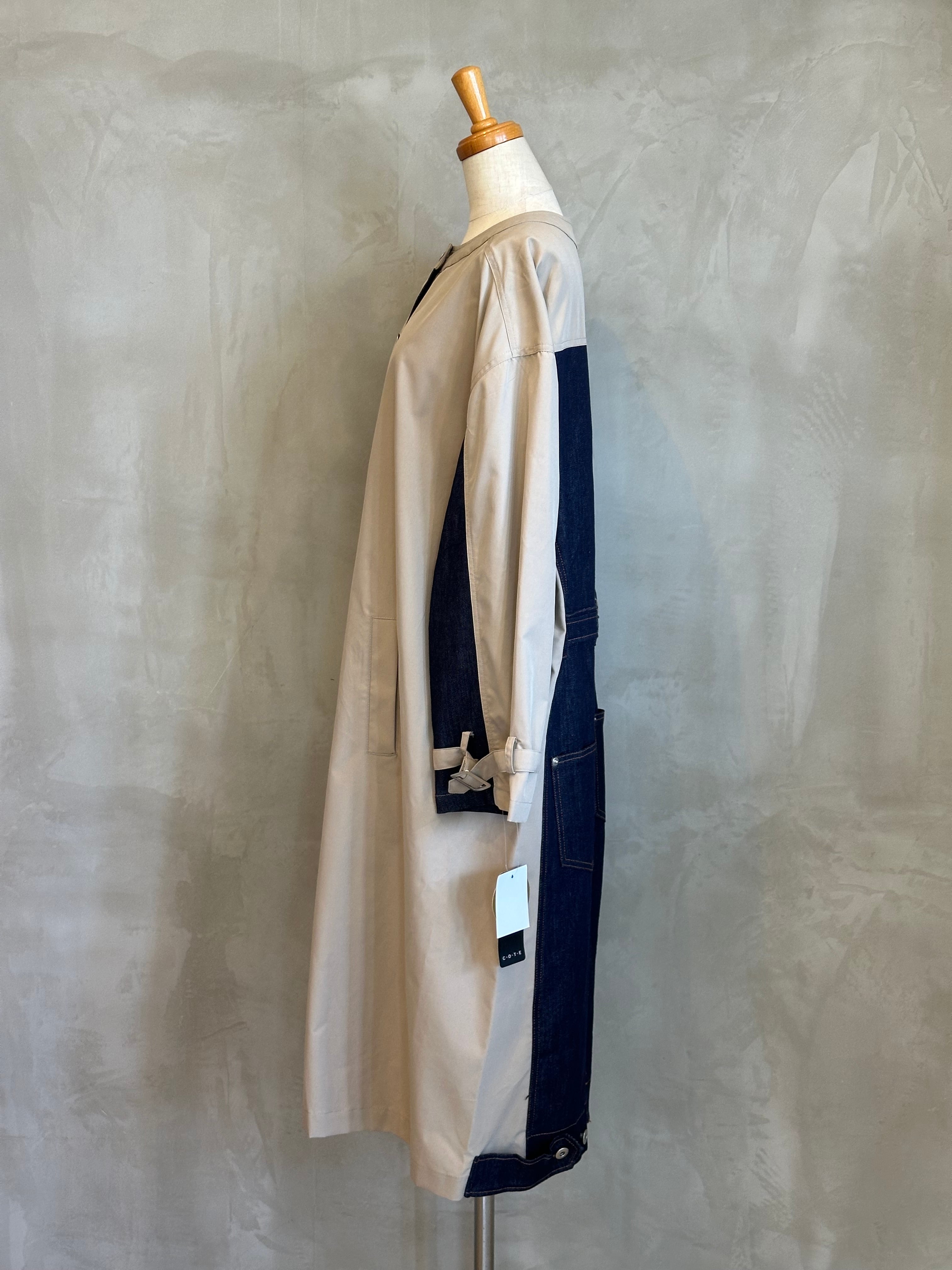 シンプルなフロントデザインに、後ろ姿のデニム切替が目を引くデザインコート。