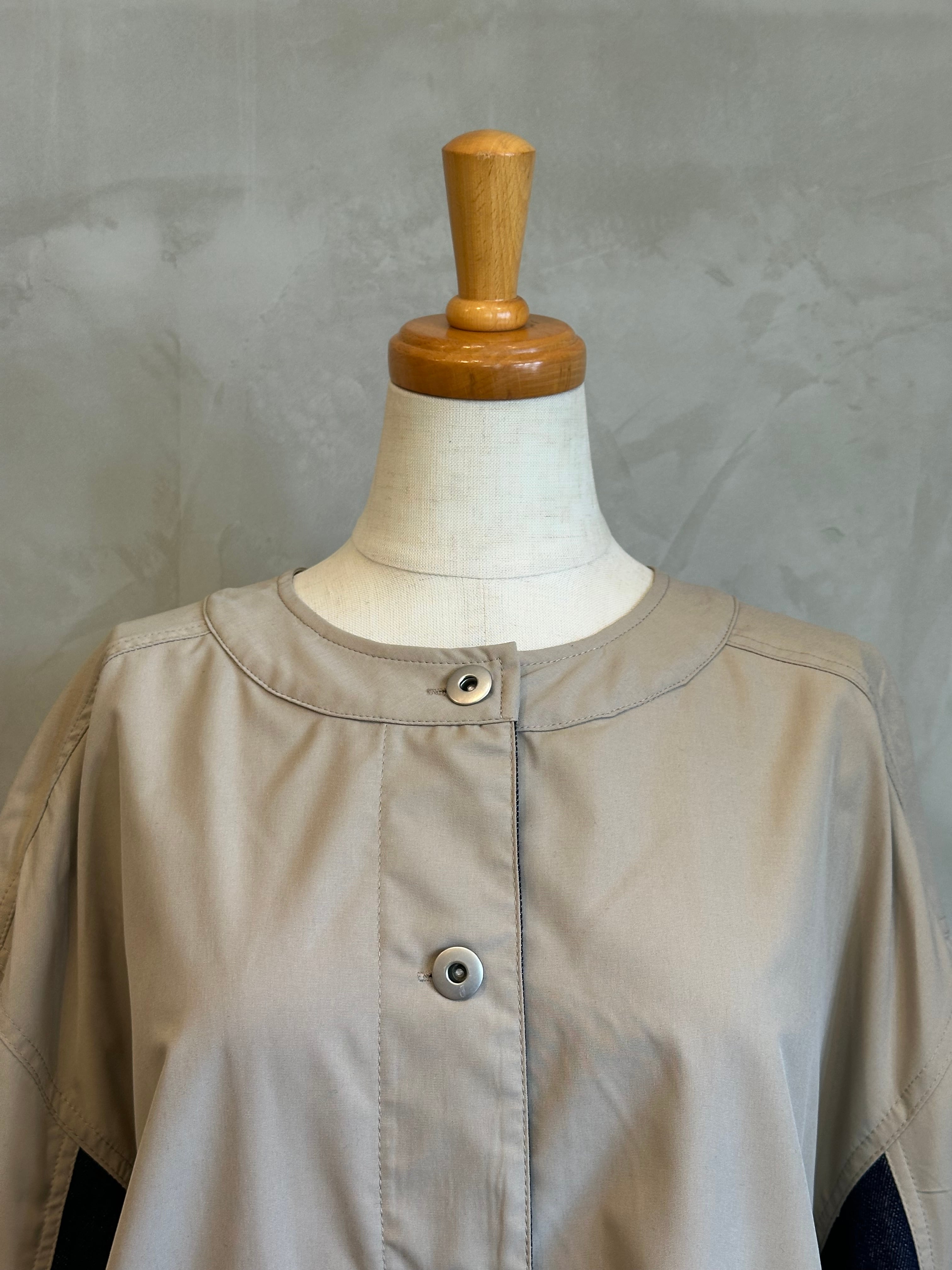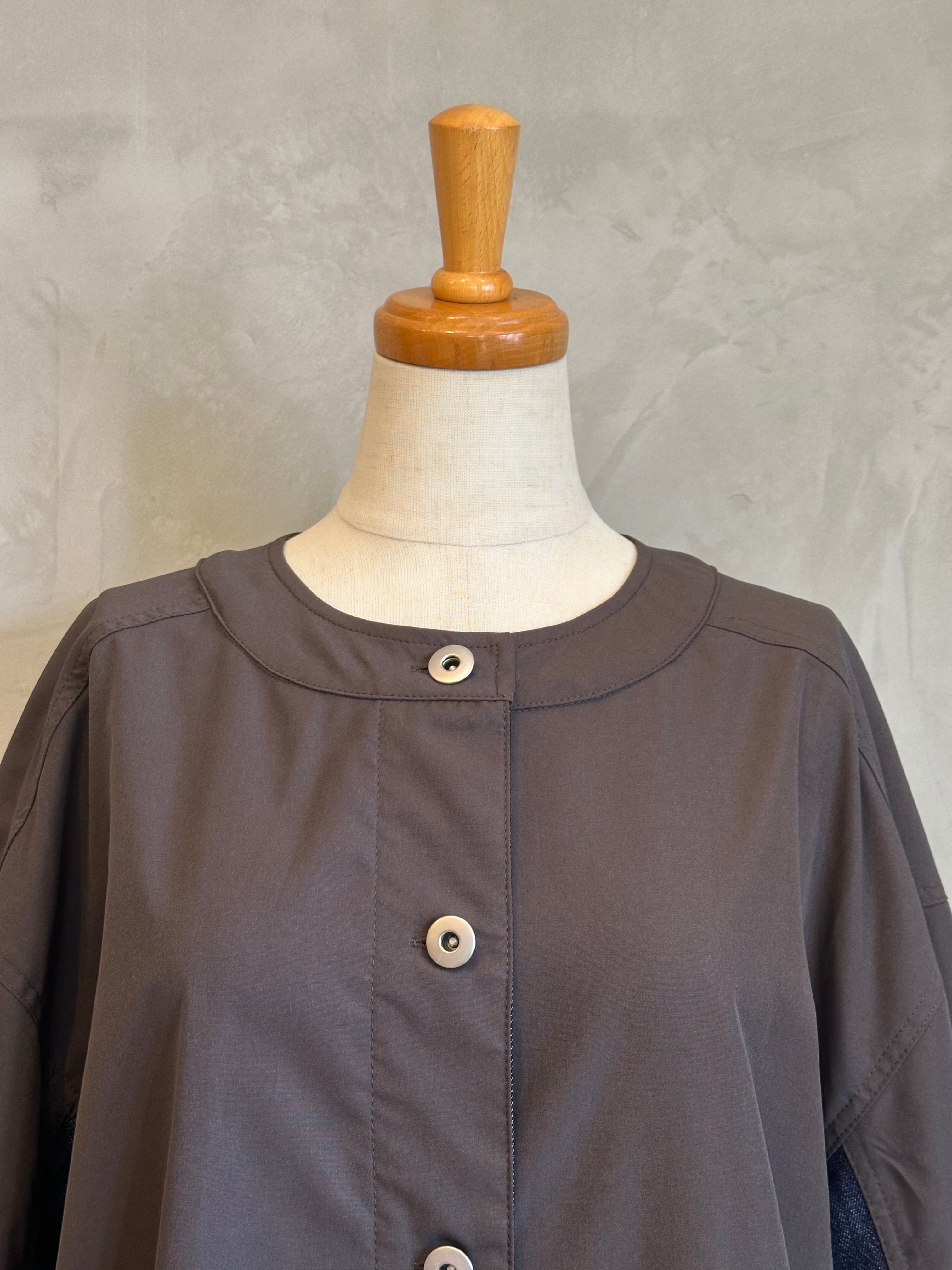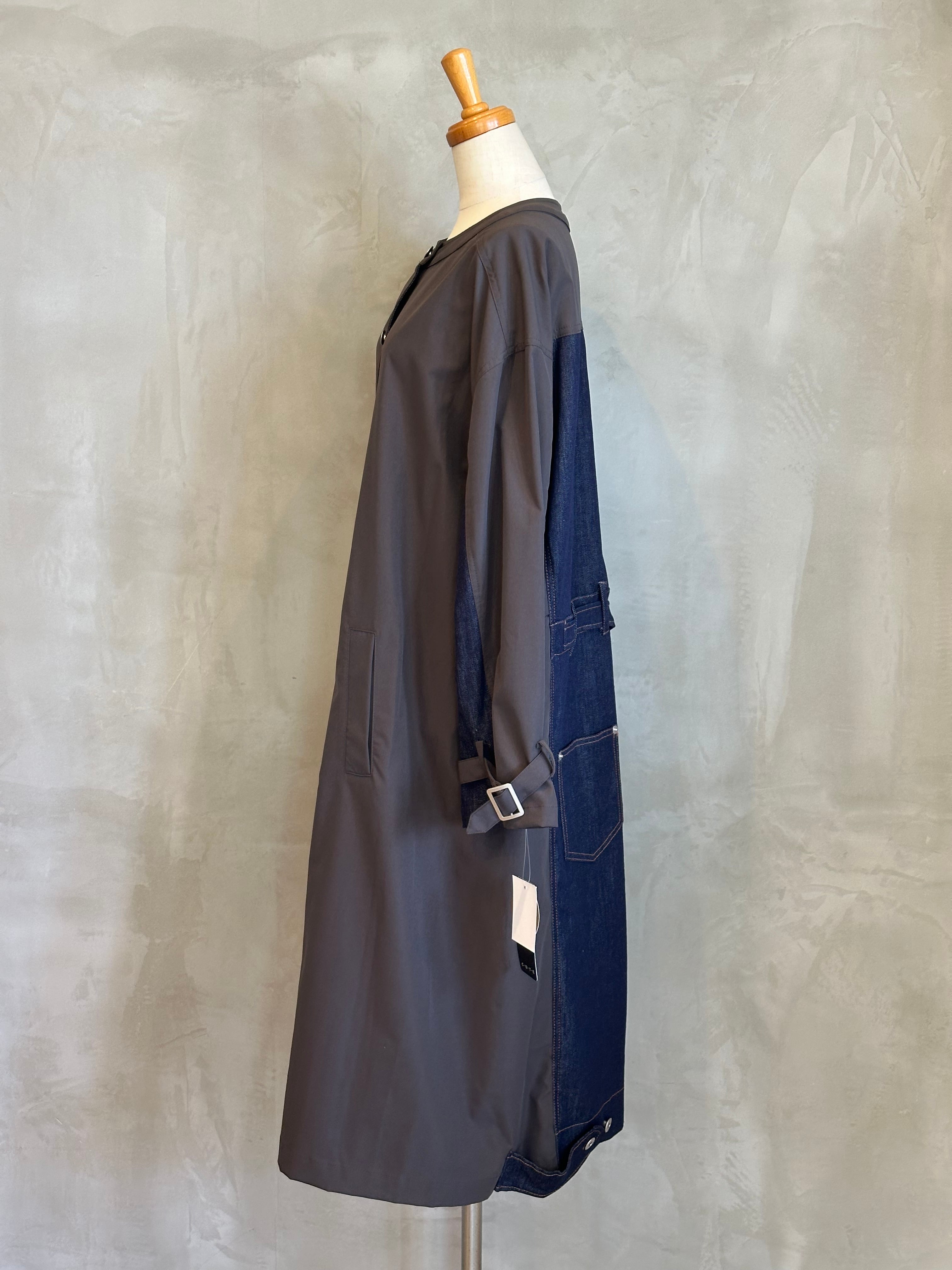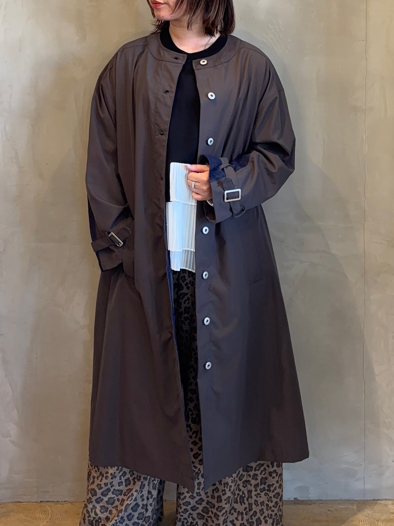 シンプルなフロントデザインに、後ろ姿のデニム切替が目を引くデザインコート。