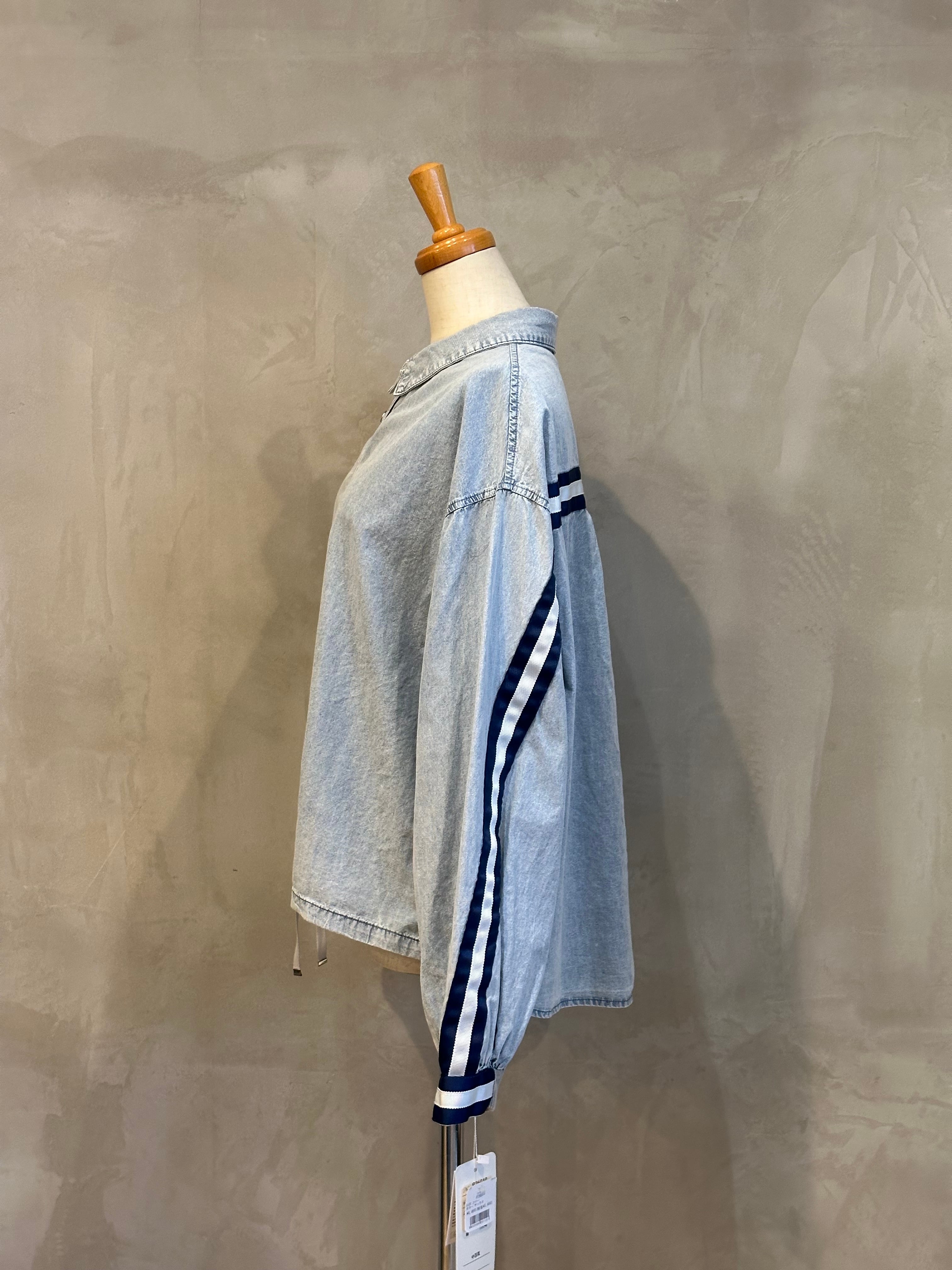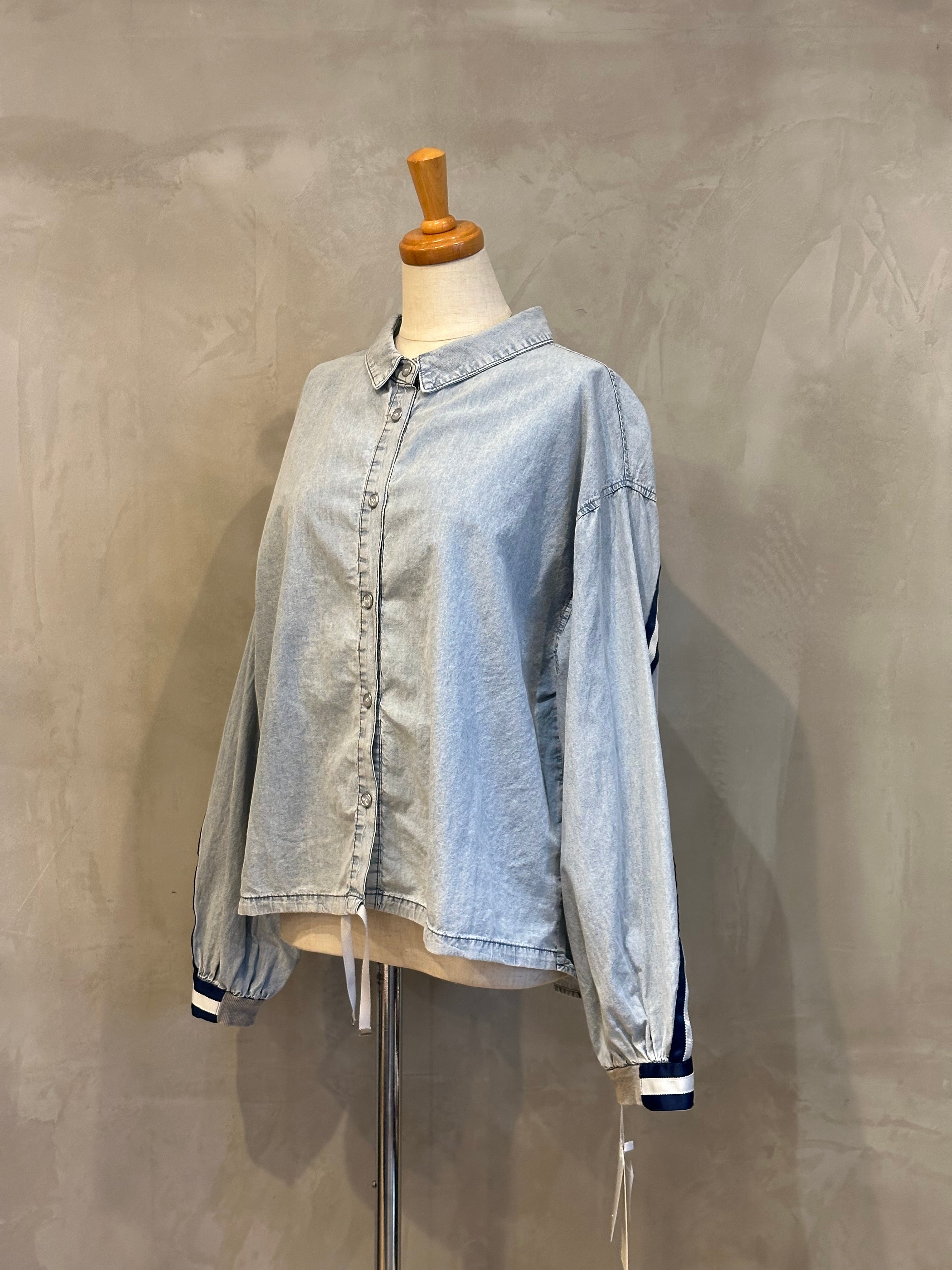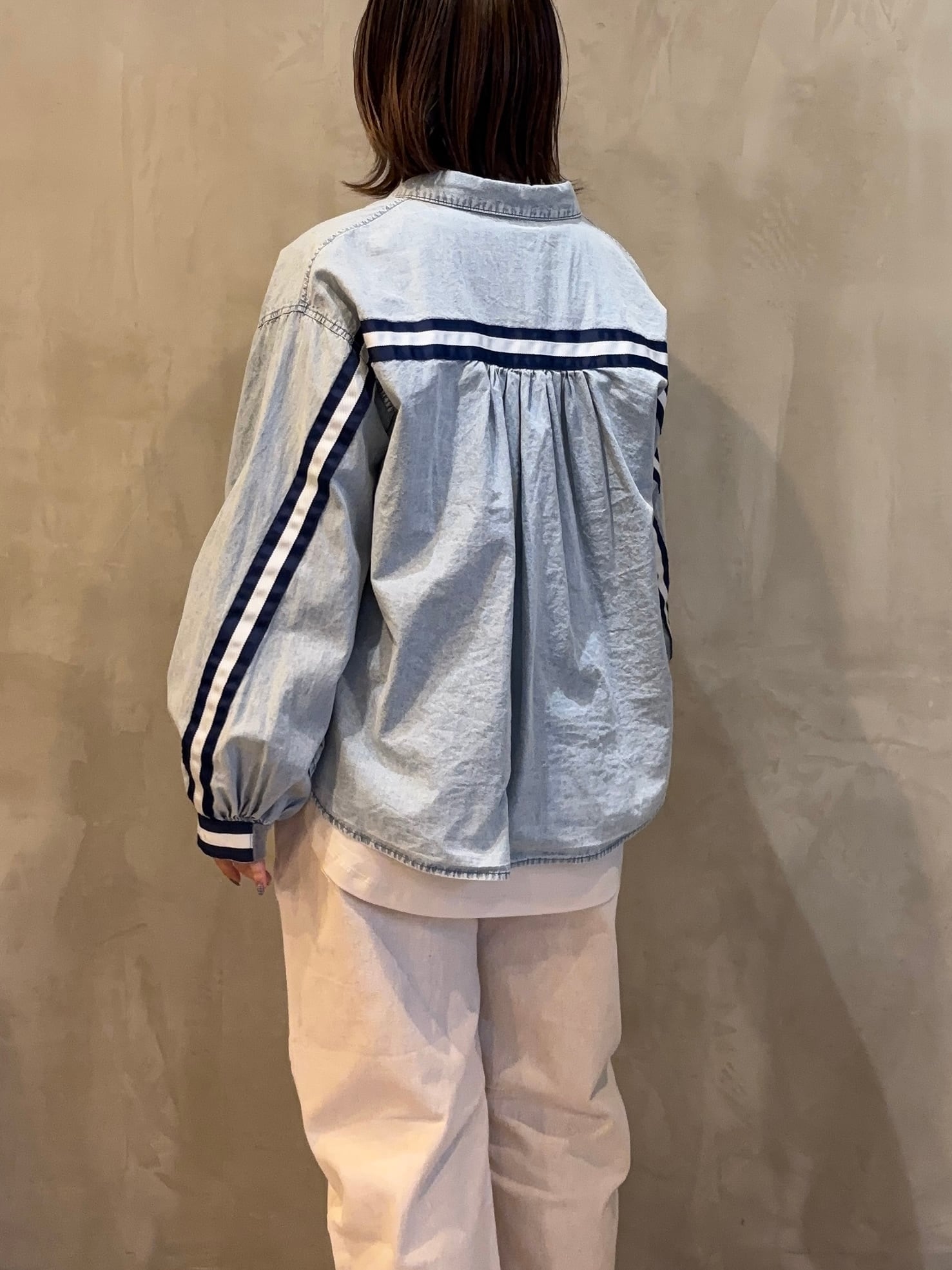袖とバックスタイルのラインデザインがアクセントになったデニムシャツ。