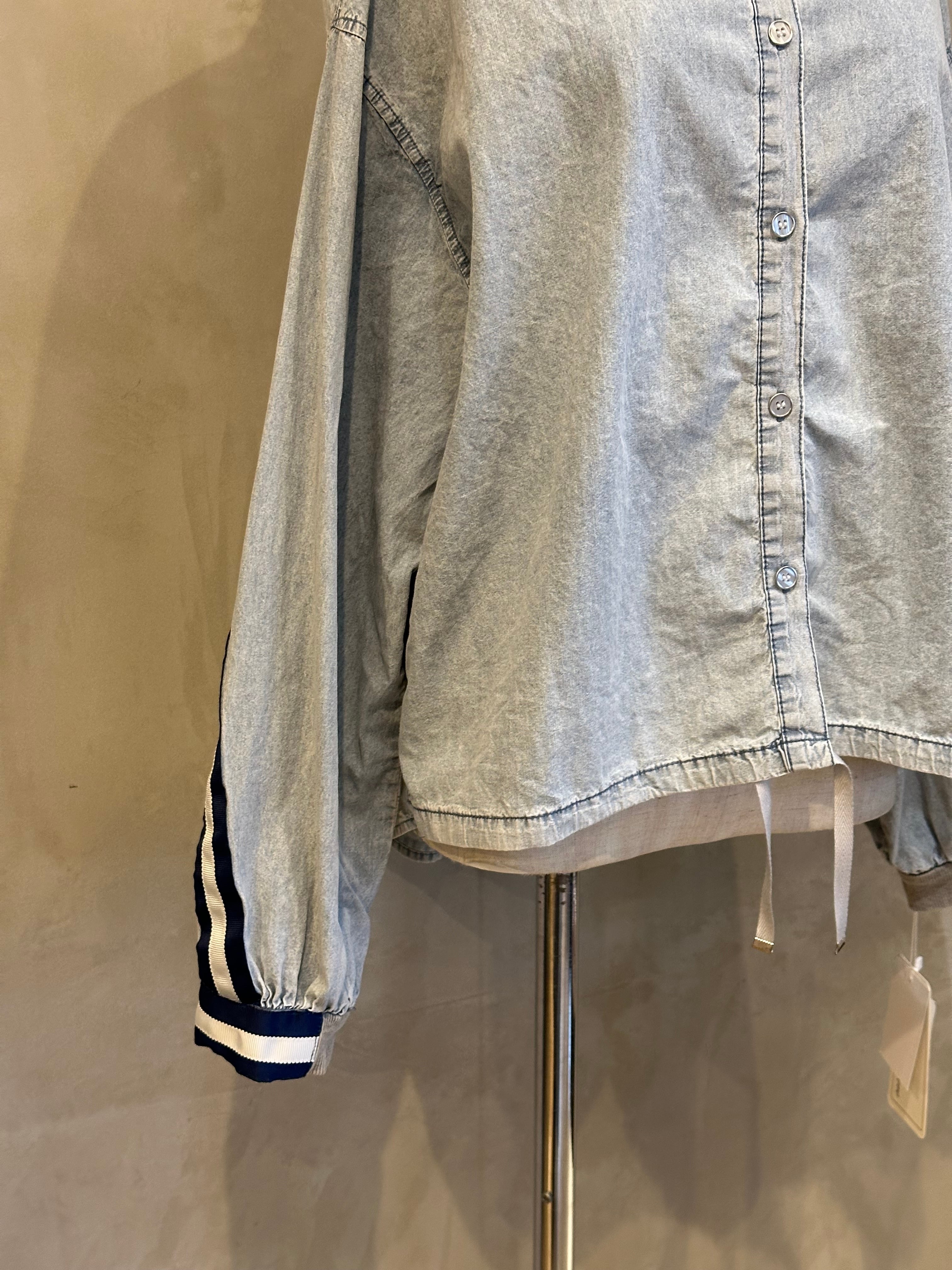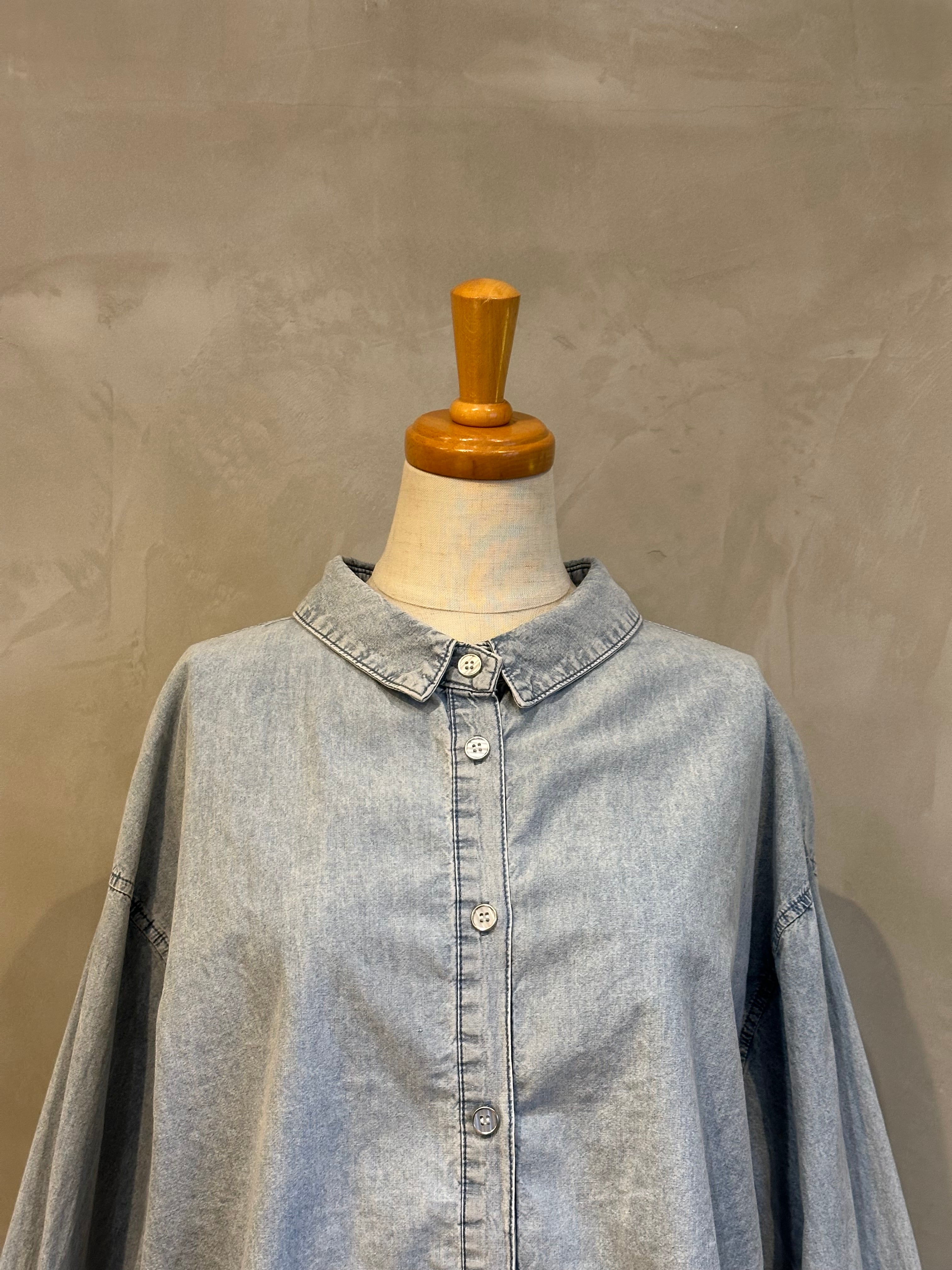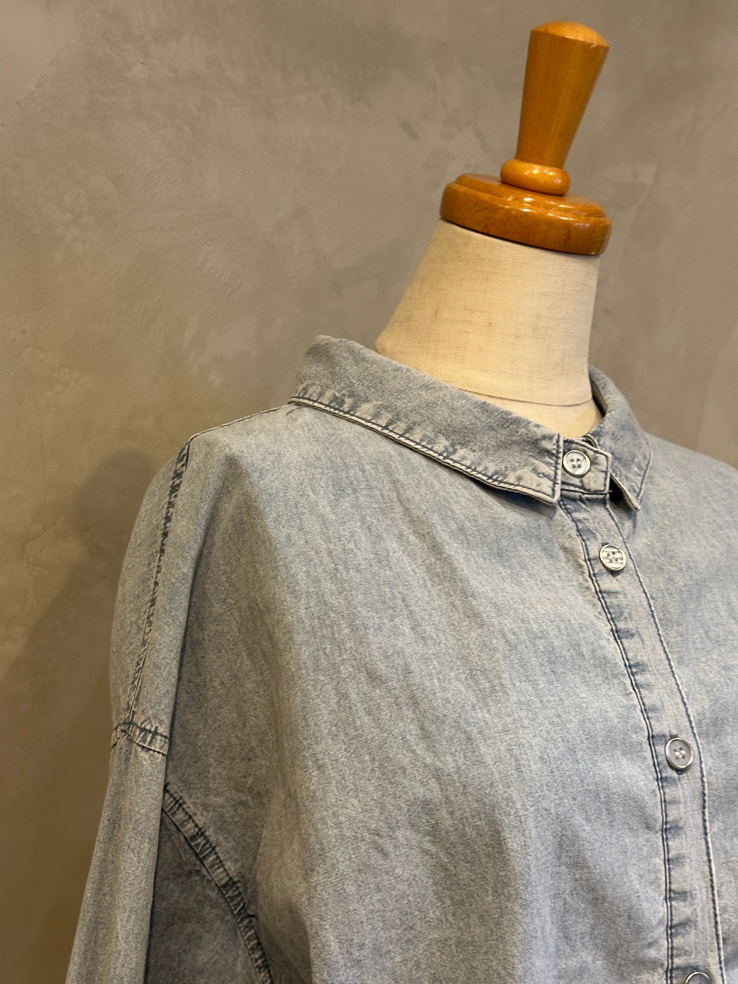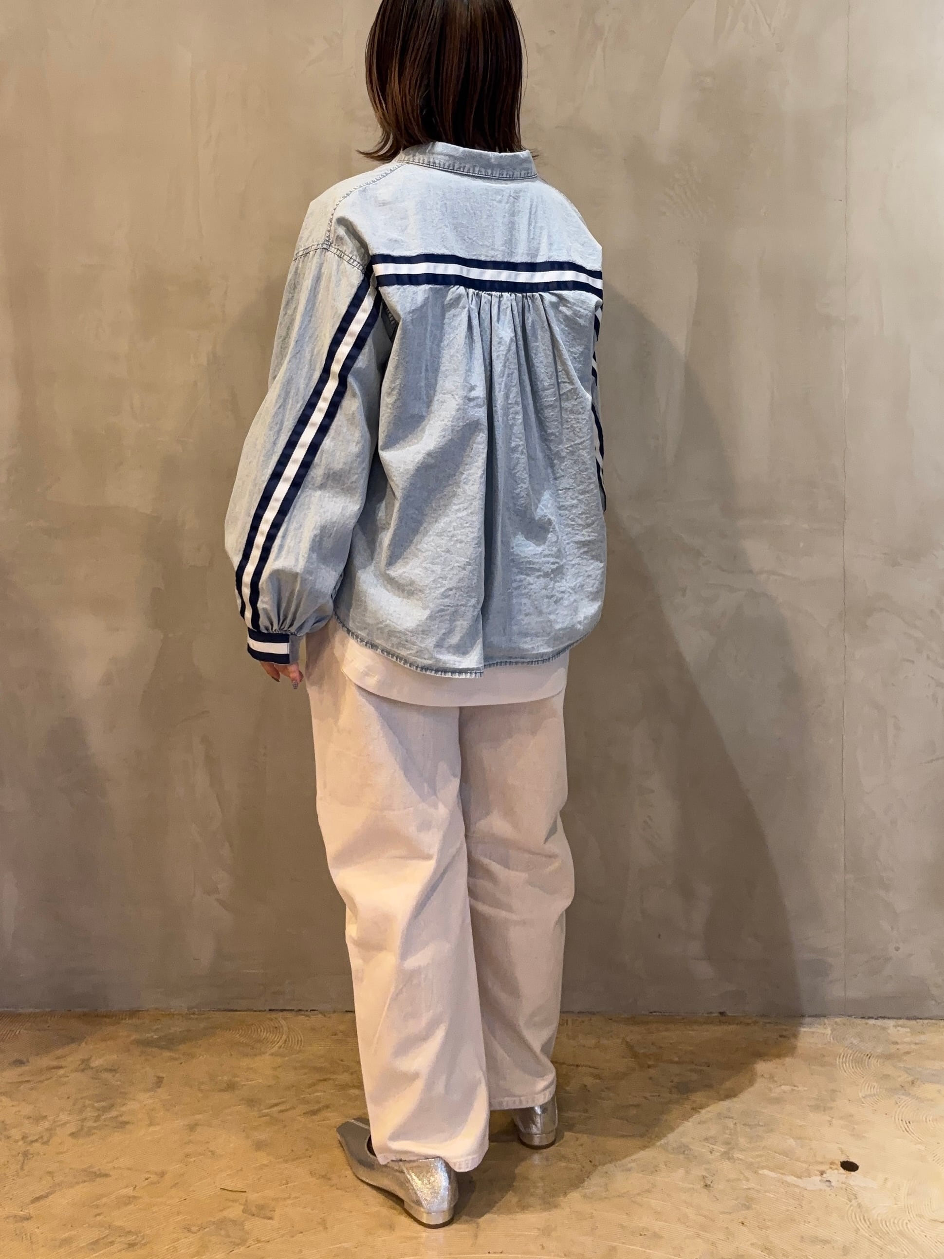 袖とバックスタイルのラインデザインがアクセントになったデニムシャツ。