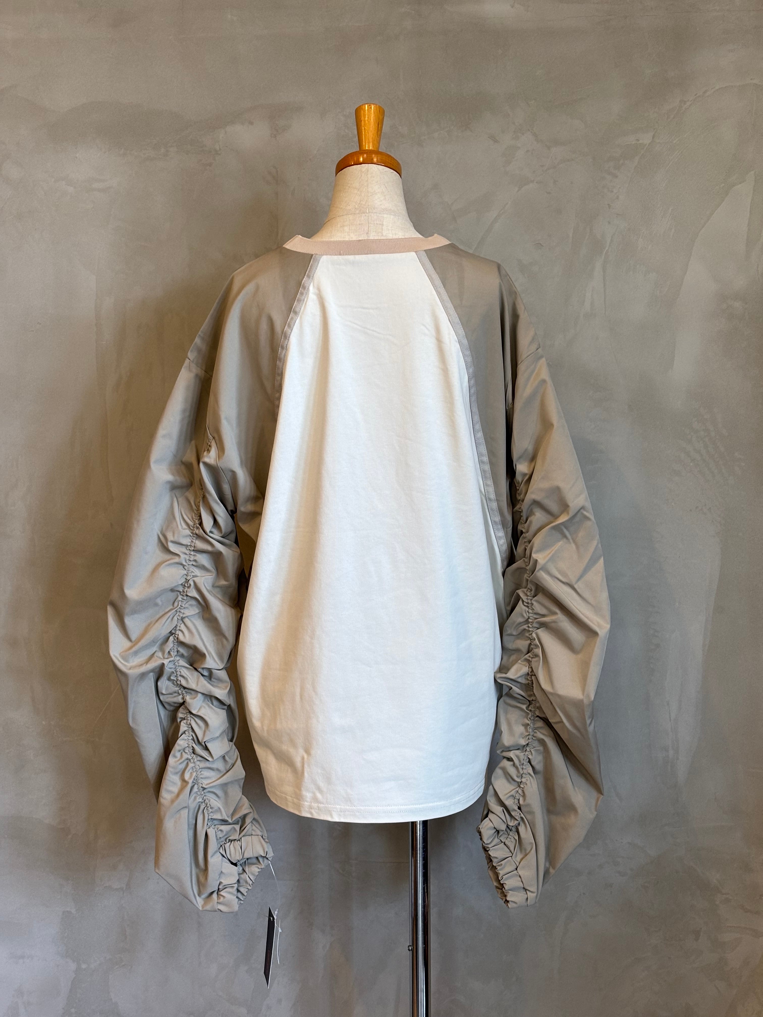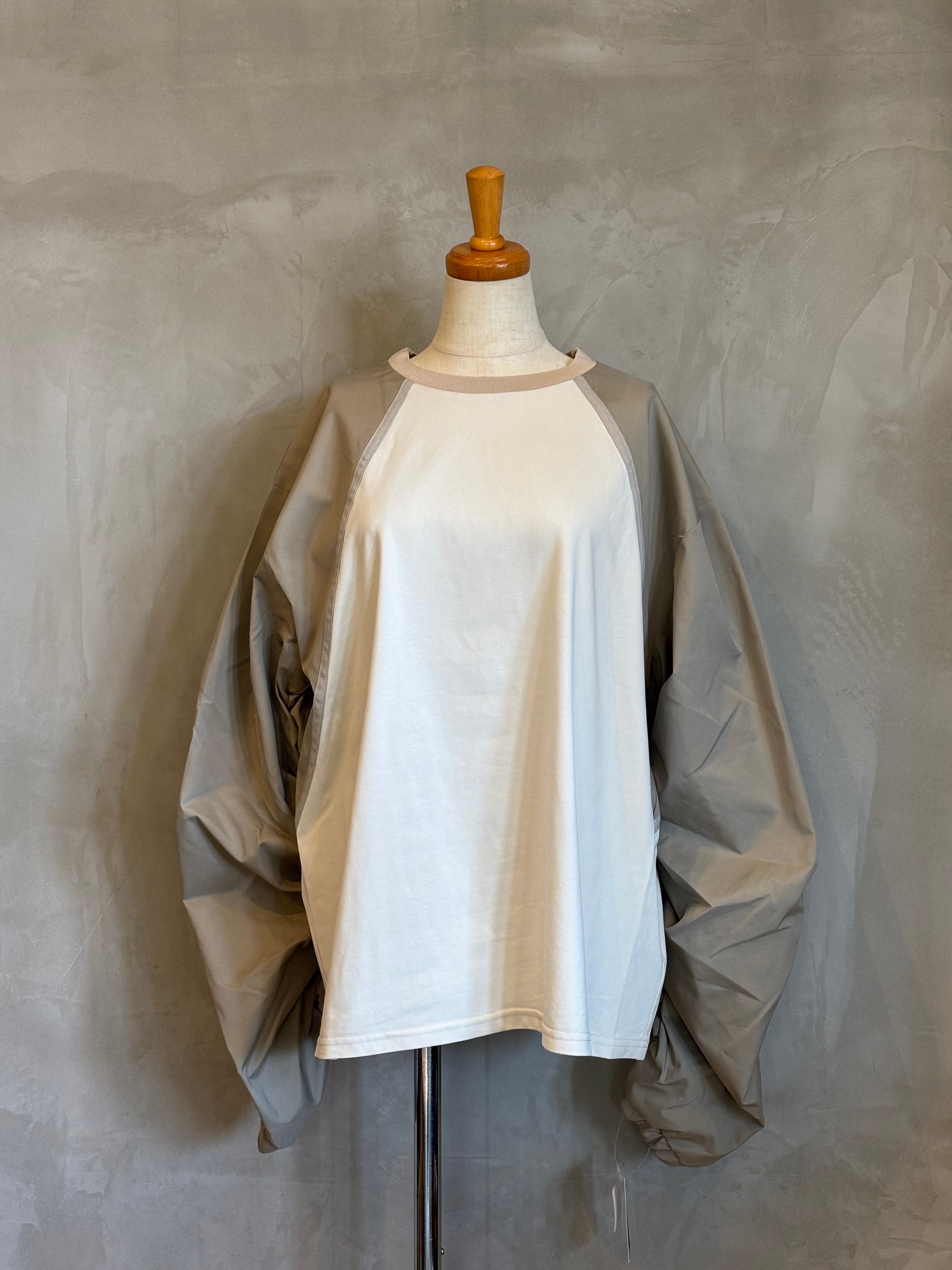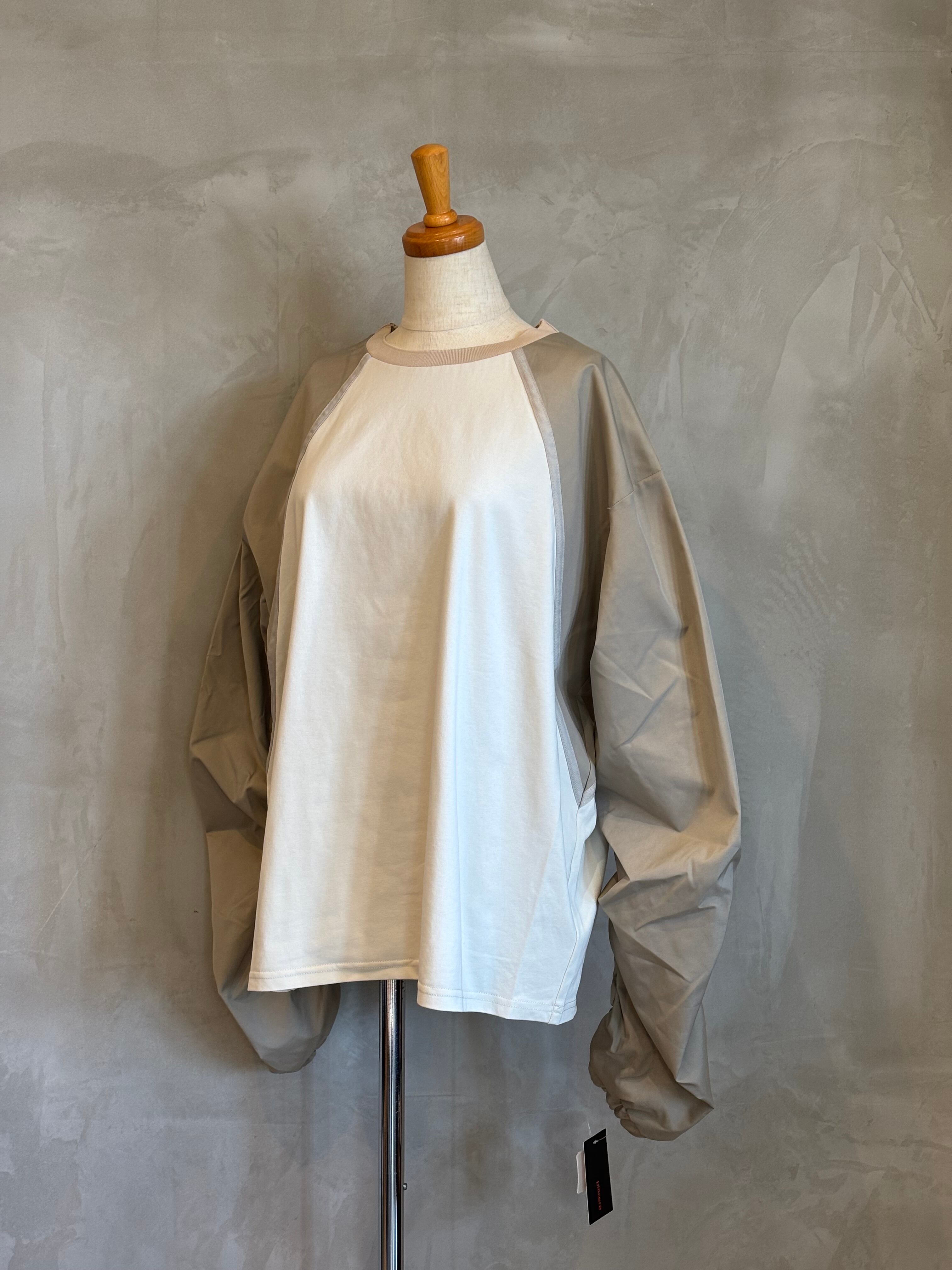 フロントはカットソー素材で心地よく、袖部分には軽やかな異素材を使用した一枚。
