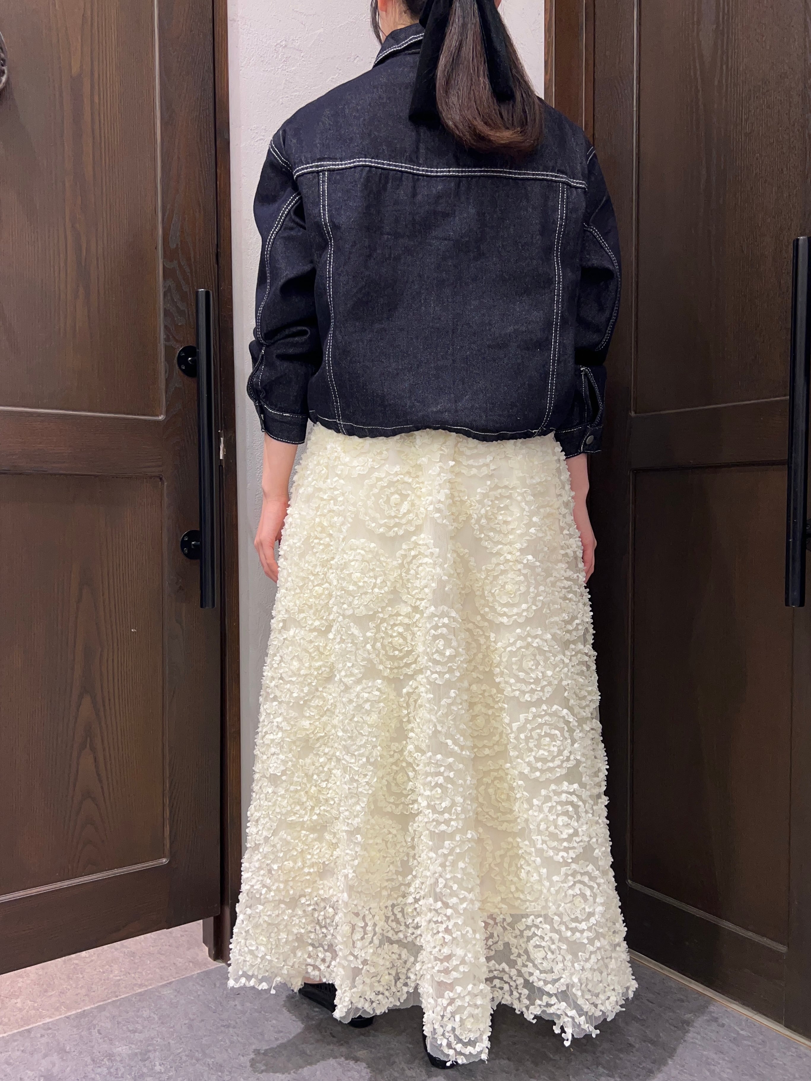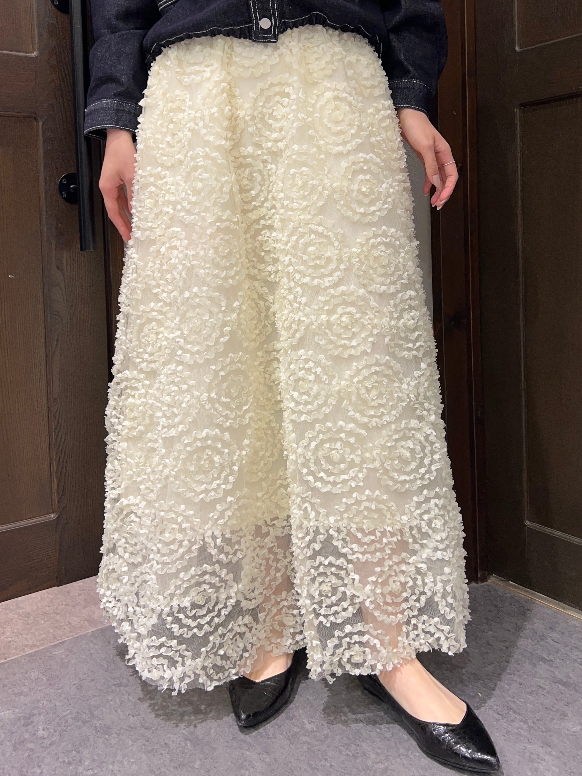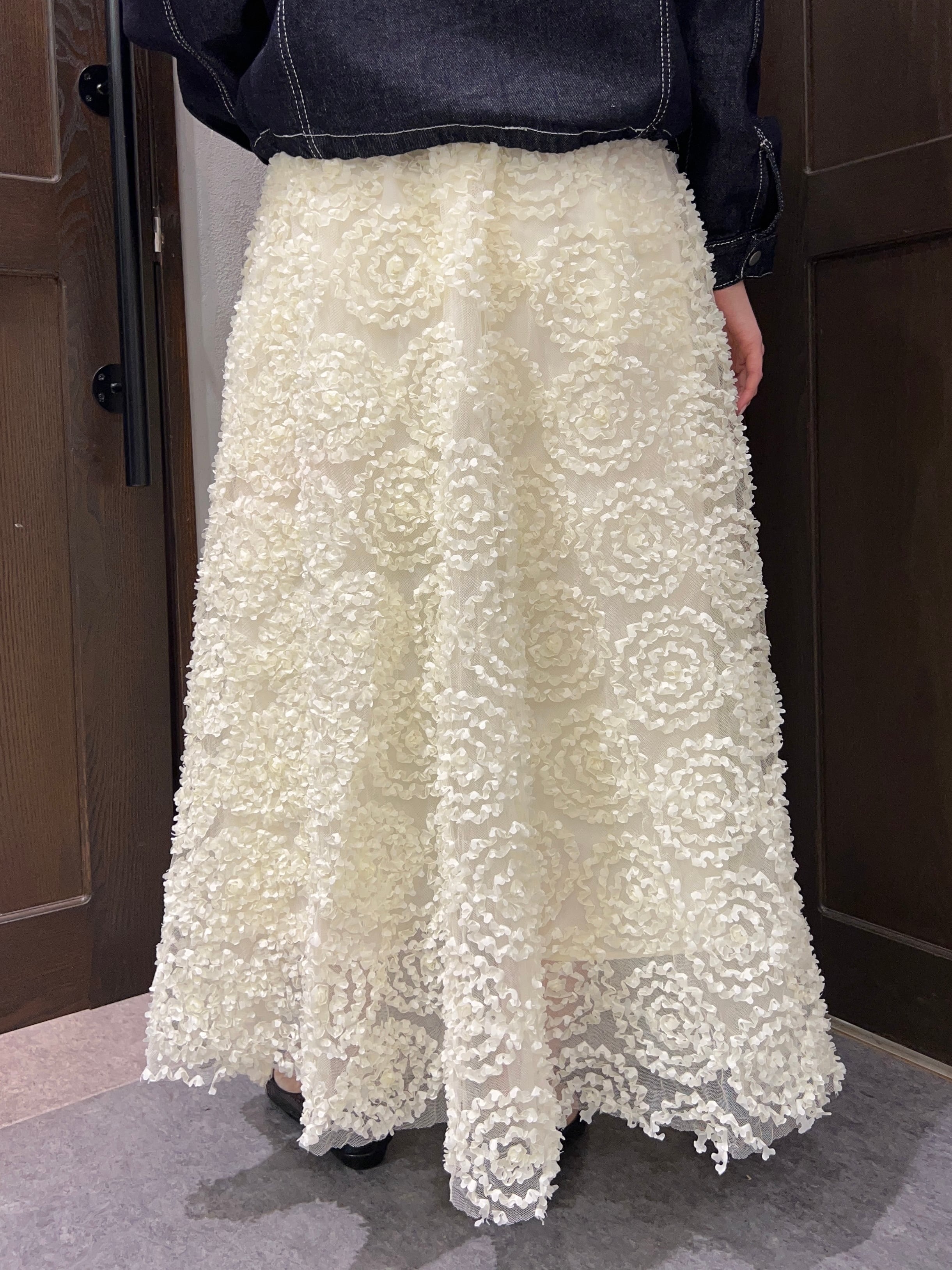 立体感のあるフラワーモチーフが目を惹く、華やかなロングスカート。