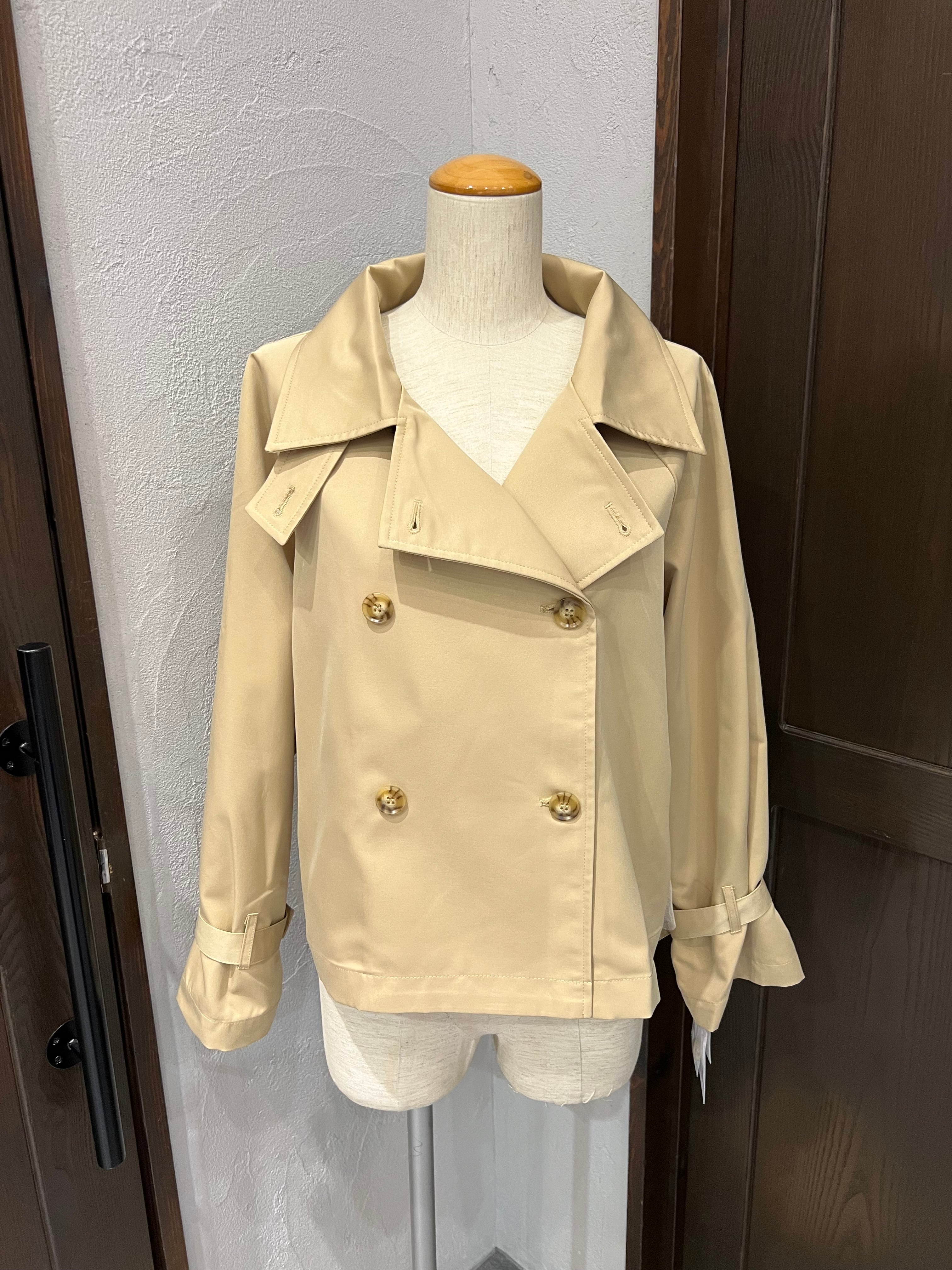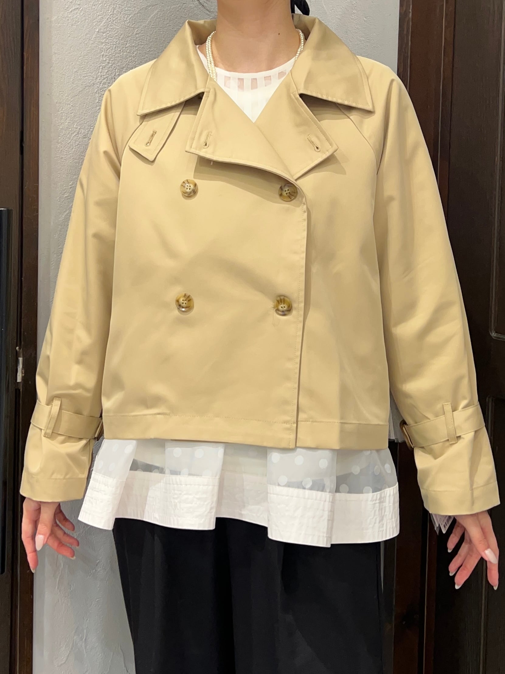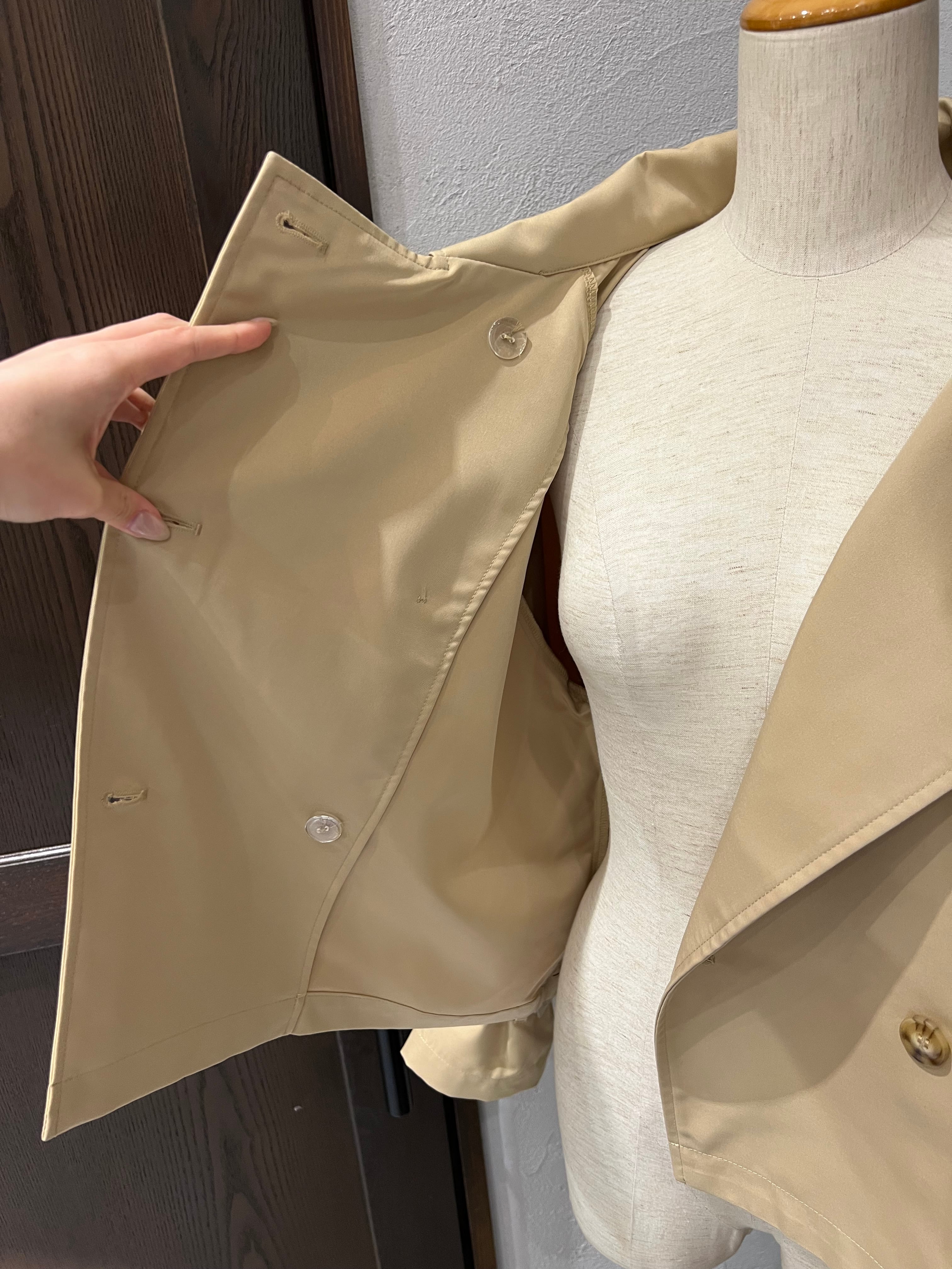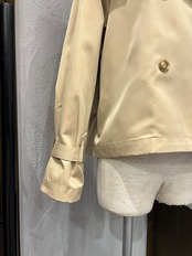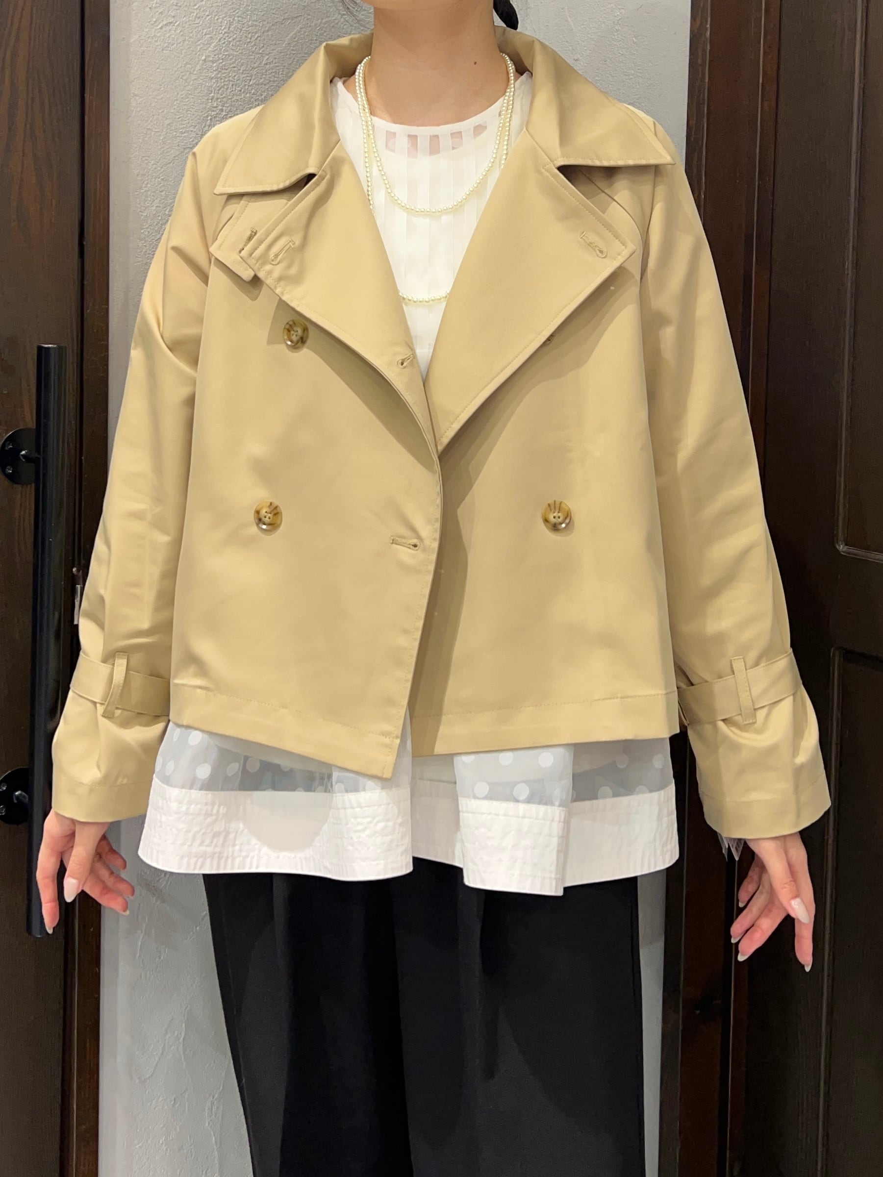 上品なベージュカラーが魅力のショートトレンチコート。