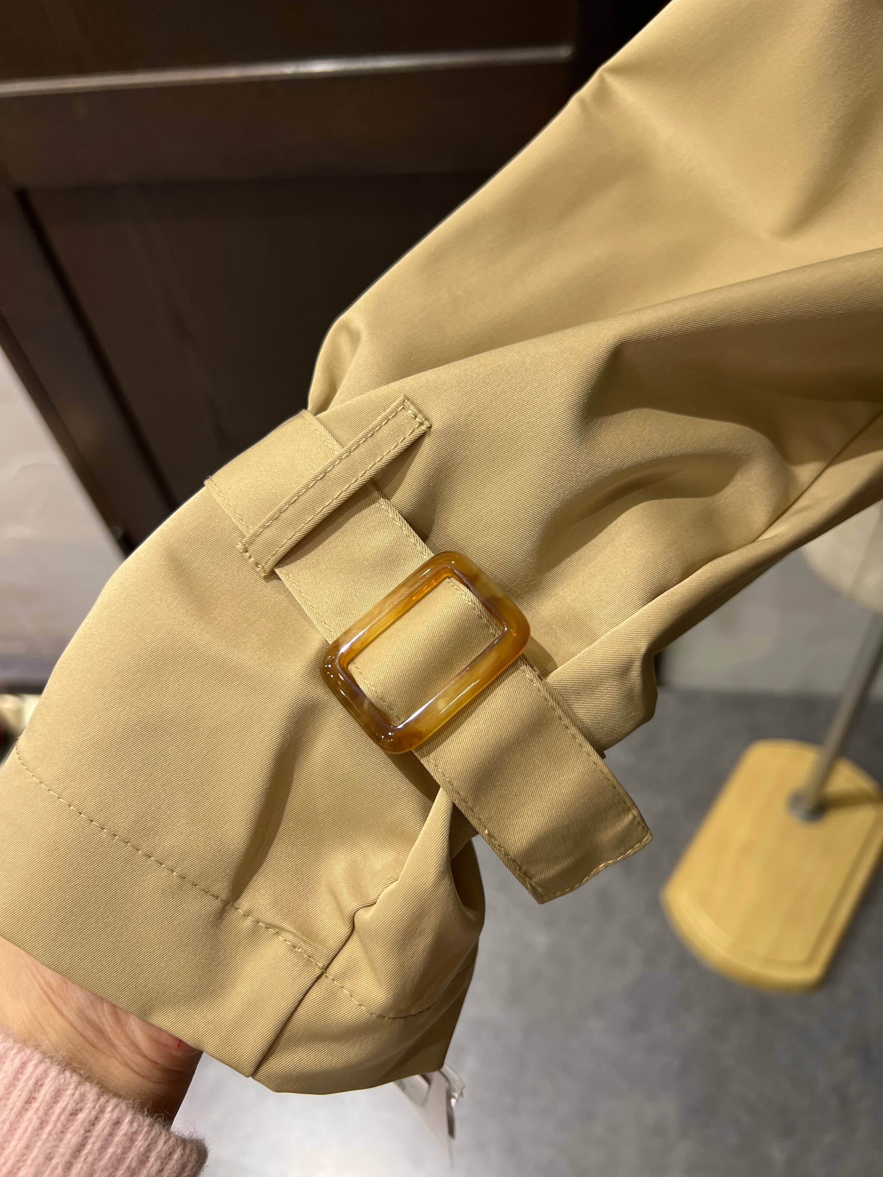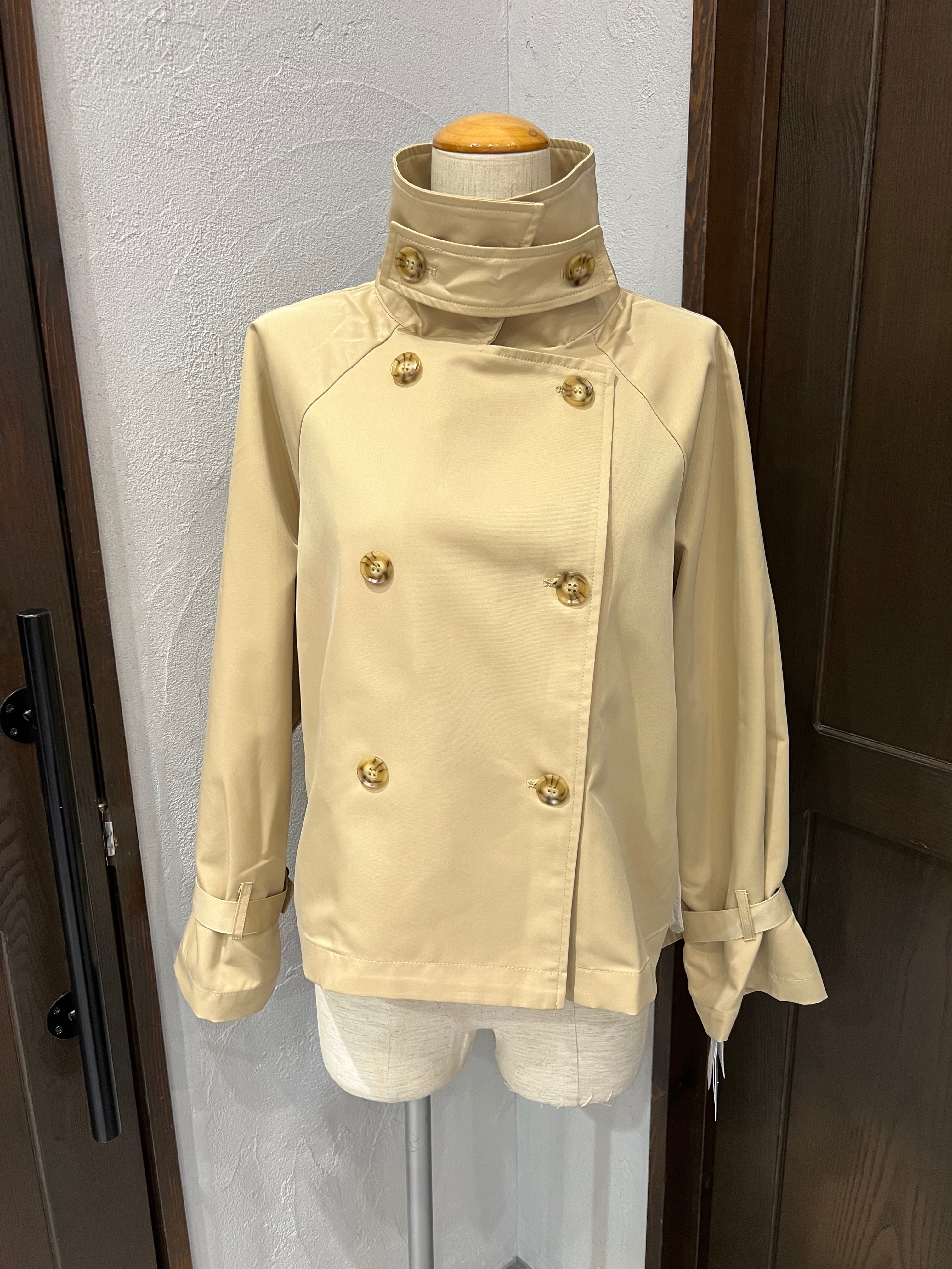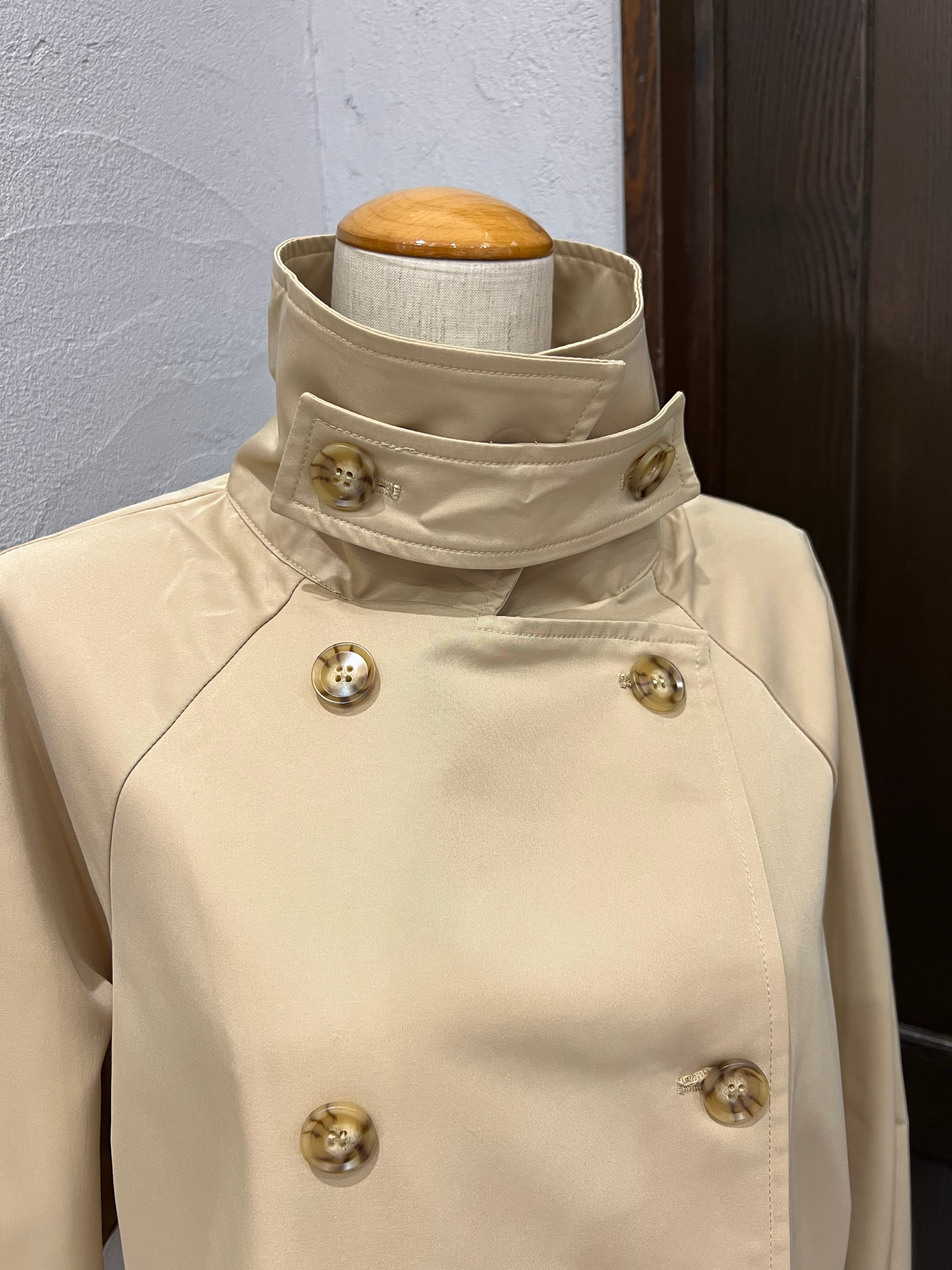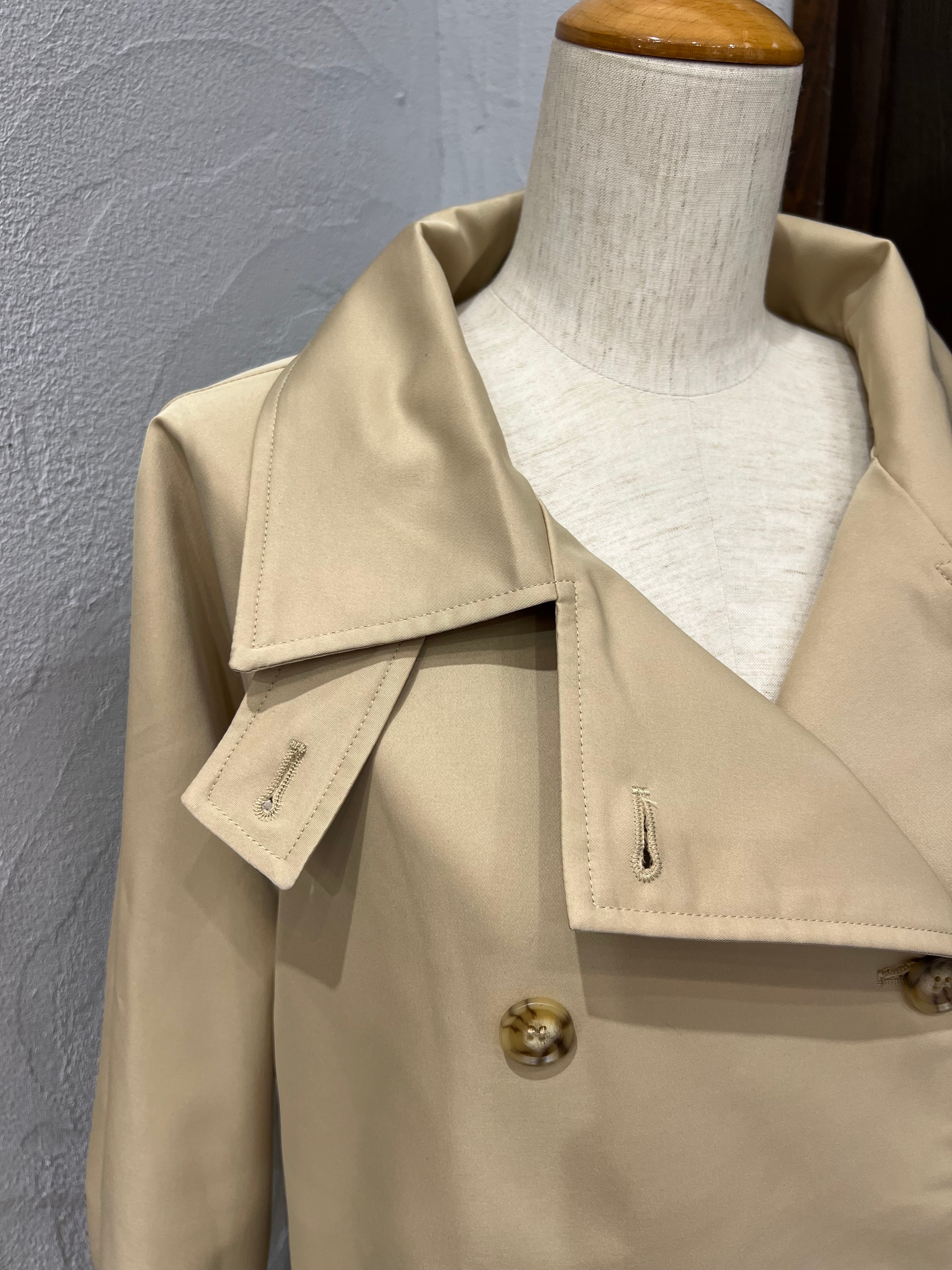 上品なベージュカラーが魅力のショートトレンチコート。