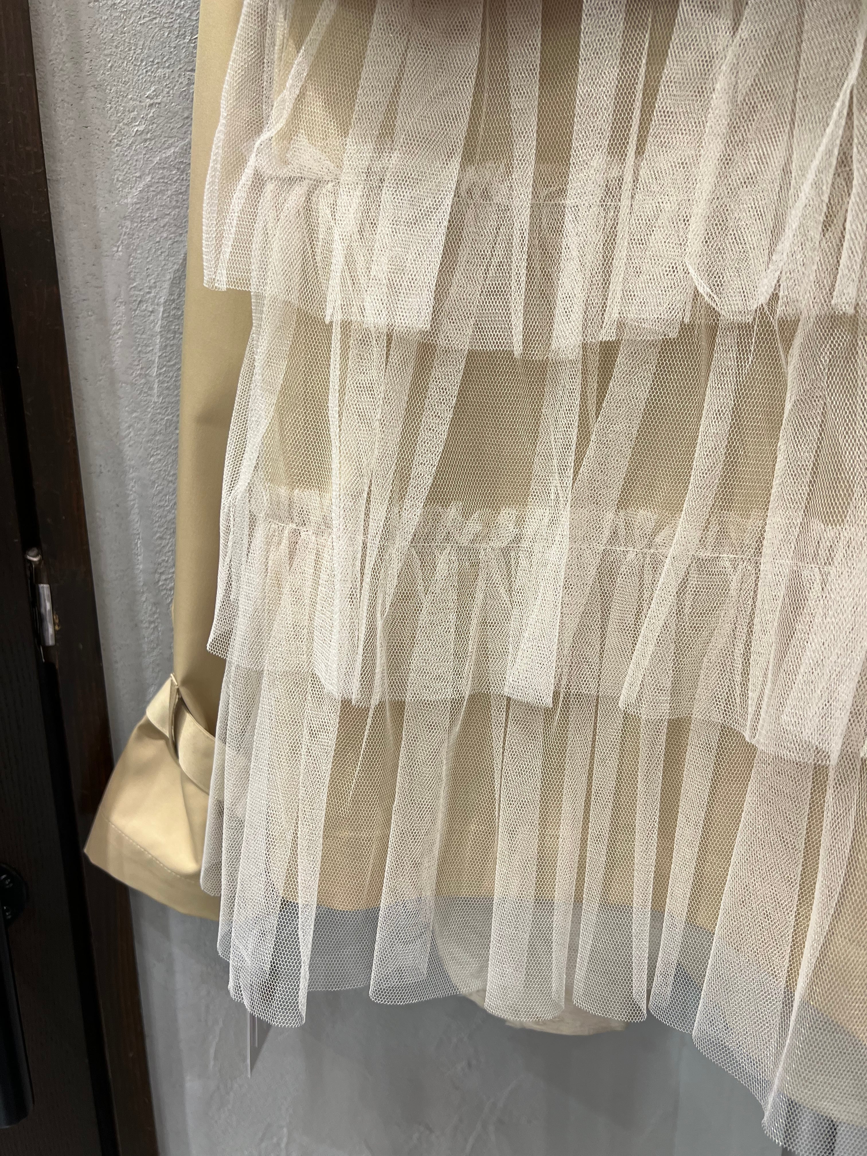 一見シンプルながら、バックスタイルにはふんわりとしたチュールフリルを重ねた華やかなデザインが施され、後ろ姿まで抜かりなく可愛い一枚です。