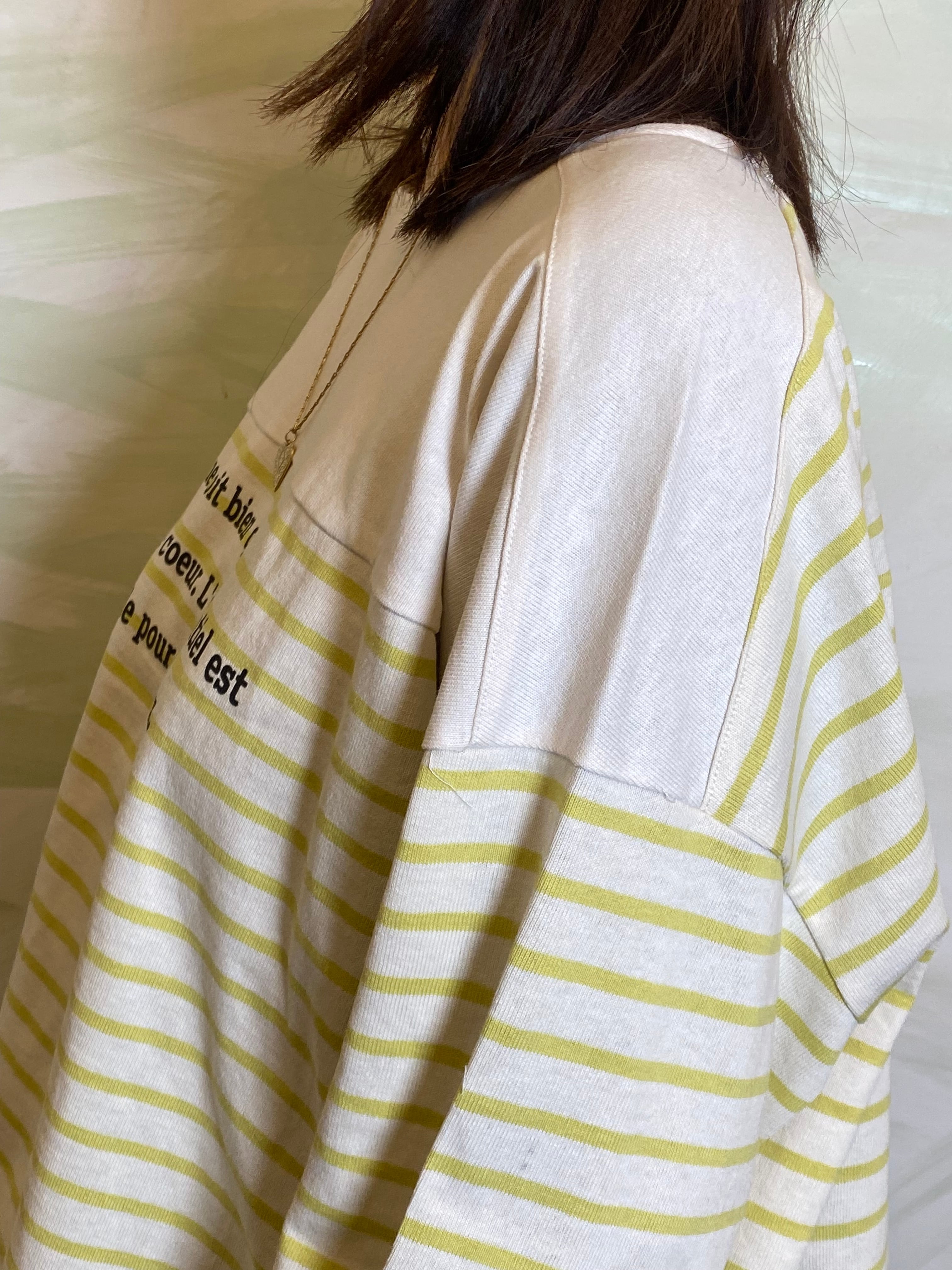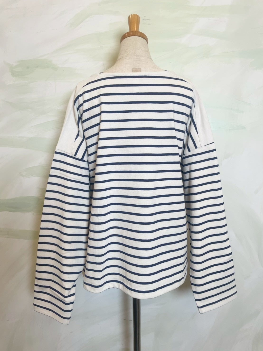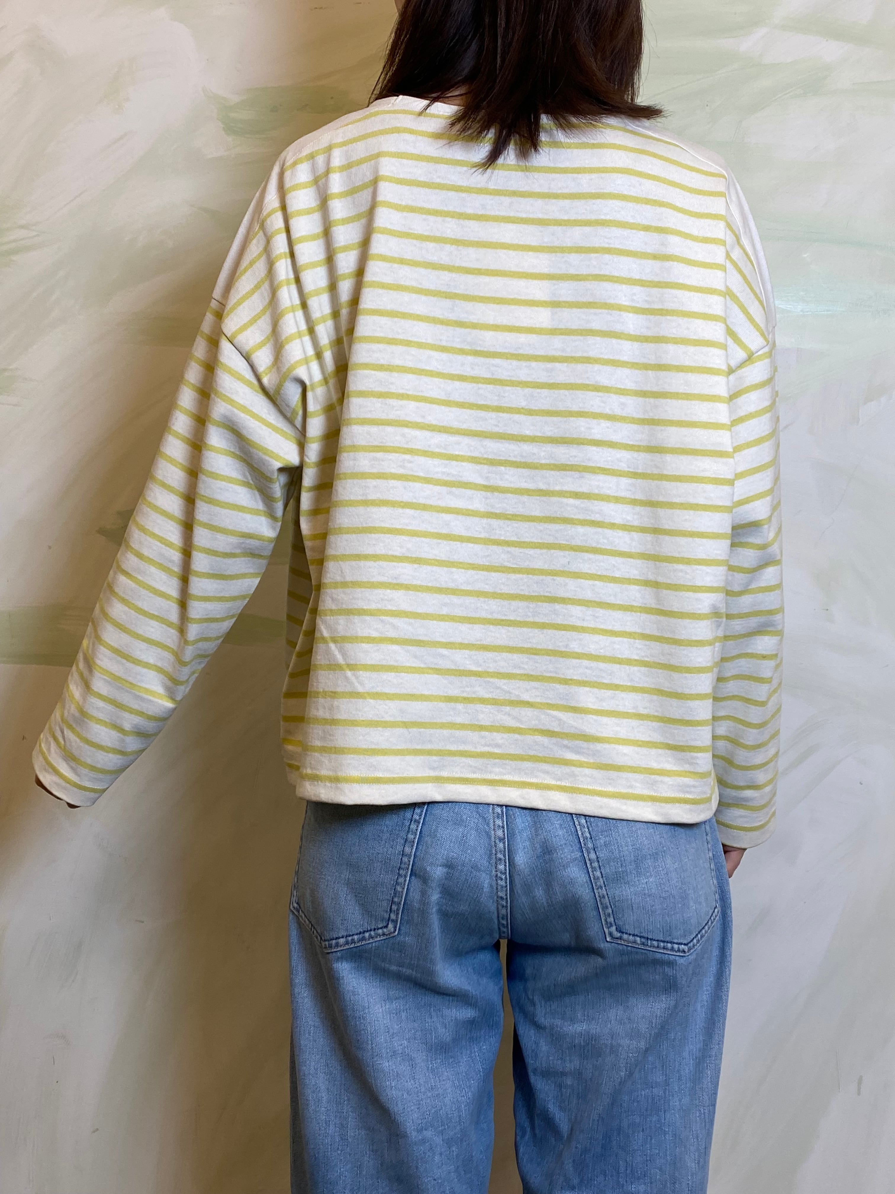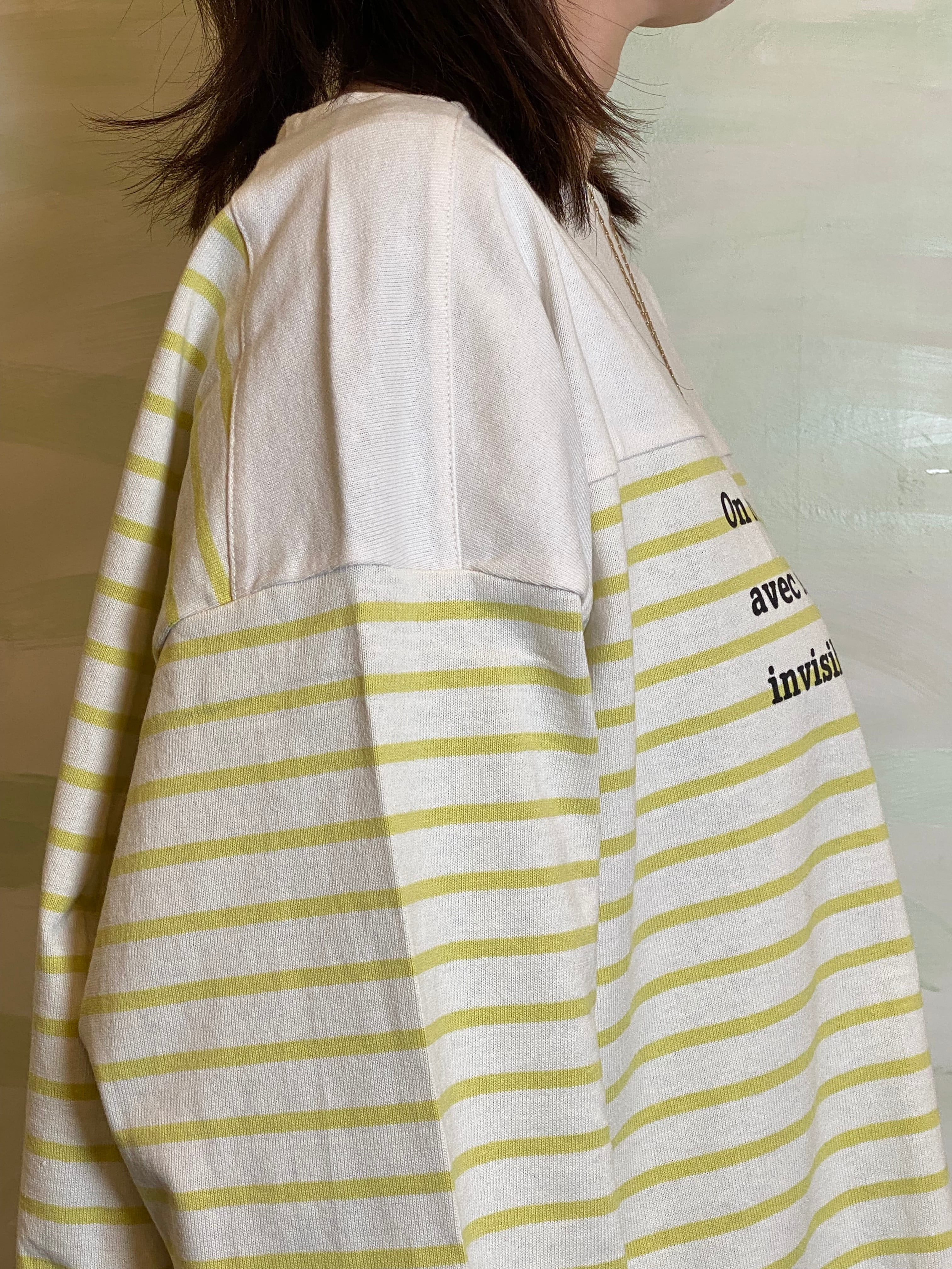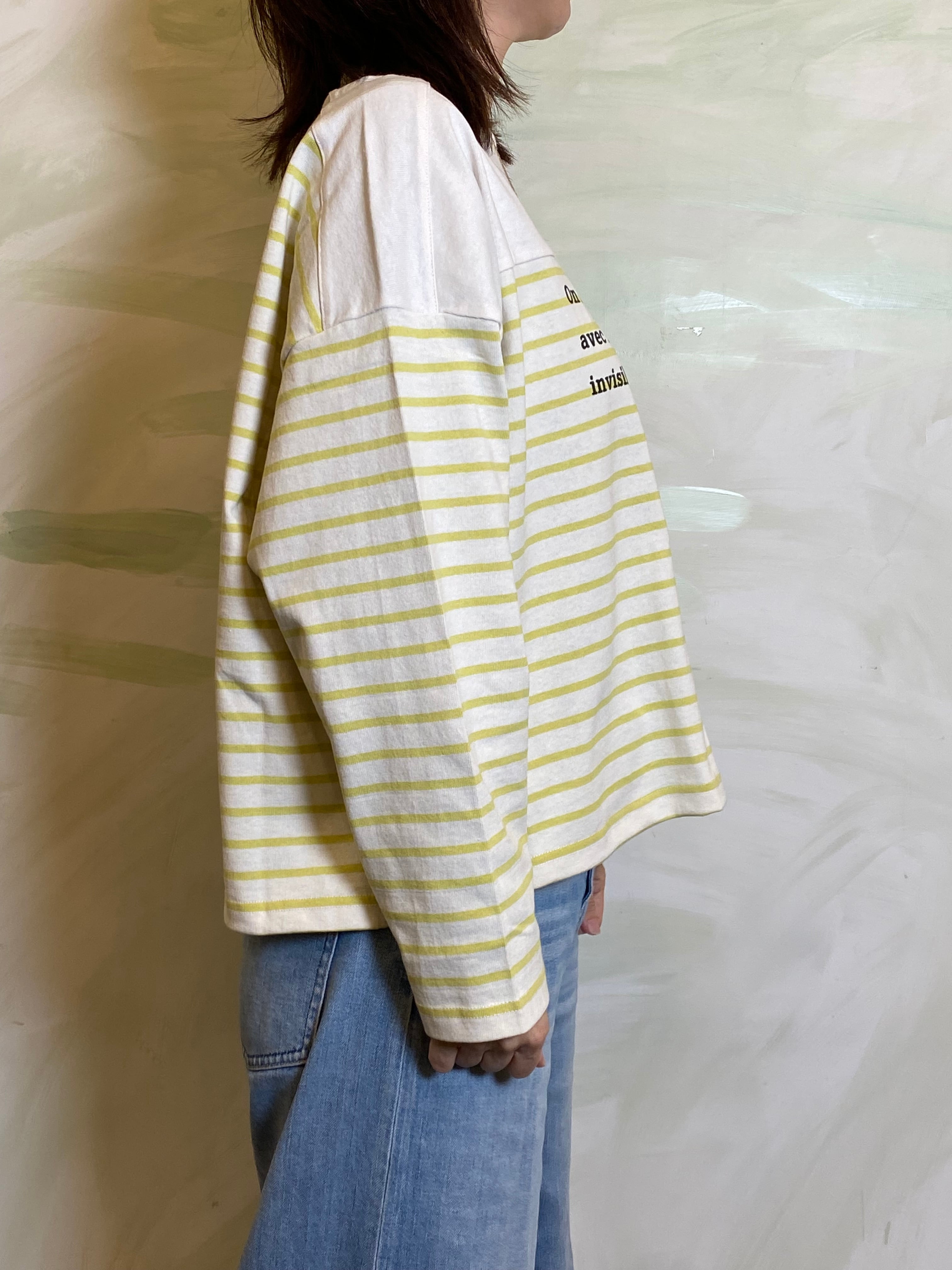 ゆとりを持たせたワイドな身幅により、バサッと一枚で着てサマになるリラックスしたフォルムに構築。袖口まで続くボーダーのラインが、横顔までも印象的に彩る一着です。
