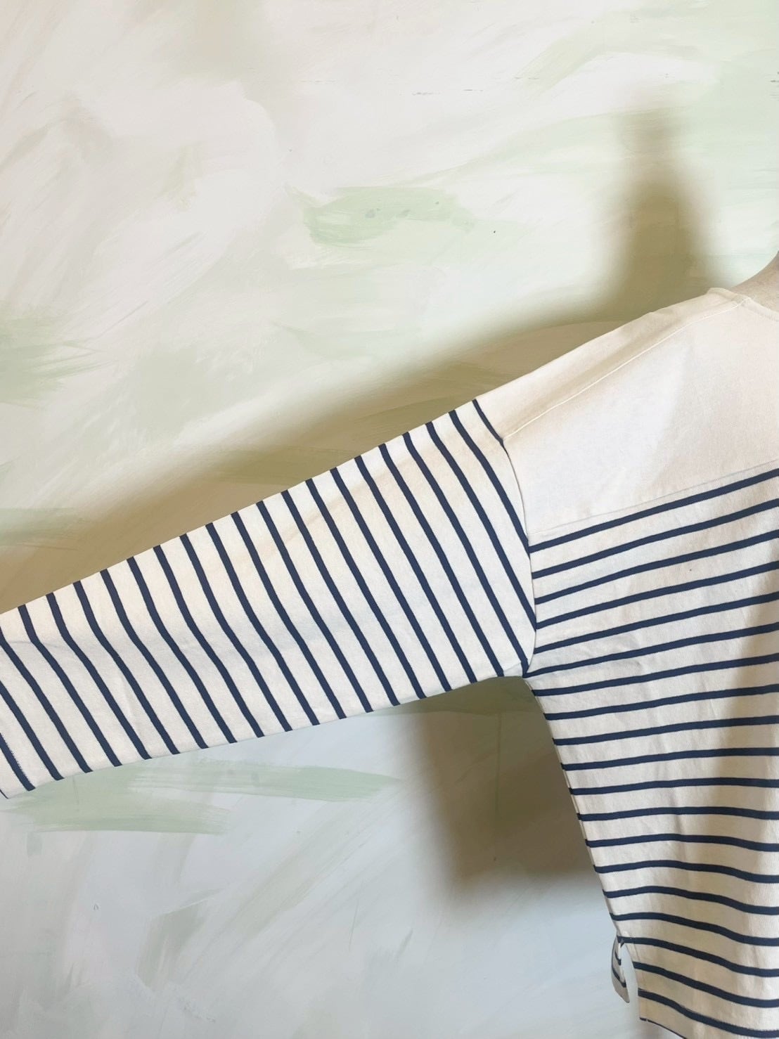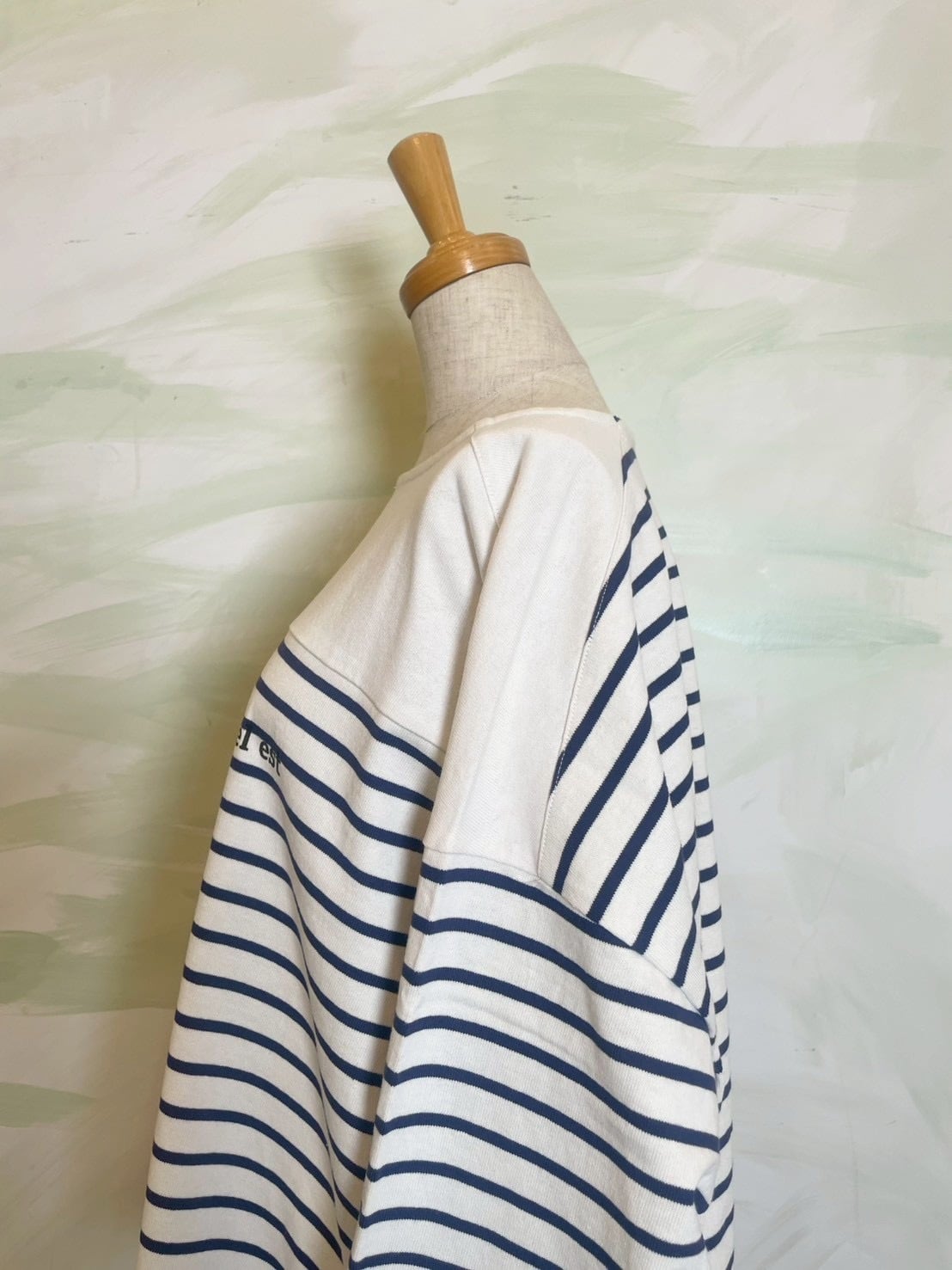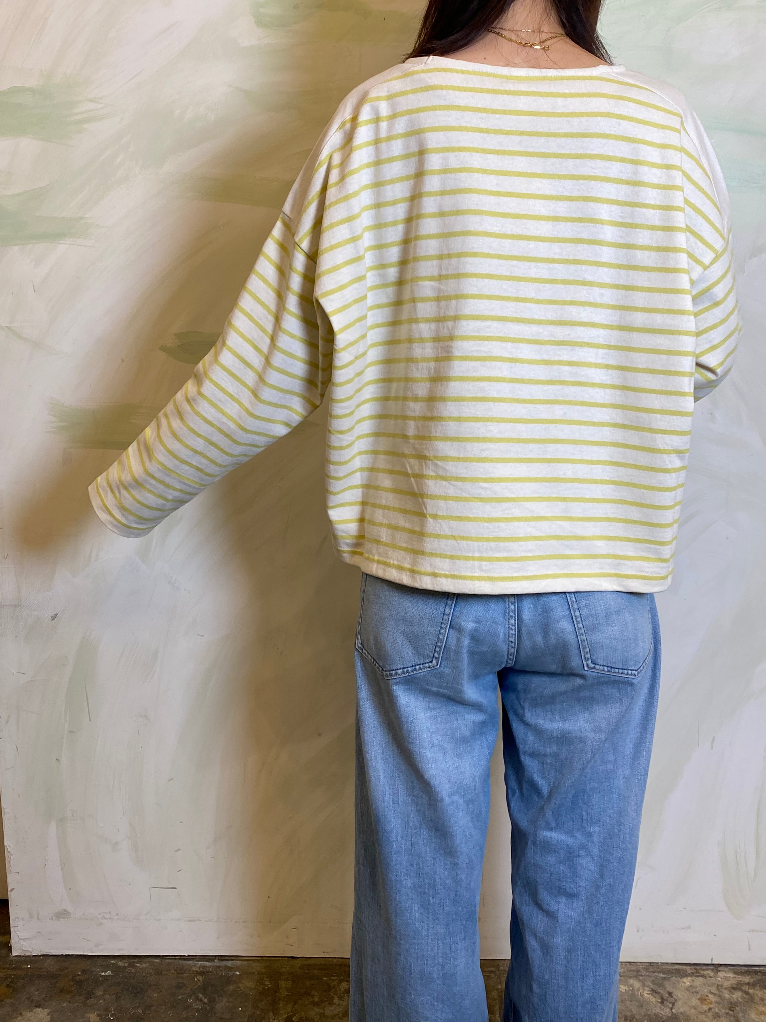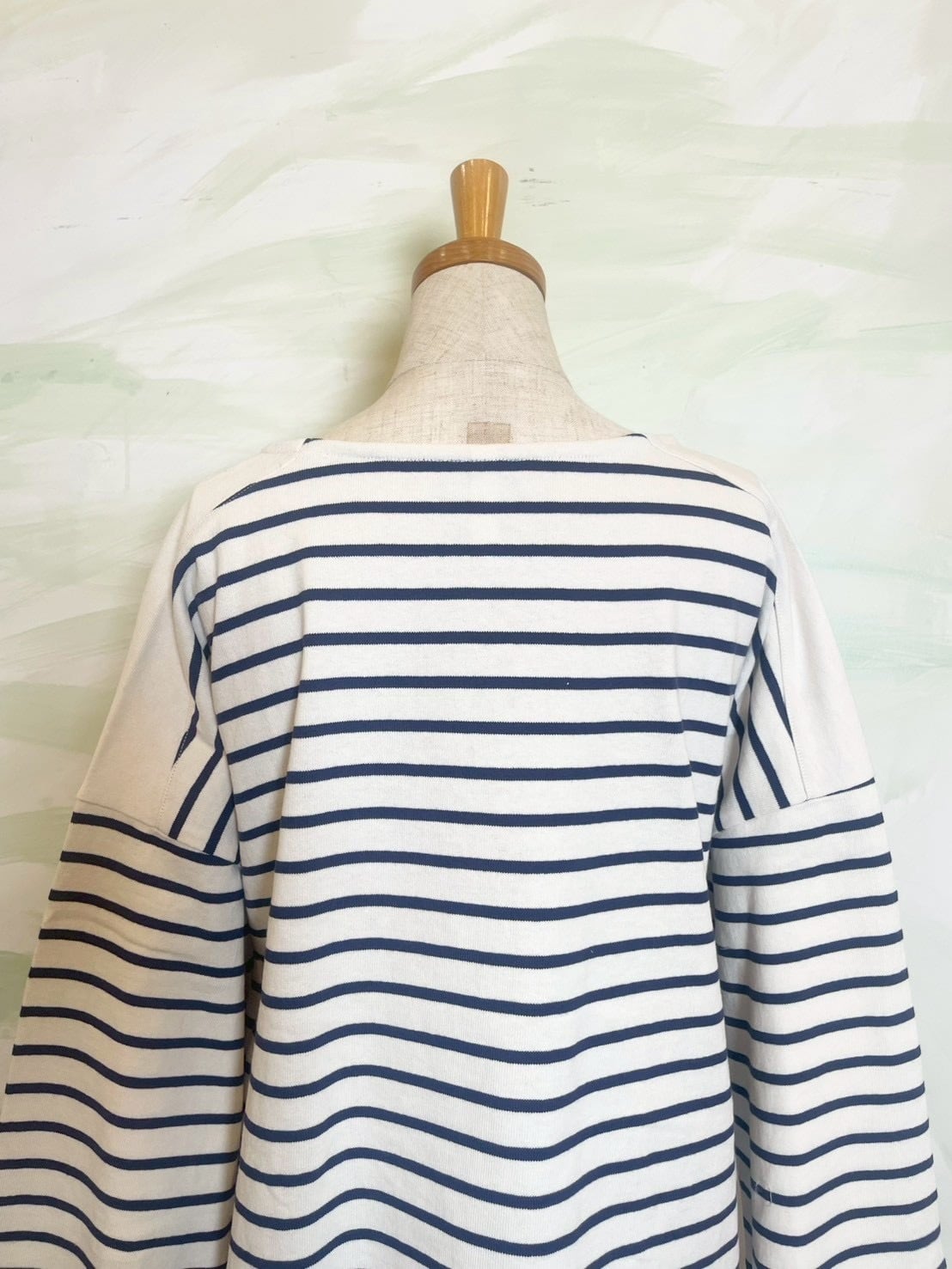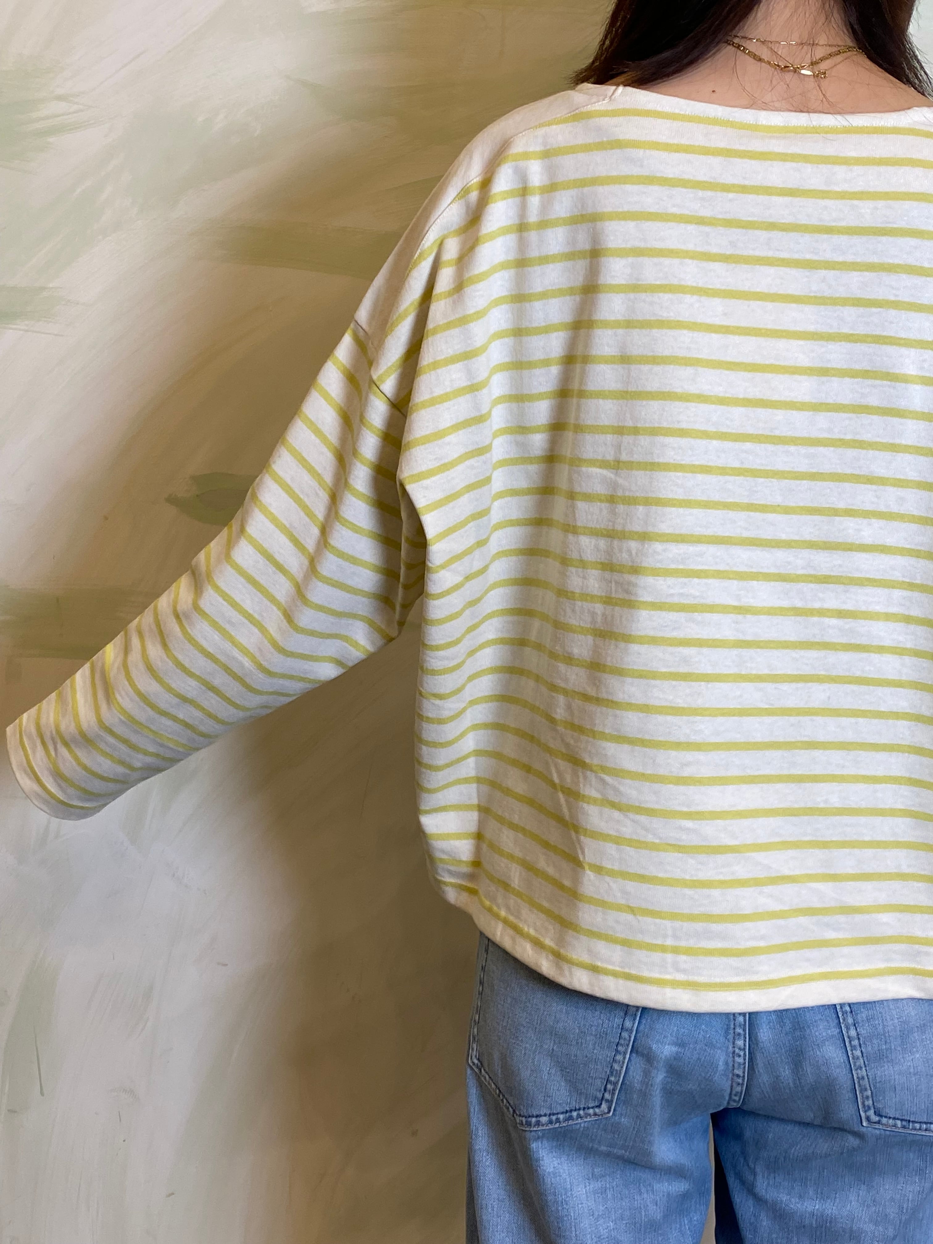 ゆとりを持たせたワイドな身幅により、バサッと一枚で着てサマになるリラックスしたフォルムに構築。袖口まで続くボーダーのラインが、横顔までも印象的に彩る一着です。