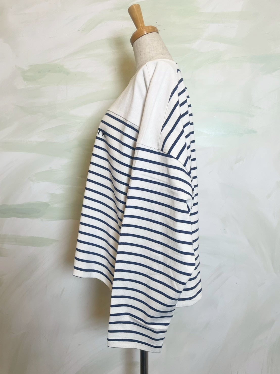 胸元に配されたタイポグラフィが、オーセンティックなバスクシャツに現代的なヌケ感をプラスしています。