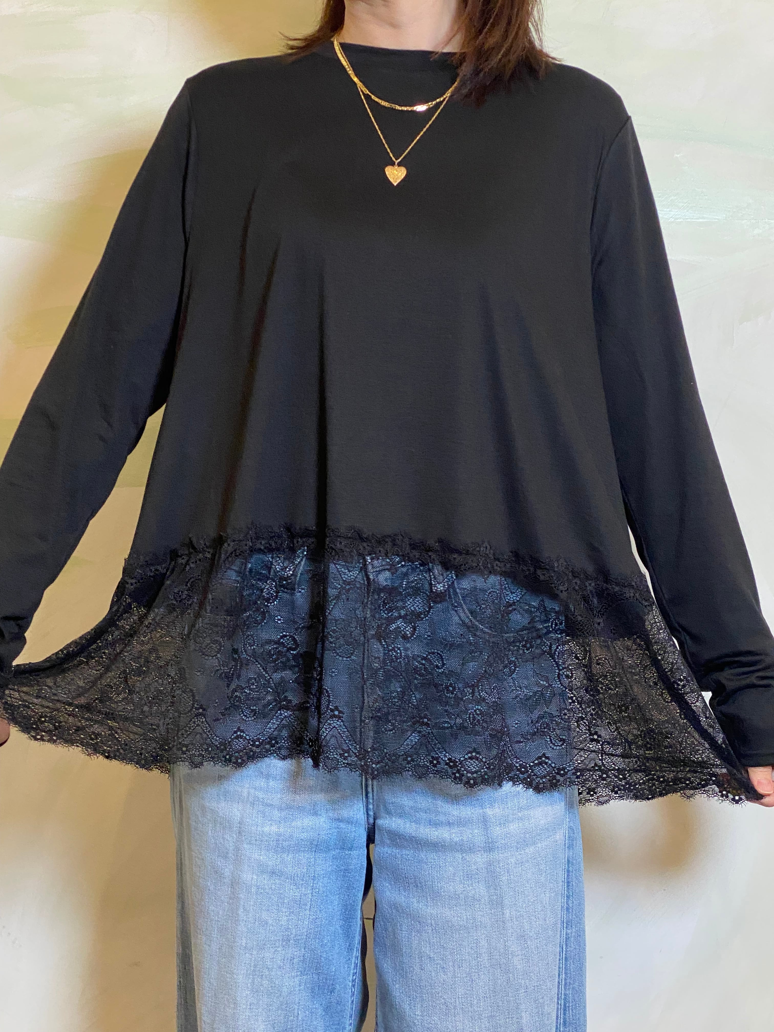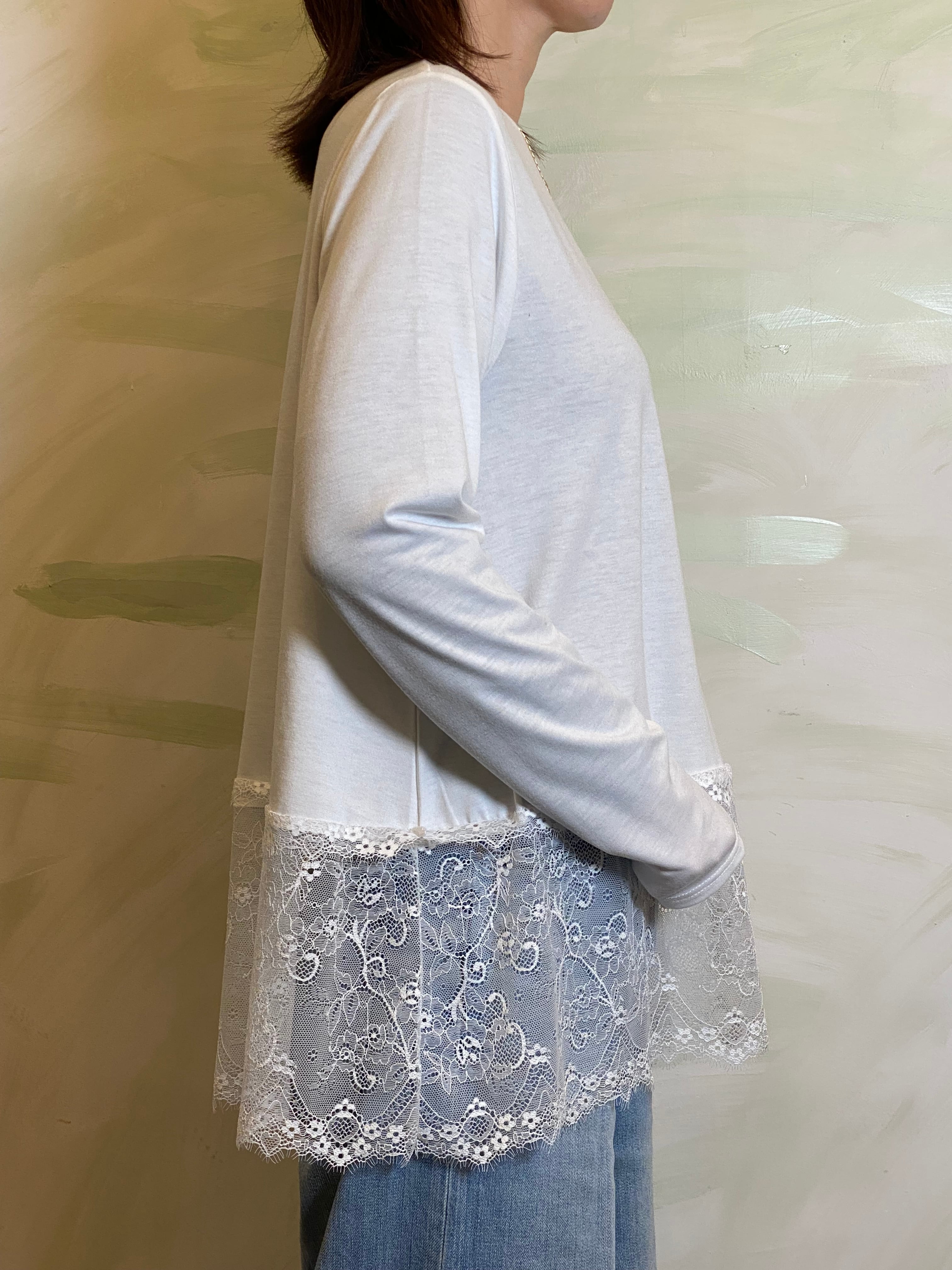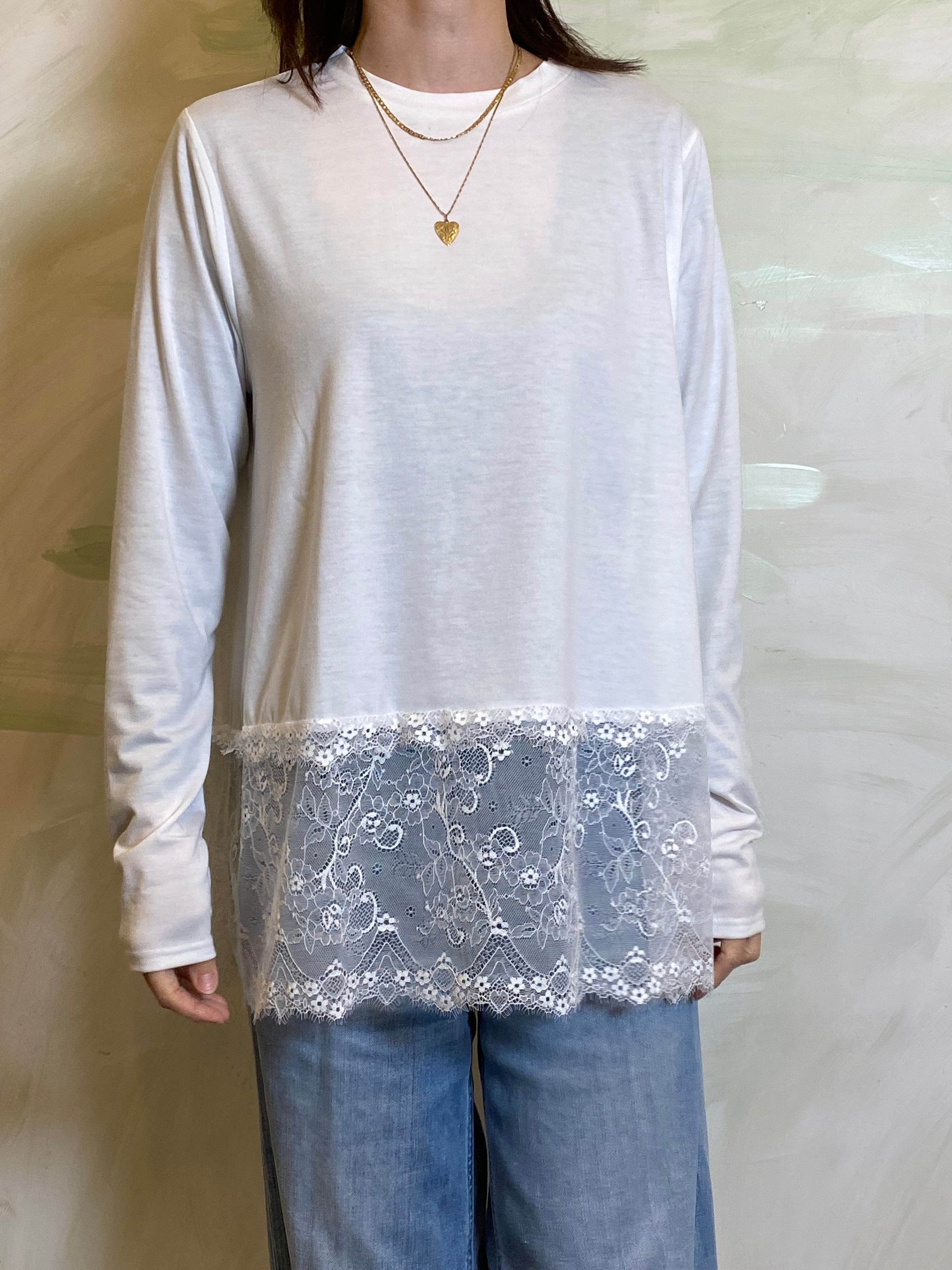 シンプルな天竺素材に、裾レースを重ねたレイヤード風デザインのプルオーバー。