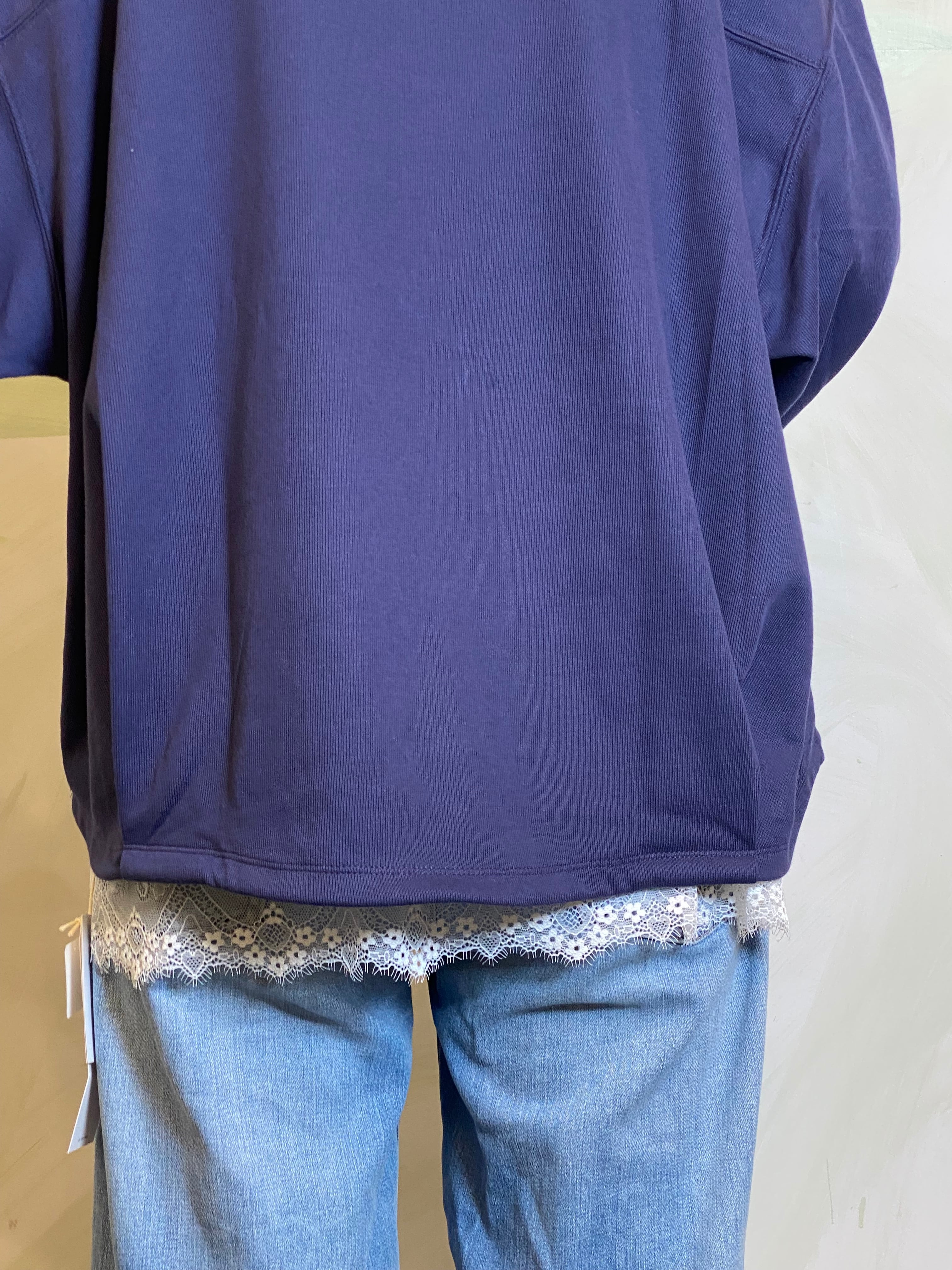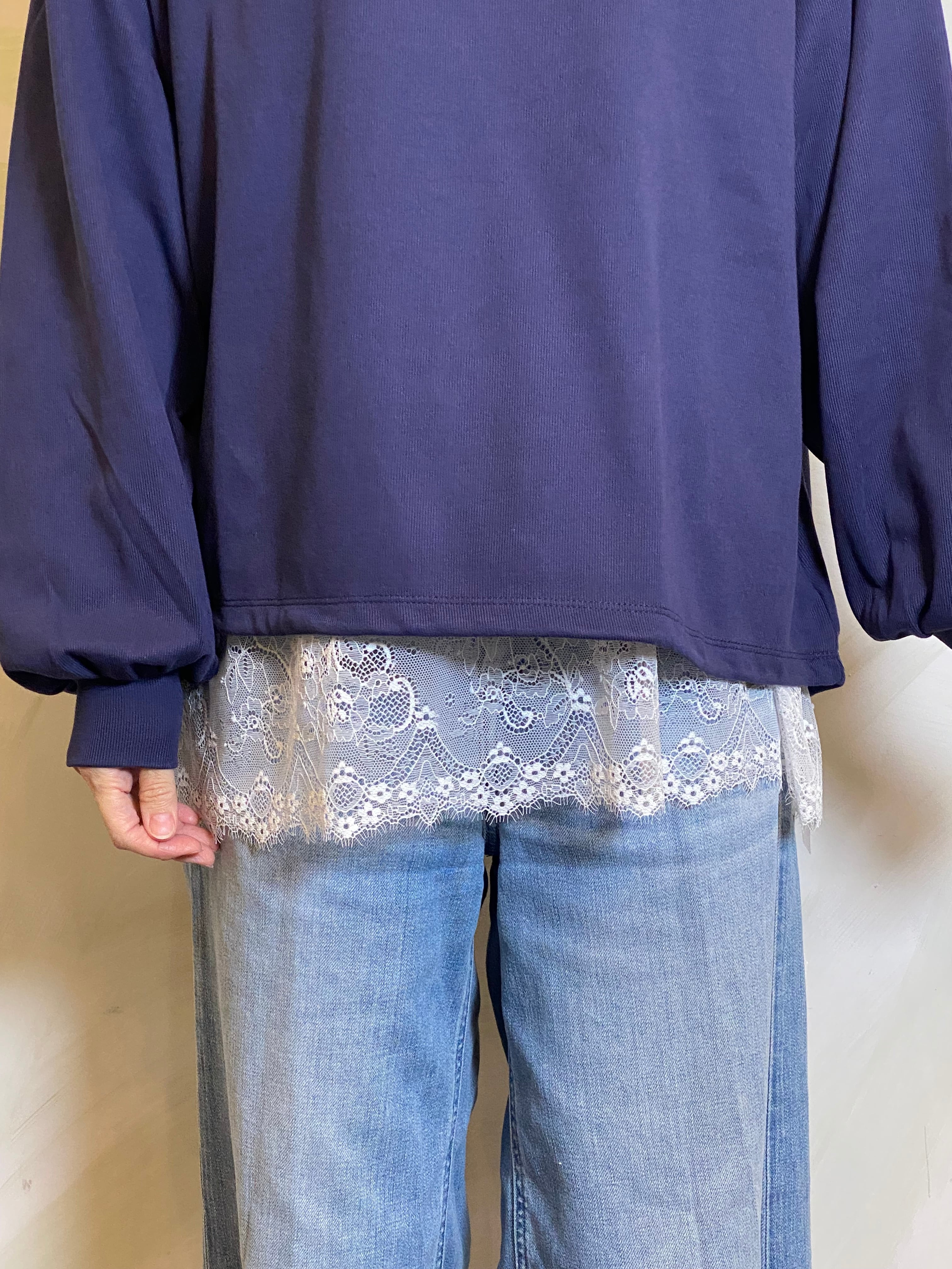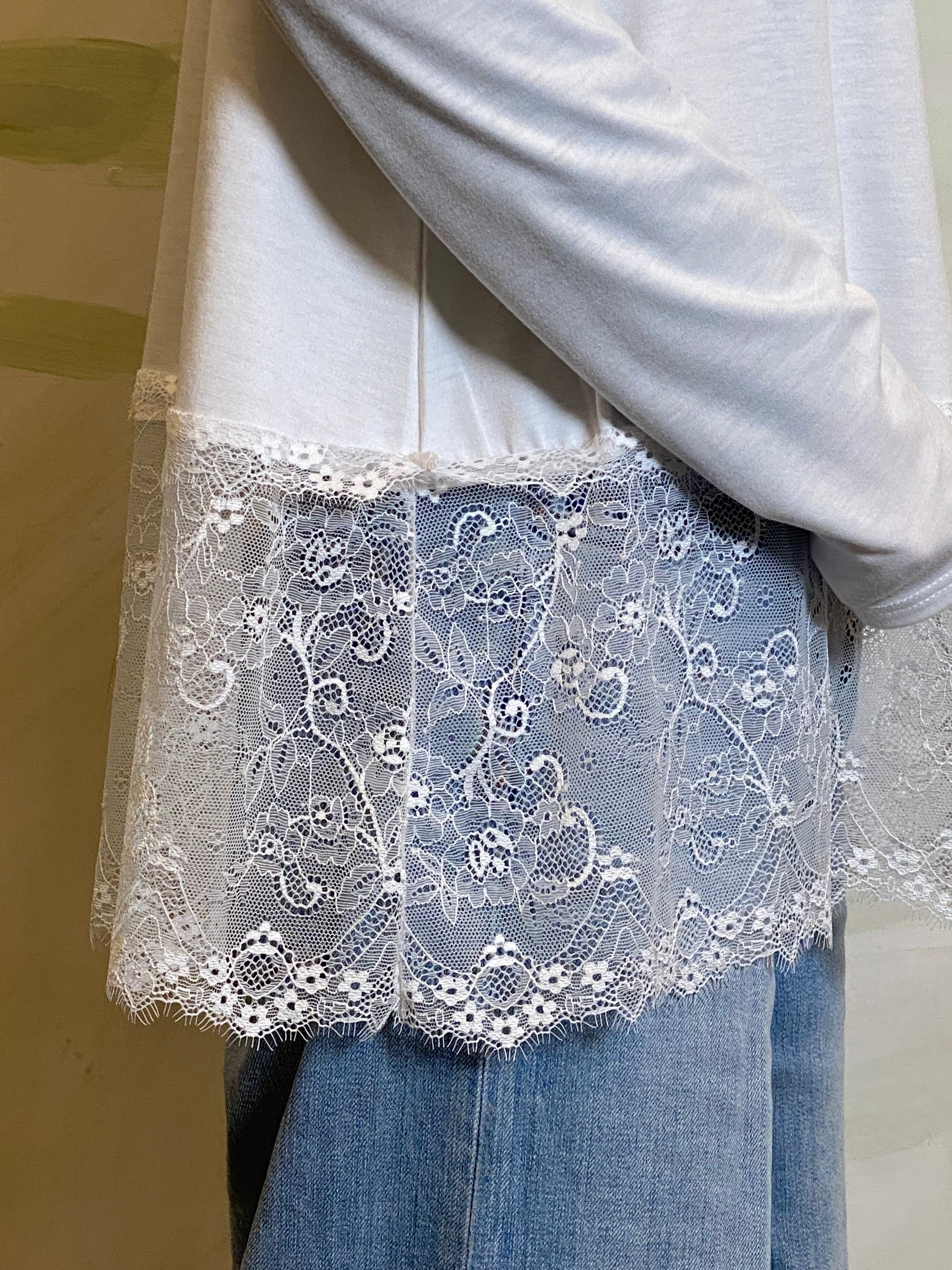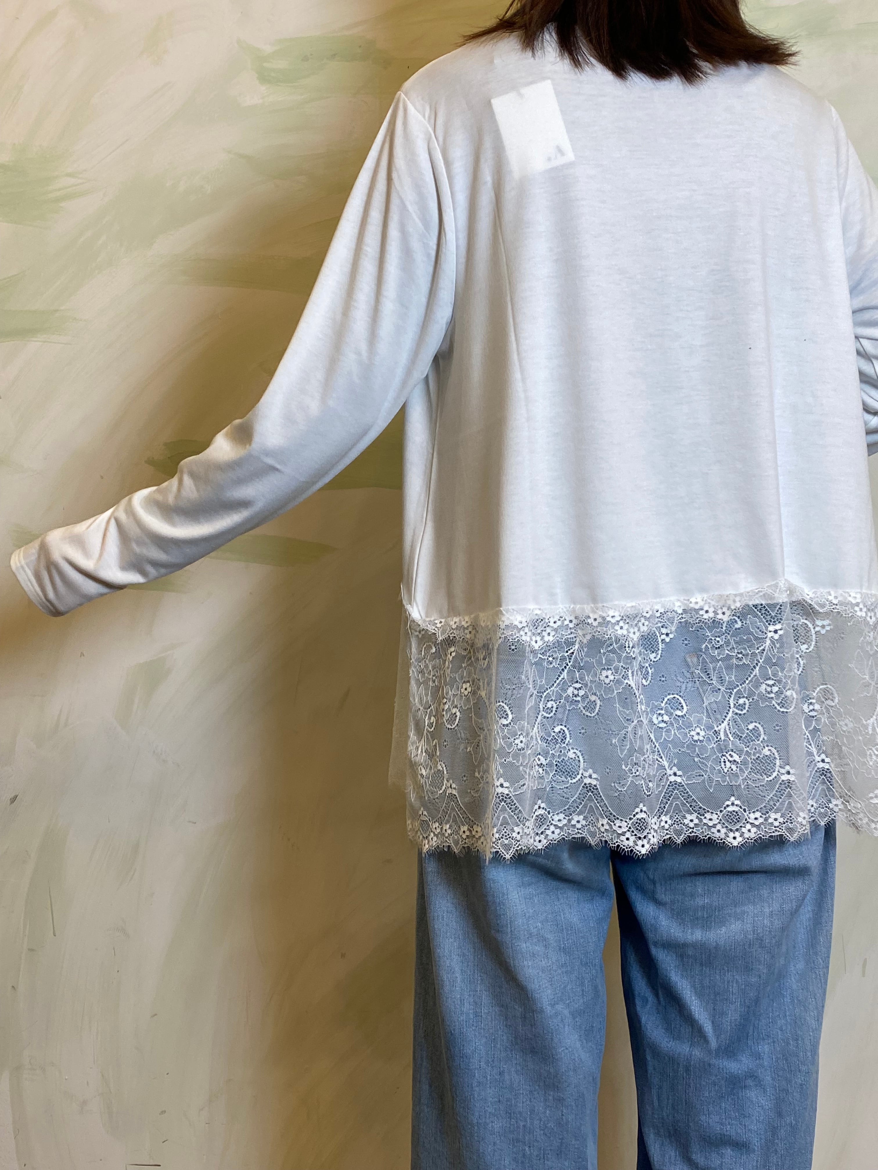 シンプルな天竺素材に、裾レースを重ねたレイヤード風デザインのプルオーバー。