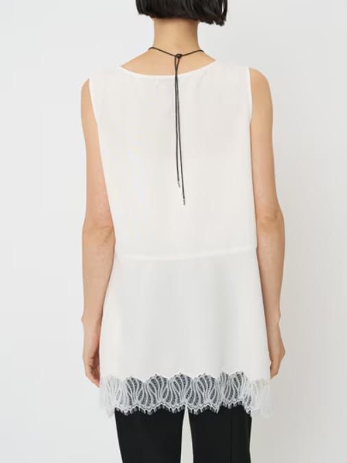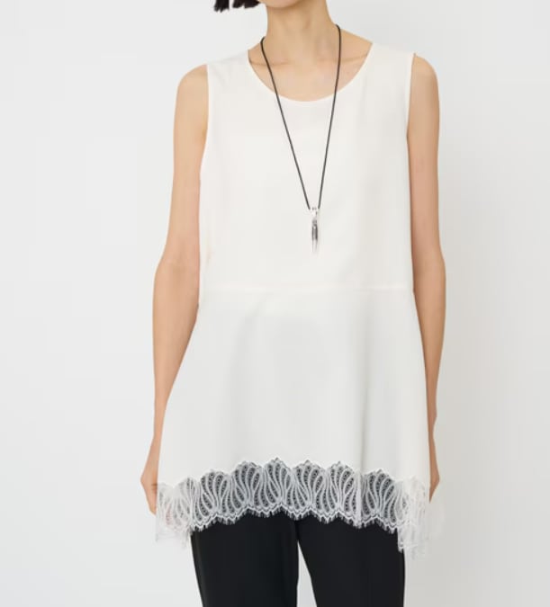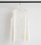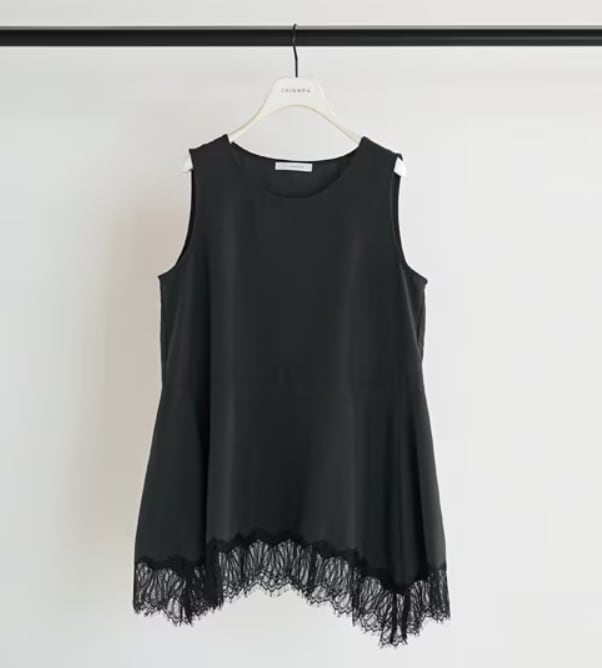 サテン素材にレースを刺繍した、一枚で華やかなタンクトップ。