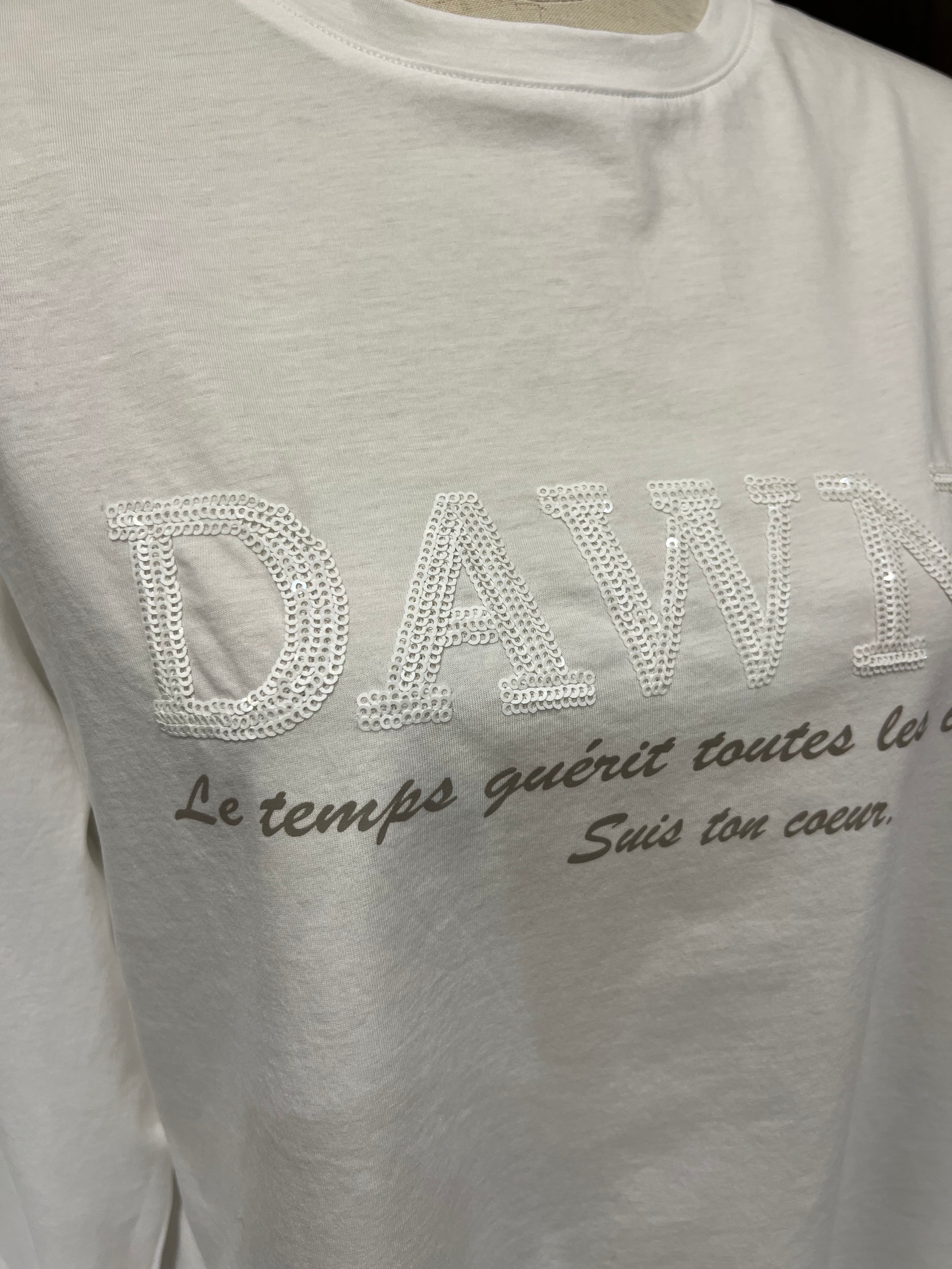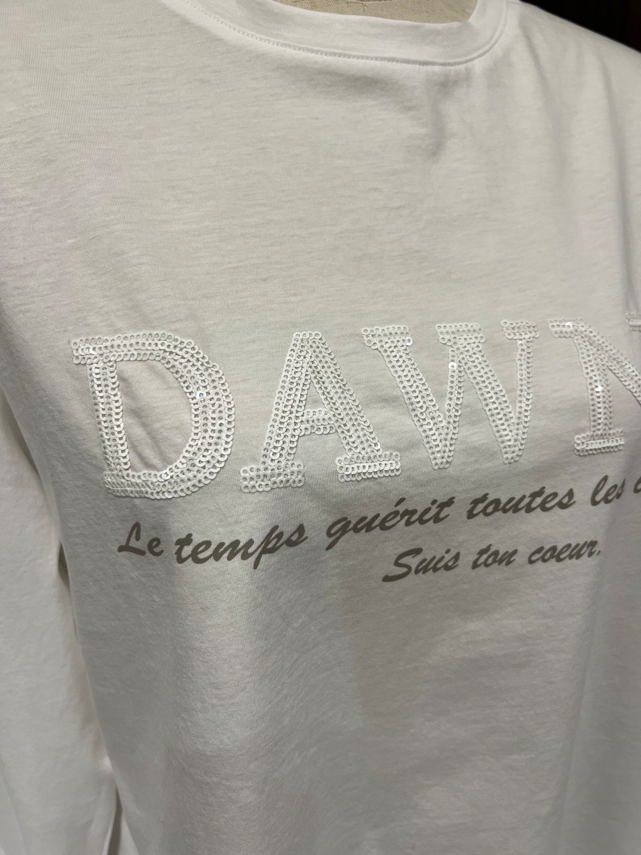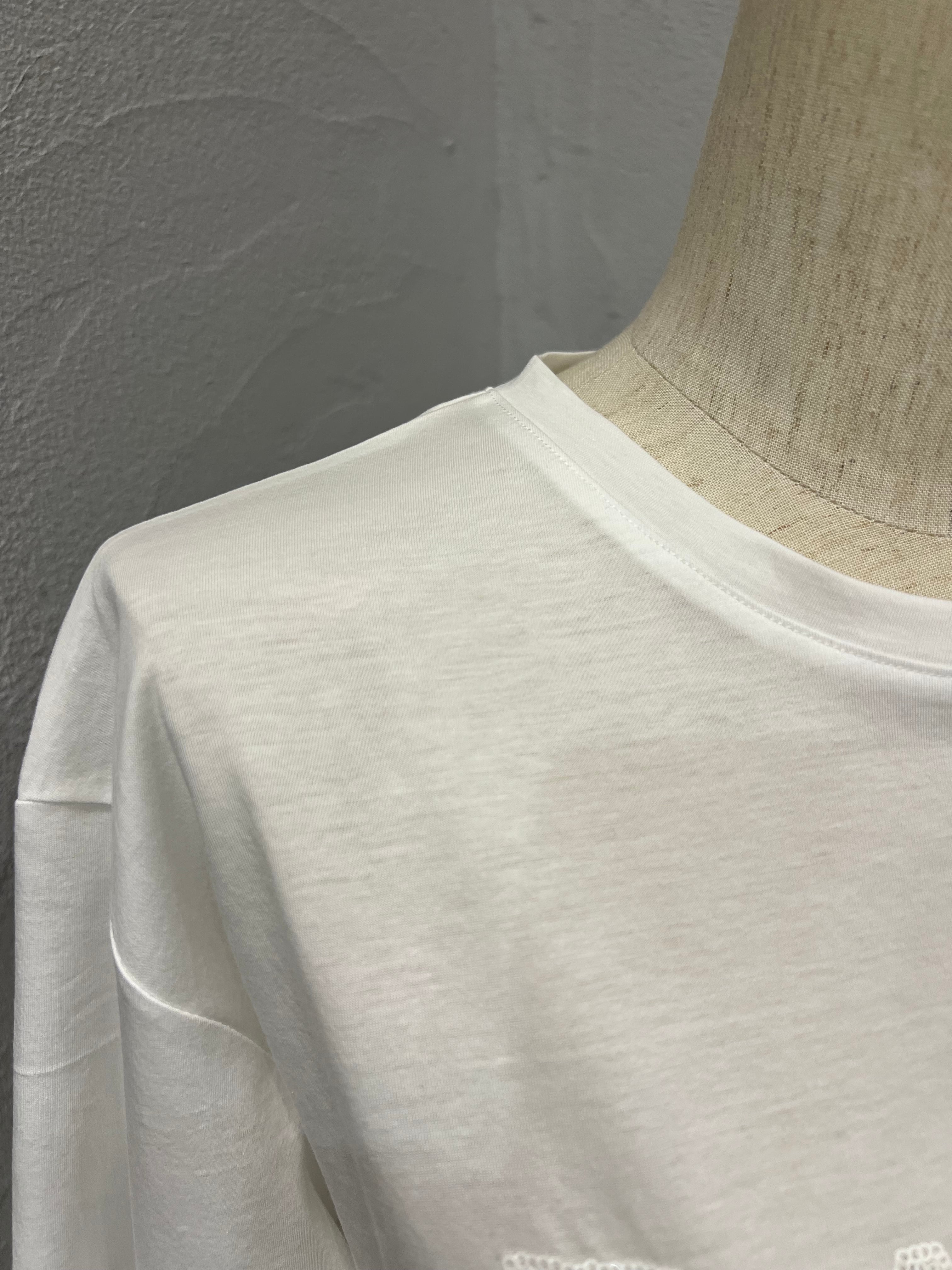 スパンコールで形づくられたロゴの立体感が目を惹く、カジュアルながら上品な印象のプルオーバー。