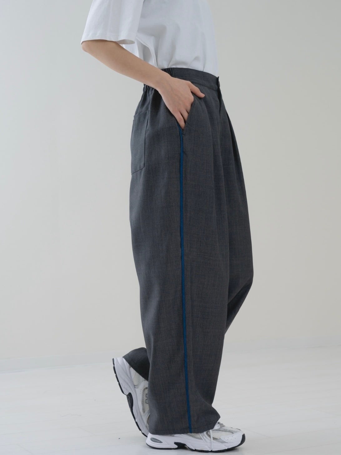 サイドに配色パイピングを施していることでトレンド感+スッキリ見えの効果があります。