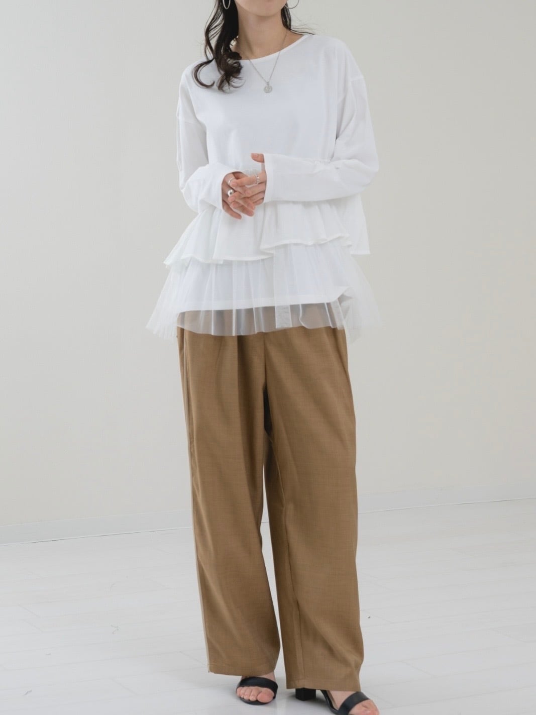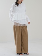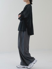 フロント部分にはタックが入っているので、脚のラインを拾わずに着用できます。