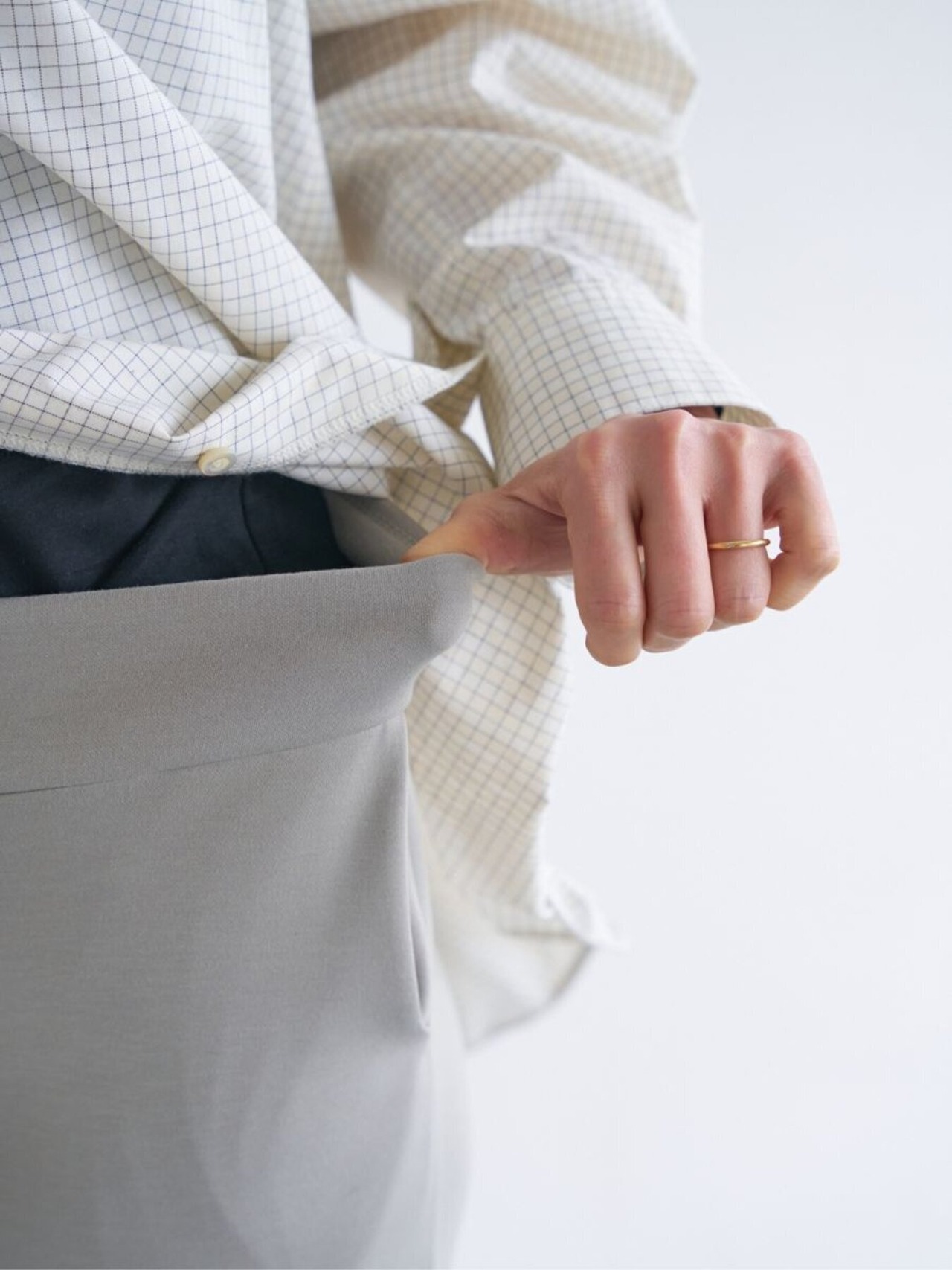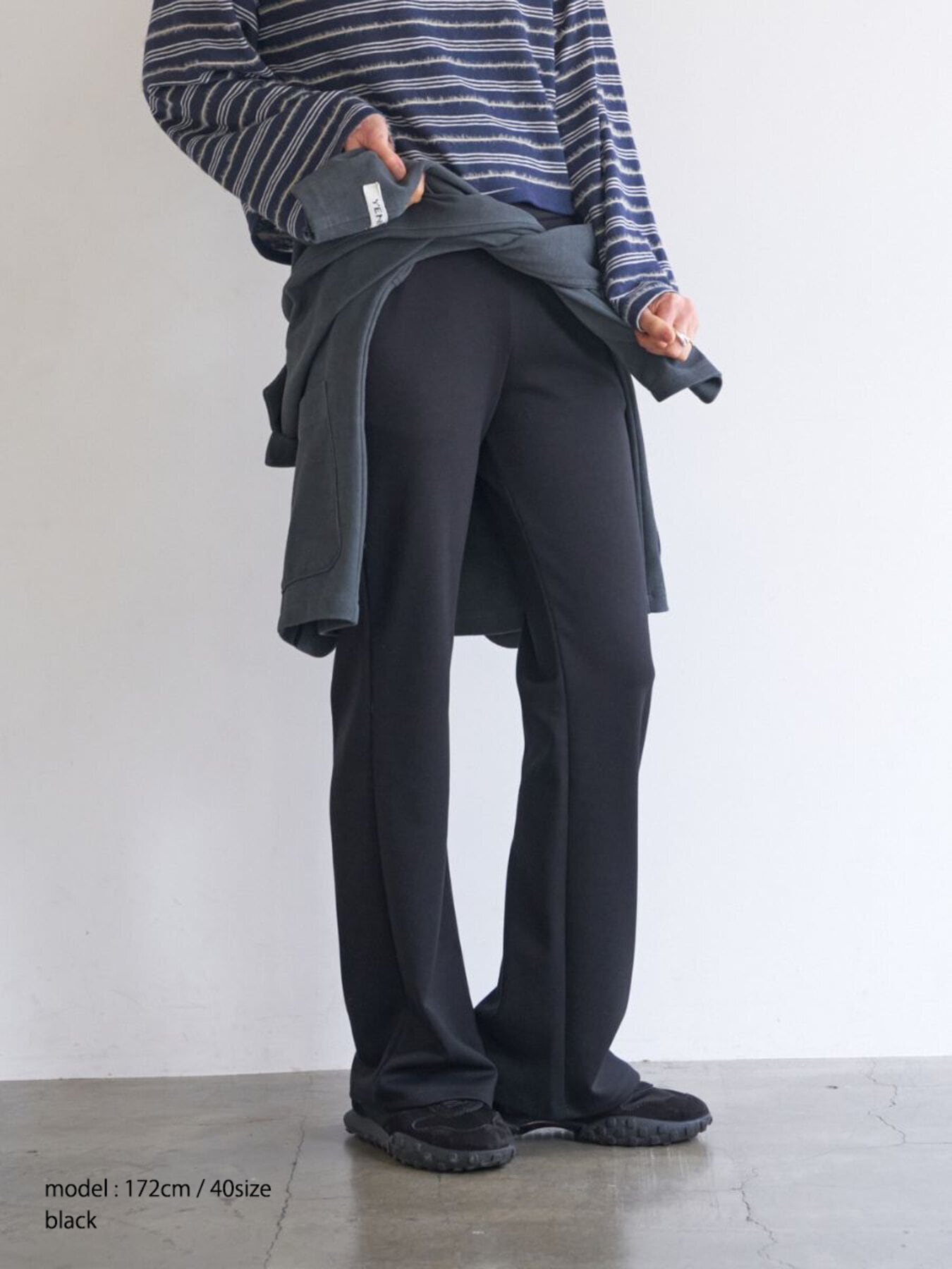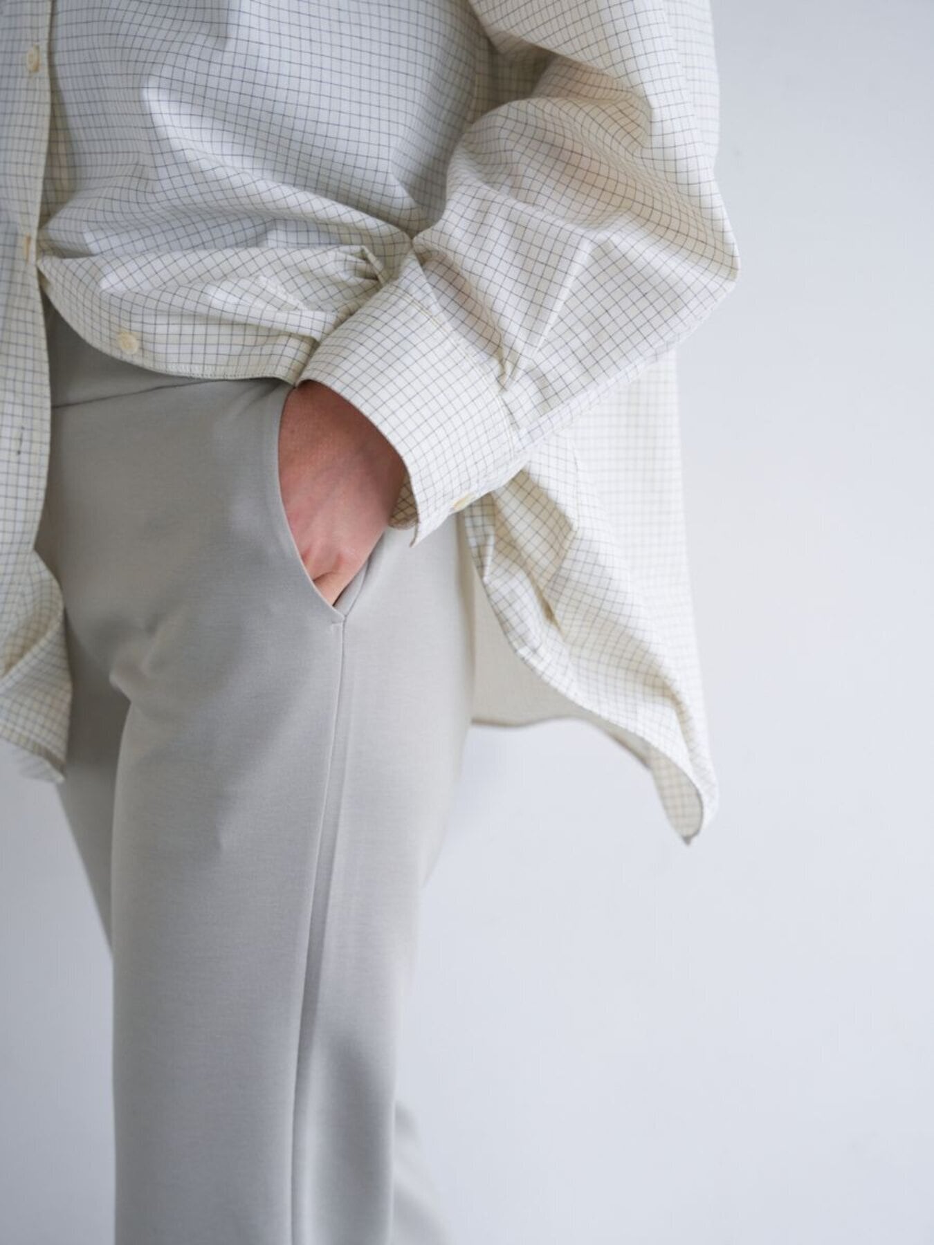 ほどよい厚みと弾力のあるダブルジャージー素材は体のラインを拾いすぎないのがポイント。イージーながらもきれいな印象を与えてくれる大人カジュアルにぴったりな素材です。ウエストのディテールはレギンスと同じ仕様でストレスフリーに、