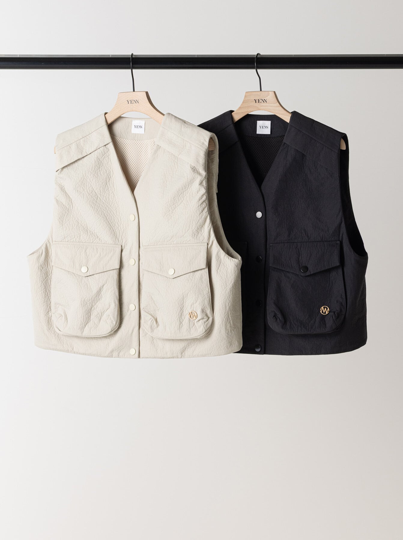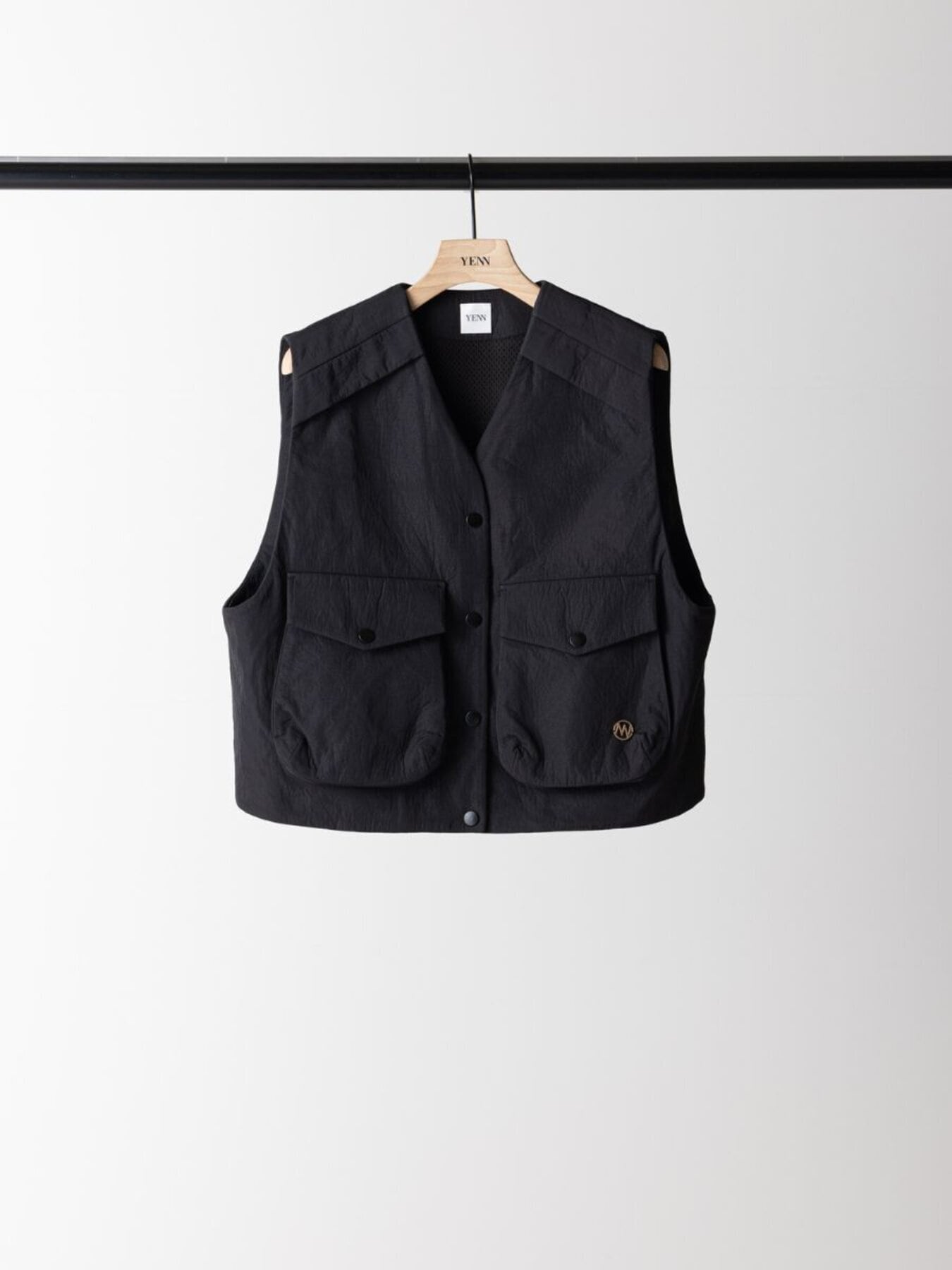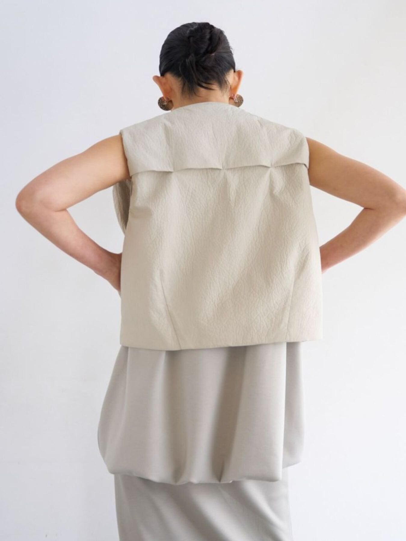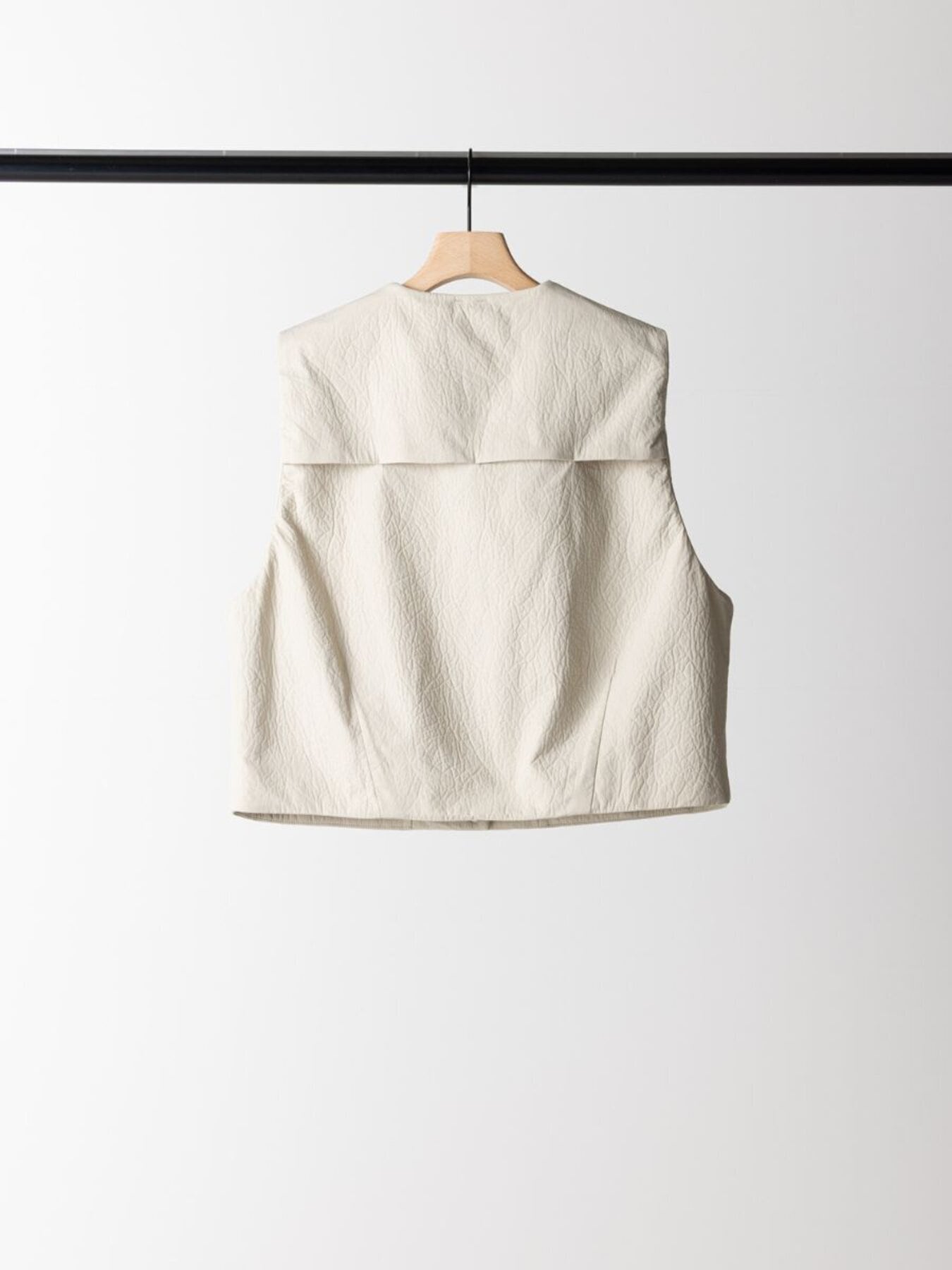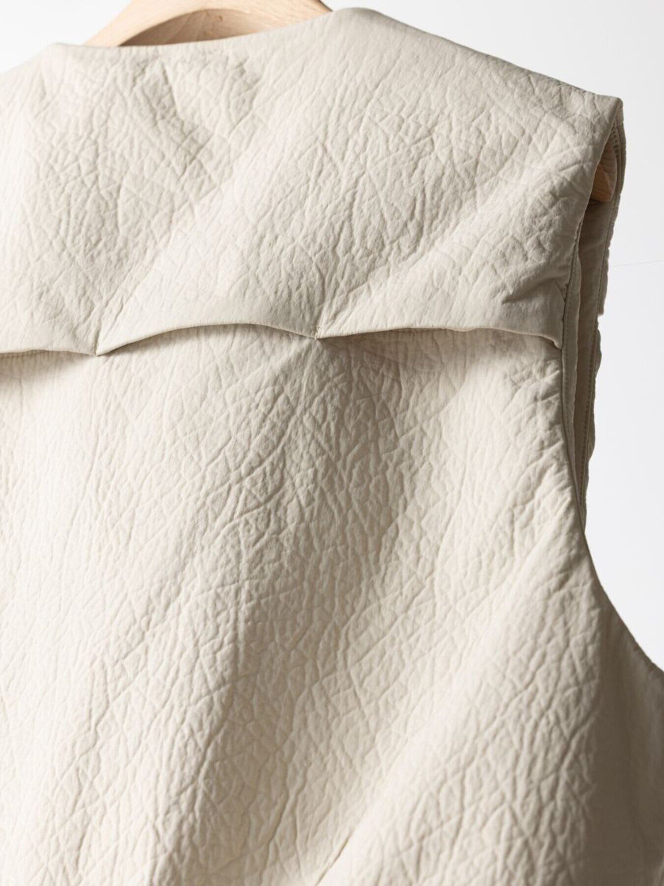 レザー調のエンボス素材を使用した、PUFFY MILITARY VEST。