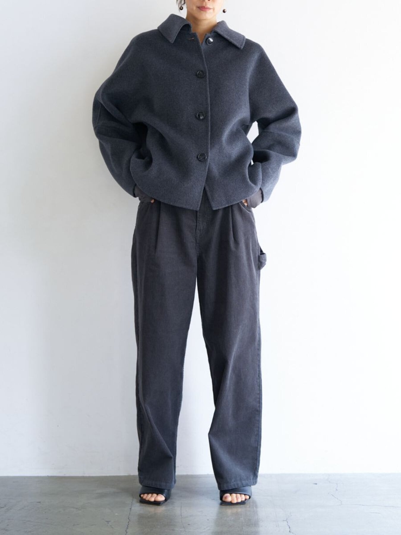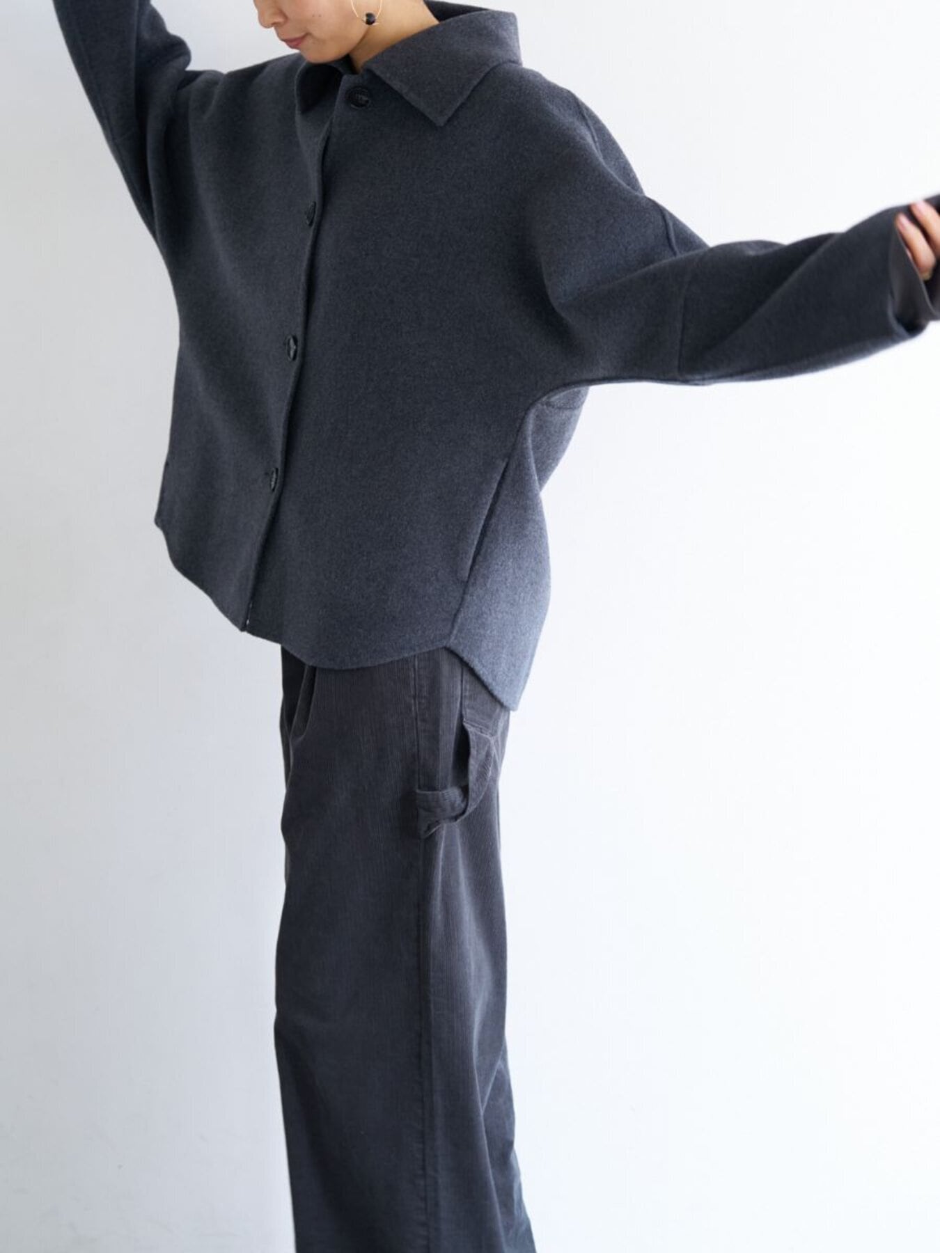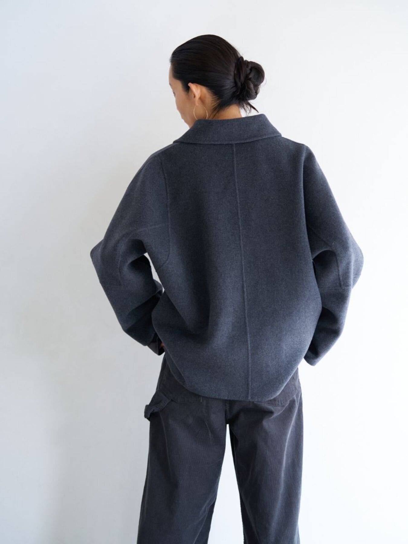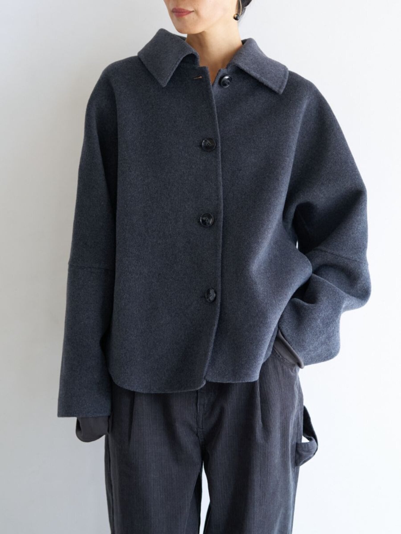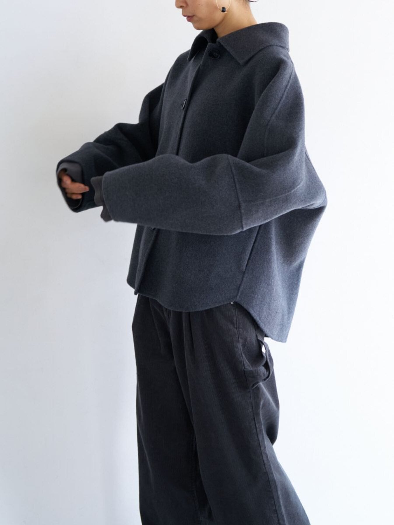 コンパクトな丈感と程よくゆとりのあるボックスシルエットで、装飾を極力省いたミニマルな設計に。素材の上質感が際立つようデザインされています。